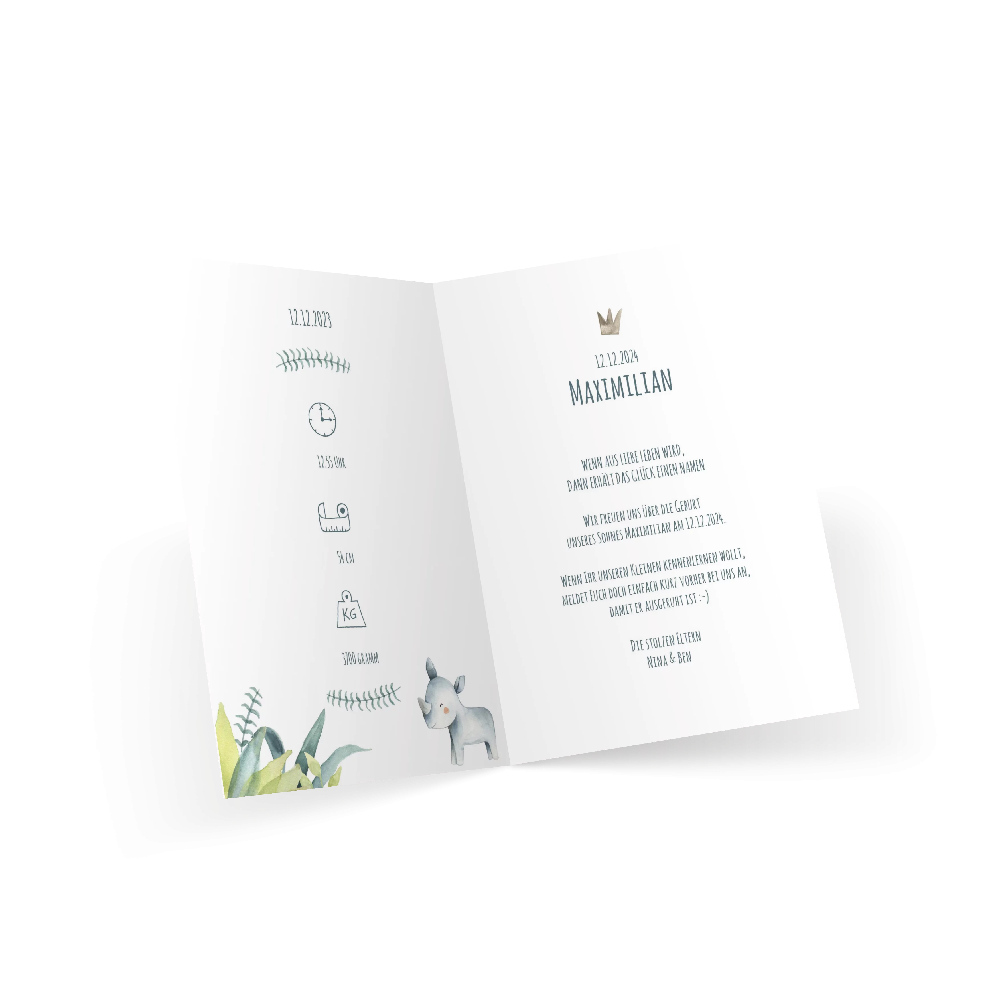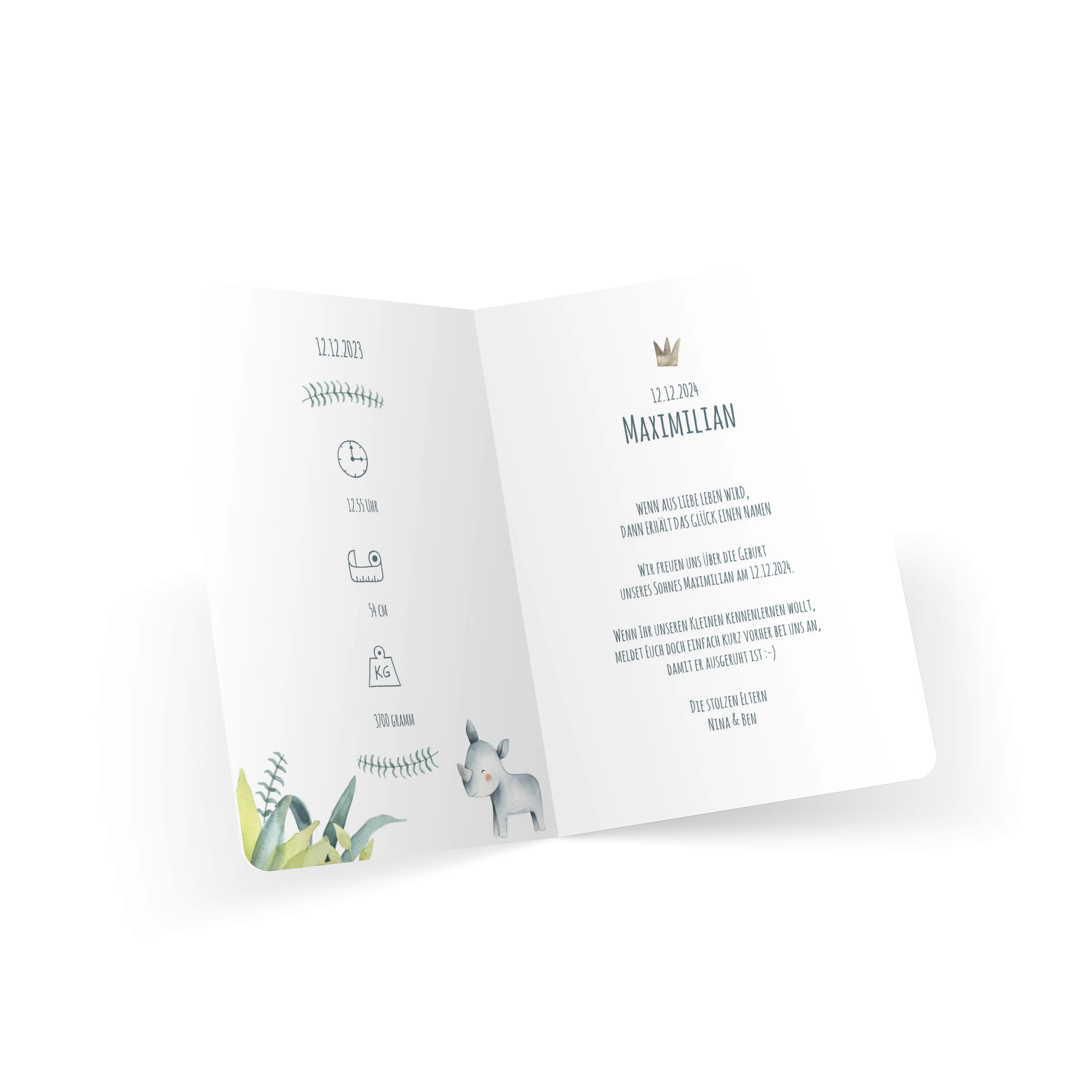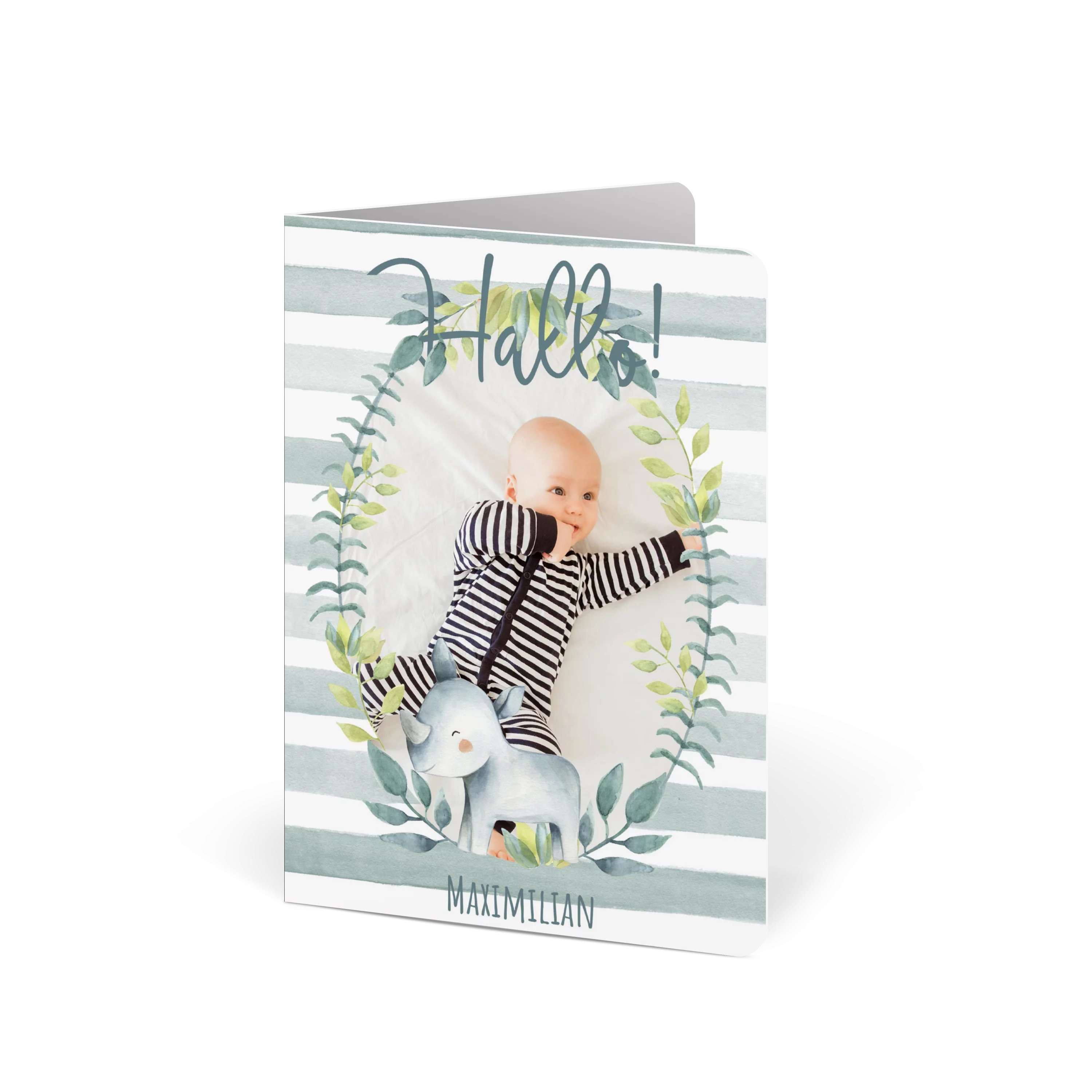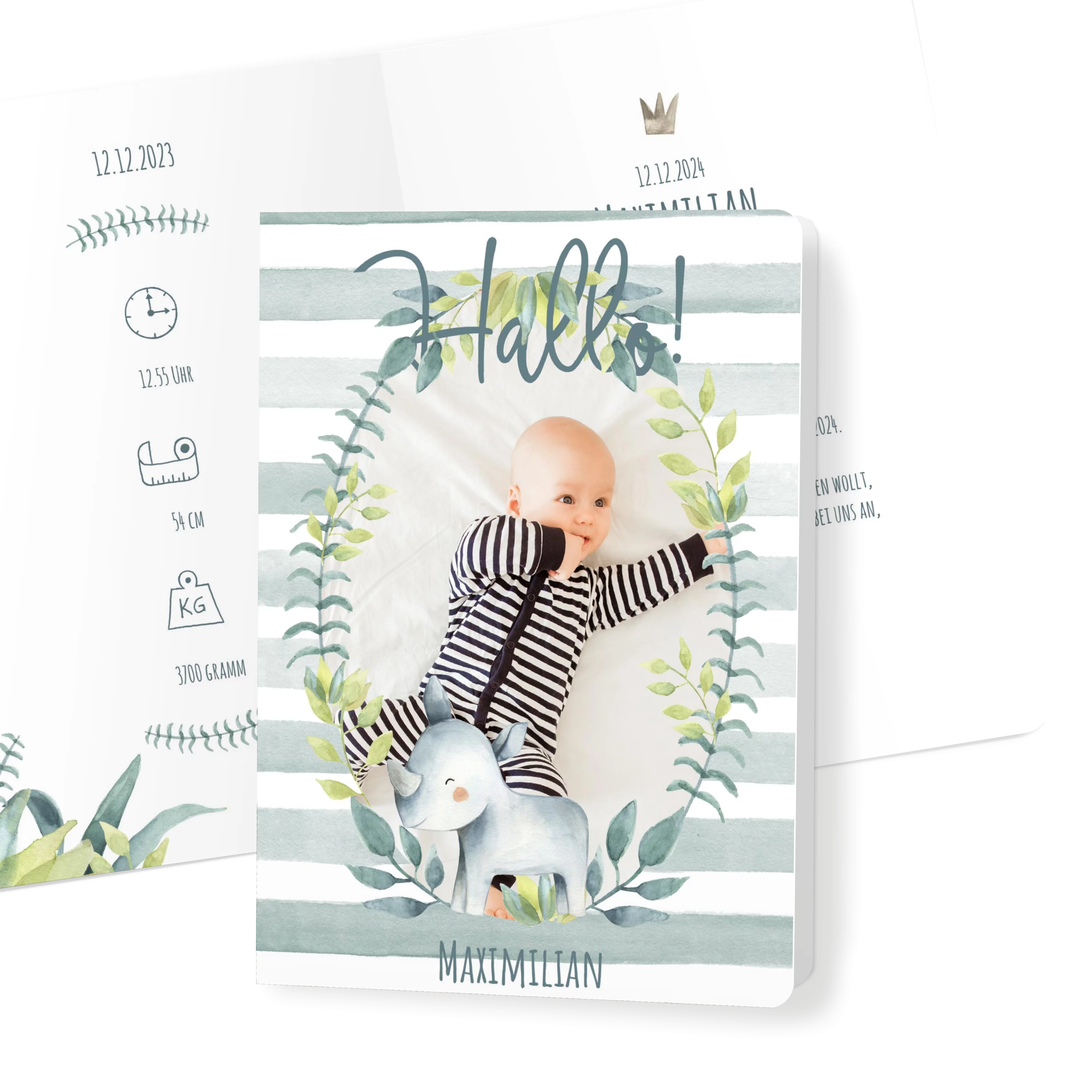 Verspielte Aquarellstreifen, zarte Blätter und ein niedliches Nashorn-Motiv rahmen das Babyfoto charmant ein. Das Design verbindet Natürlichkeit mit kindlicher Fantasie – ideal, um den neuen Erdenbürger auf ganz persönliche Weise willkommen zu heißen.