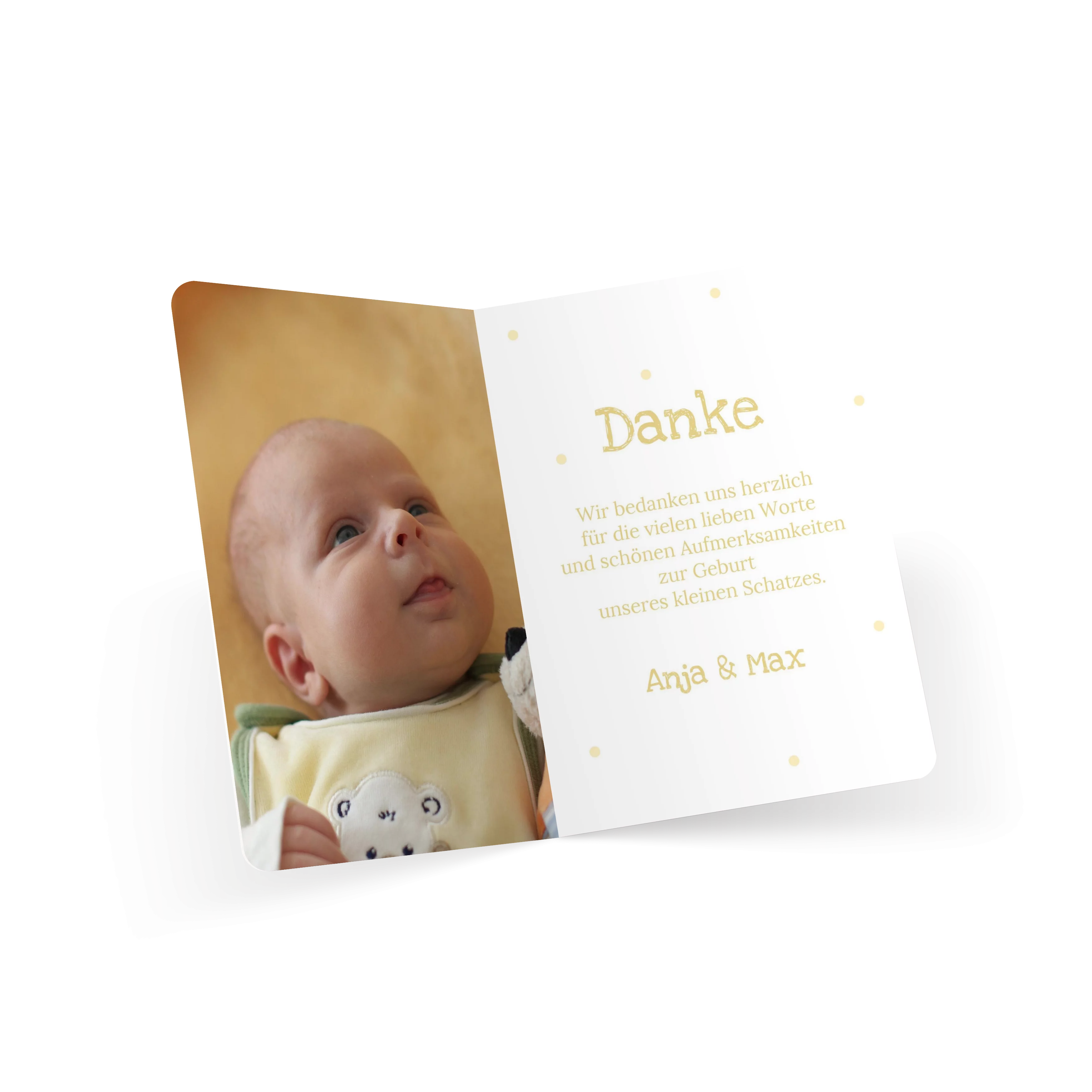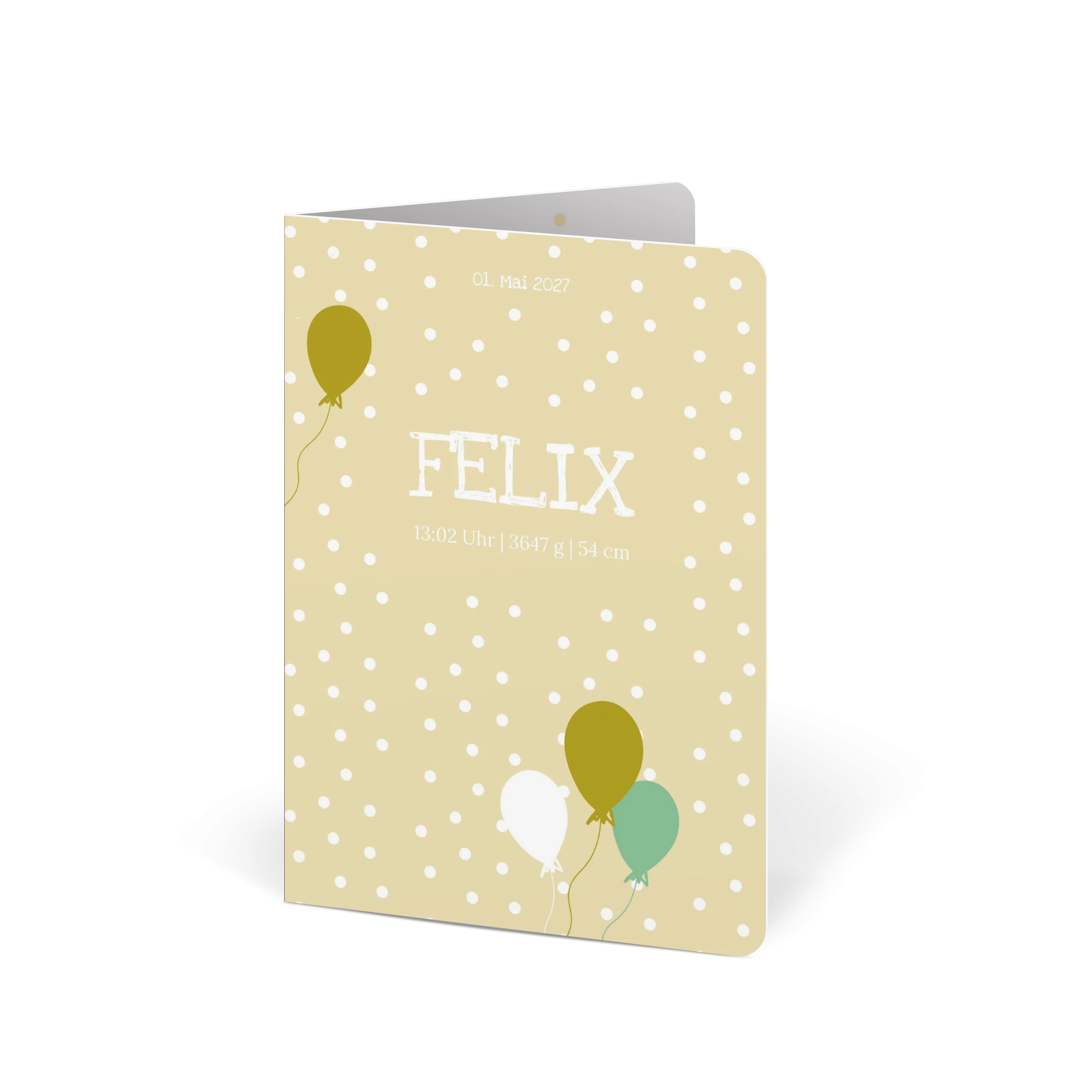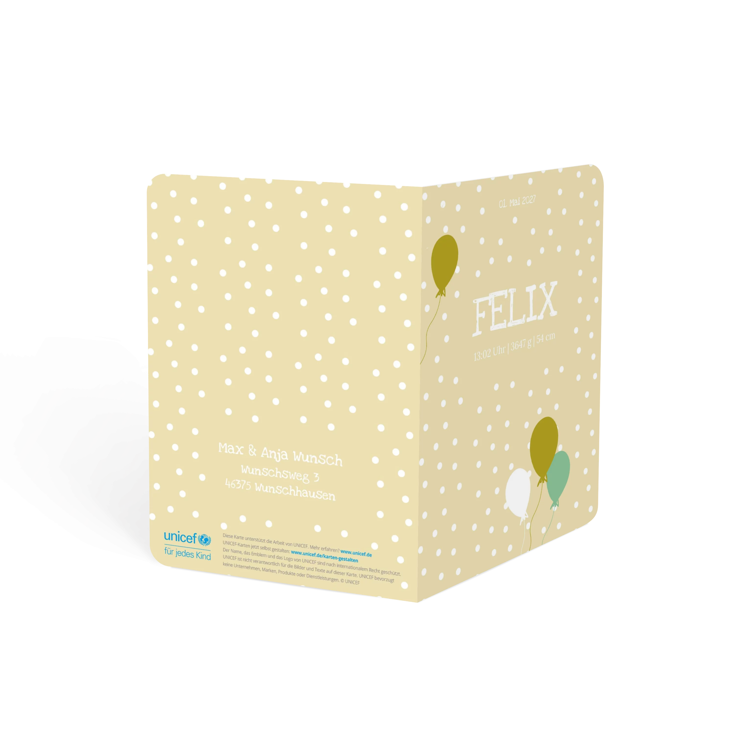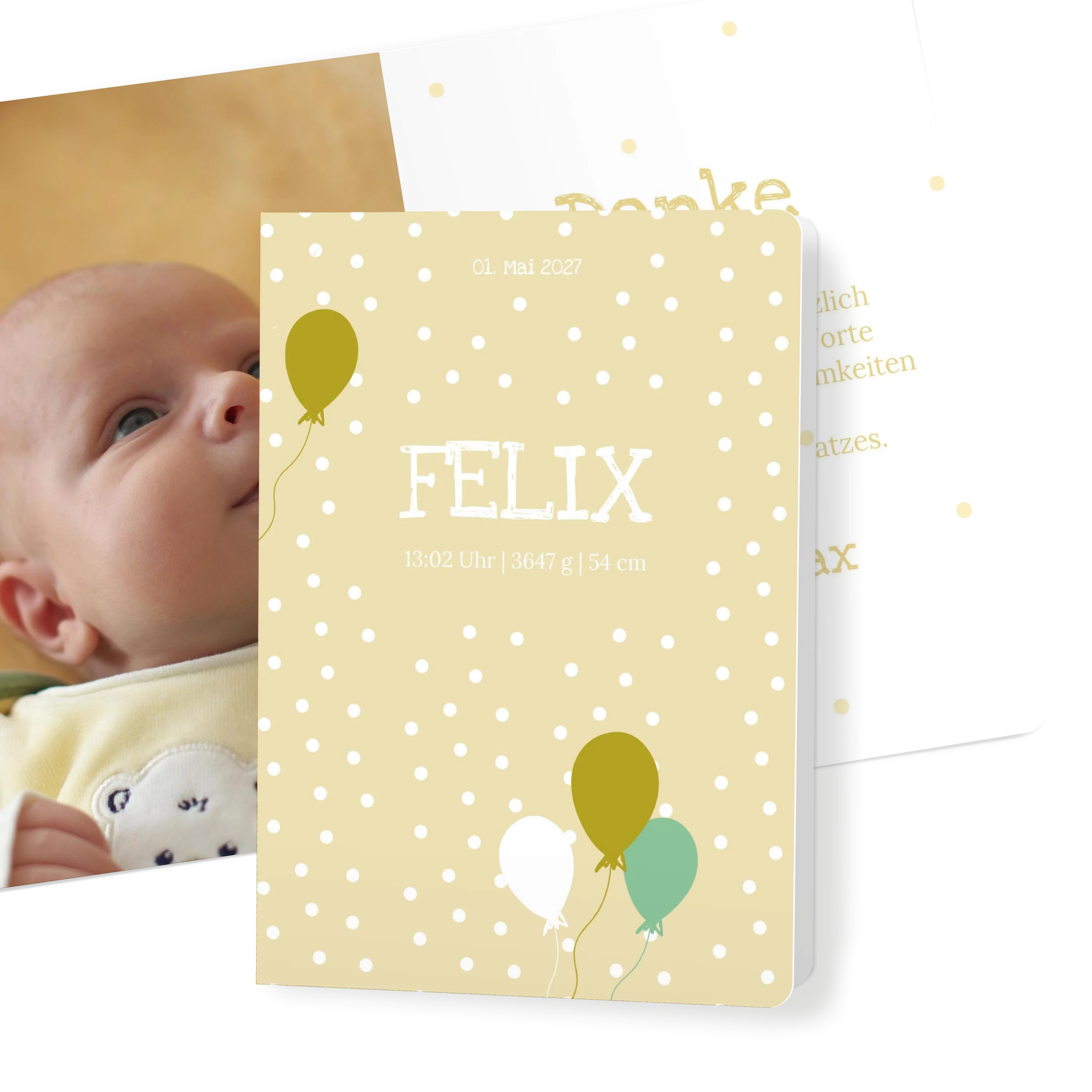 Ein fröhliches Design in zartem Gelb mit weißen Punkten und kleinen Luftballons macht diese Karte zur perfekten Wahl für die ersten Grüße nach der Geburt. Die typografische Gestaltung ist verspielt und klar zugleich – ideal, um die Ankunft Ihres Babys liebevoll zu verkünden.