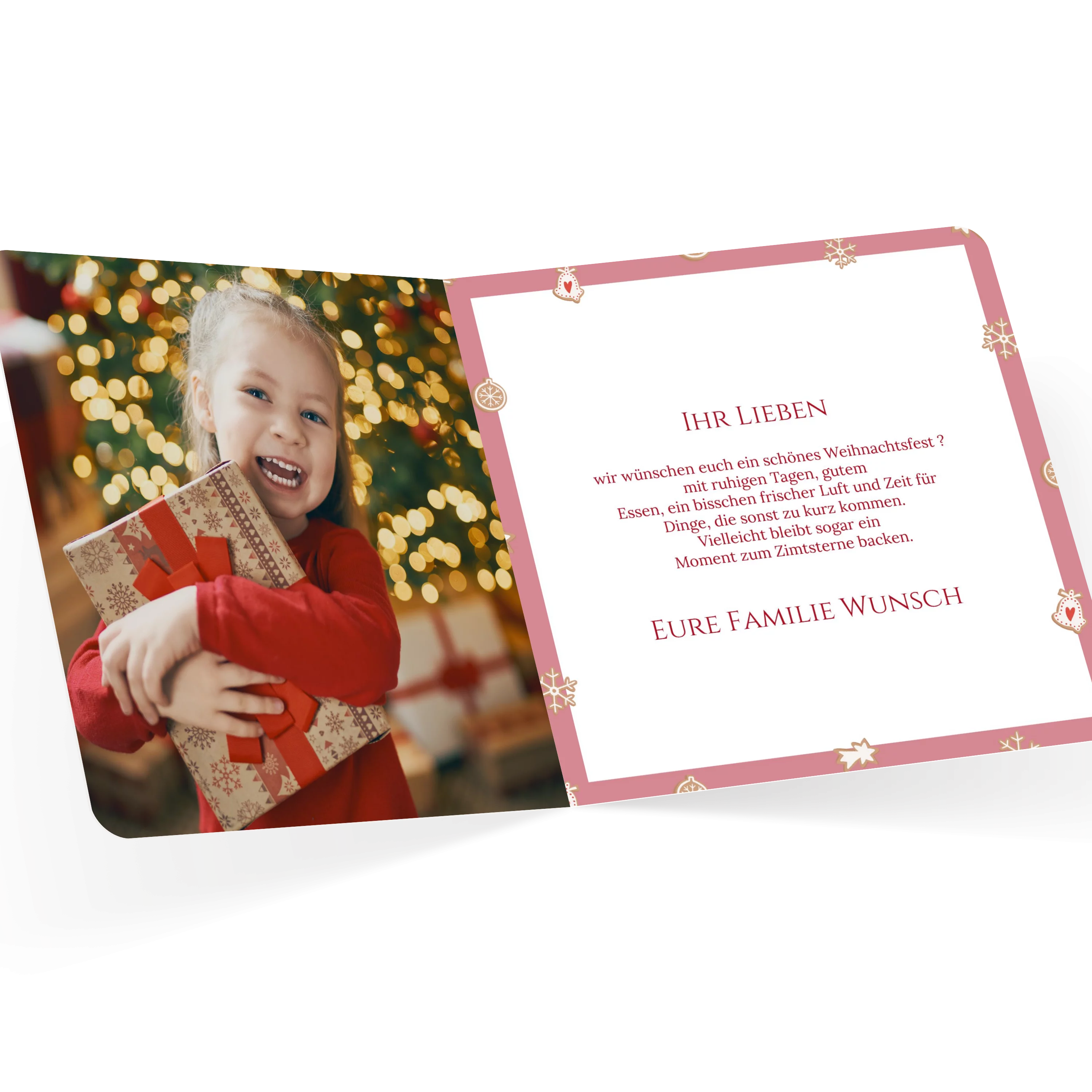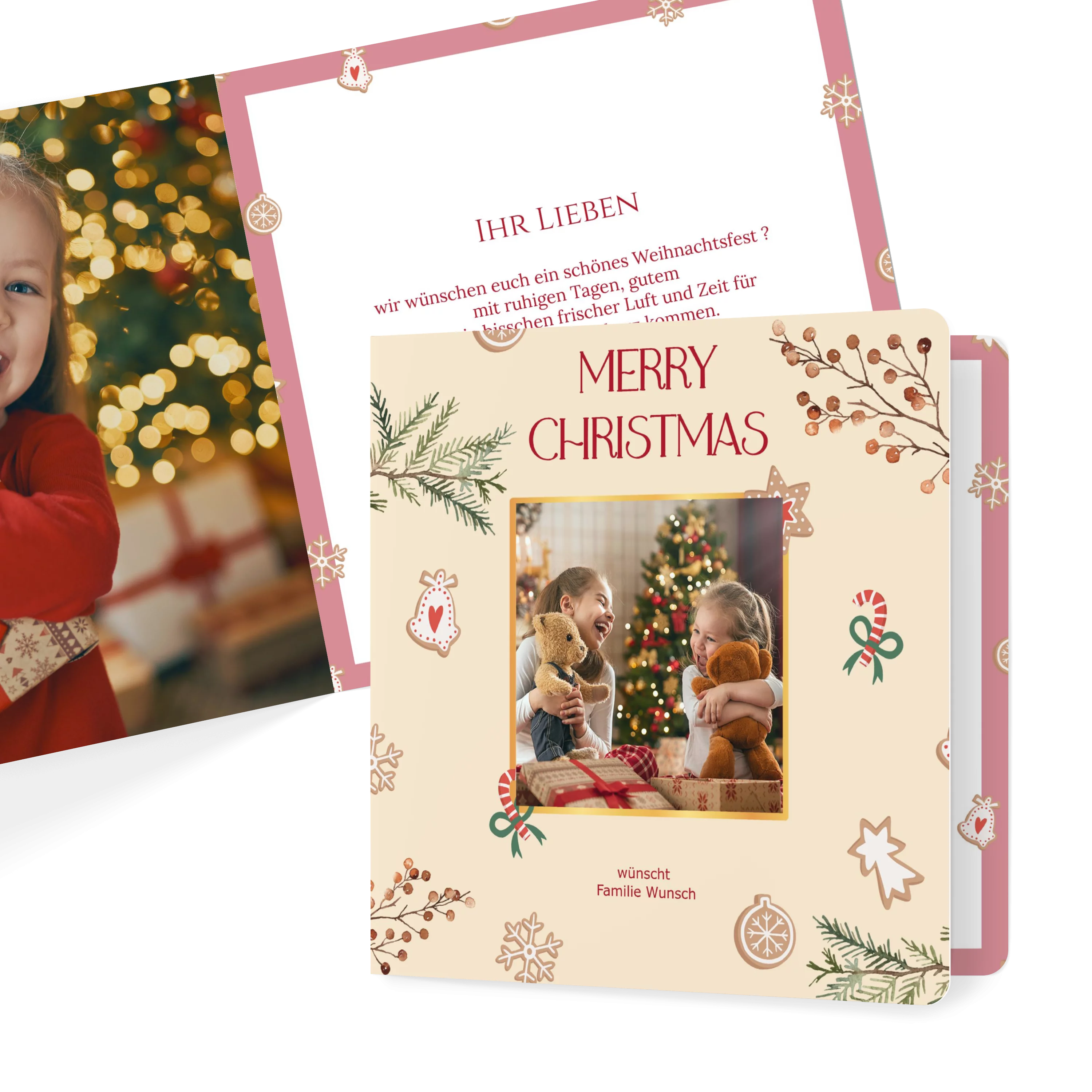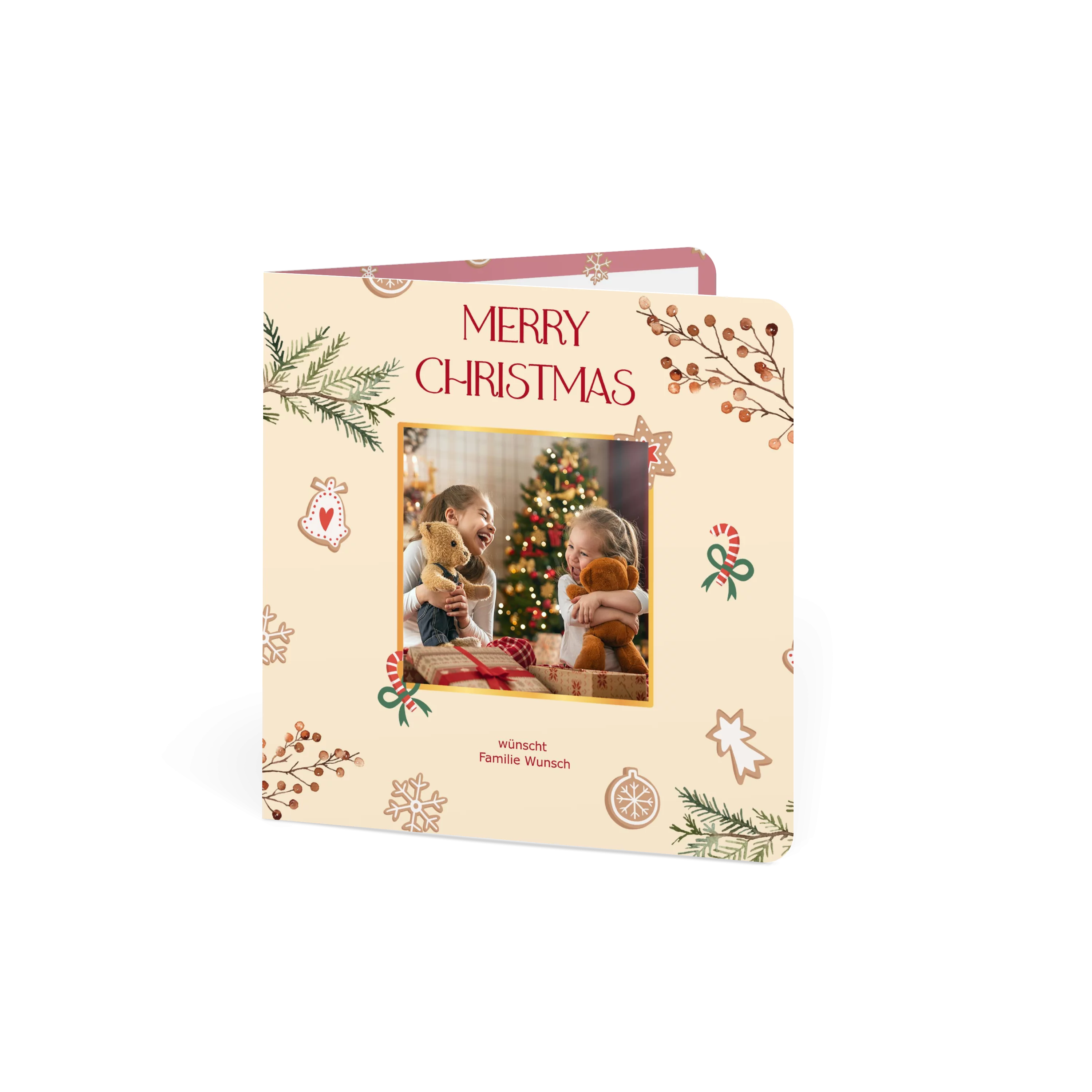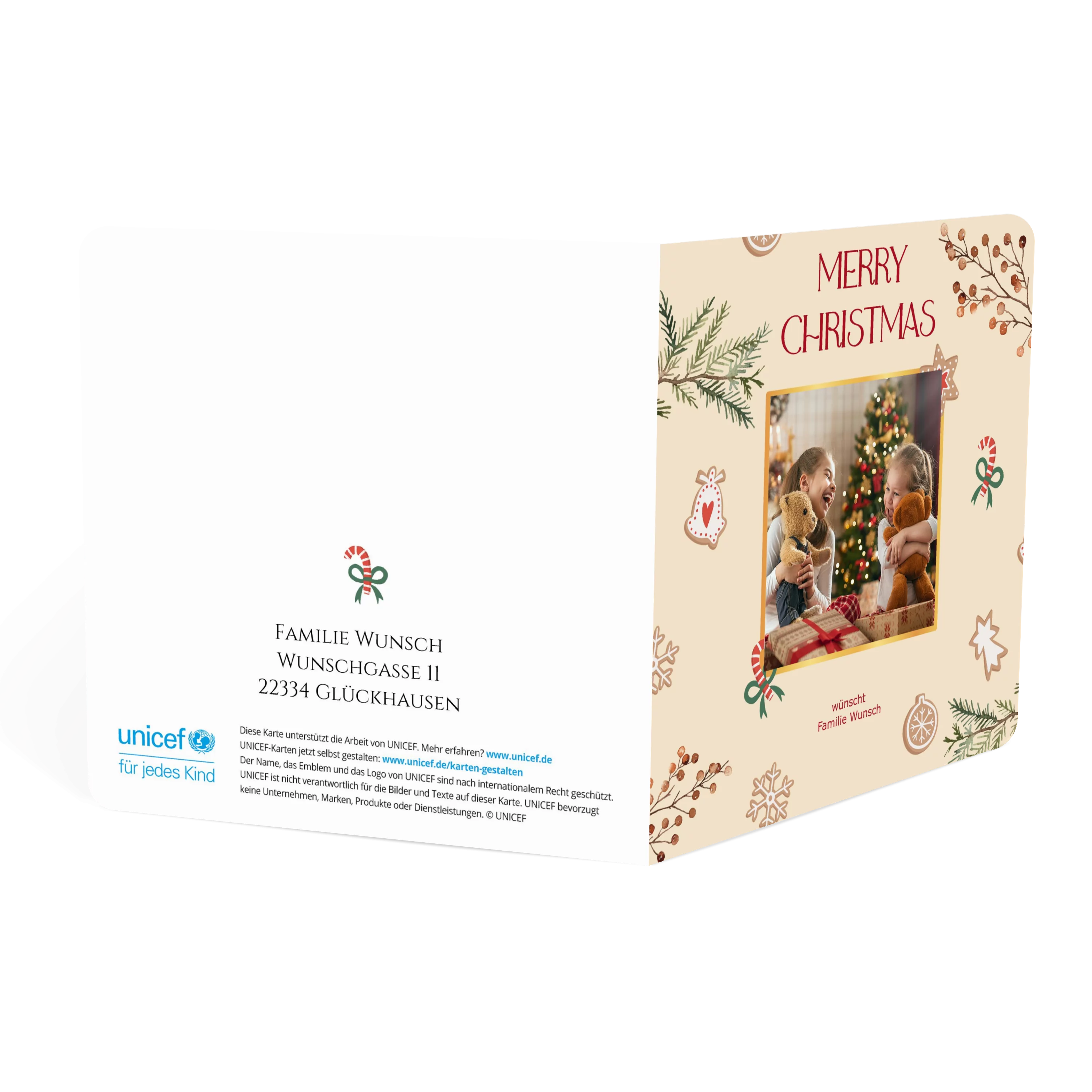 Weihnachtskarten gestalten: Bei dem Motiv „Merry Christmas“ steht das Foto Ihrer Wahl im Zentrum, geschmückt von winterlichen Zweigen, weihnachtlichen Motiven und einem stilvollen festlichen Schriftzug. Weihnachtskarte mit Foto im Format 14 x 14 cm, auch erhältlich als flache Karte oder Doppelklappkarte. Gestalten Sie Ihre Karten zu Weihnachten mit Fotos und persönlichem Text. Wir nutzen Papier aus nachhaltiger Forstwirtschaft und eine plastikfreie Verpackung. Mit dem Kauf von UNICEF Weihnachtskarten helfen Sie Kindern in Not.