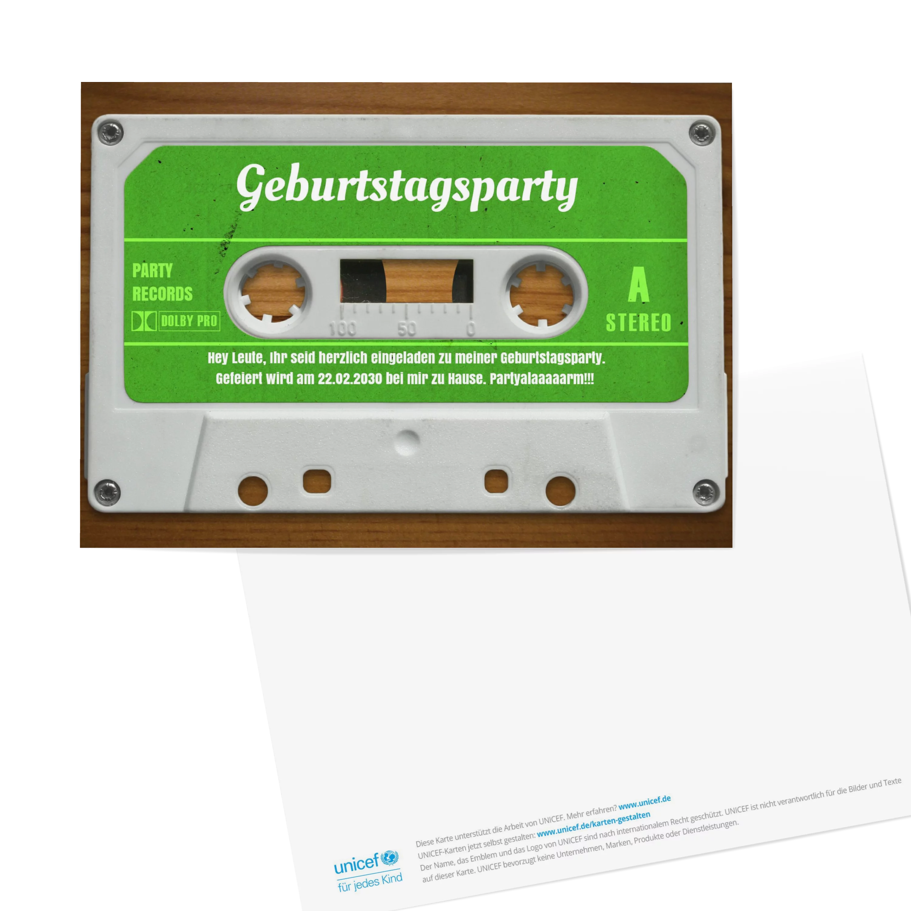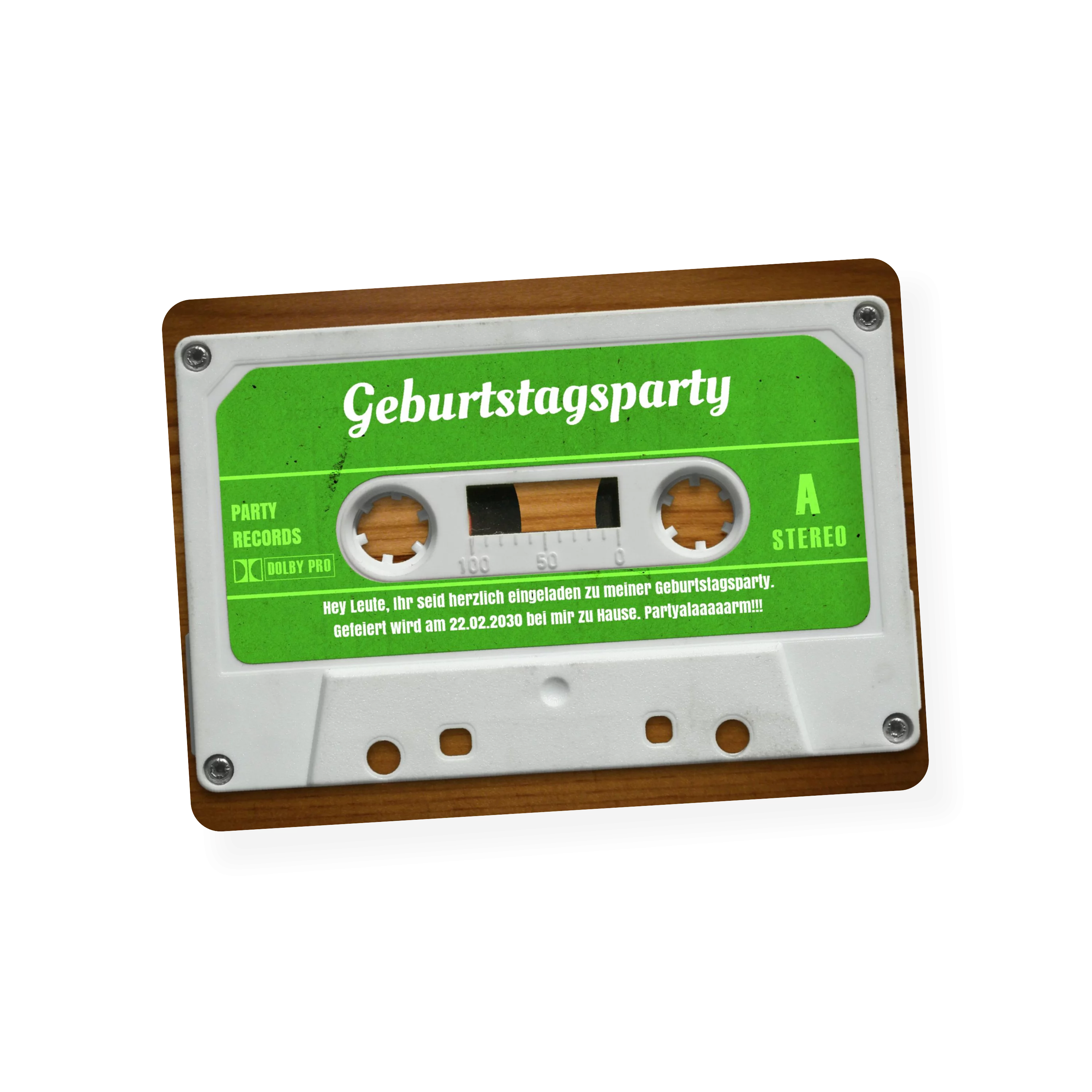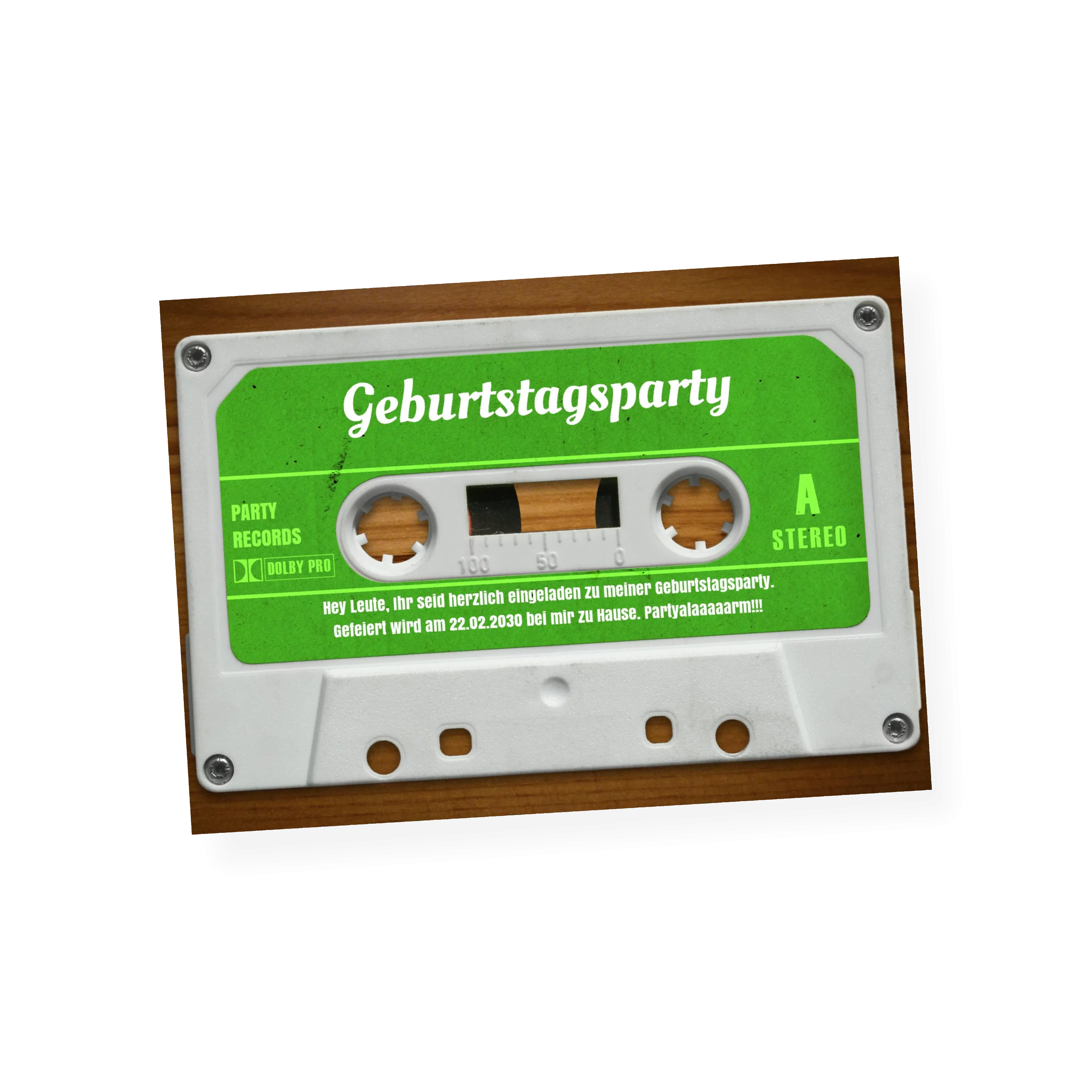 Diese Einladung ist ein echtes Mixtape für alle, die mit guter Laune feiern wollen. Das Design im Retro-Kassettenlook weckt Erinnerungen an die 80er und 90er – perfekt für eine Geburtstagsparty mit Nostalgie-Vibes, Musik und jeder Menge Spaß!