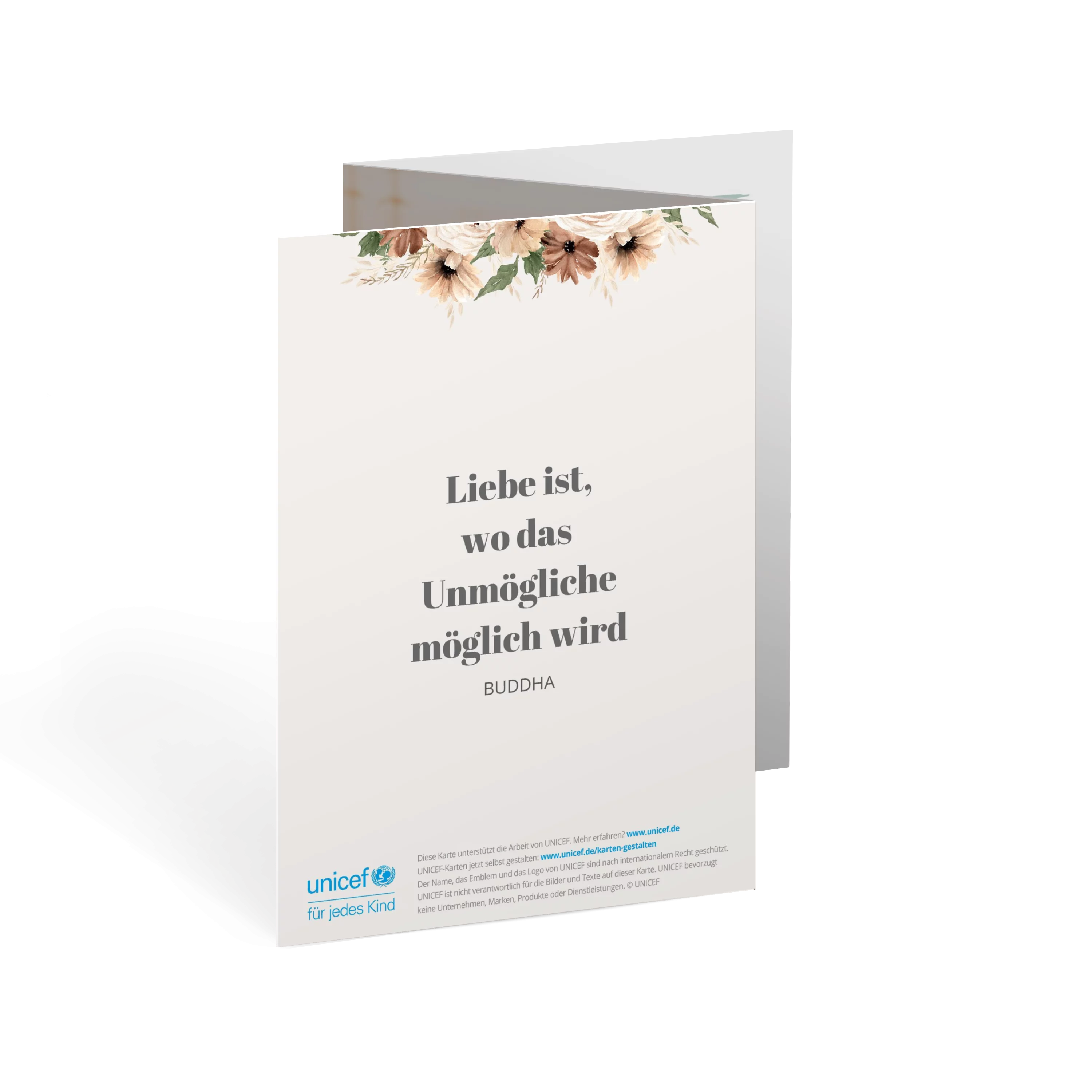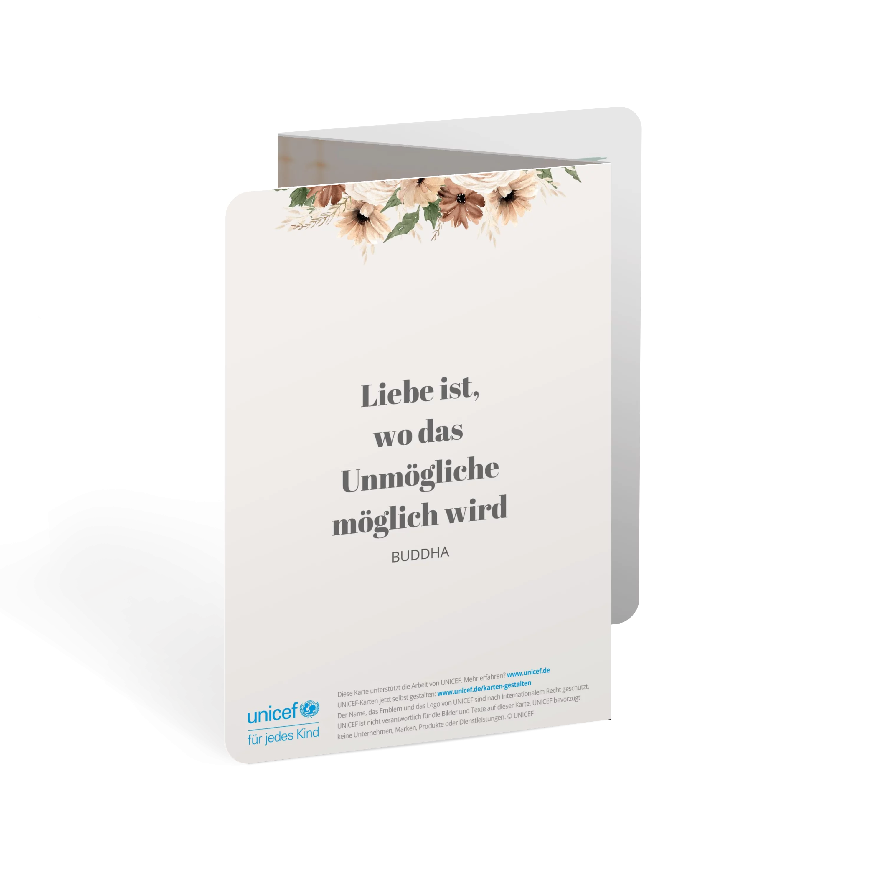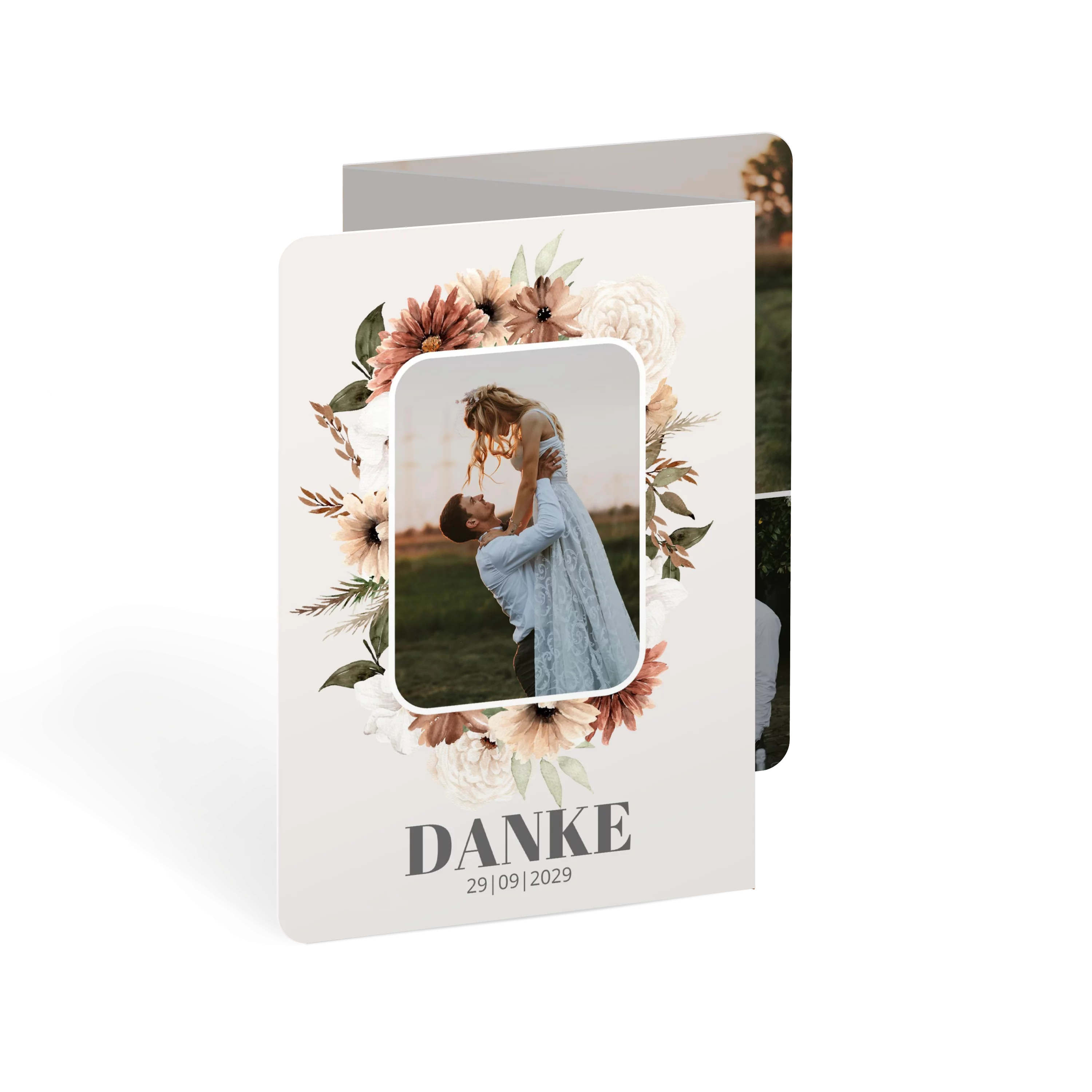 Zarte Blüten in warmen Tönen umrahmen Ihre lieben Worte – verspielt, natürlich und mit einem Hauch Nostalgie. Diese Karte im modernen Boho-Stil ist wie gemacht, um von Herzen Danke zu sagen.