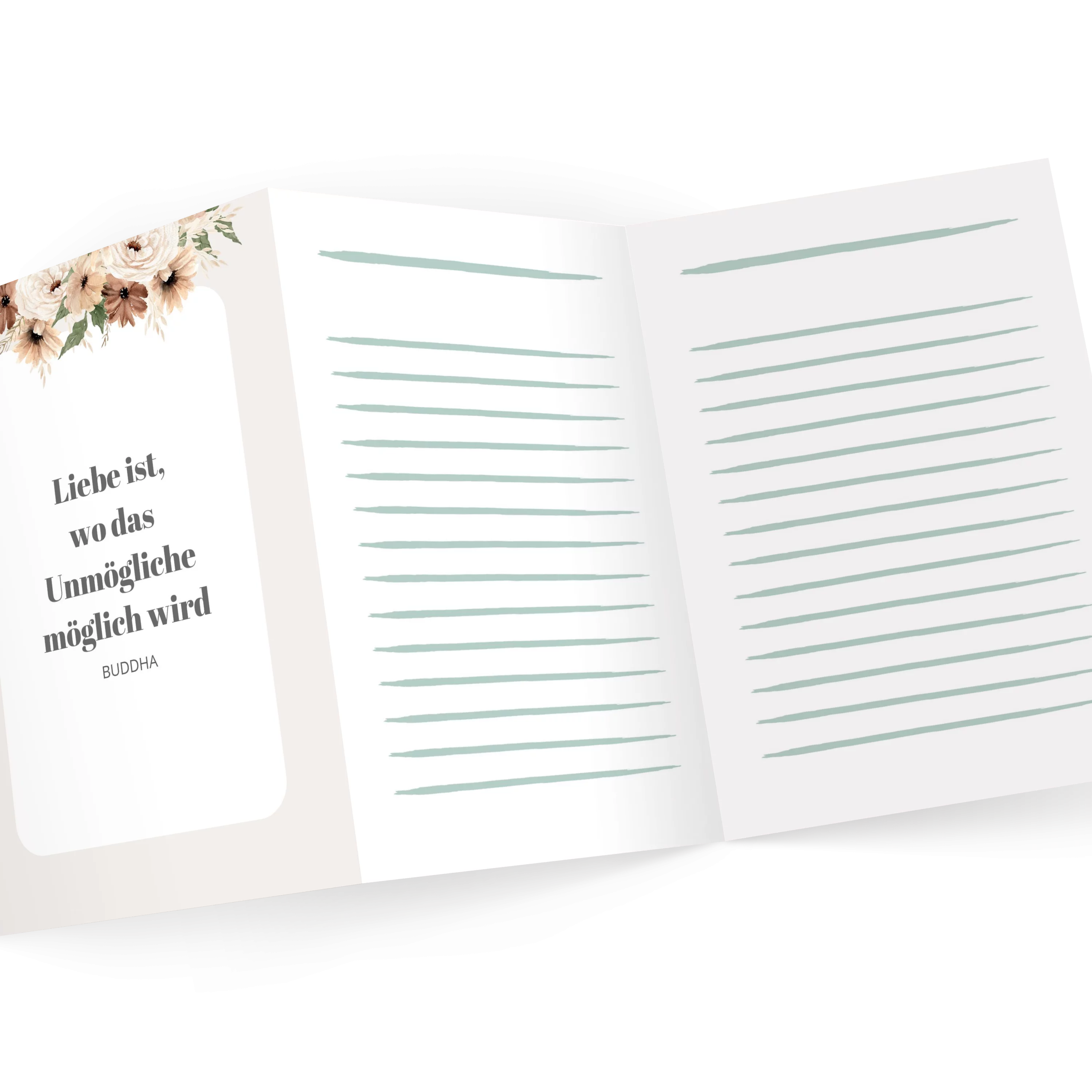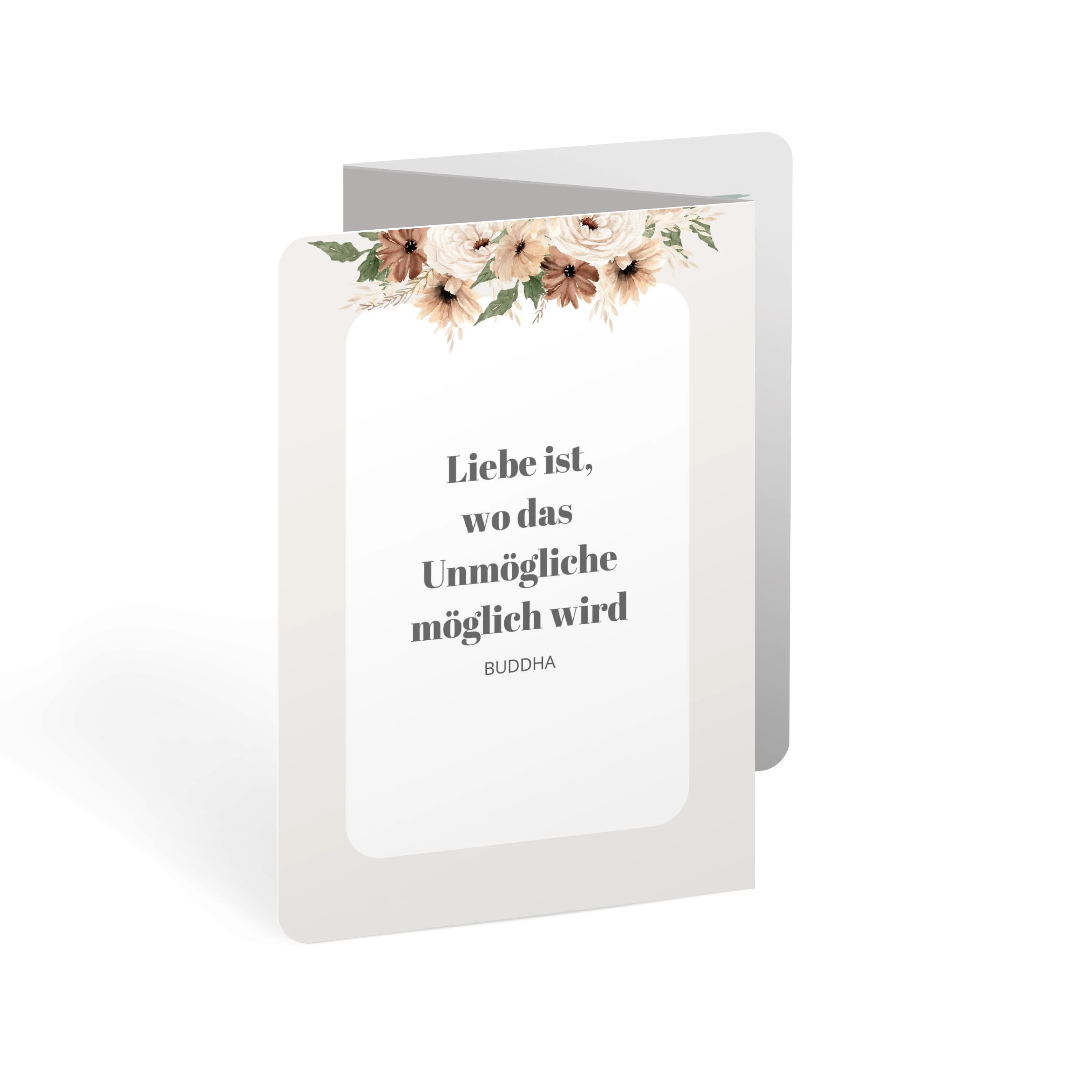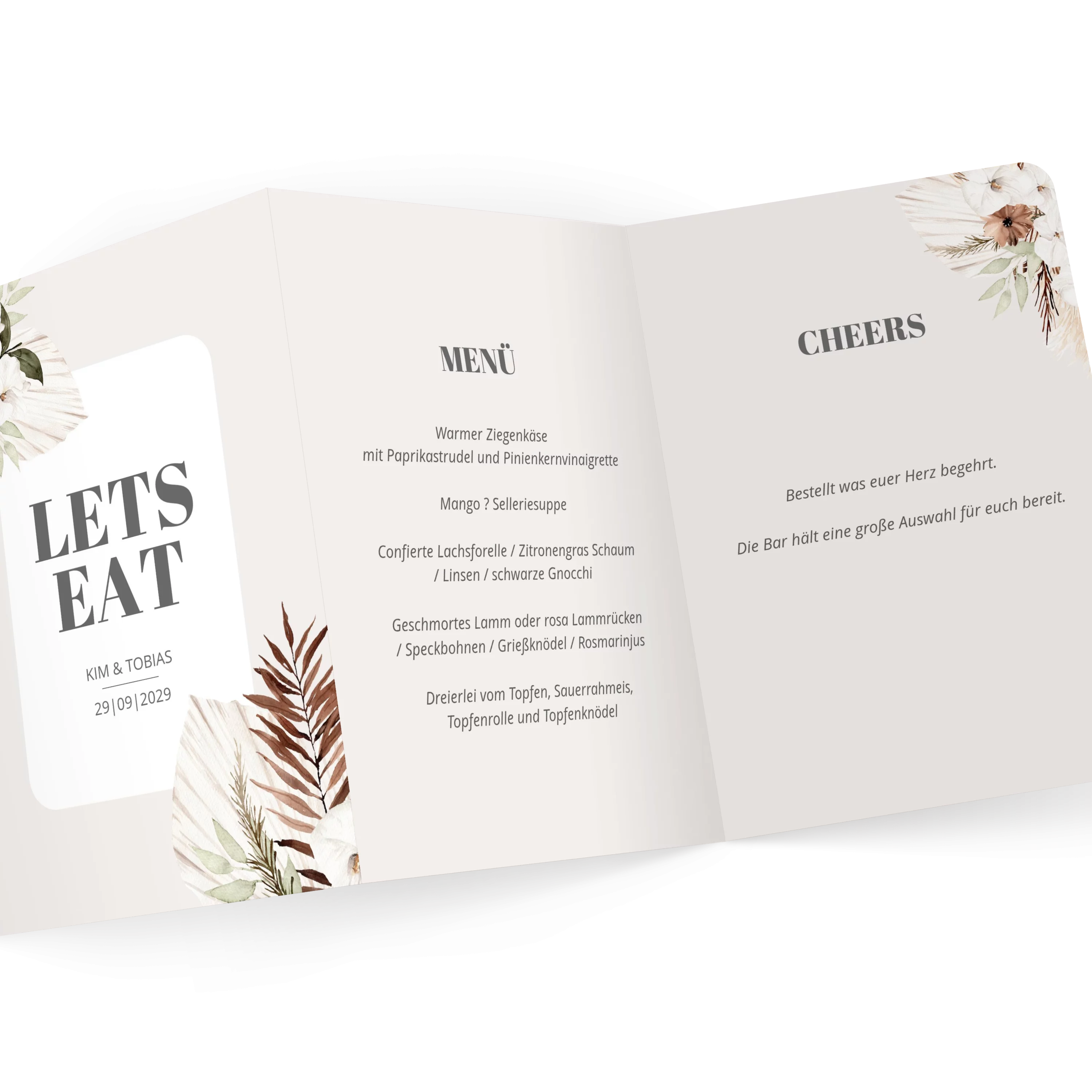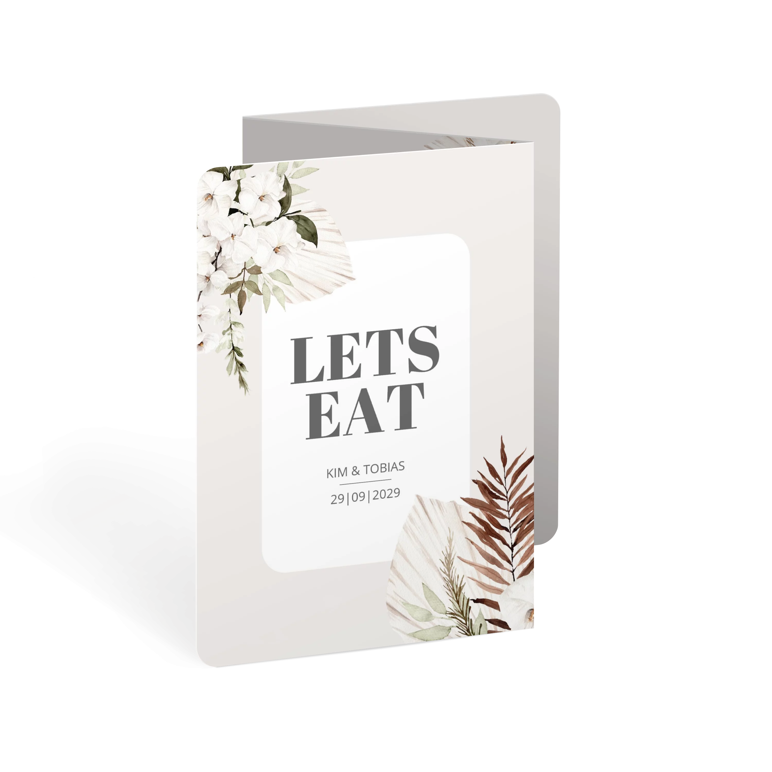 Mit feinen Trockenblumen-Elementen und sanften Naturtönen hüllt sich diese Menükarte in einen Hauch von Boho ein. Elegant und modern – für eine stilvolle Präsentation eures Menüs.