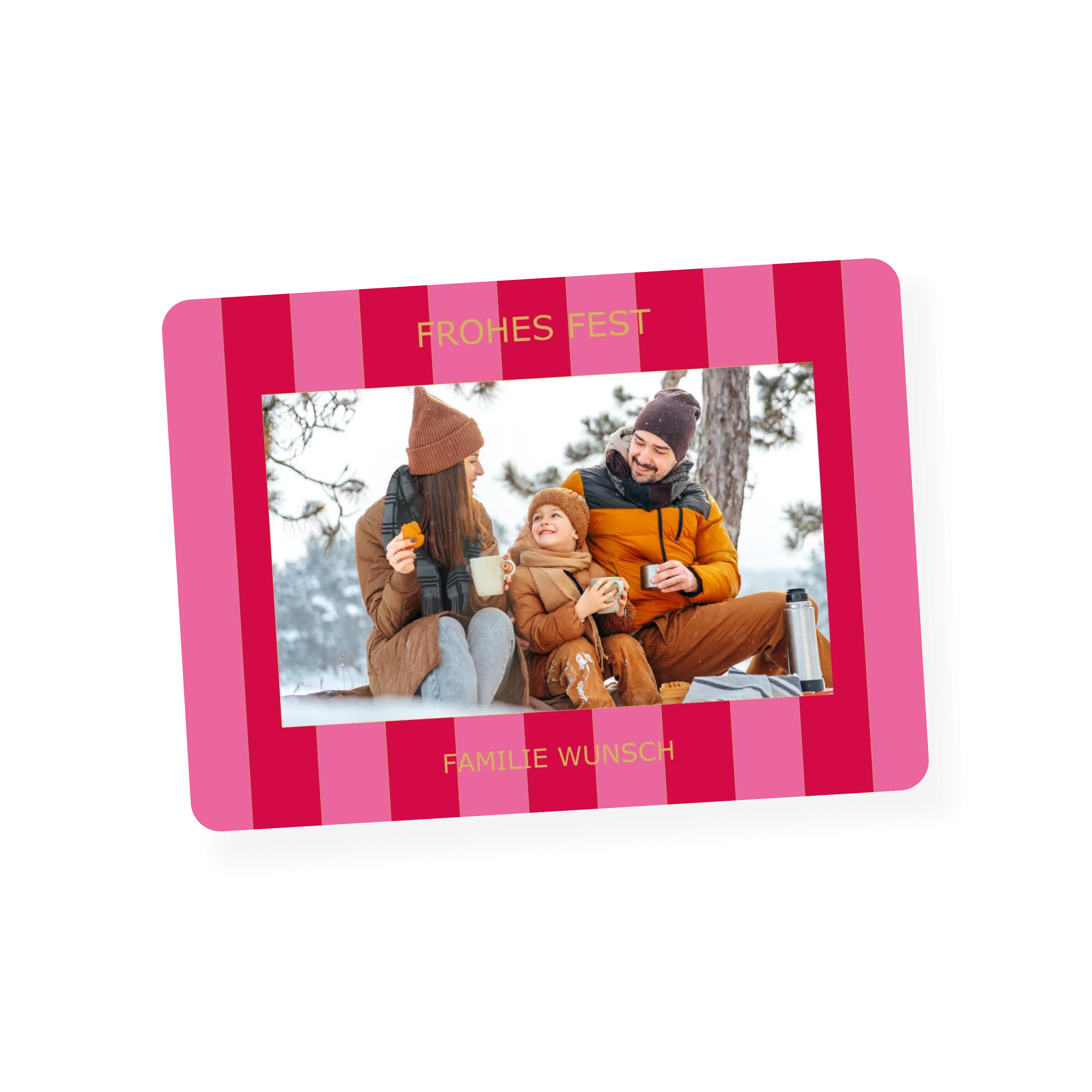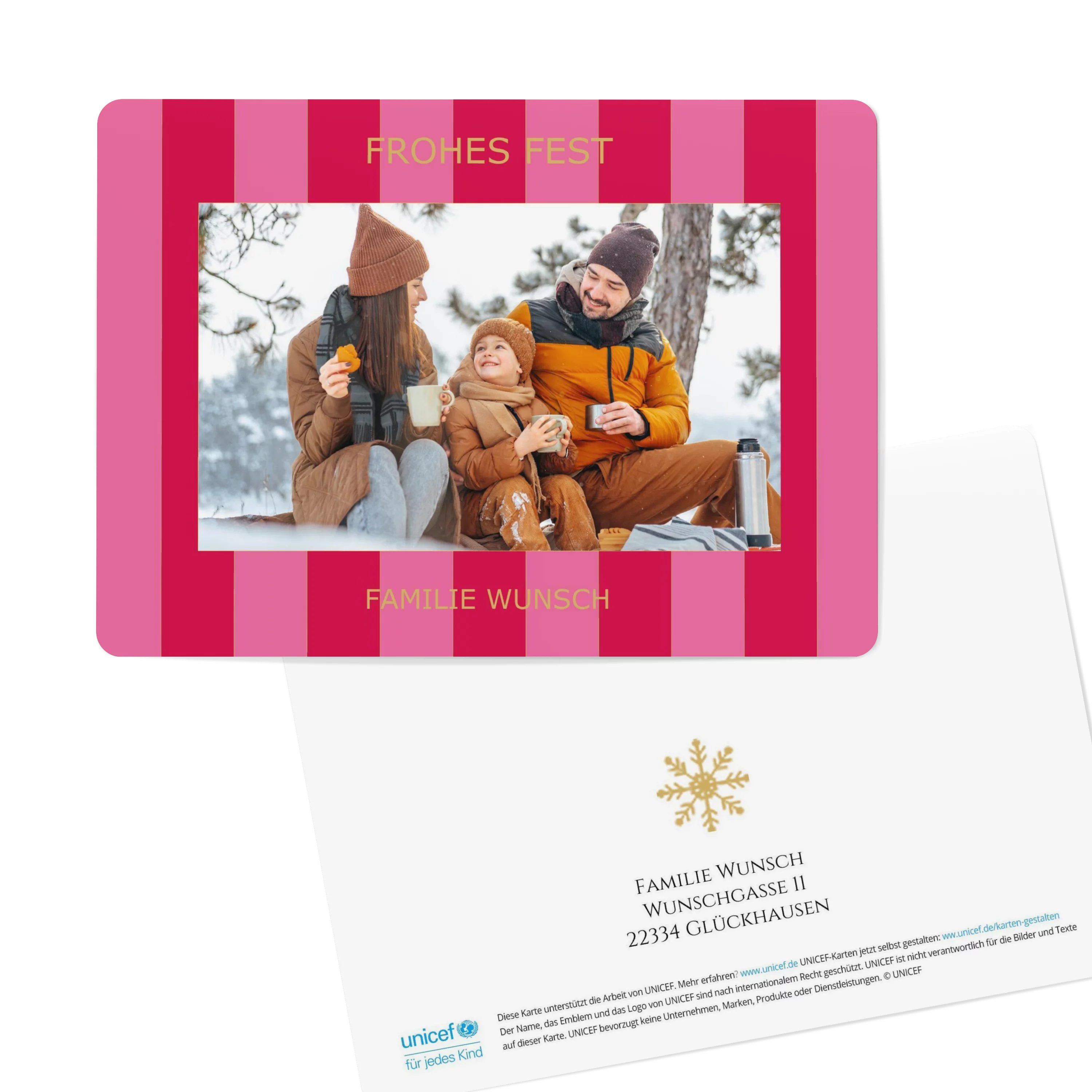 Weihnachtskarten gestalten: Bei der Karte „Modern Stripes“ von UNICEF steht das persönliche Familienfoto im Mittelpunkt, umrandet von Streifen in modernen Farben und abgerundet mit einem goldenen Weihnachtsgruß. Weihnachtskarte mit Foto im Format 16,6 x 11,8 cm, erhältlich als flache Karte, Klappkarte oder Doppelklappkarte. Gestalten Sie Ihre Karten zu Weihnachten mit eigenen Fotos und persönlichem Text.