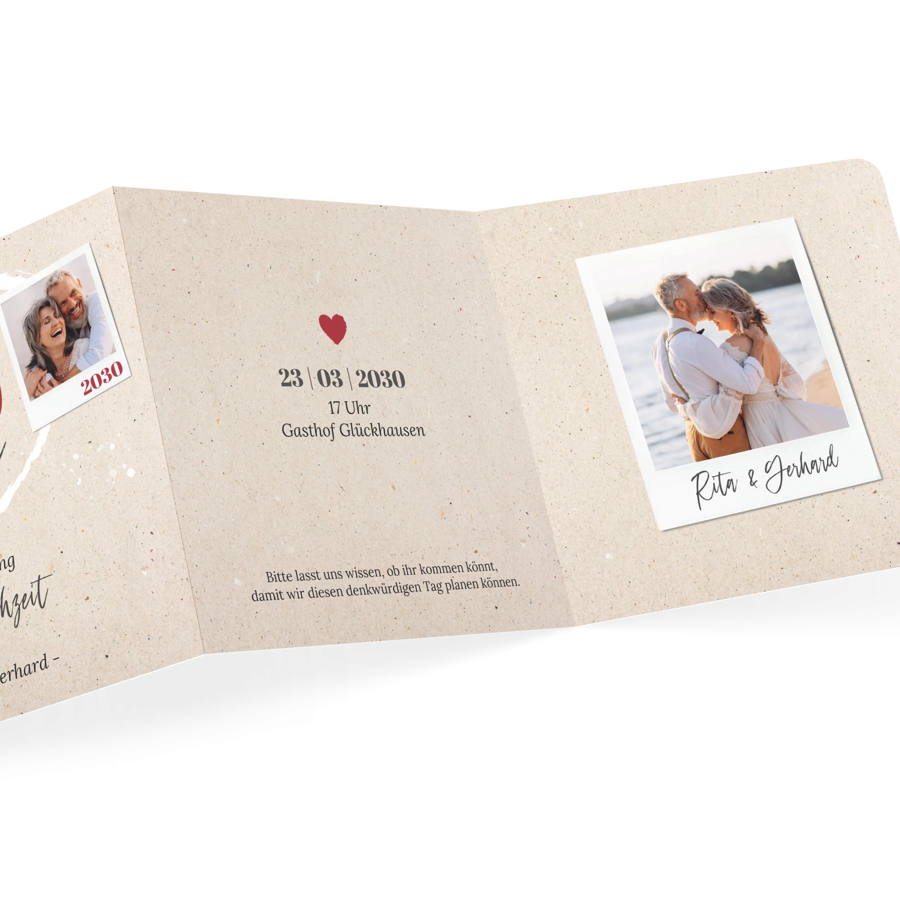 Eine liebevoll gestaltete Einladung mit natürlichem Fond, Polaroid-Optik und handgezeichnetem Herz – perfekt für alle, die gemeinsam auf viele gemeinsame Jahre zurückblicken. Die Jahreszahlen und Bilder lassen sich individuell anpassen.