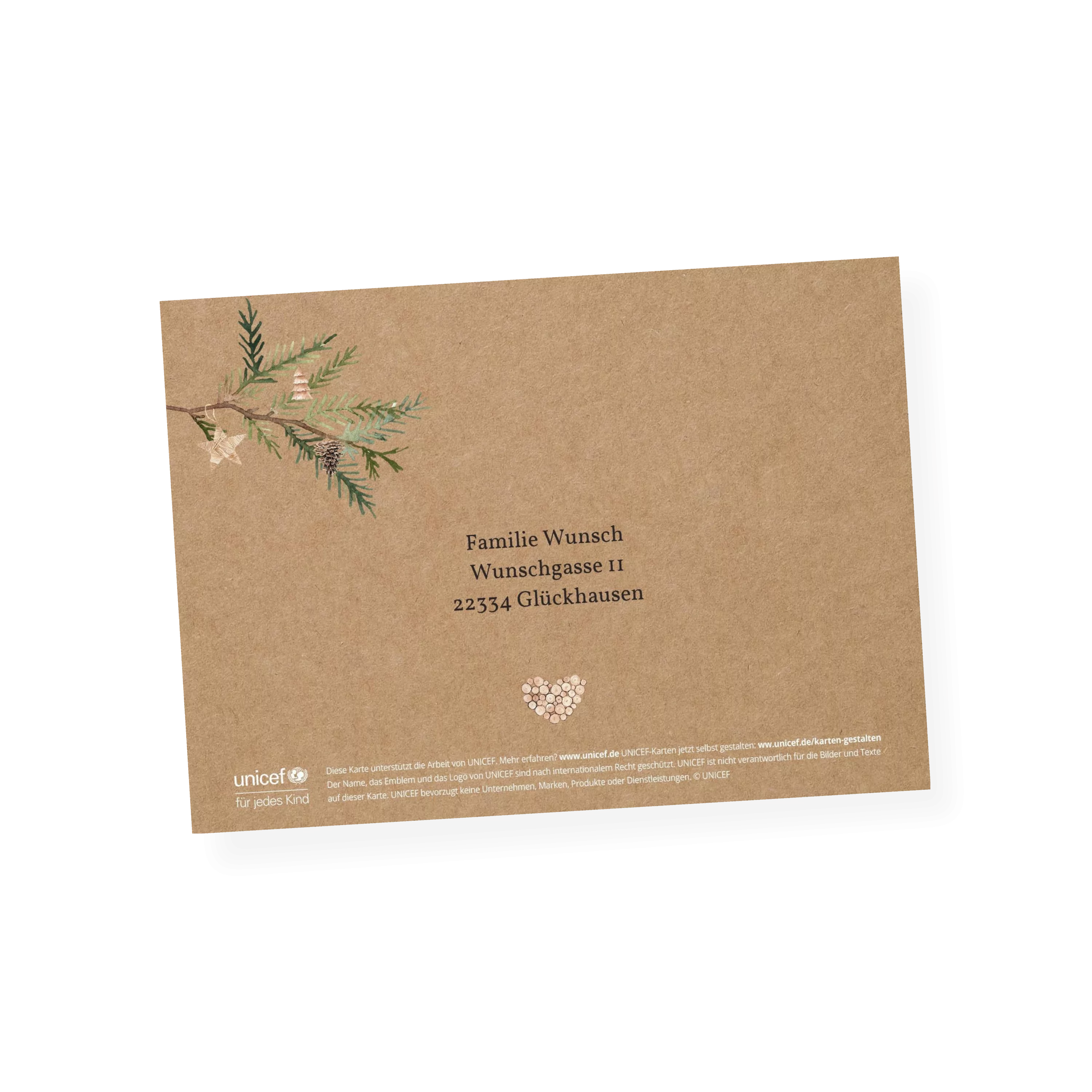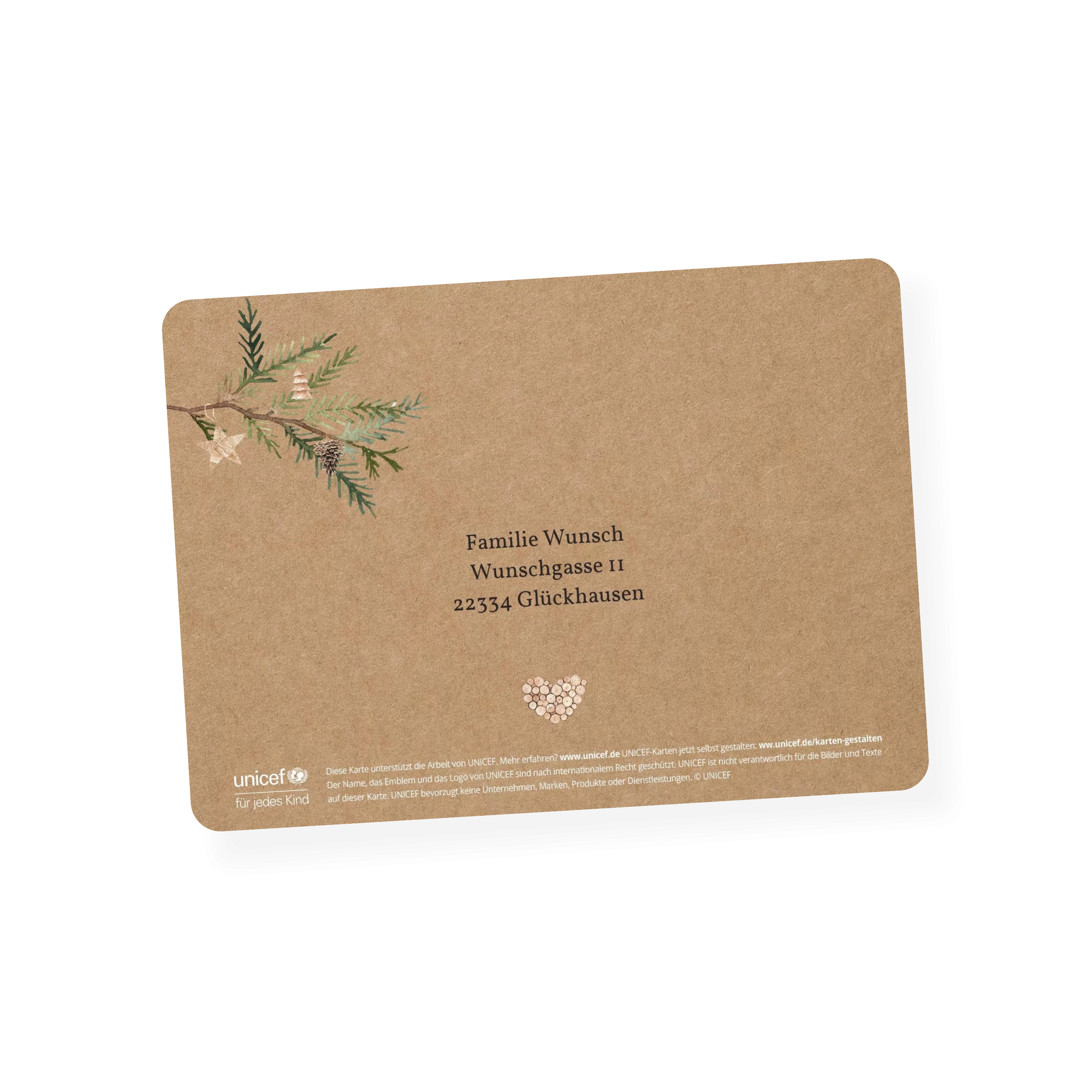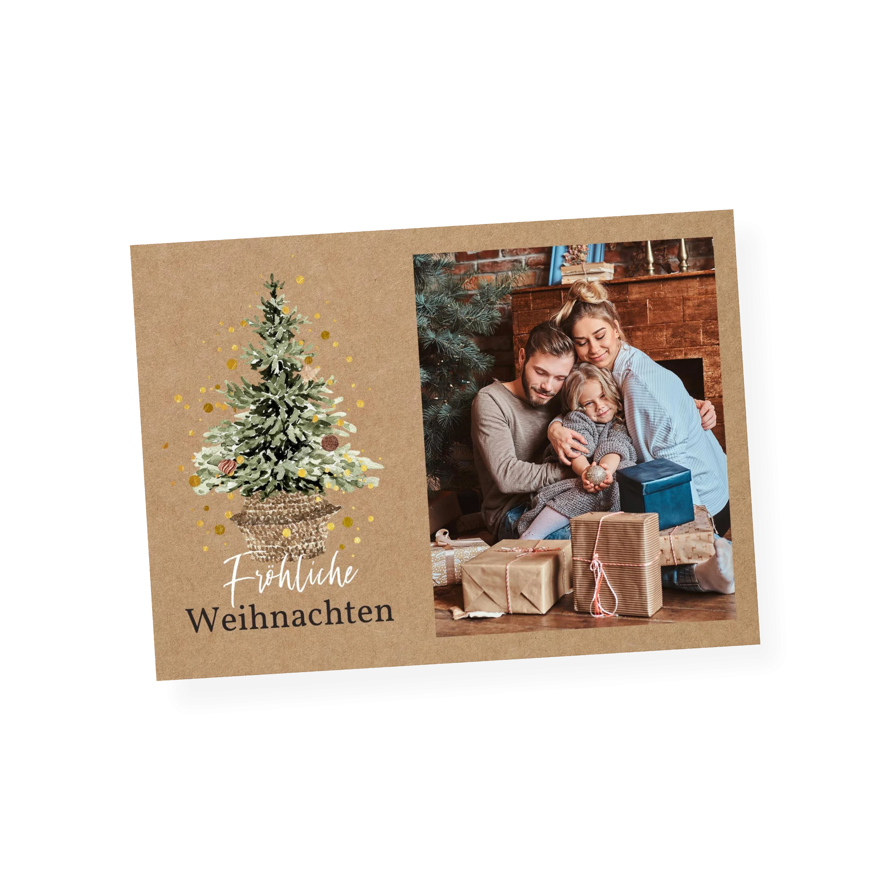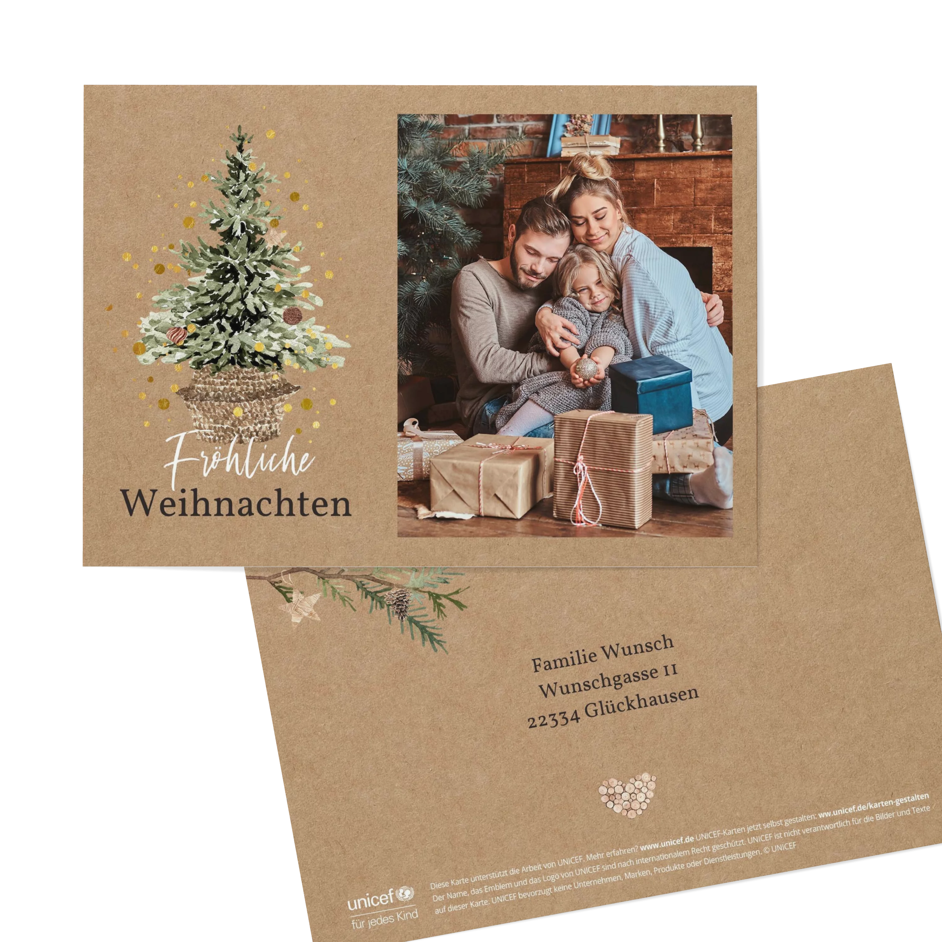 Weihnachtskarten gestalten mit dem Motiv „O Tannenbaum“ im angesagten Kraftpapier-Look. Weihnachtskarte mit Foto im Format 16,6 x 11,8 cm, auch erhältlich als flache Karte. Gestalten Sie Ihre Karten zu Weihnachten mit eigenen Fotos und persönlichem Text. Wir nutzen Papier aus nachhaltiger Forstwirtschaft und eine plastikfreie Verpackung. Mit dem Kauf von UNICEF Weihnachtskarten helfen Sie Kindern in Not. Jetzt Weihnachtskarten bestellen!