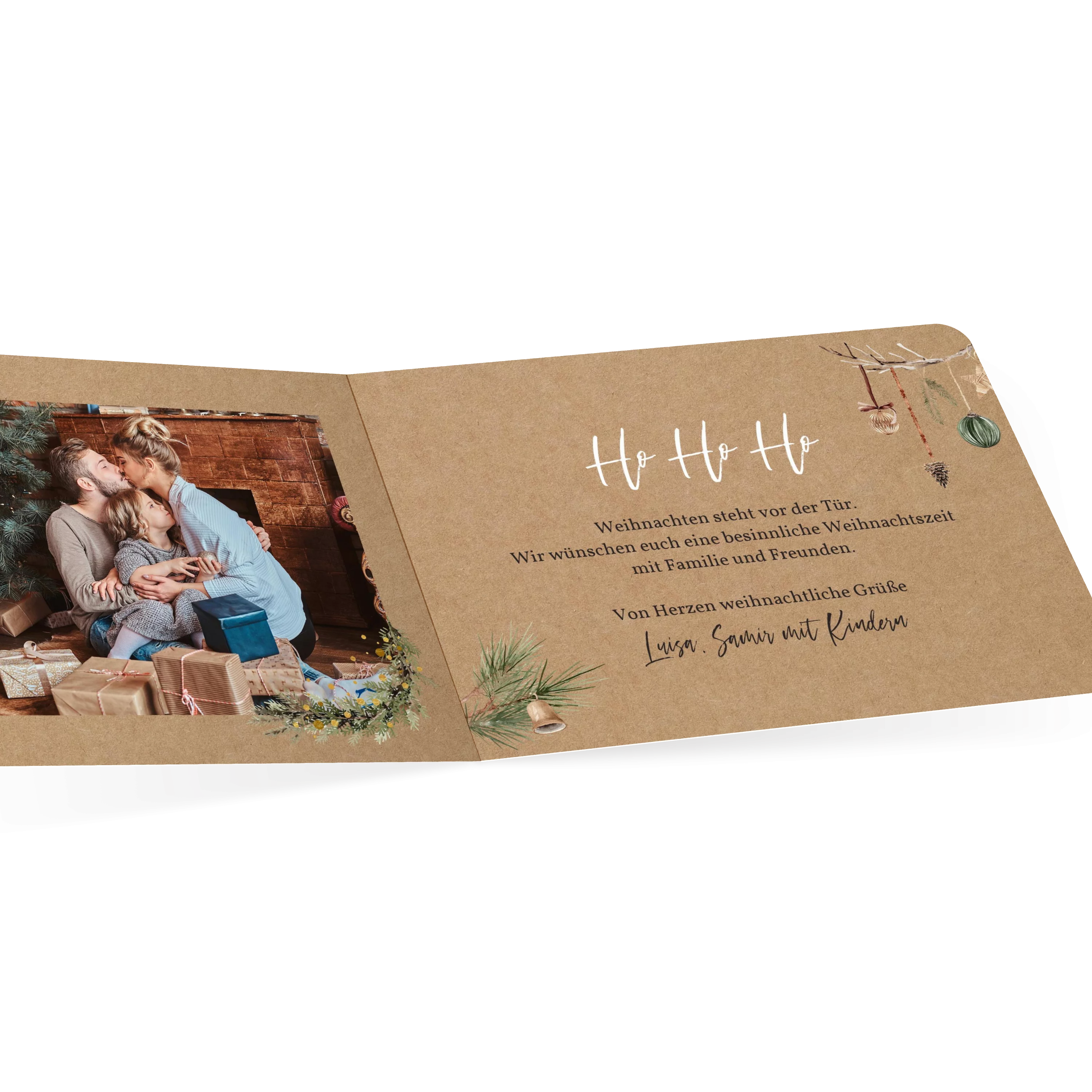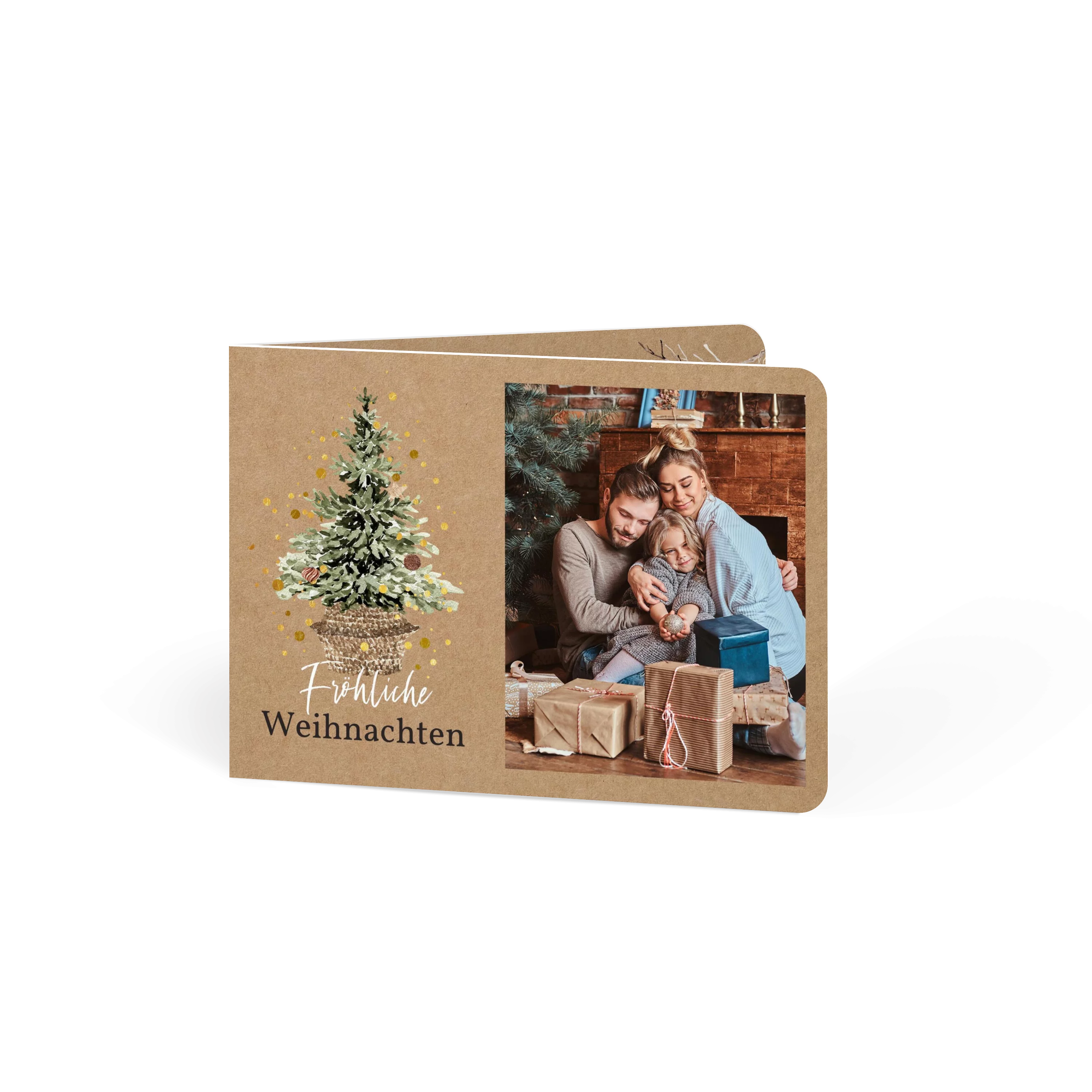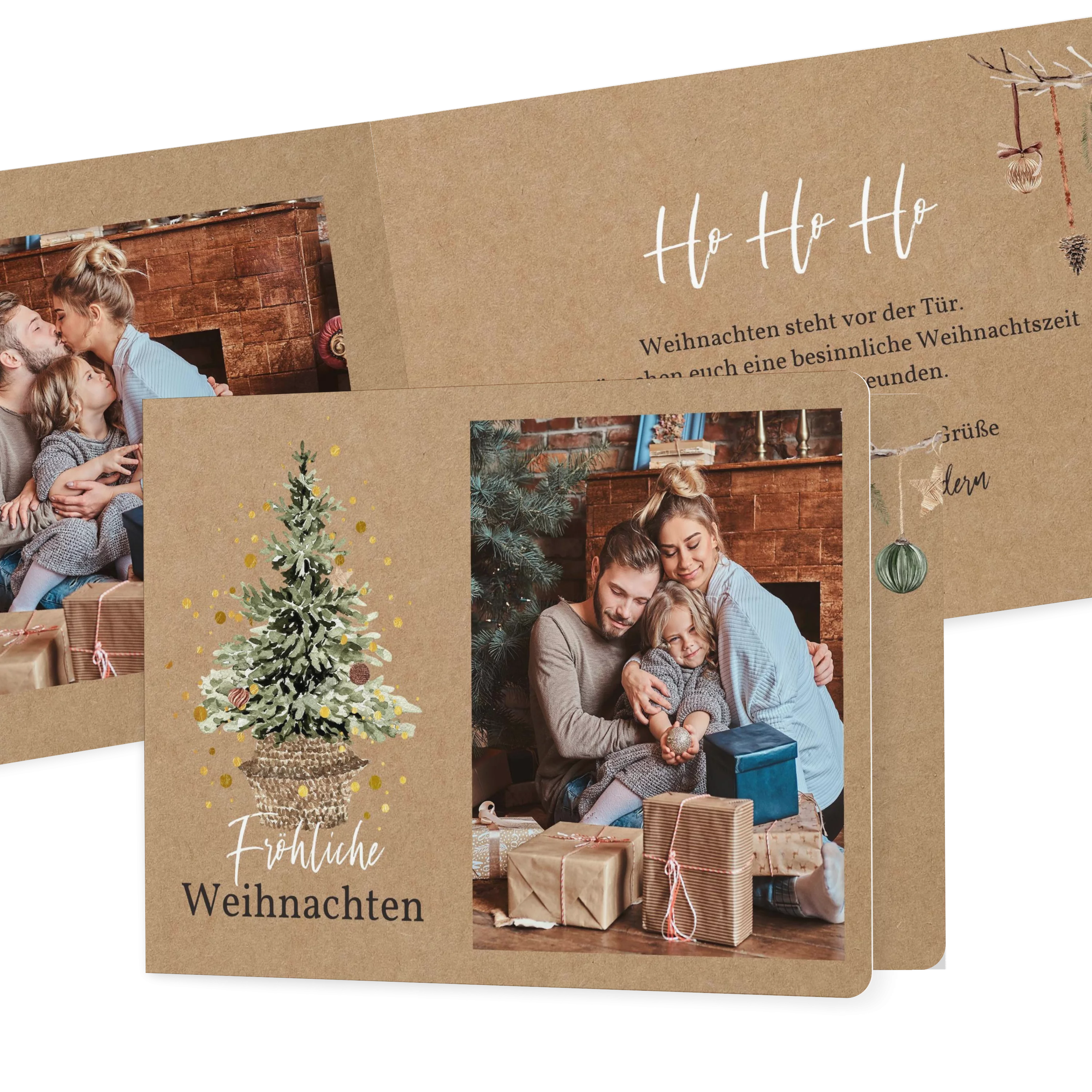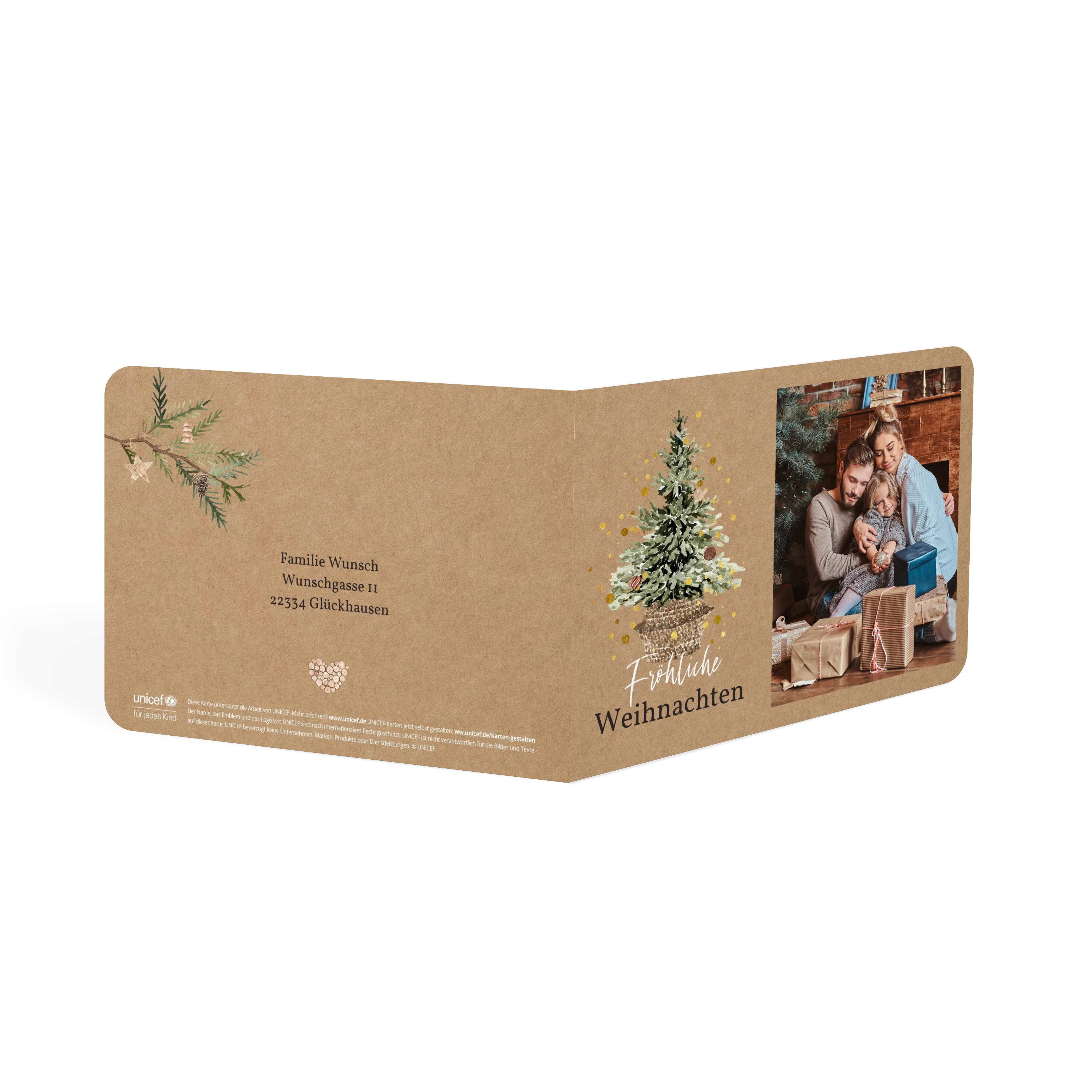 Weihnachtskarten gestalten mit dem Motiv „O Tannenbaum“ im angesagten Kraftpapier-Look. Weihnachtskarte mit Foto im Format 16,6 x 11,8 cm, auch erhältlich als flache Karte. Gestalten Sie Ihre Karten zu Weihnachten mit eigenen Fotos und persönlichem Text. Wir nutzen Papier aus nachhaltiger Forstwirtschaft und eine plastikfreie Verpackung. Mit dem Kauf von UNICEF Weihnachtskarten helfen Sie Kindern in Not. Jetzt Weihnachtskarten bestellen!