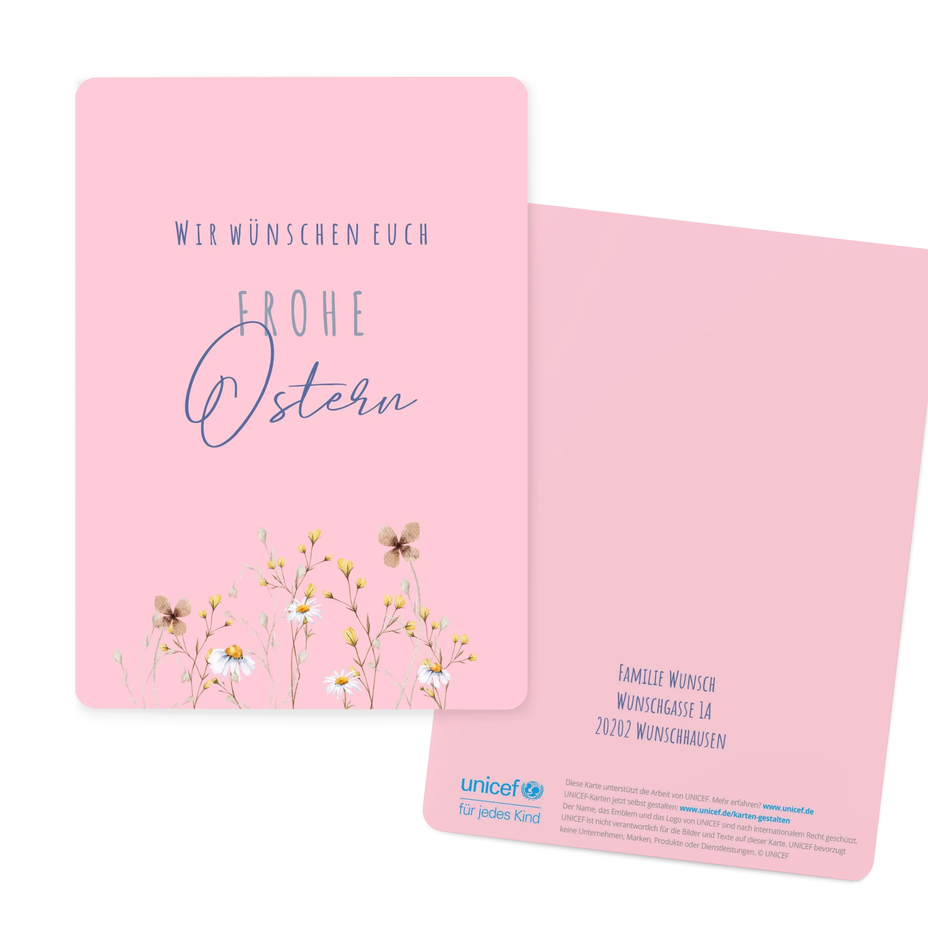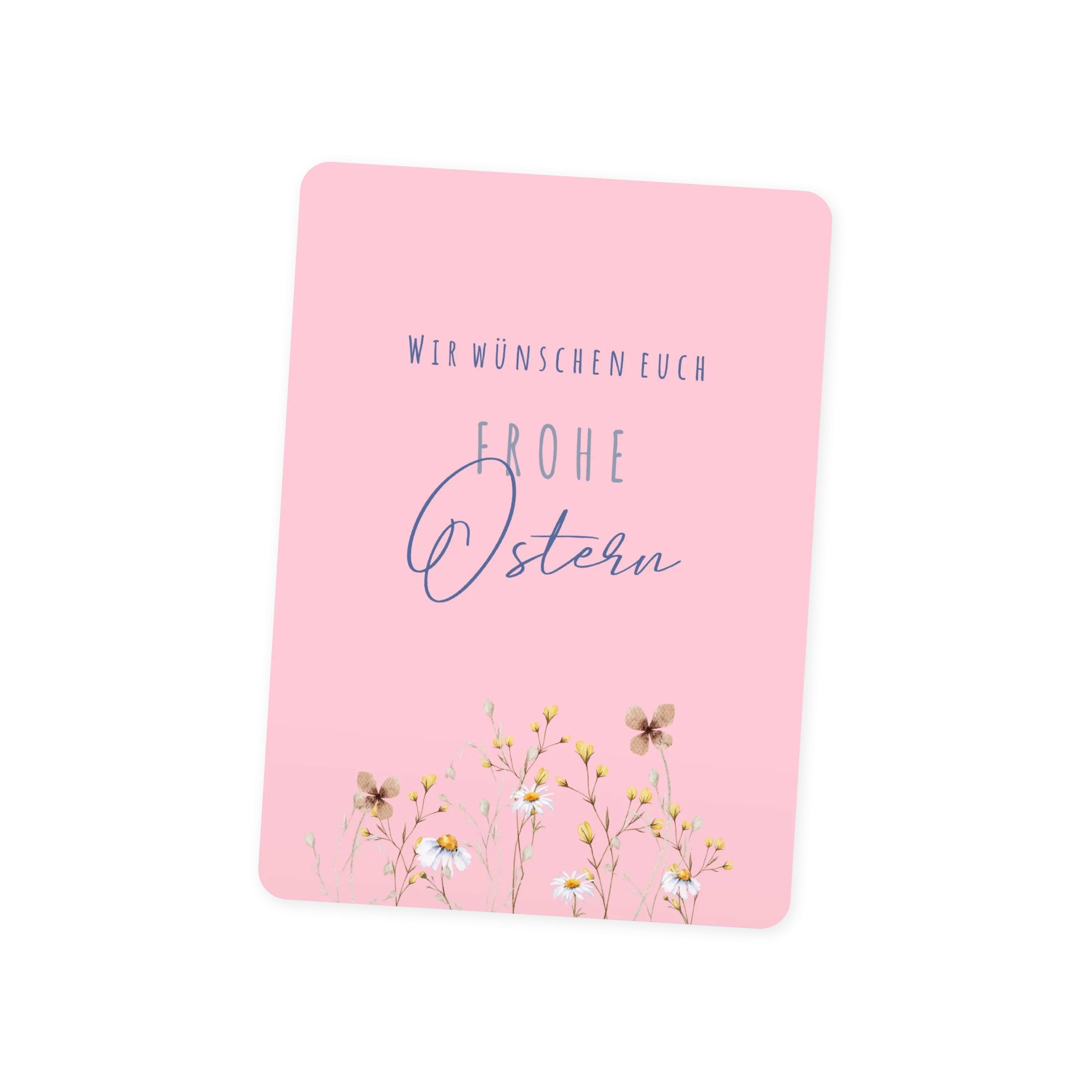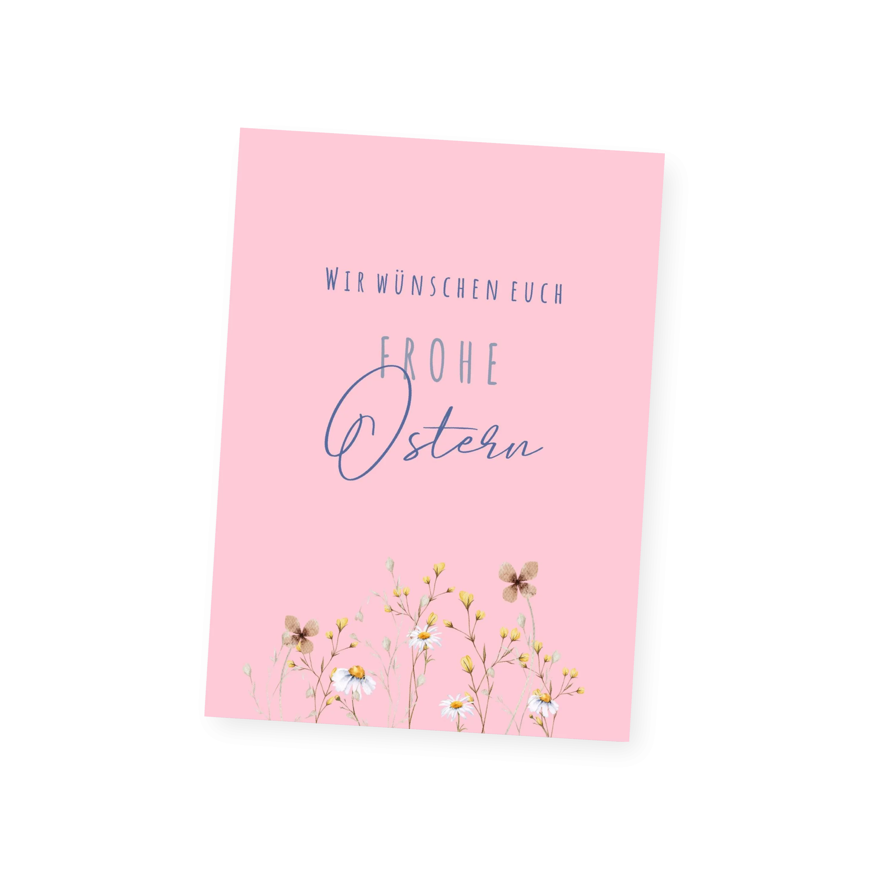 Die pinke Karte rückt den dunkelblauen „Frohe Ostern“-Schriftzug in den Mittelpunkt, ergänzt von ein paar zarten Blümchen am unteren Rand. Die helle, frühlingshafte Gestaltung wirkt leicht und freundlich. Innen gibt es Platz für ein eigenes Foto.
