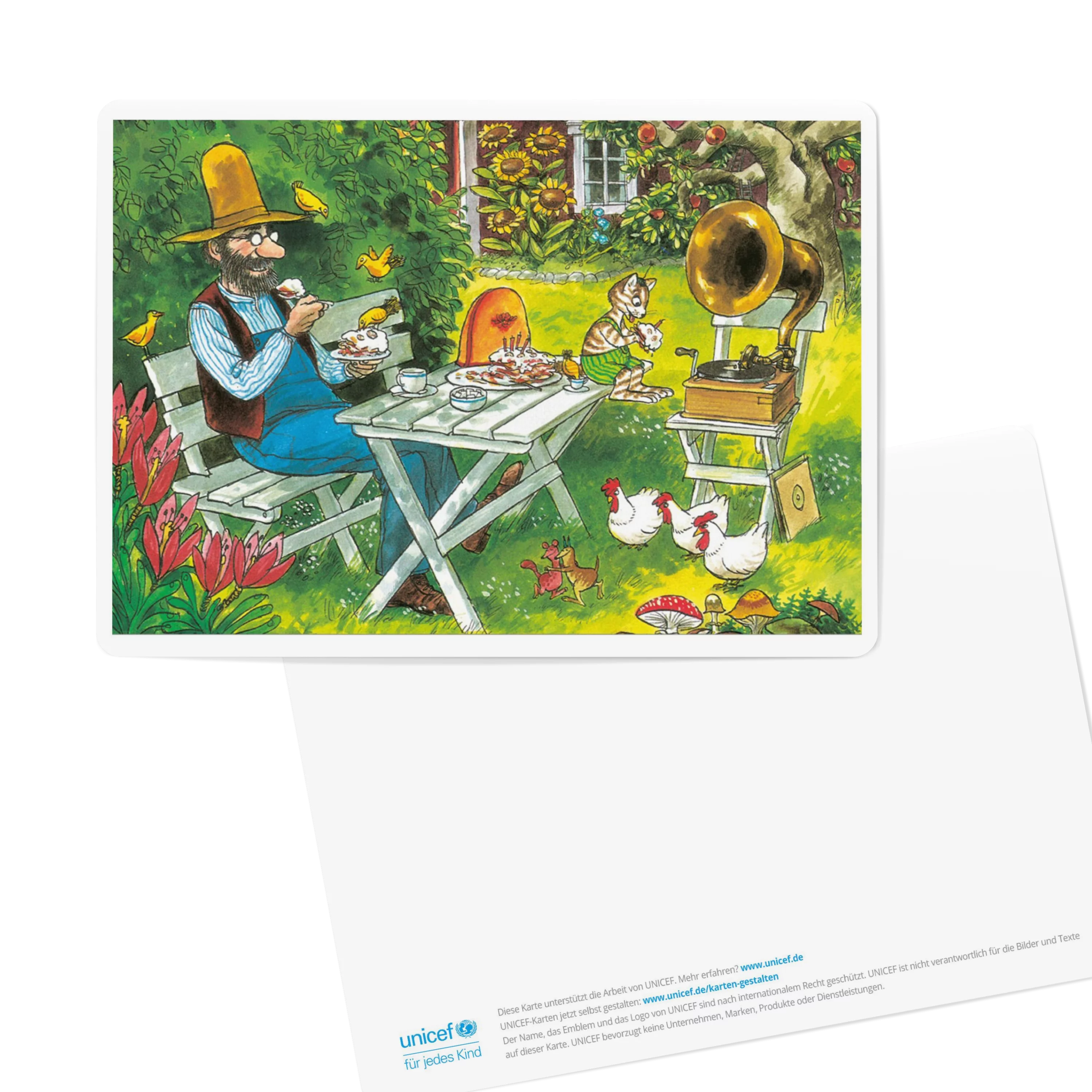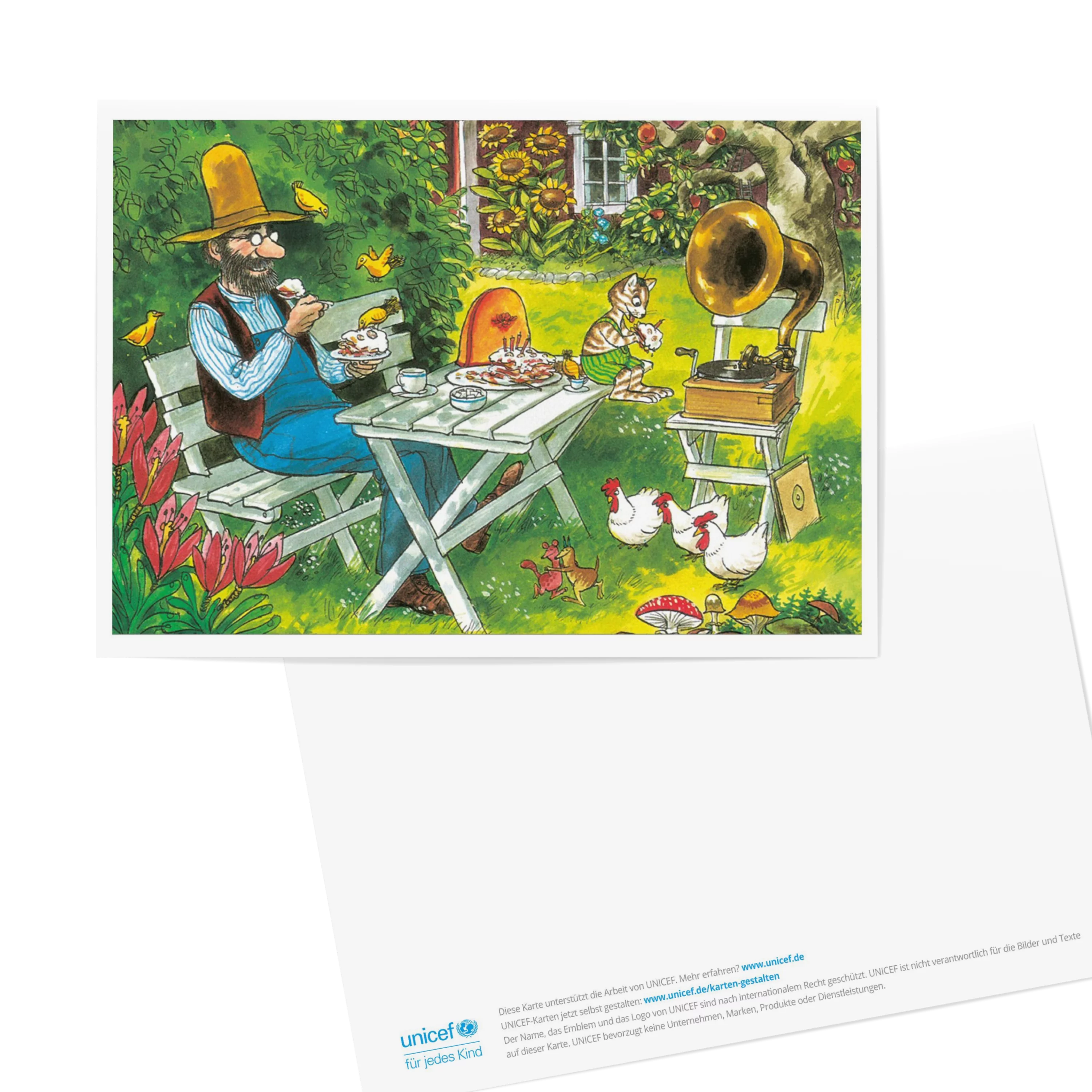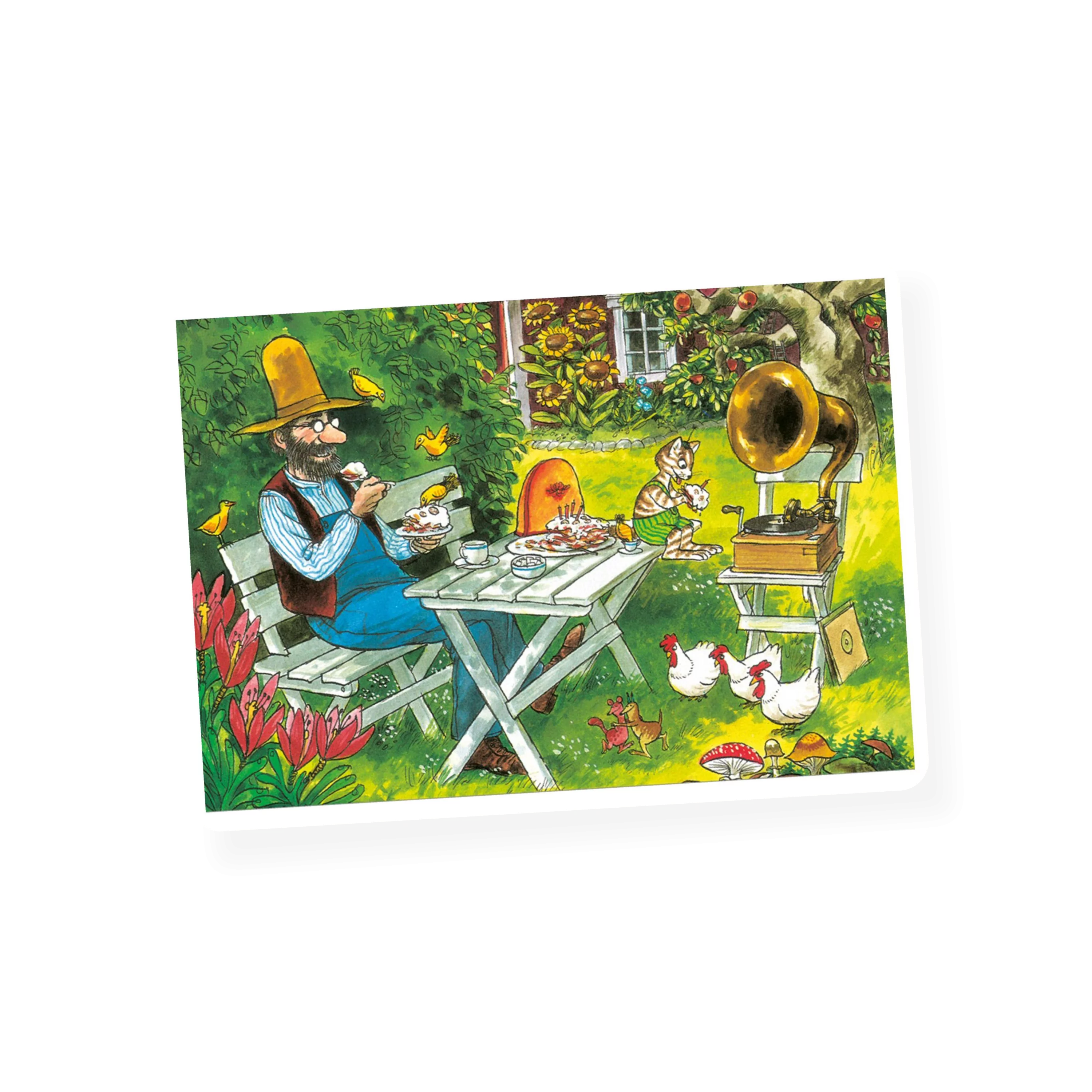 Pfannkuchentorten mit Petterson und Findus im Garten zum Geburtstag essen, während die Hühner gackern? Herzlichen Glückwunsch von einer quirligen Katze und einem alten Mann mit großem Hut!