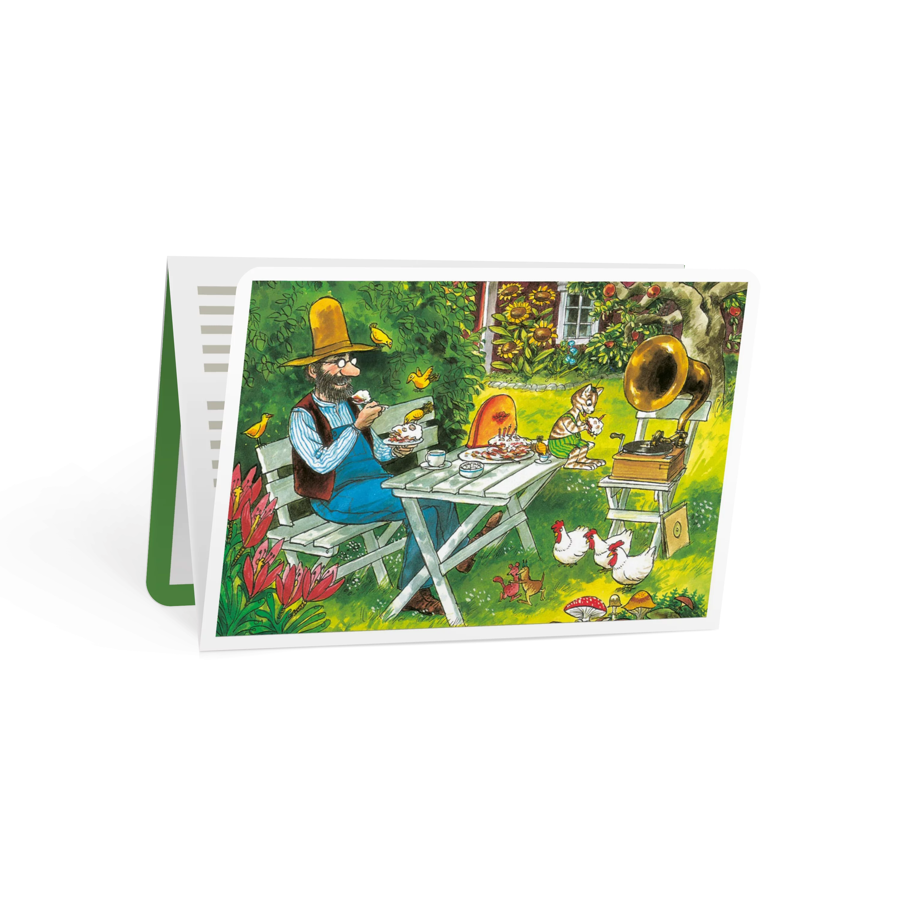 Pfannkuchentorten mit Petterson und Findus im Garten zum Geburtstag essen, während die Hühner gackern? Herzlichen Glückwunsch von einer quirligen Katze und einem alten Mann mit großem Hut!