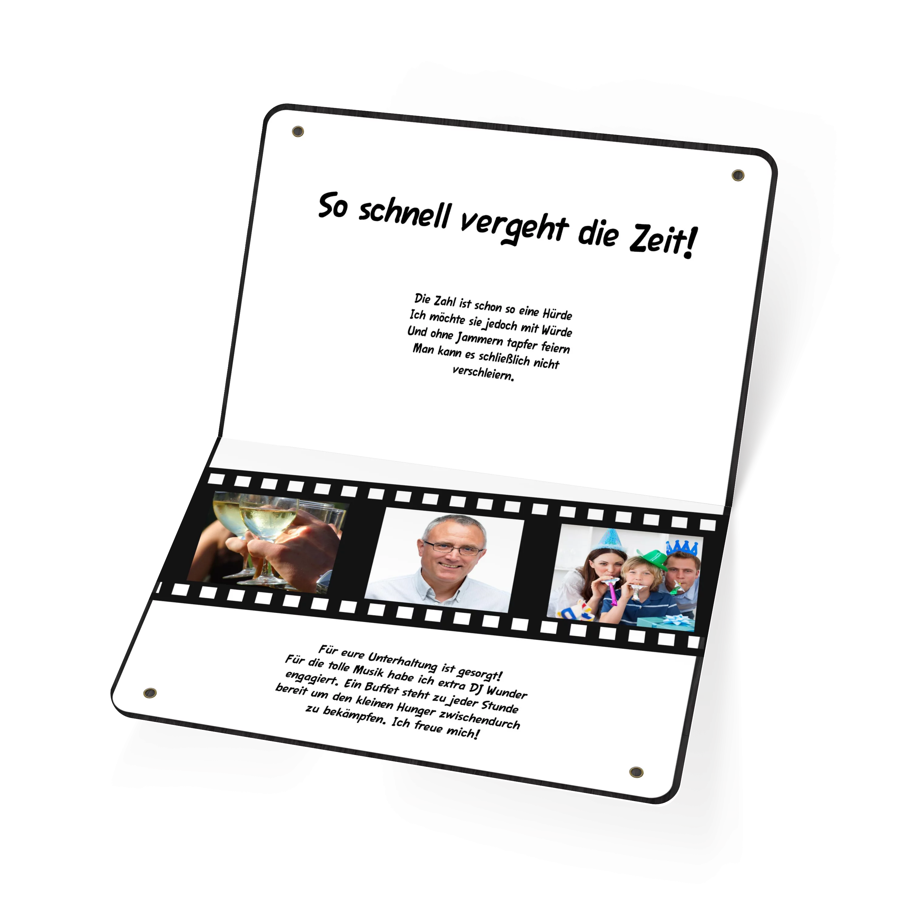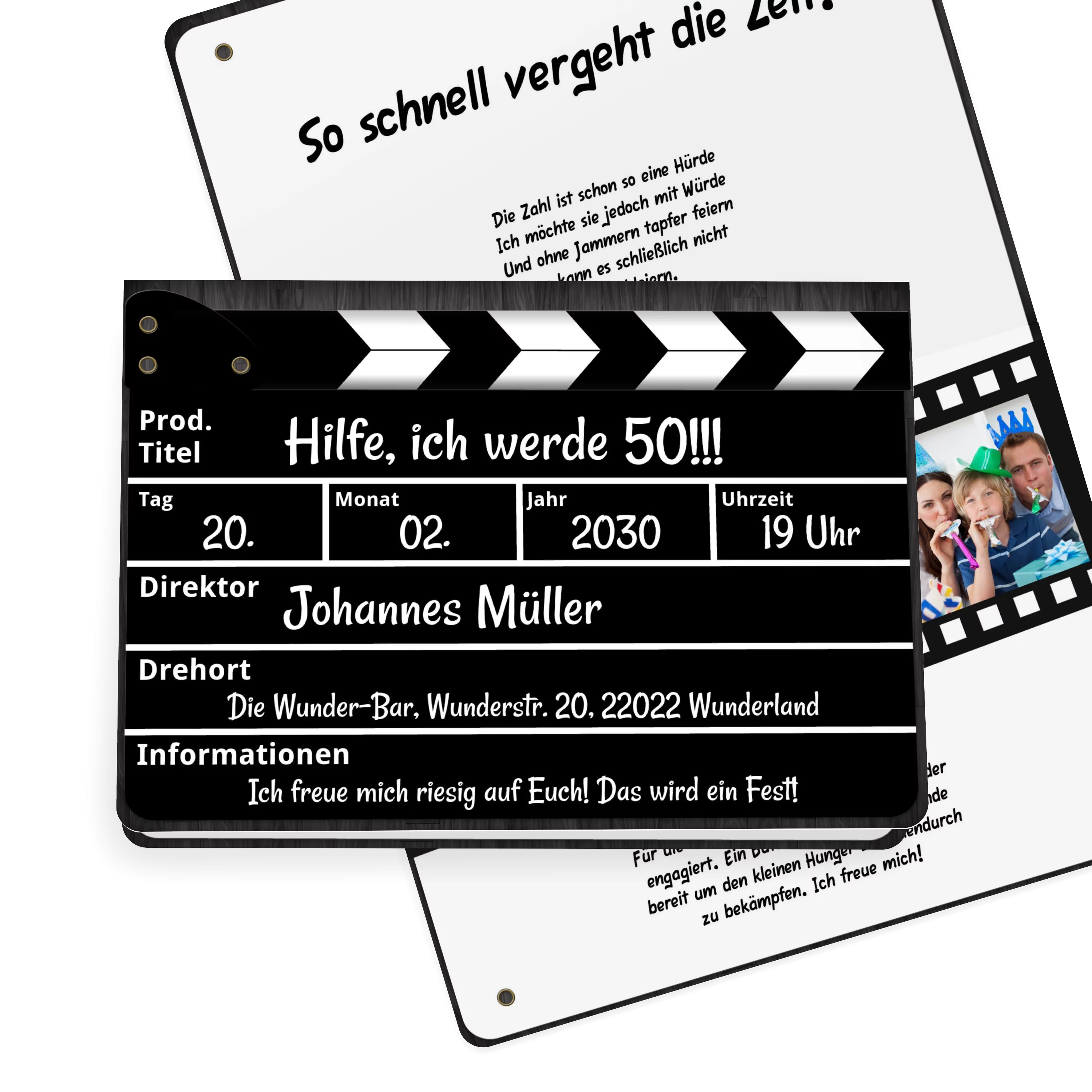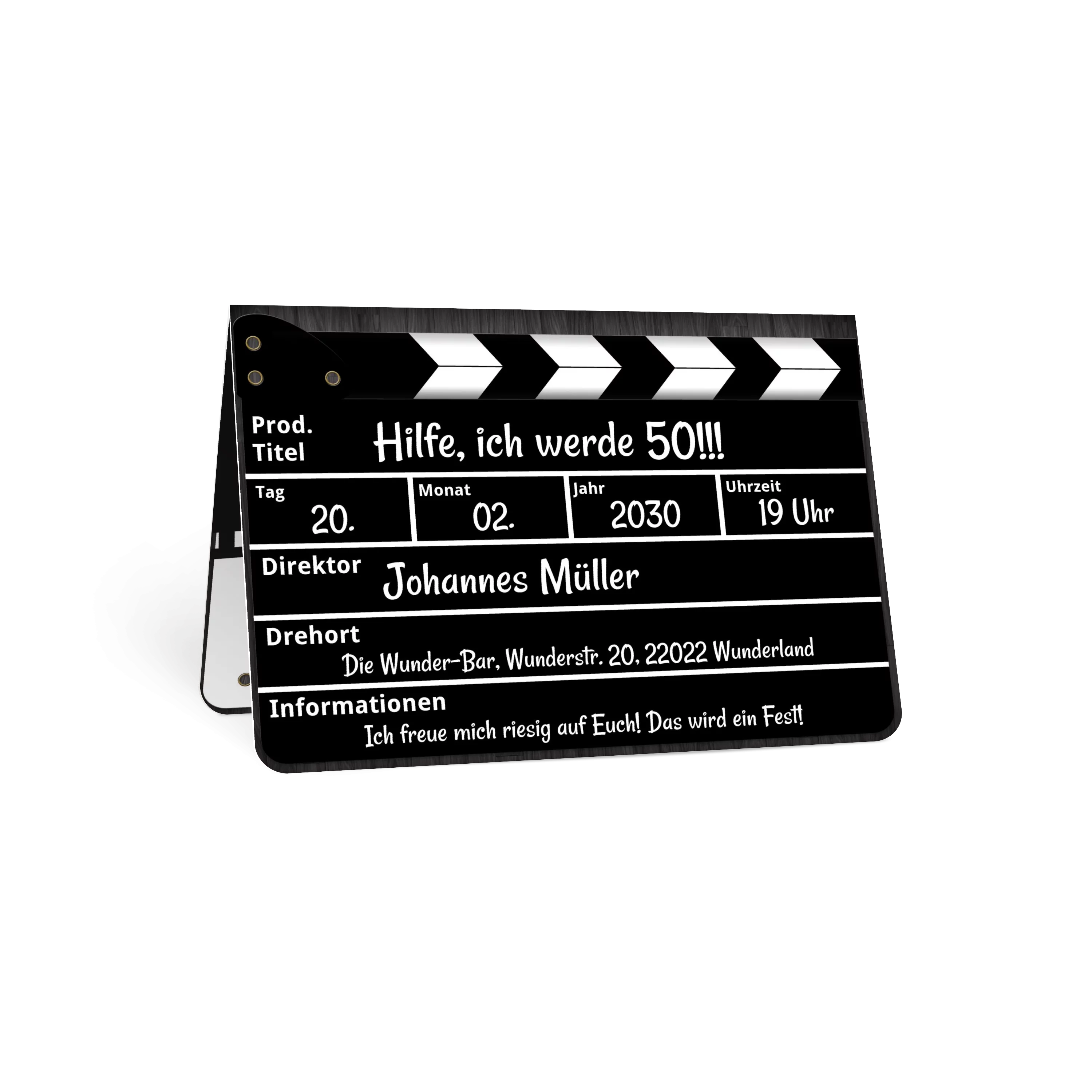 Die perfekte Geburtstagseinladung für Filmfans! Einer klassischen Regieklappe nachempfunden lassen sich hier die Filminfos durch eigene Partydaten ersetzen. Einfach Textfelder mit Infos nach Wahl personalisieren - fertig ist die lässige Party-Einladung! Auch toll geeignet für Mottoparties. Und Action!
