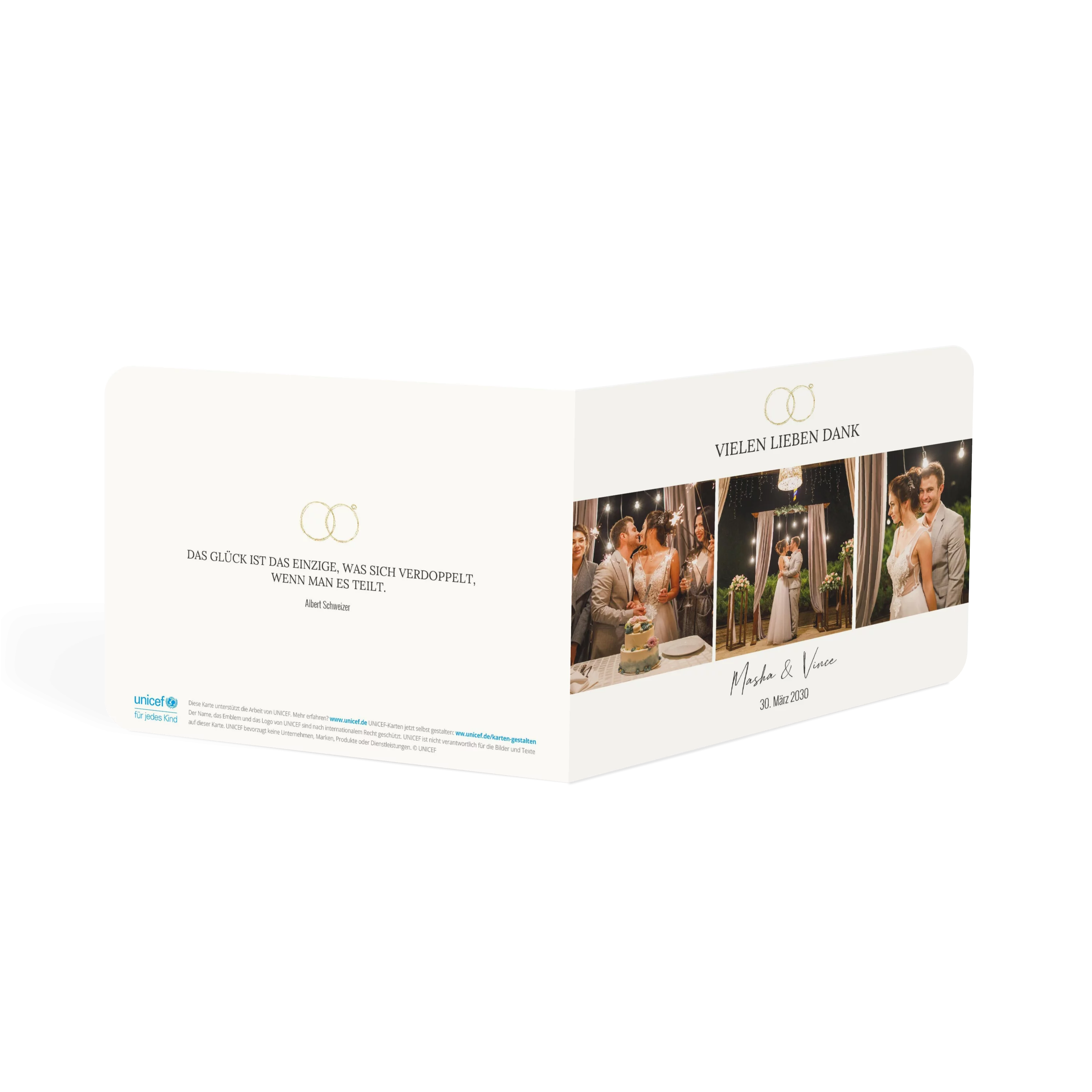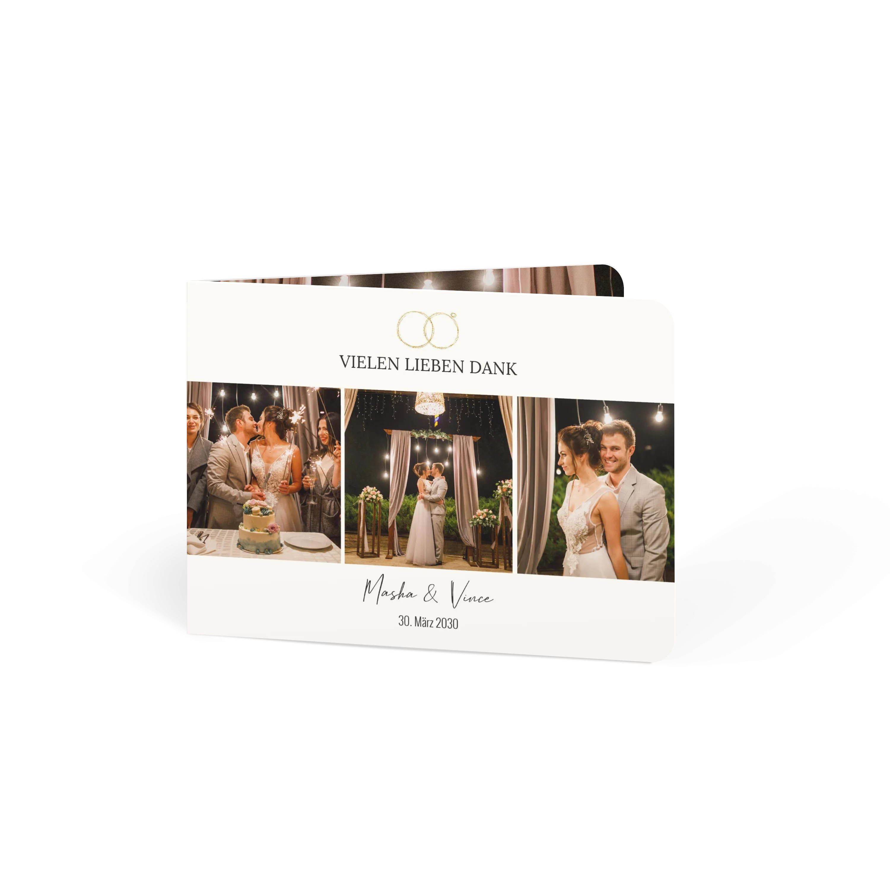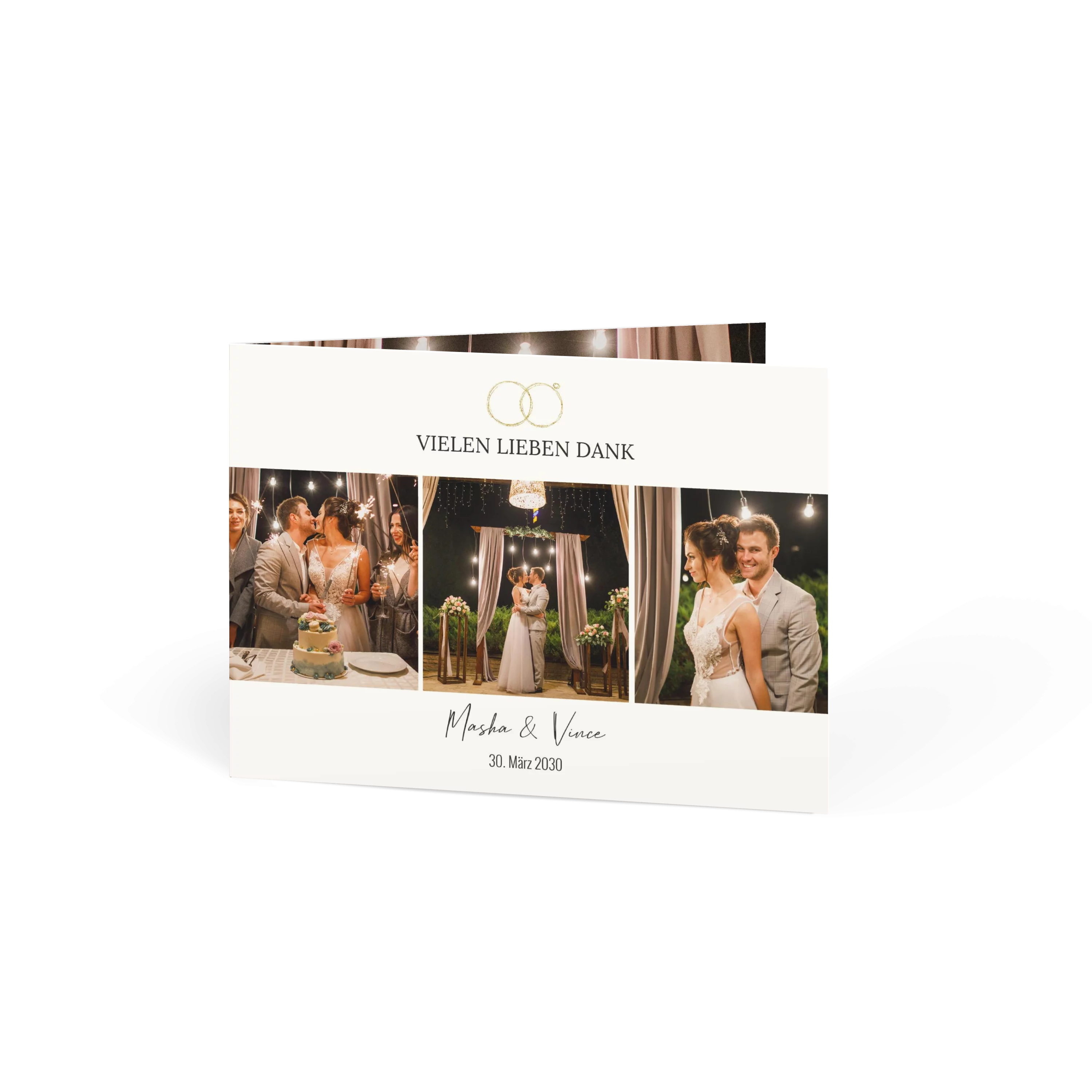Ein zartes Band aus Licht, Liebe und Erinnerungen: Diese elegante Karte mit goldgeprägten Ringen bietet Raum für Ihre schönsten Hochzeitsmomente. Die ruhige Gestaltung mit drei Bildflächen schafft einen stilvollen Rahmen für Ihre Dankbarkeit – persönlich, festlich und voller Wärme.