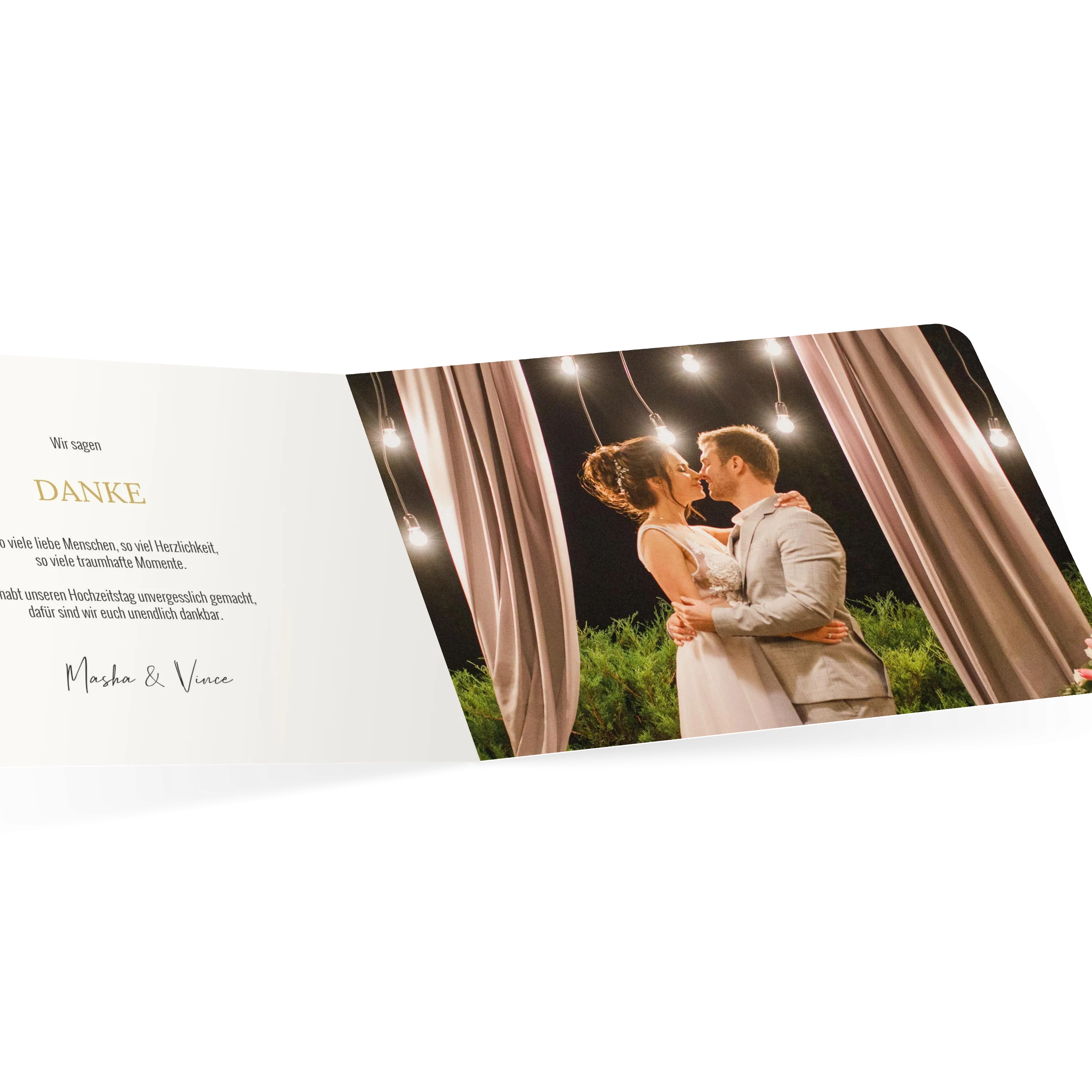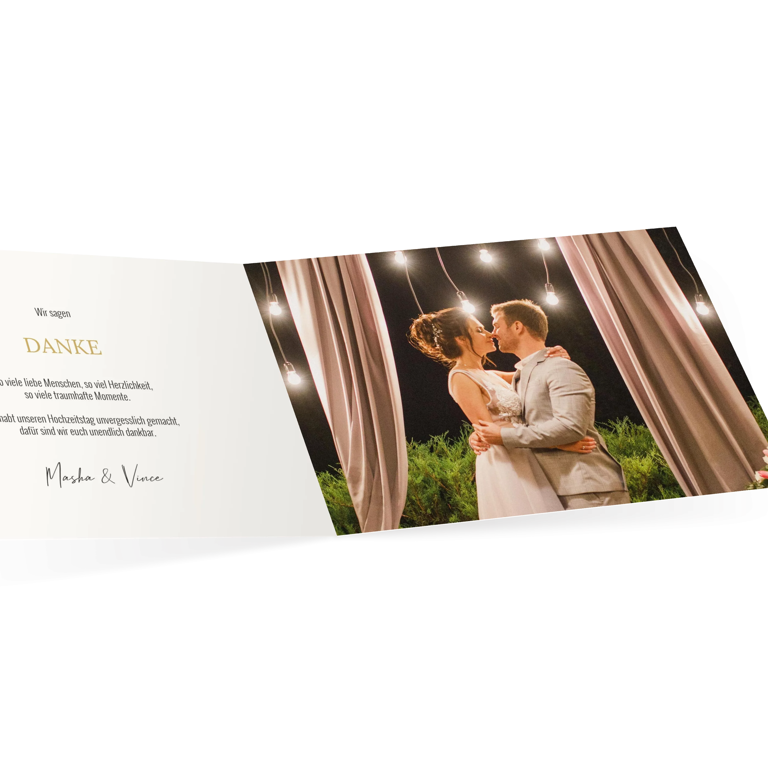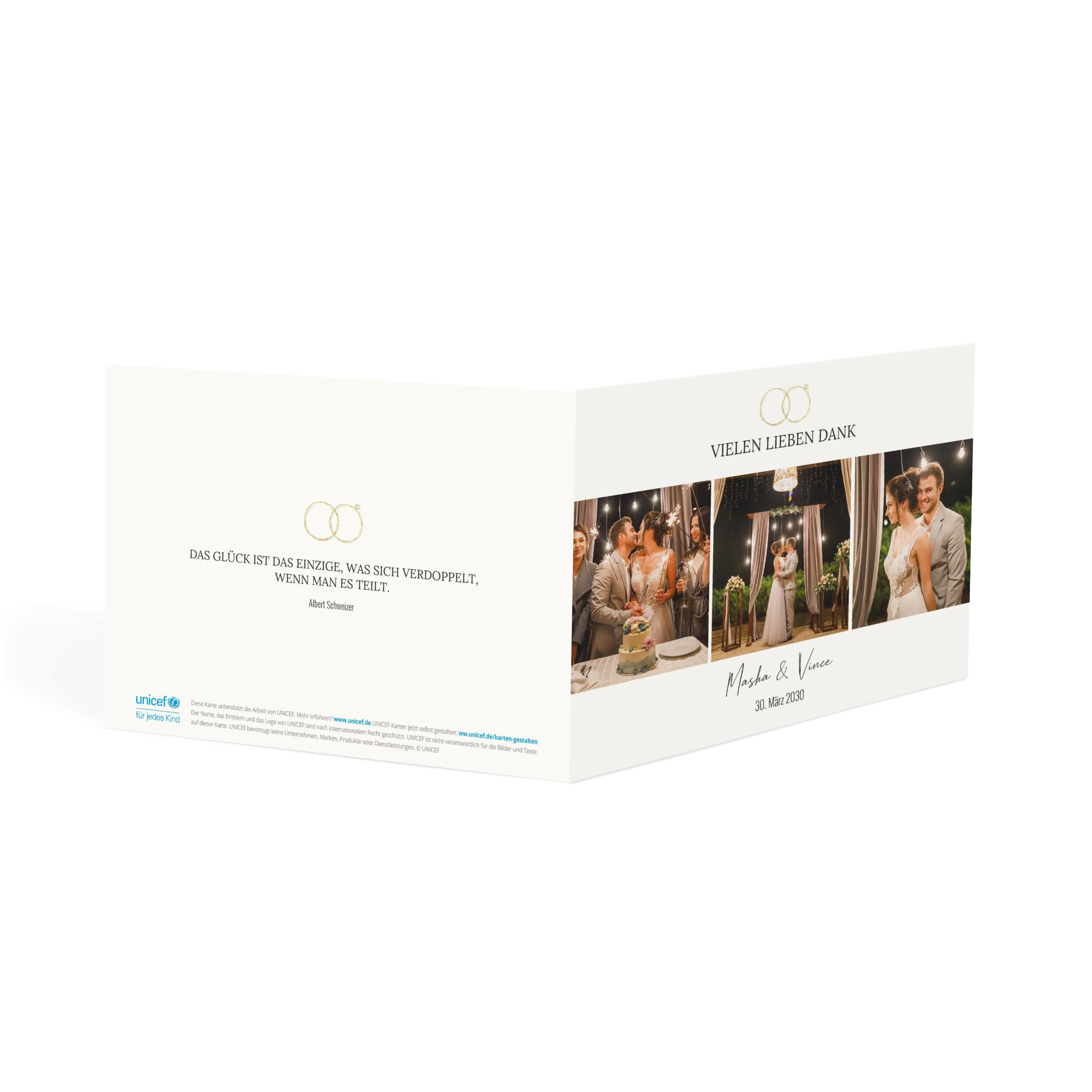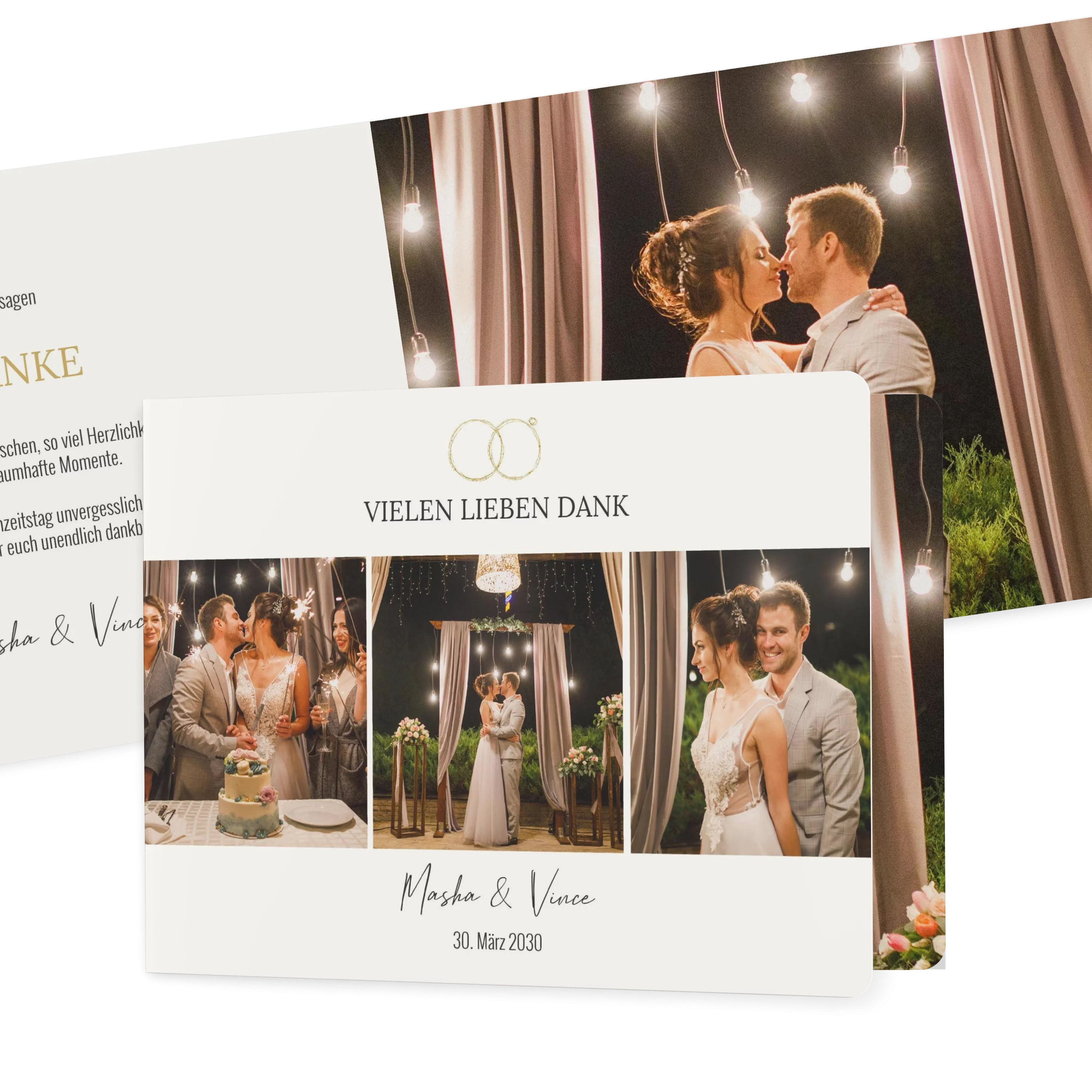 Ein zartes Band aus Licht, Liebe und Erinnerungen: Diese elegante Karte mit goldgeprägten Ringen bietet Raum für Ihre schönsten Hochzeitsmomente. Die ruhige Gestaltung mit drei Bildflächen schafft einen stilvollen Rahmen für Ihre Dankbarkeit – persönlich, festlich und voller Wärme.