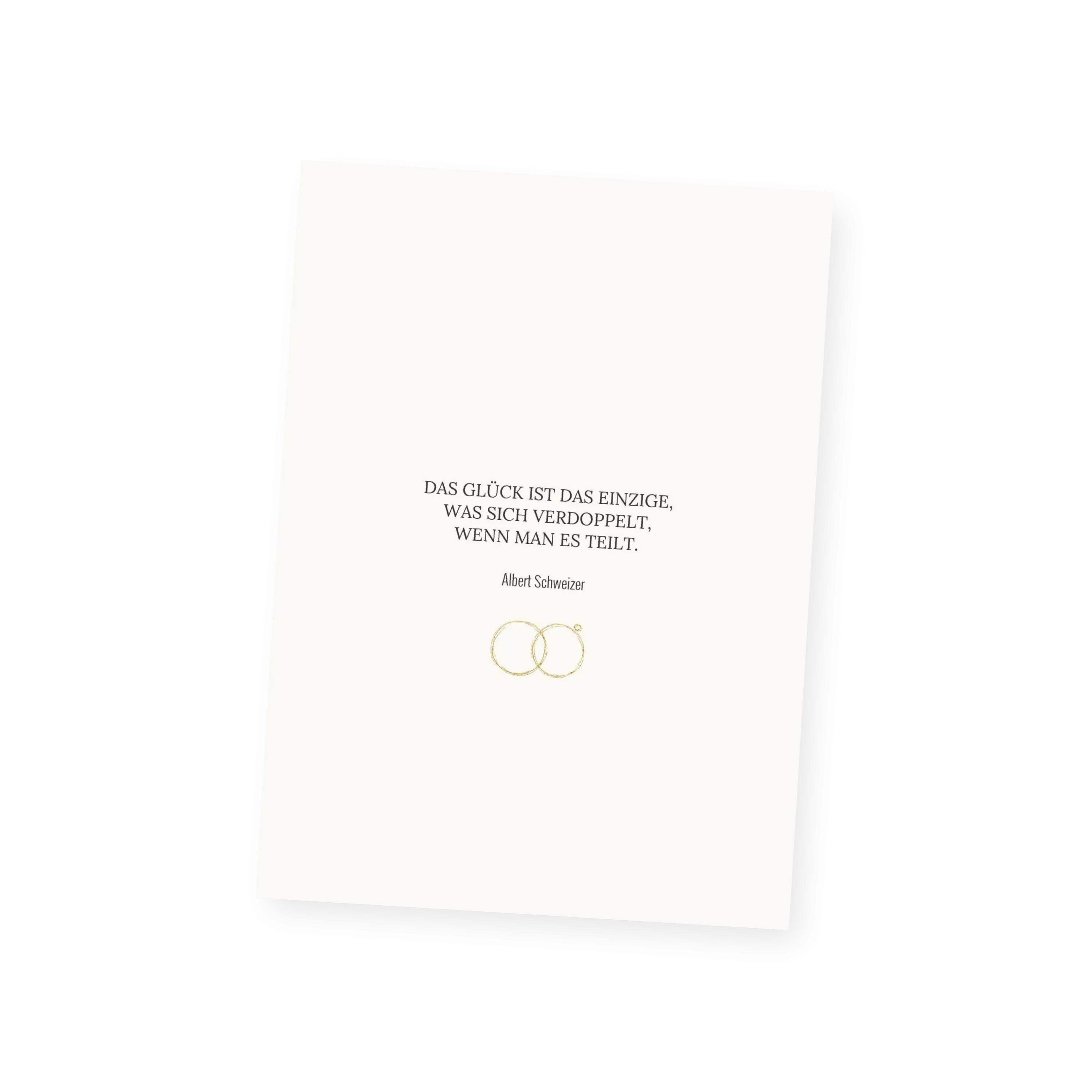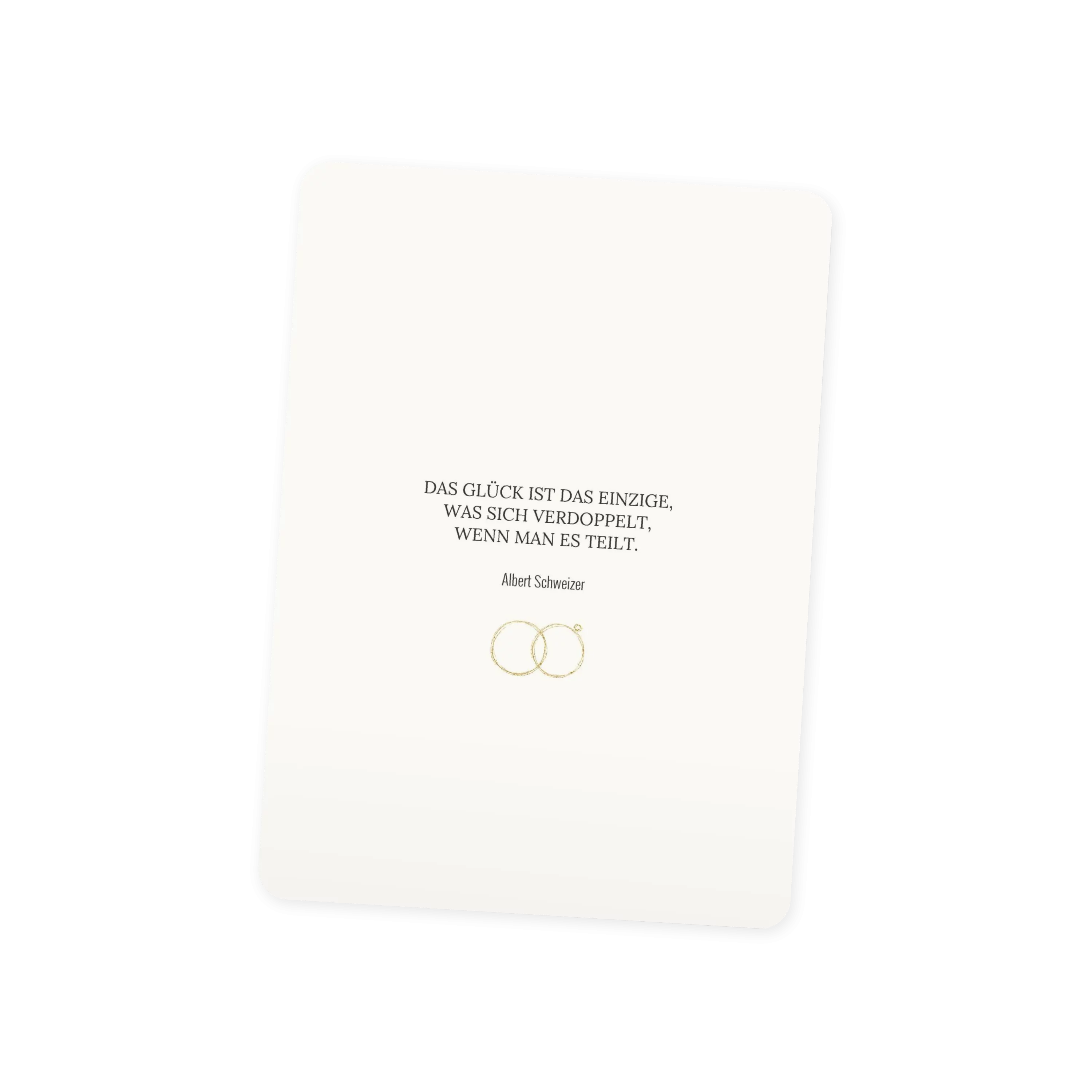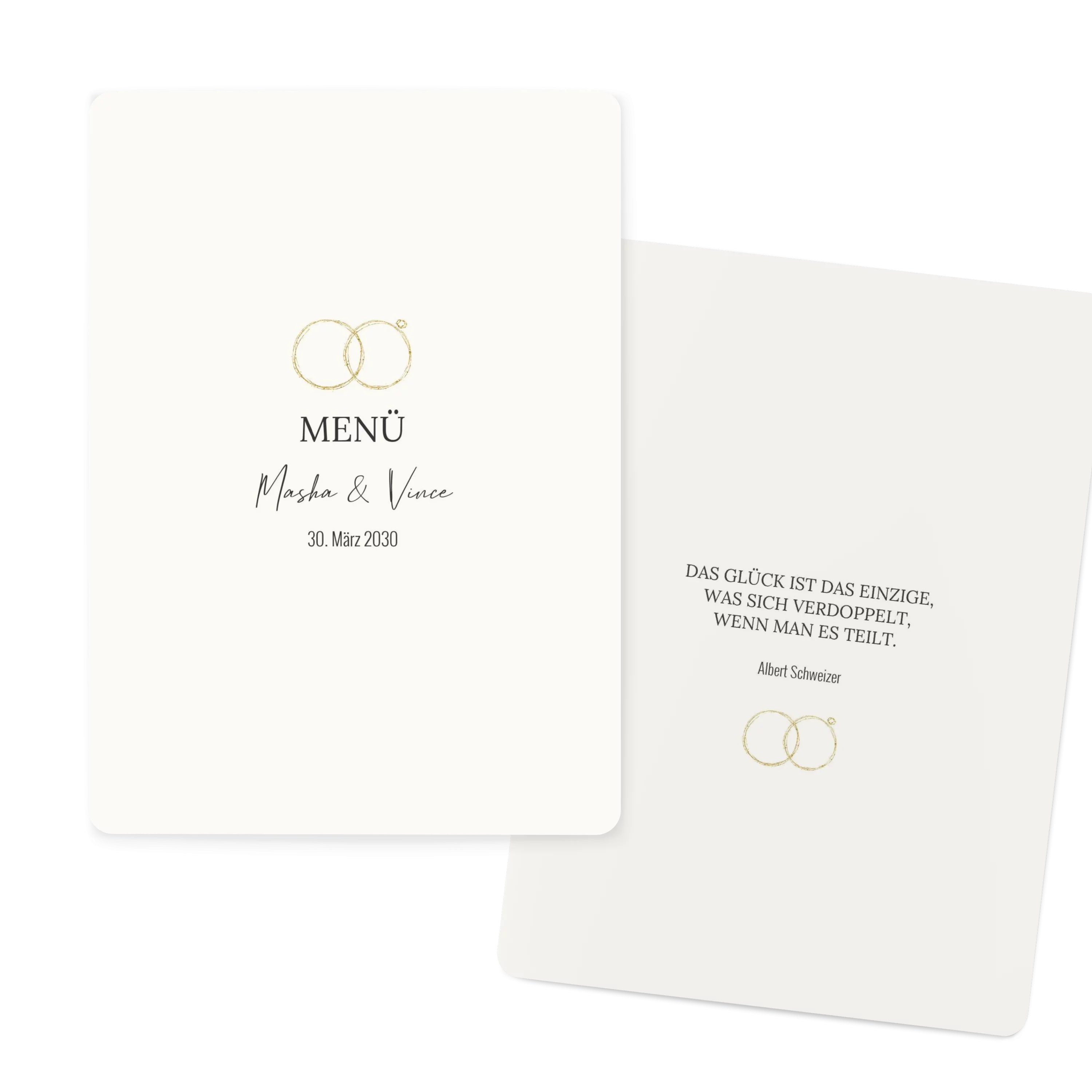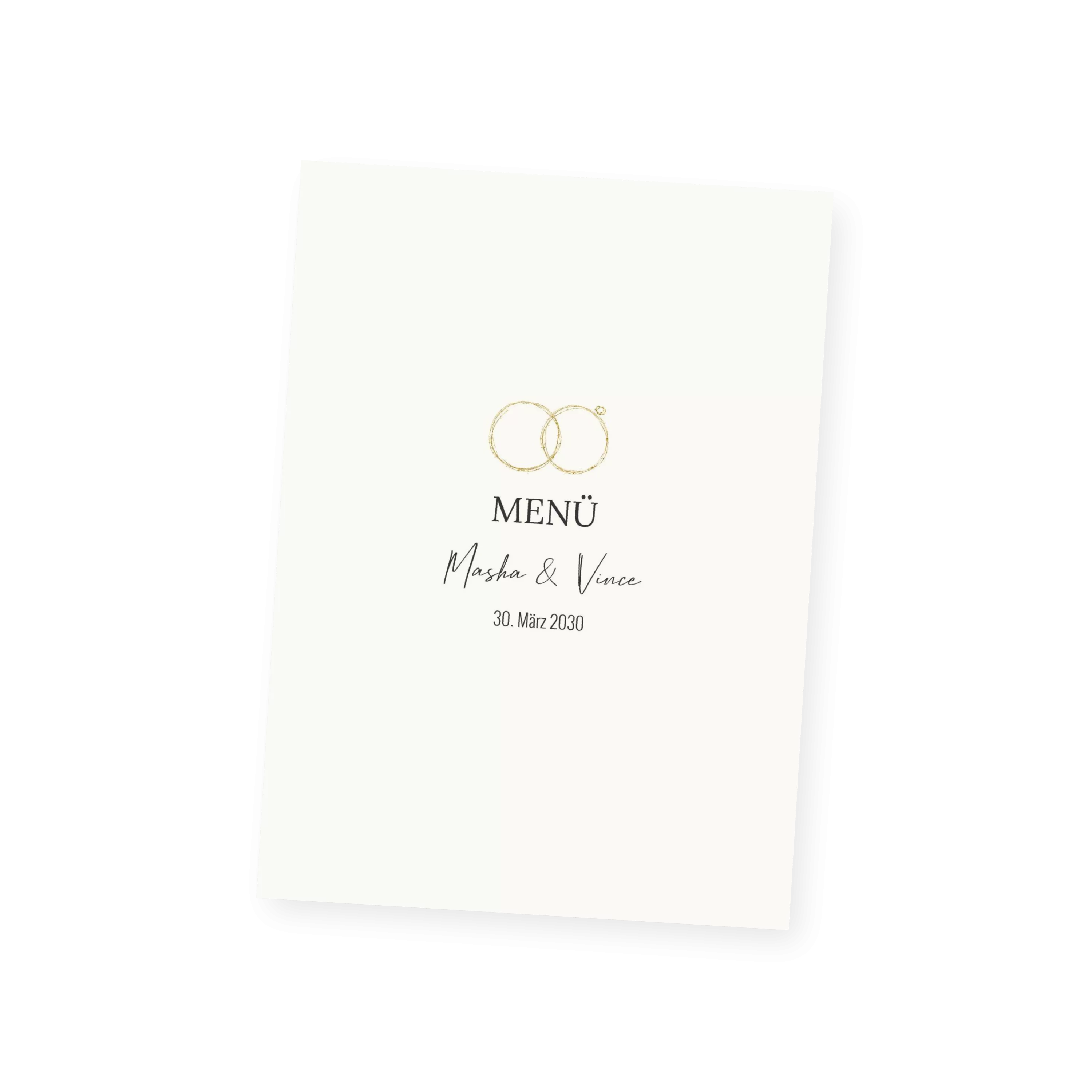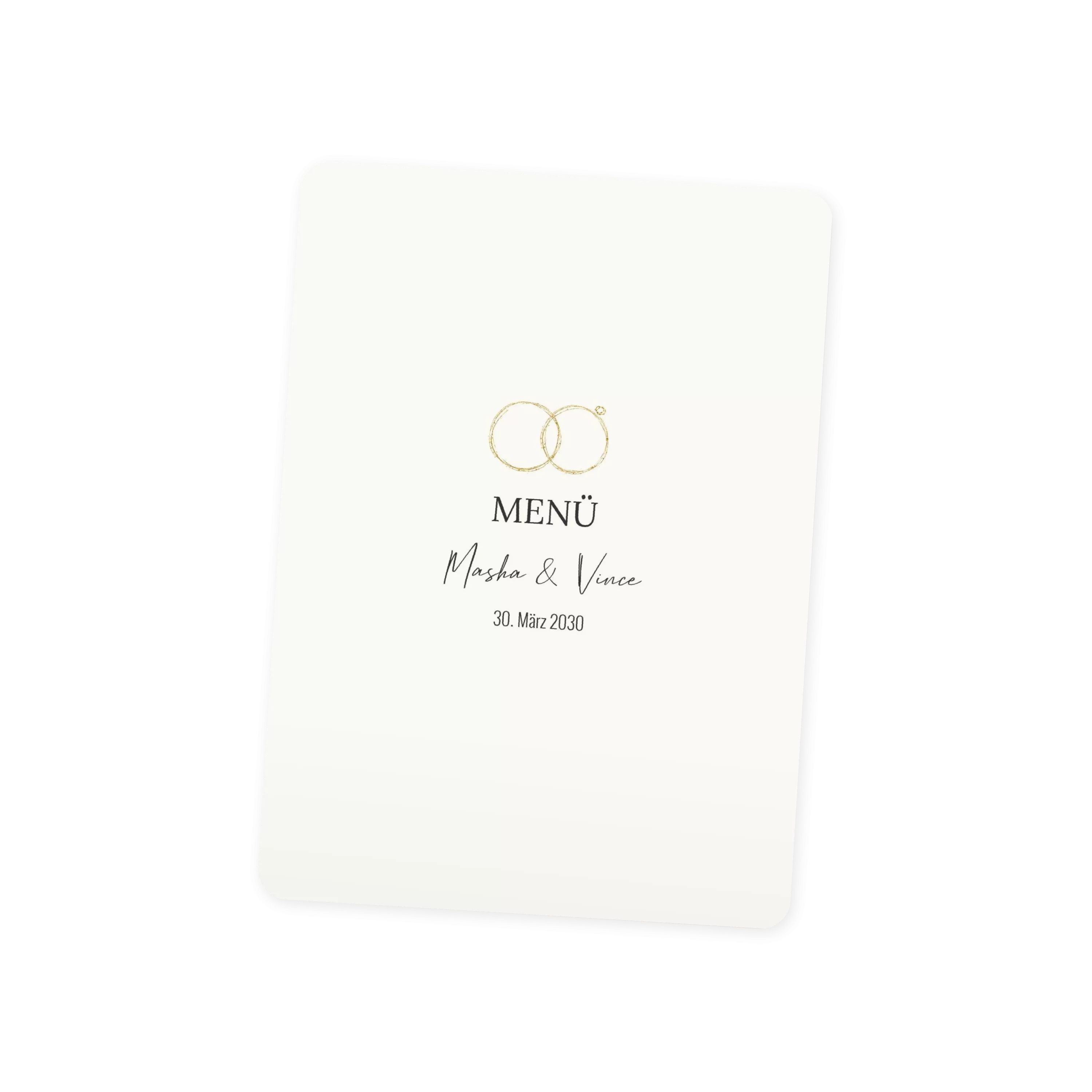 Schlichte Eleganz trifft auf feine Details: Diese Menükarte mit goldenen Ringen fügt sich harmonisch ins Tischbild ein und rundet die festliche Papeterie stilvoll ab.