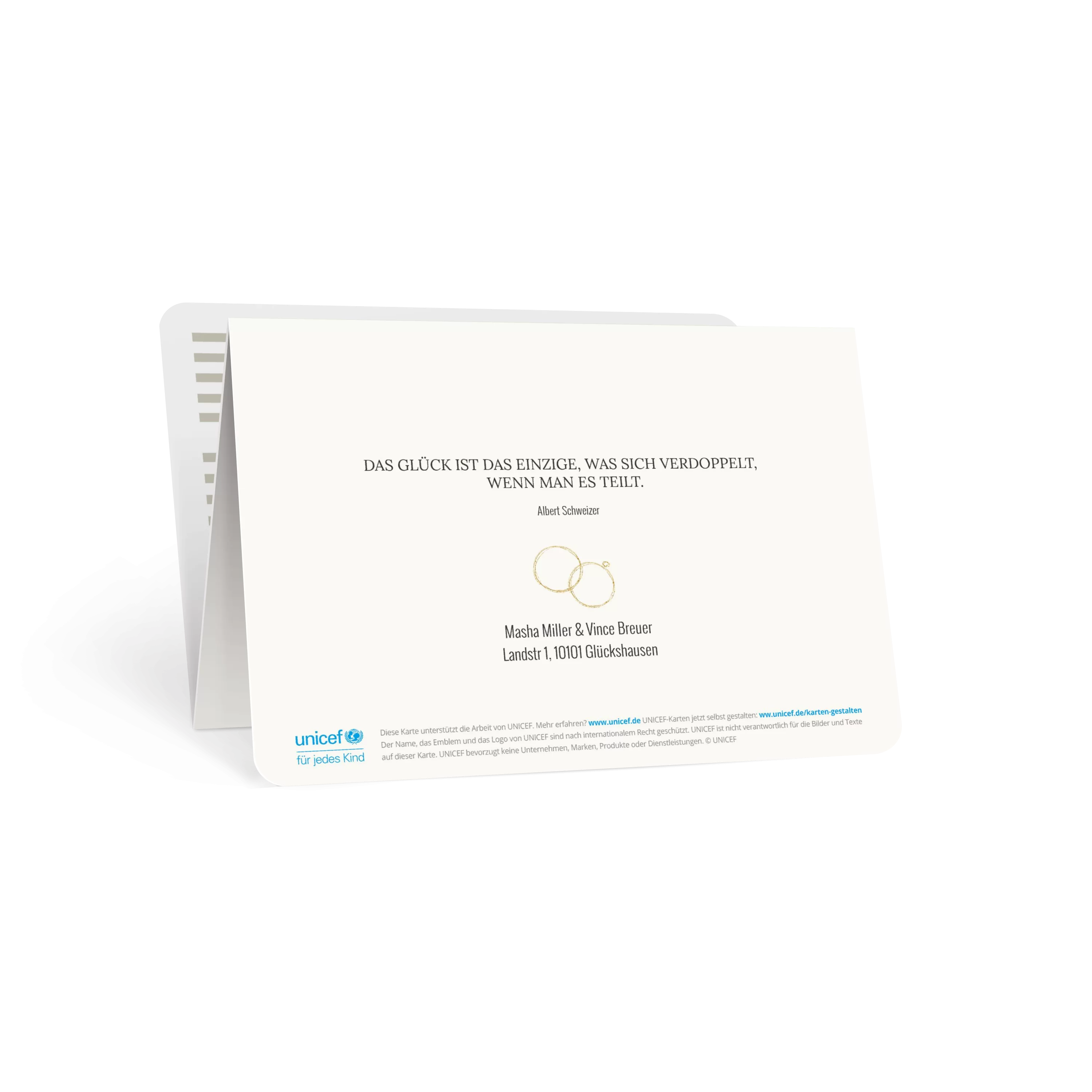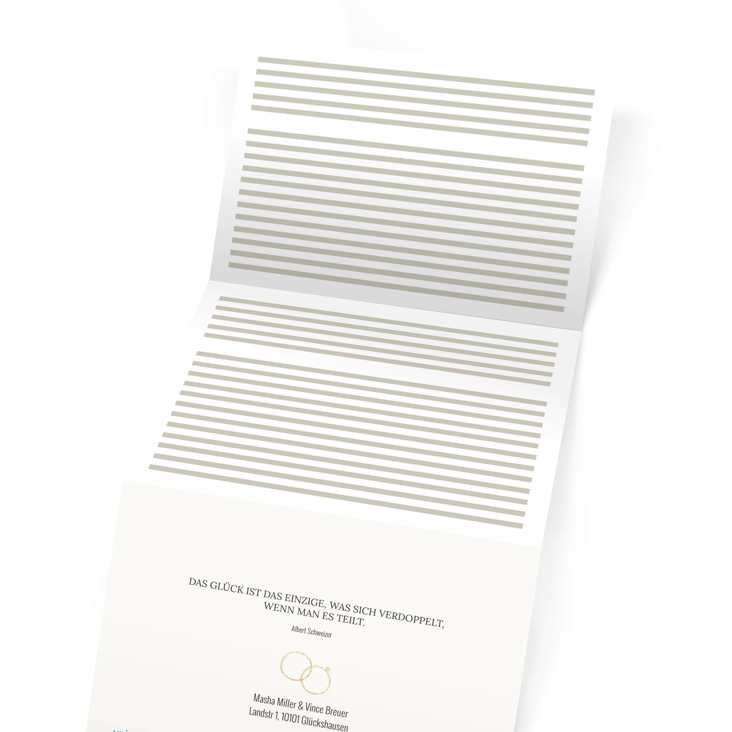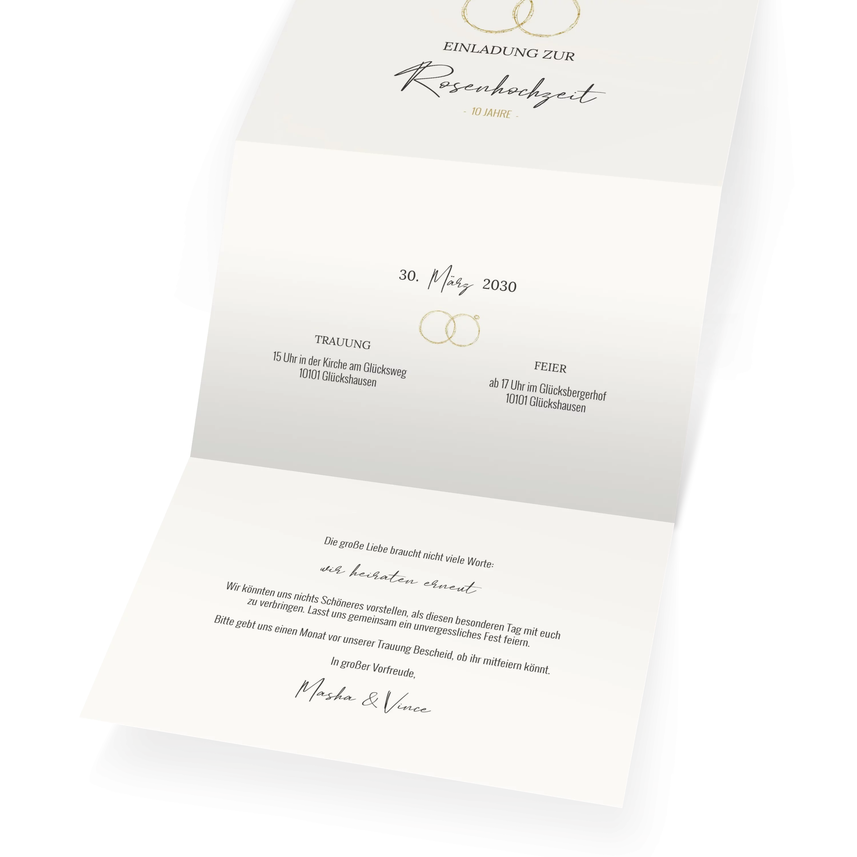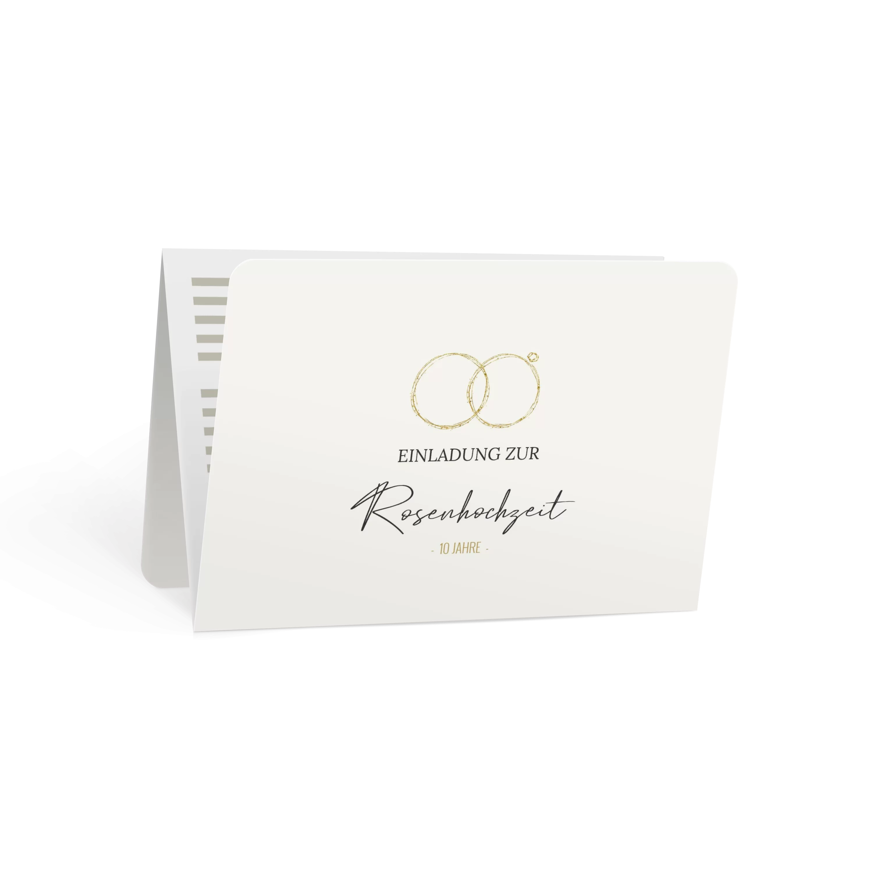 Diese elegante Einladung zur Rosenhochzeit setzt auf pure Klarheit: Zwei zart schimmernde, goldene Ringe auf cremeweißem Grund symbolisieren 10 gemeinsame Jahre. Die fein geschwungene Typografie bringt stilvoll zum Ausdruck, worum es geht – Liebe, Beständigkeit und ein Leben voller gemeinsamer Erinnerungen.