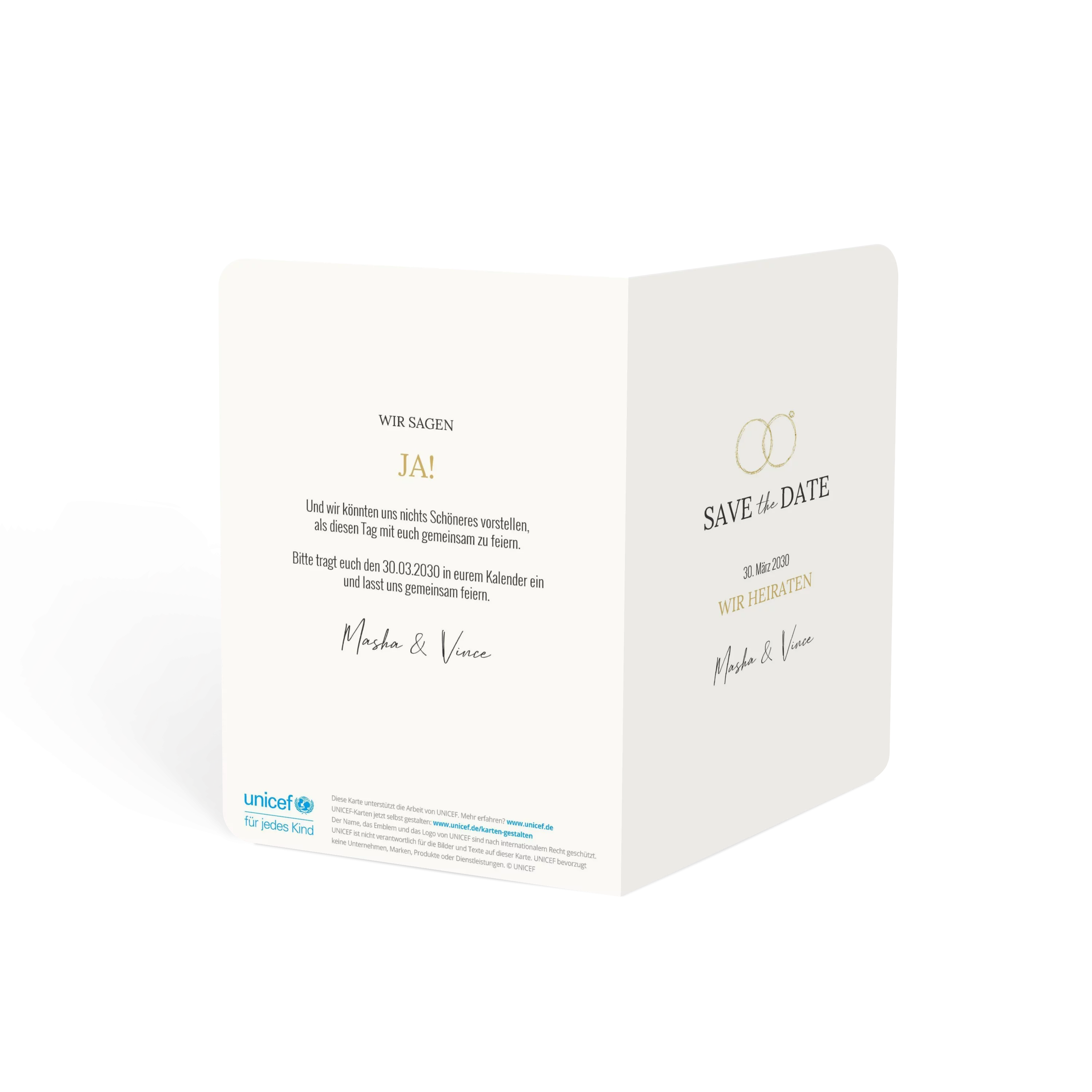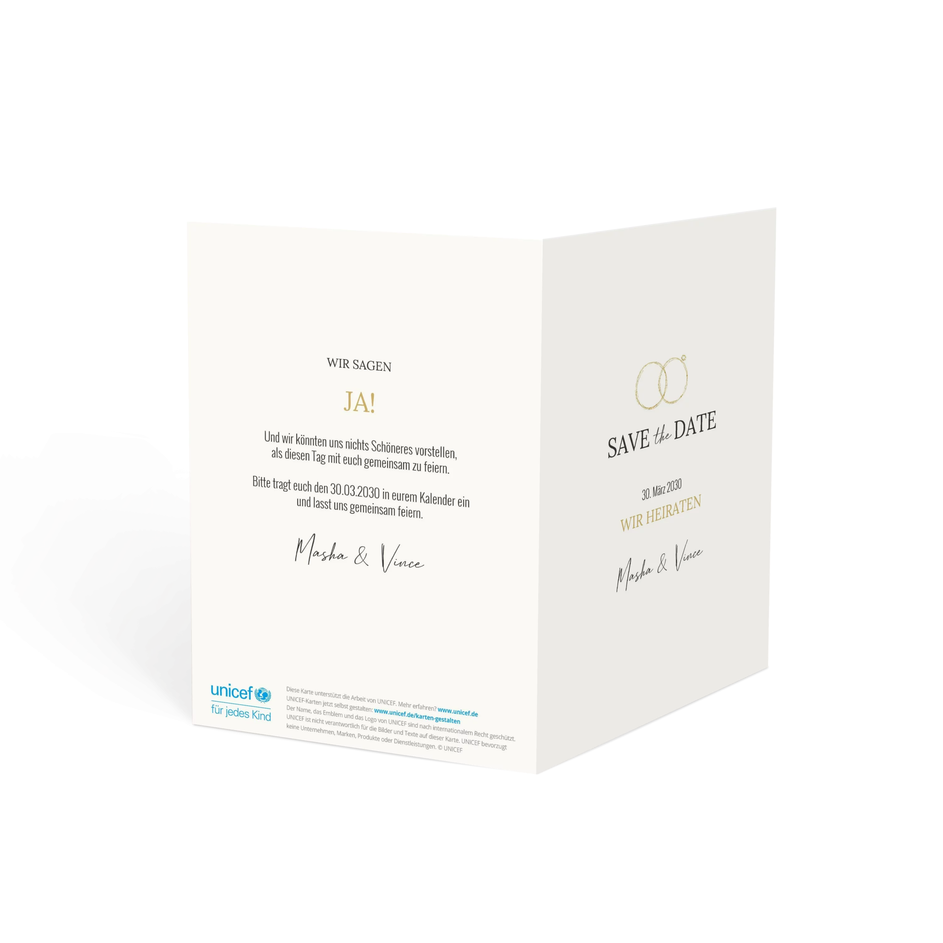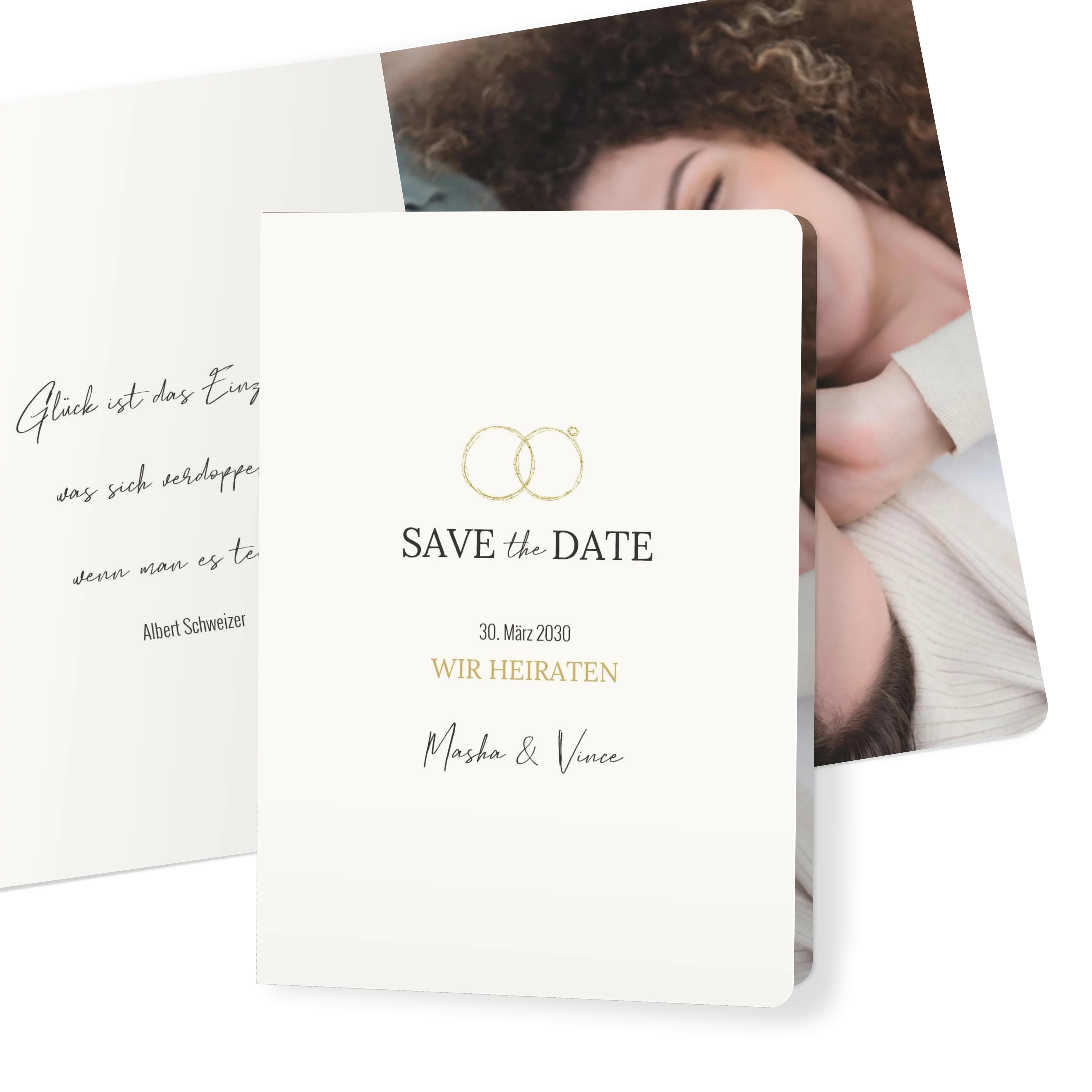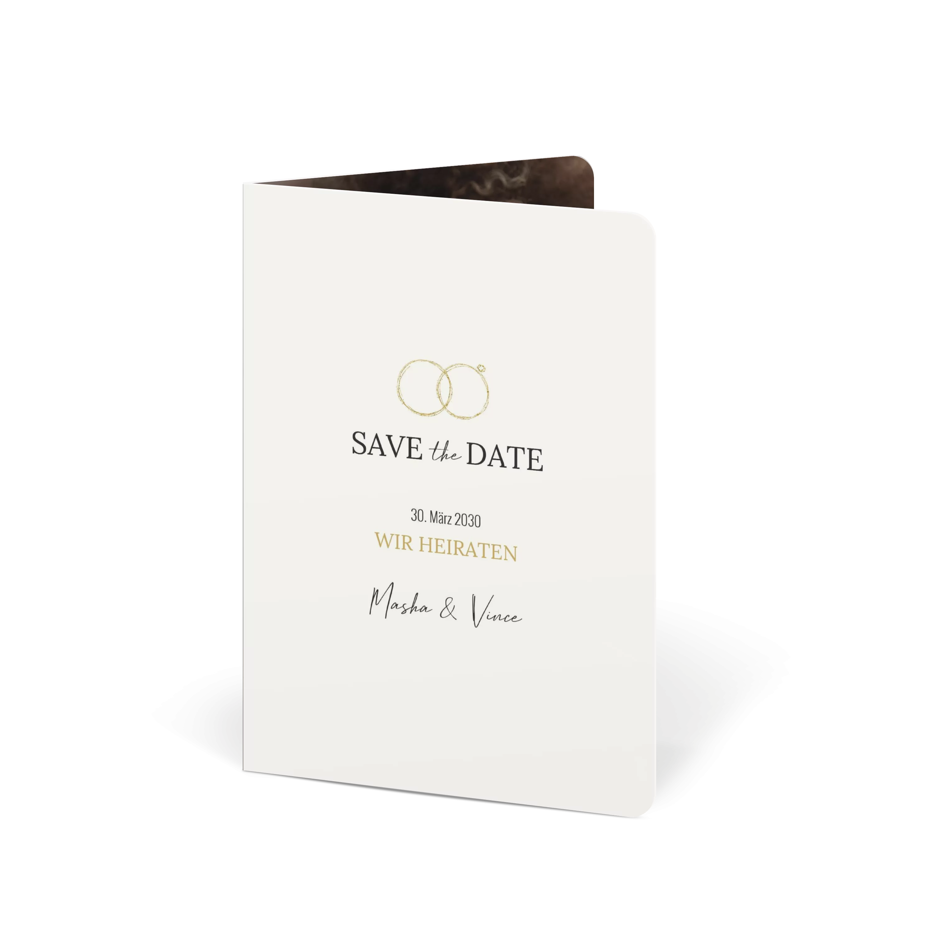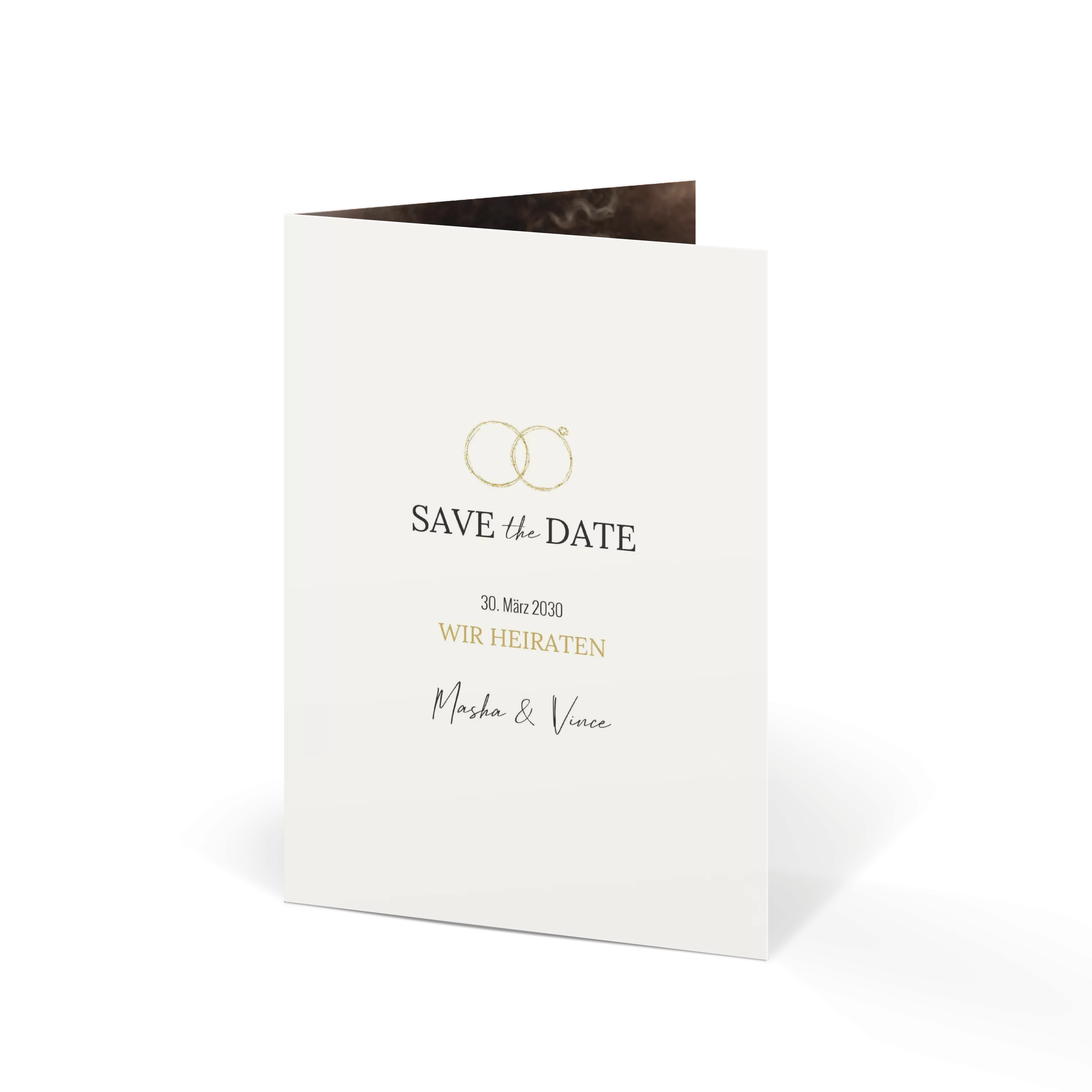 Die zarten Ringe in Goldoptik setzen ein elegantes Statement für euren großen Tag. Schlicht, stilvoll und voller Liebe – eine Save-the-Date-Karte mit klarem Design und feinem Detail.