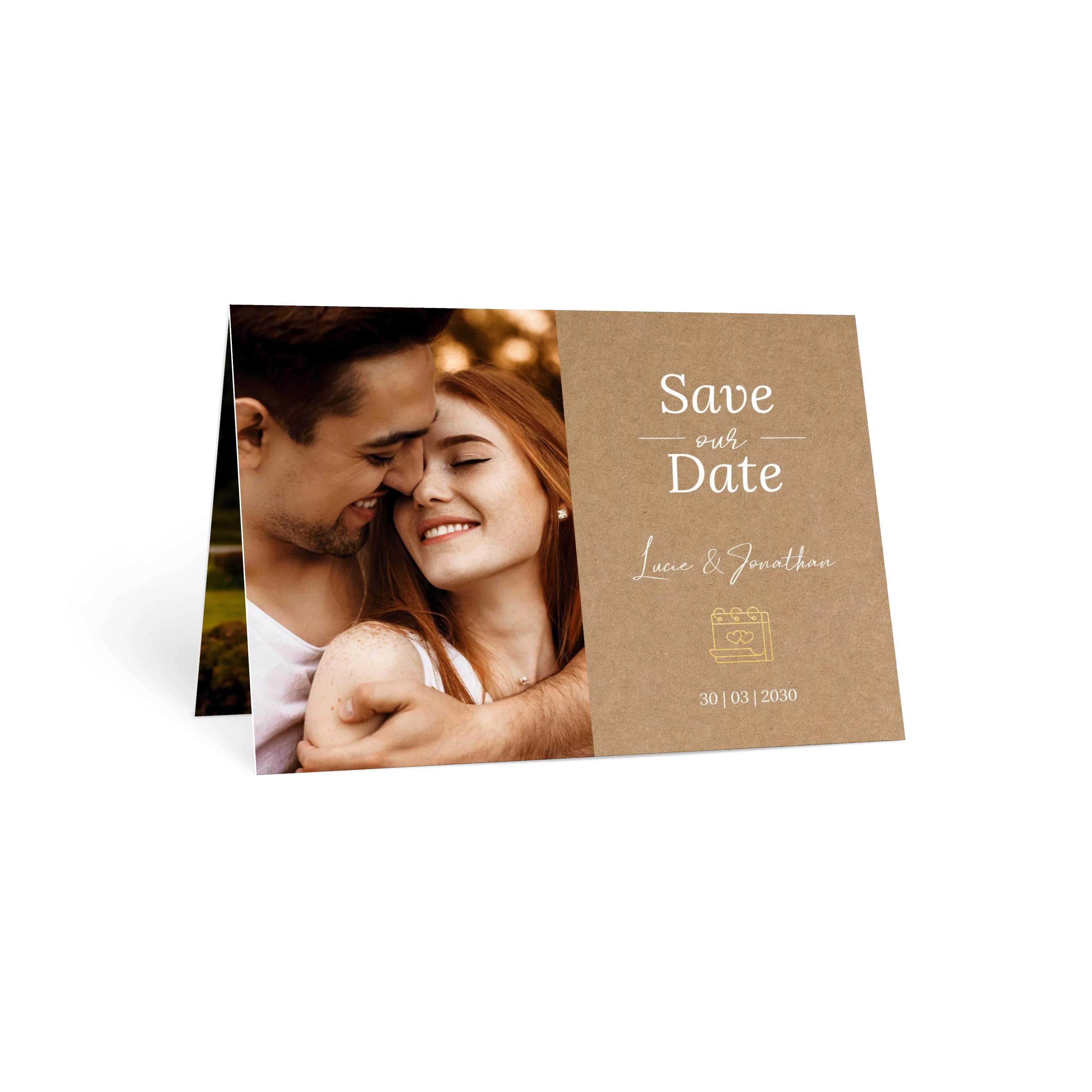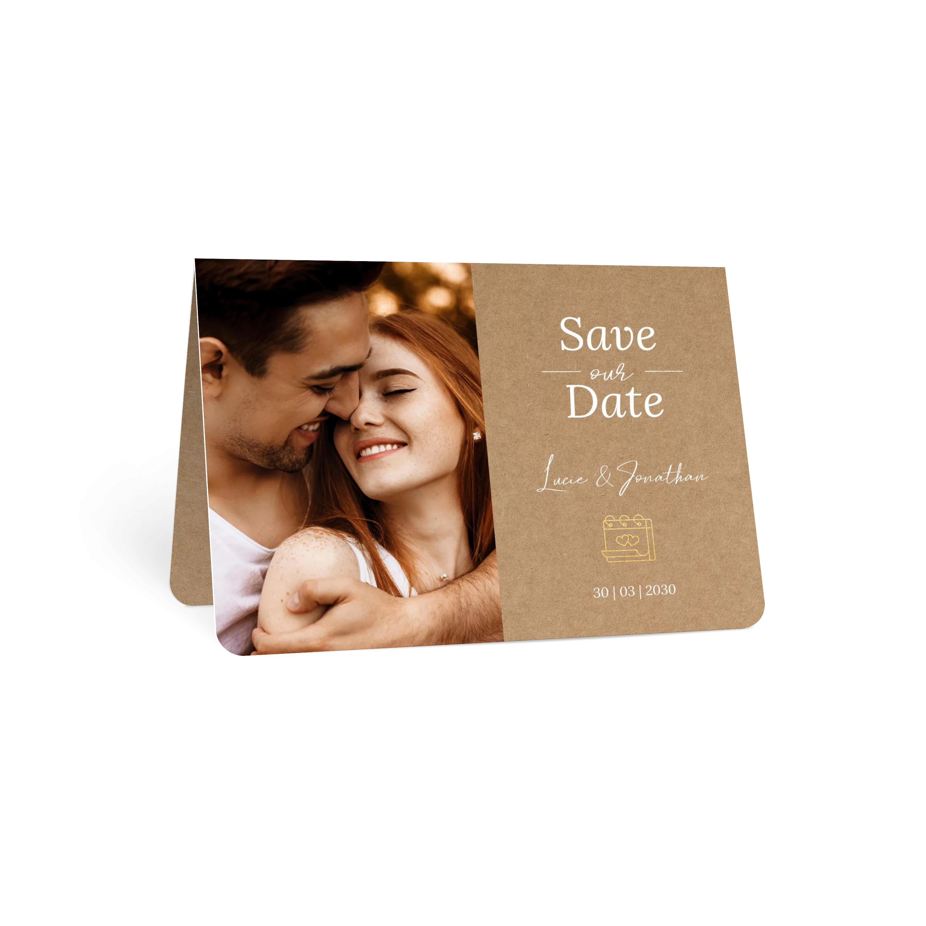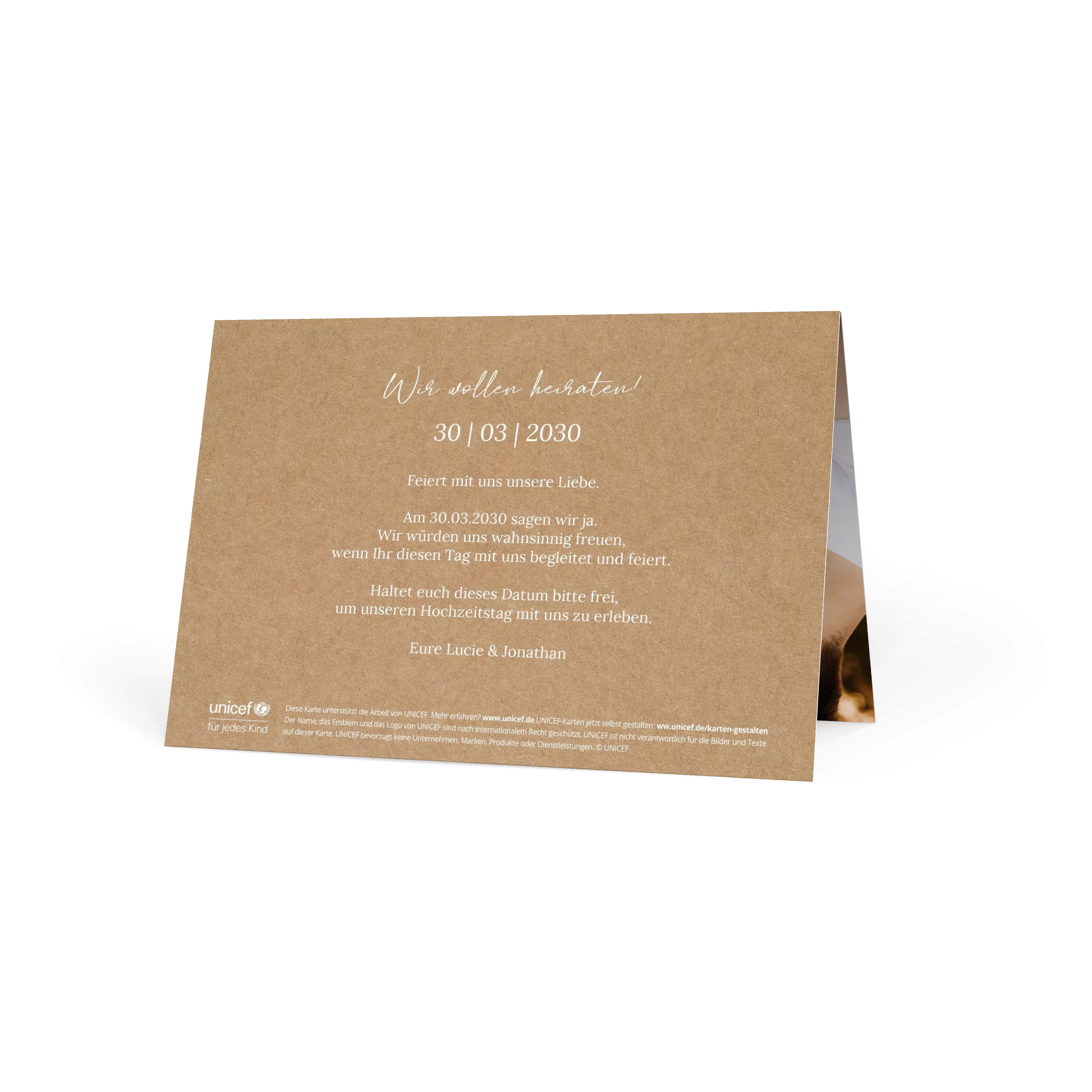 Warm, modern und ganz persönlich: Die Kombination aus Kraftpapier-Look, feiner Typografie und eigenem Foto macht diese Save-the-Date-Karte zu etwas ganz Besonderem.