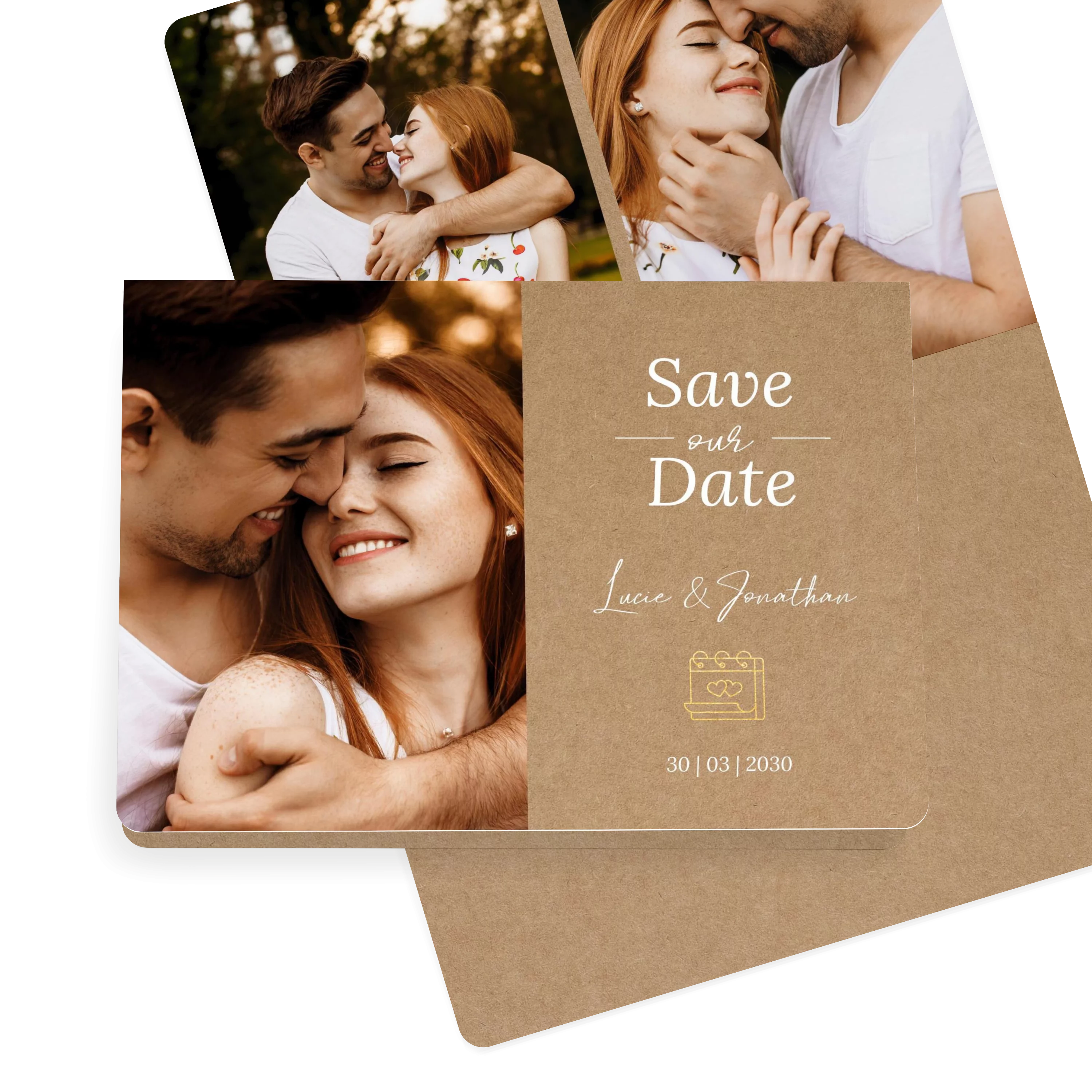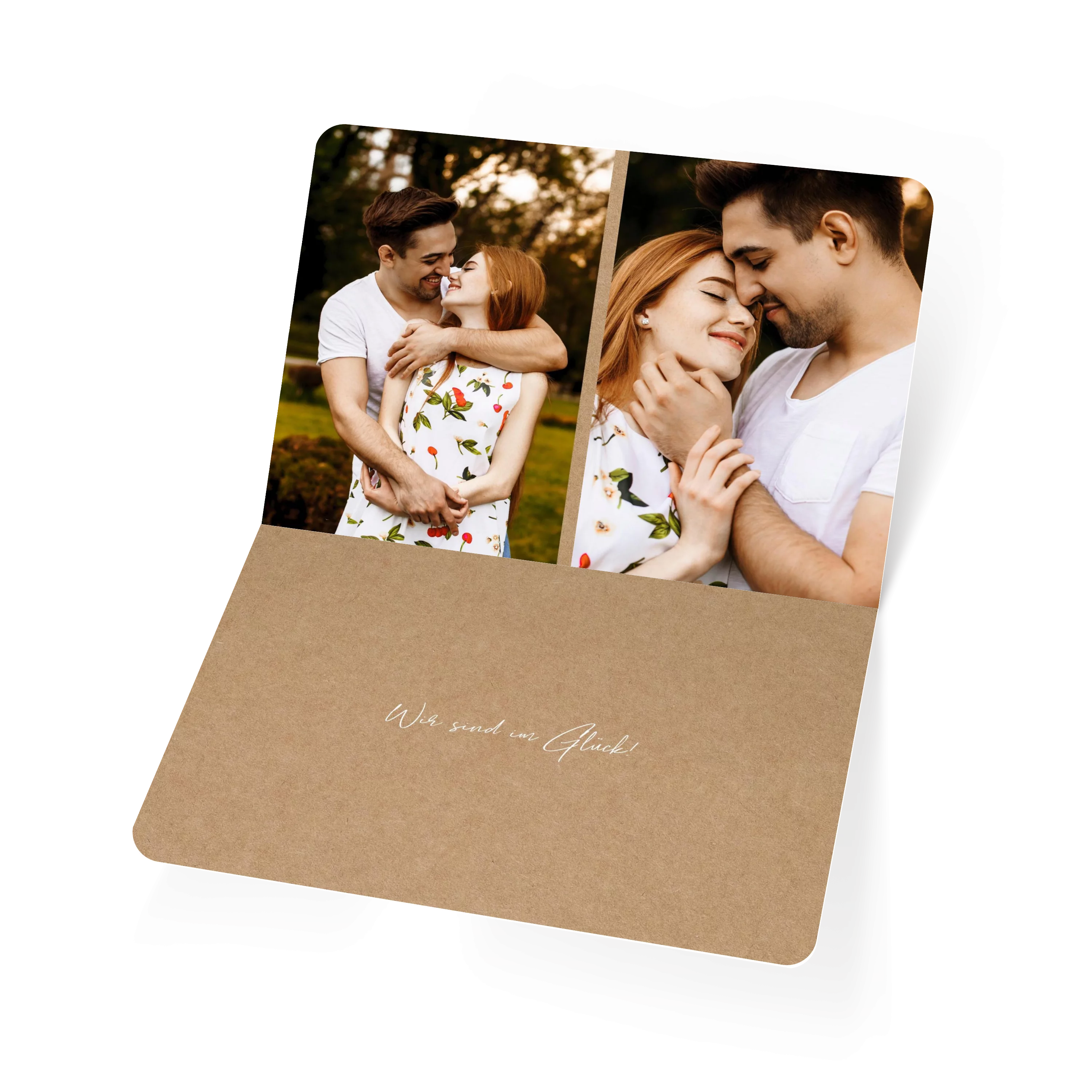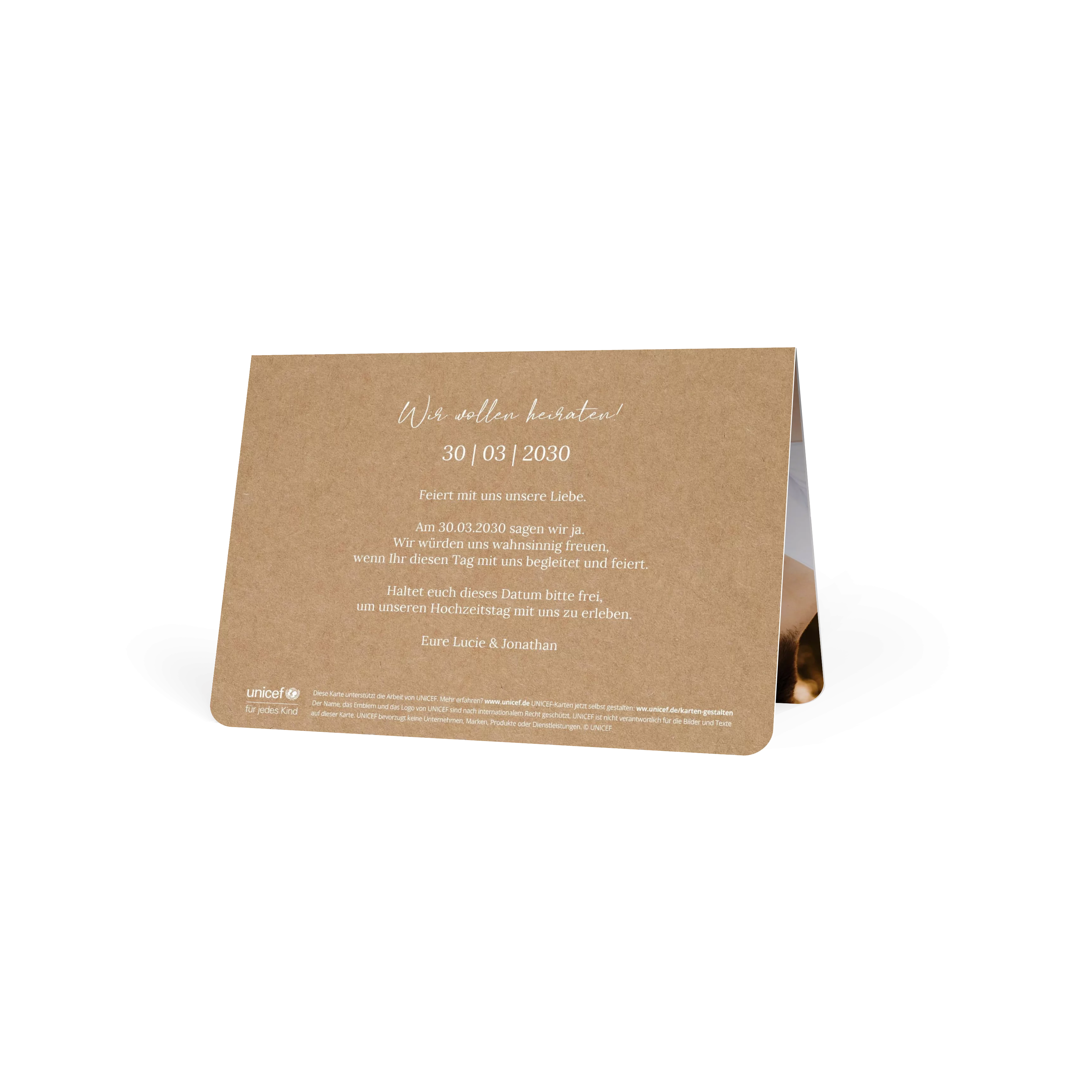 Warm, modern und ganz persönlich: Die Kombination aus Kraftpapier-Look, feiner Typografie und eigenem Foto macht diese Save-the-Date-Karte zu etwas ganz Besonderem.