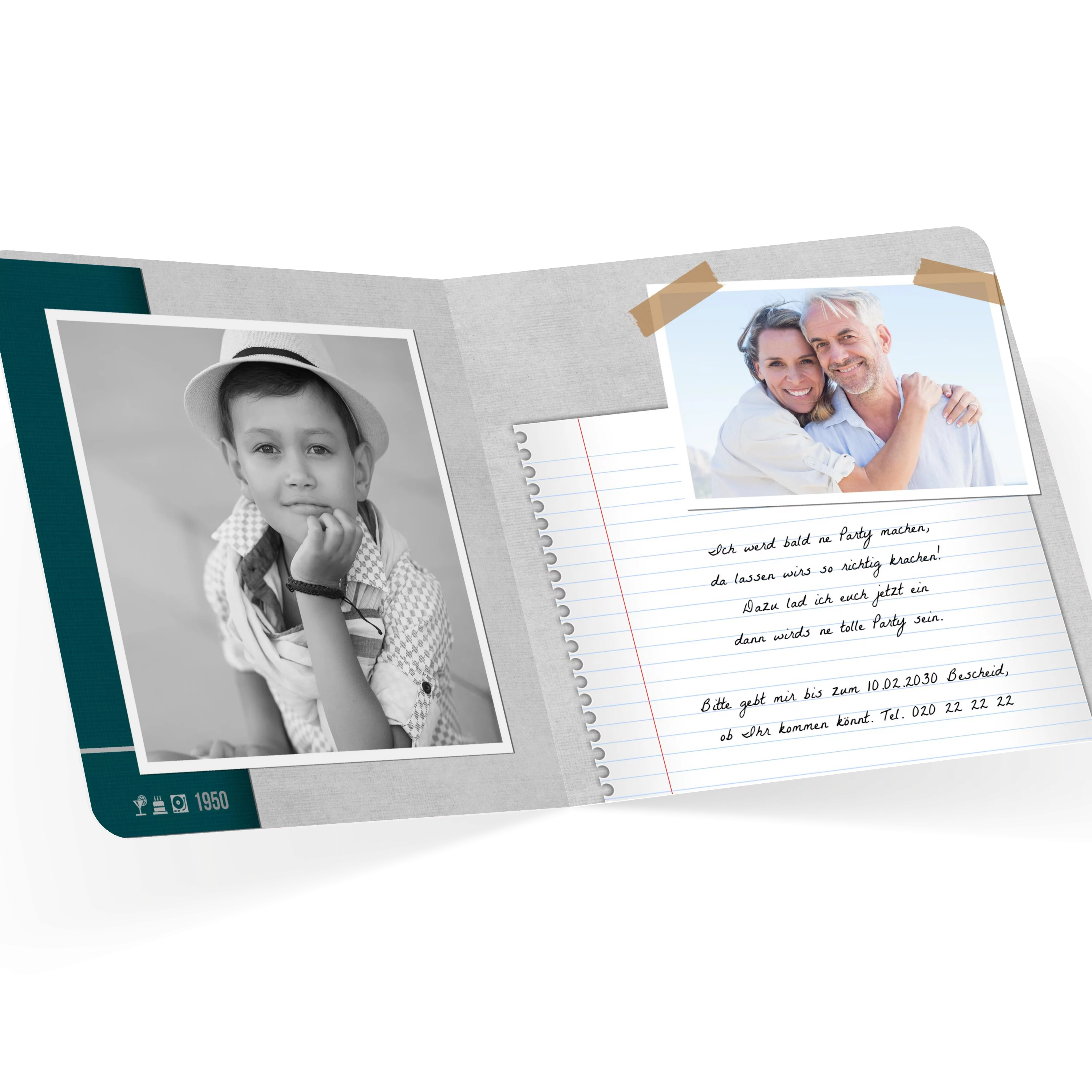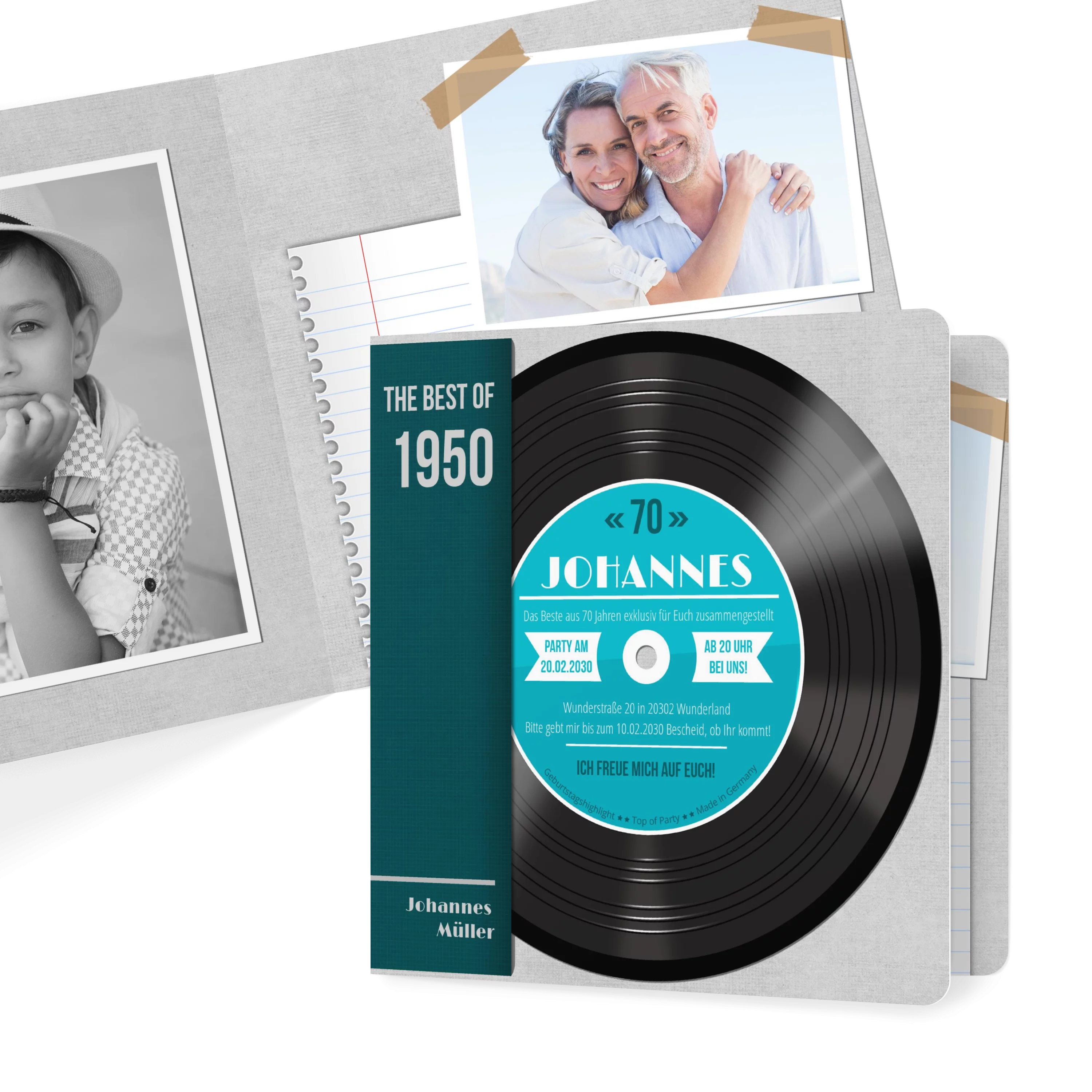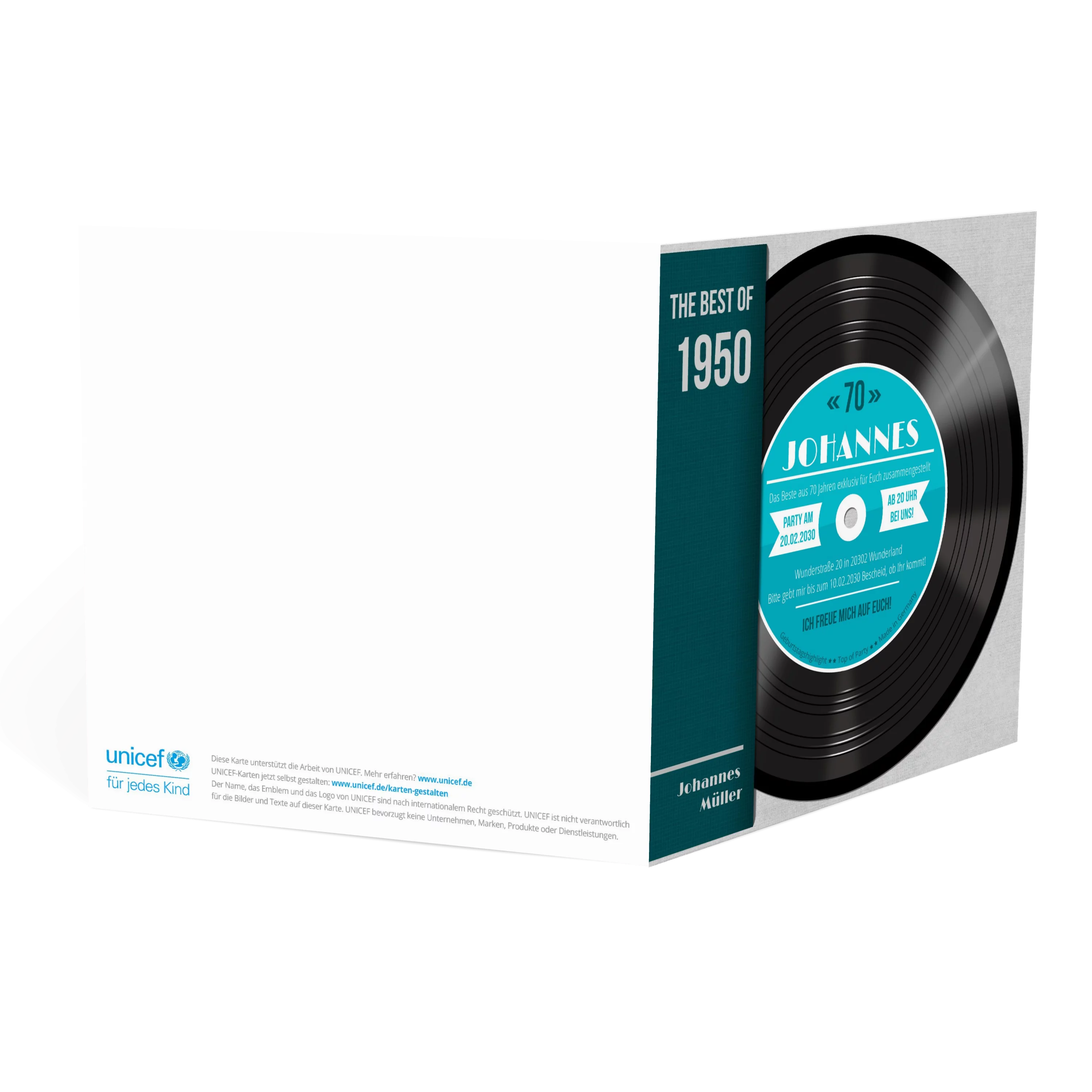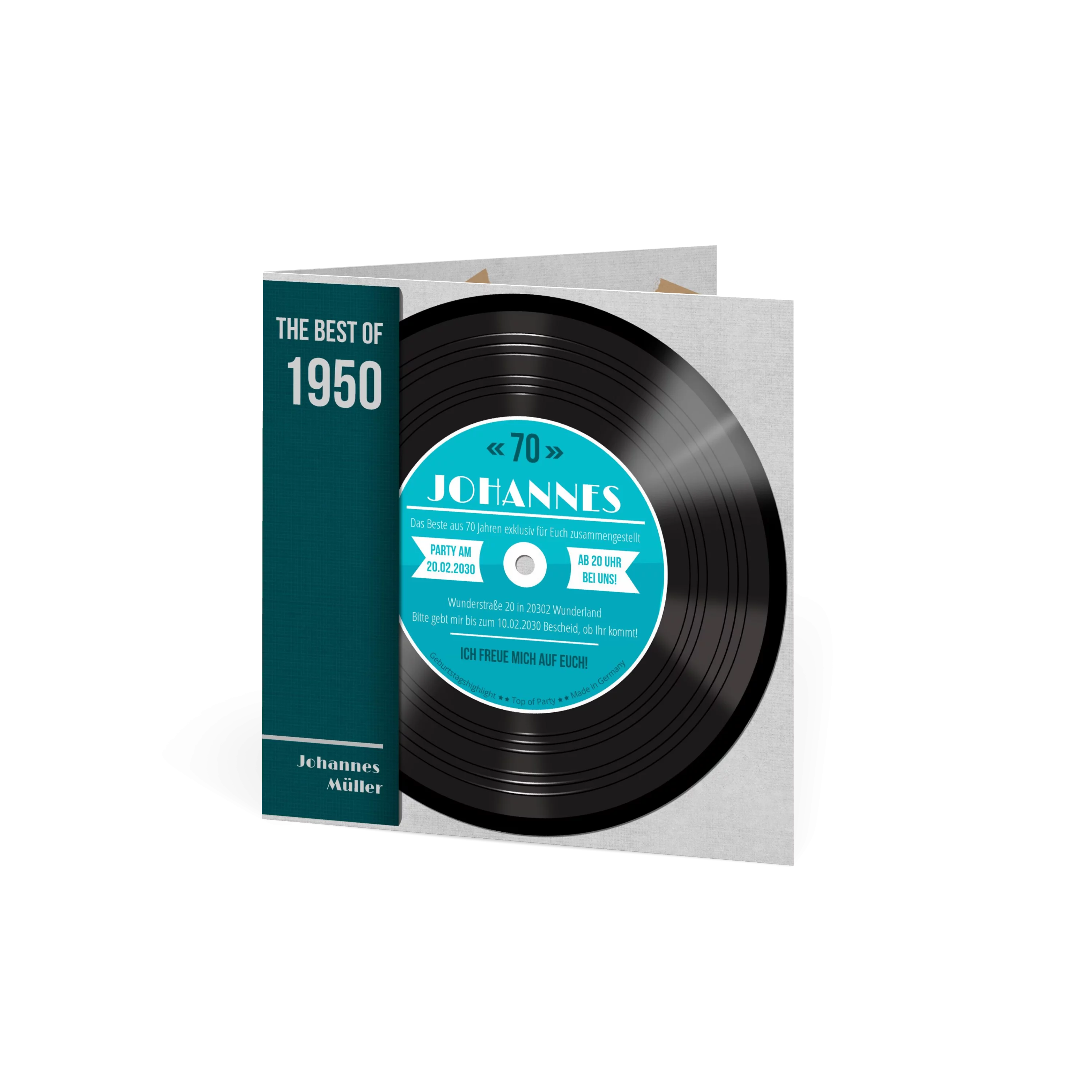 Diese originelle Karte im Vinyl-Look lädt stilecht zur 70er-Feier ein. Mit kräftigem Türkis, Plattencover-Design und liebevollen Details ist sie ein echter Hingucker für Musikfans. Das Beste daran: Die Zahl ist veränderbar!