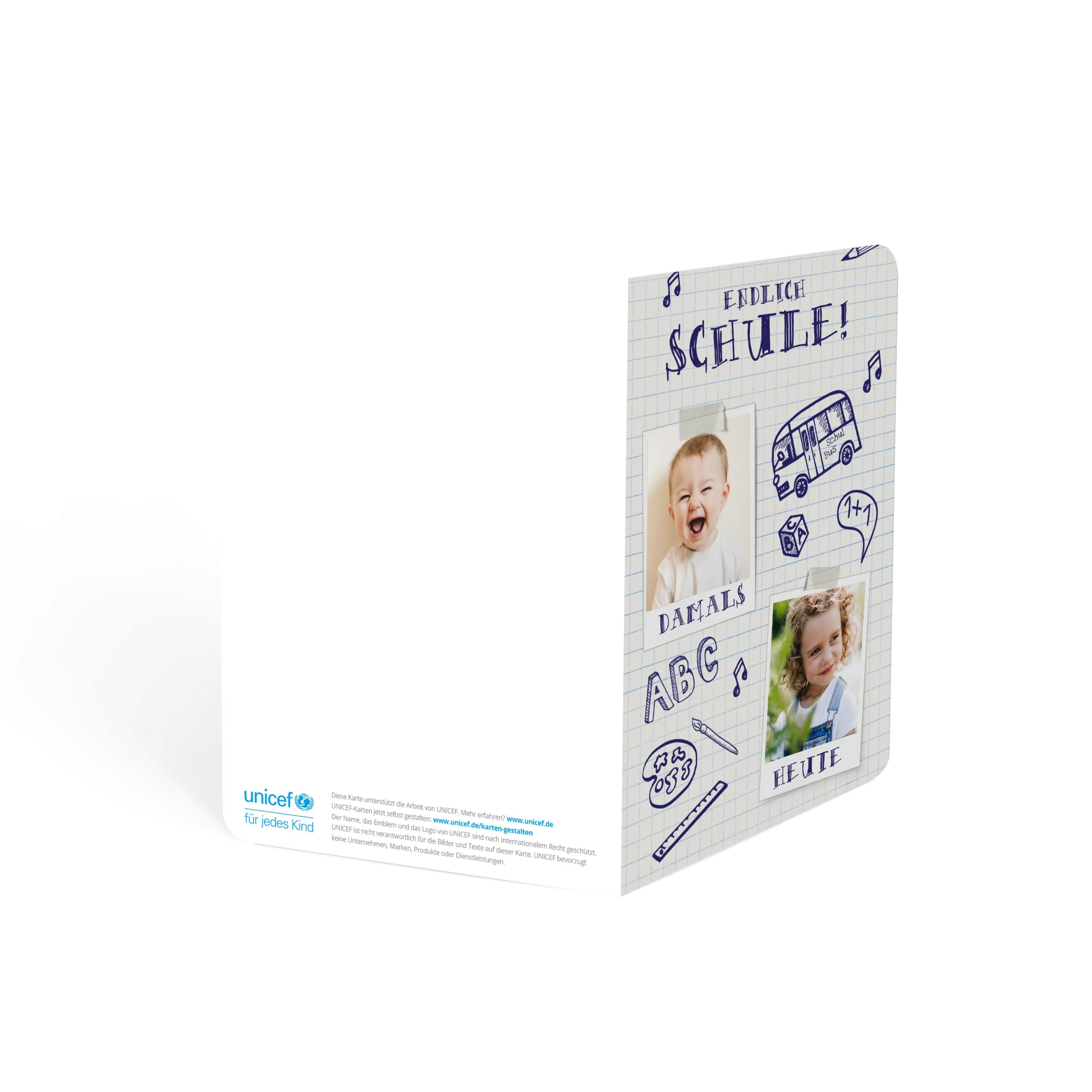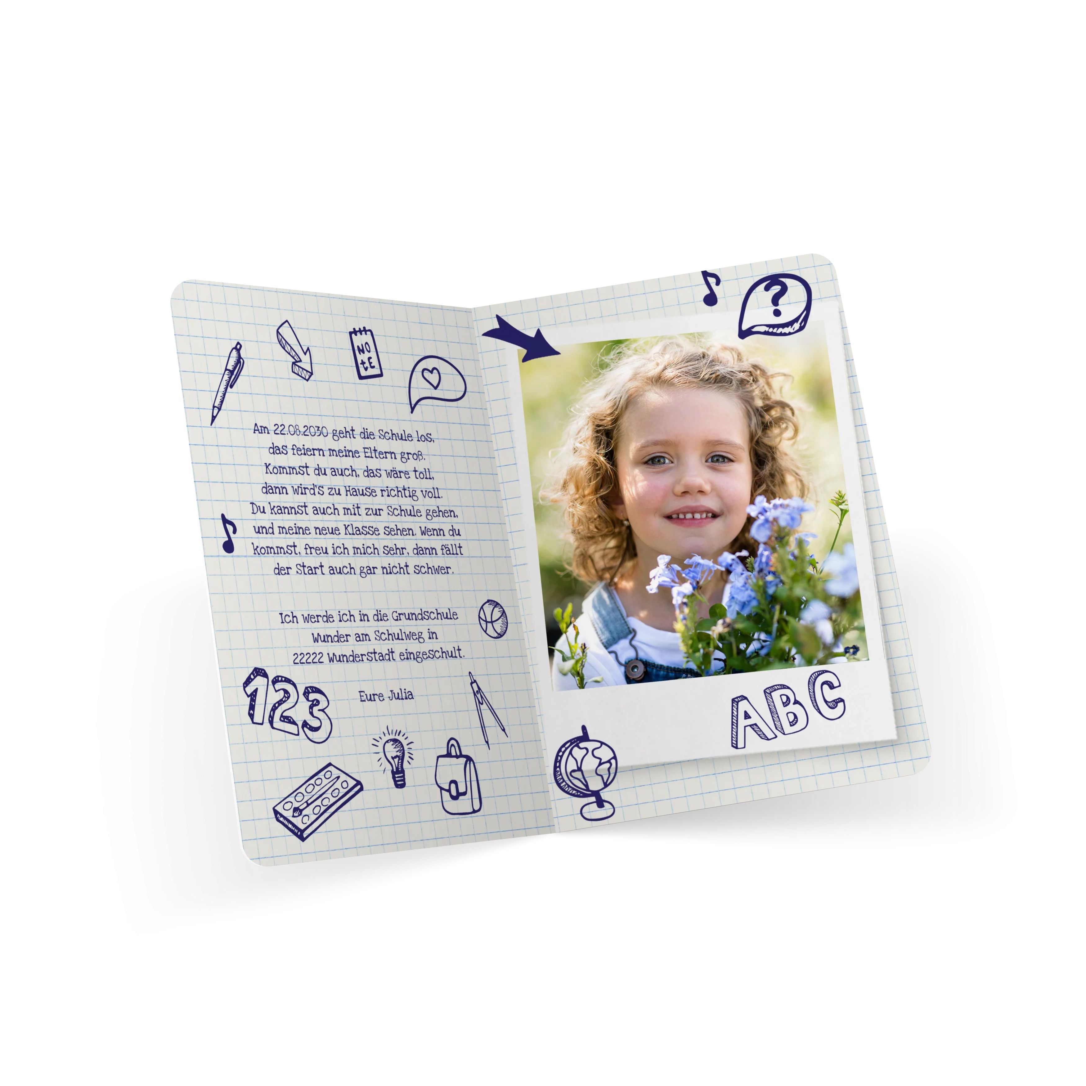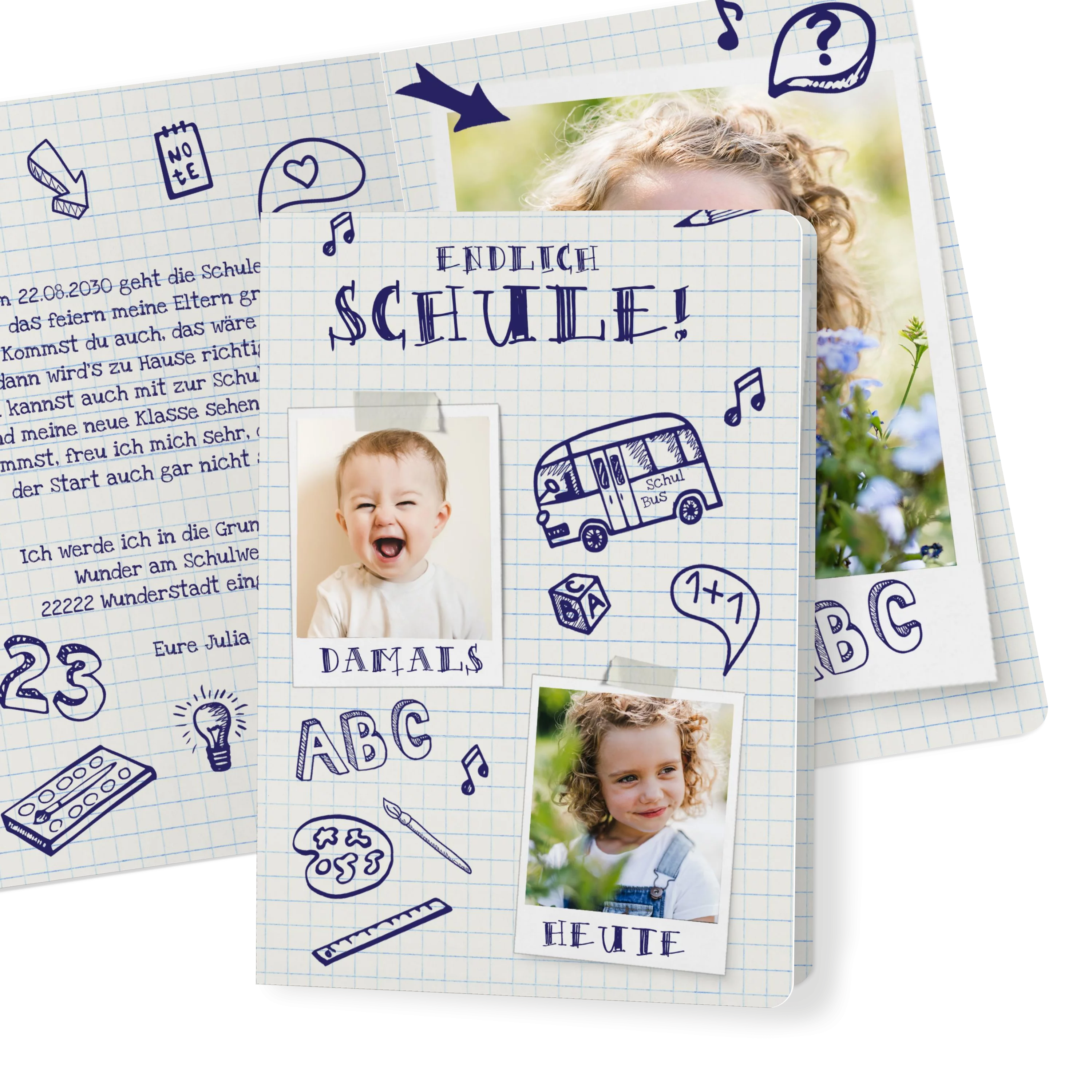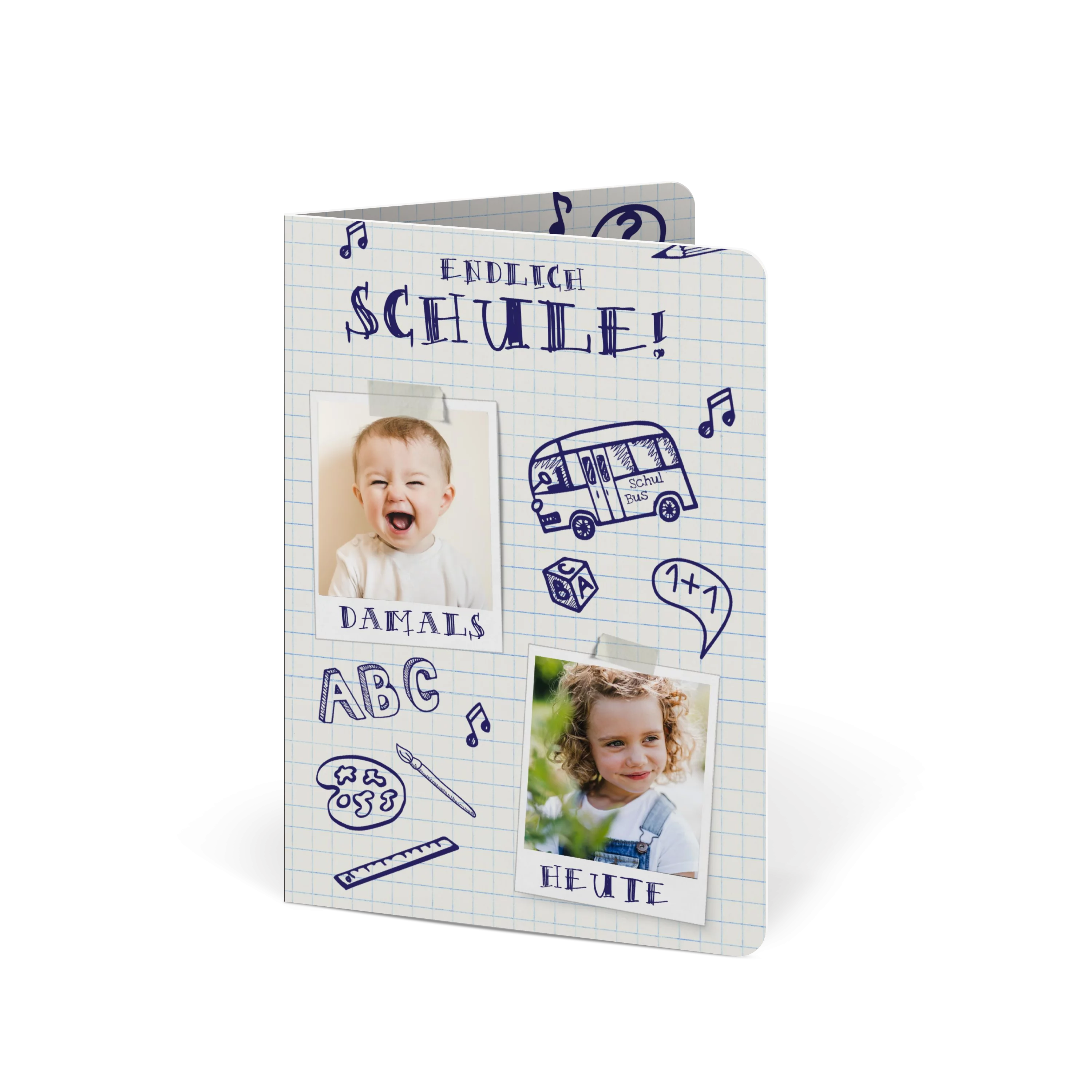 Endlich Schule! Auf dieser Karte finden vorn gleich zwei Fotos ihres kleinen Schulkinds Platz - von damals und von heute. Eine tolle Möglichkeit, die spannenden Jahre seit der Geburt Revue visuell passieren zu lassen und den Beginn der neuen Lebensphase zu markieren. Die Fotos sind im Polaroid-Stil abgebildet und ergänzen den Look eines karierten Schulblocks perfekt. Blaue Kritzeleien von ABC über Noten bis hin zum Schulbus sehen aus, wie handgezeichnet und bringen Spaß ins Spiel.