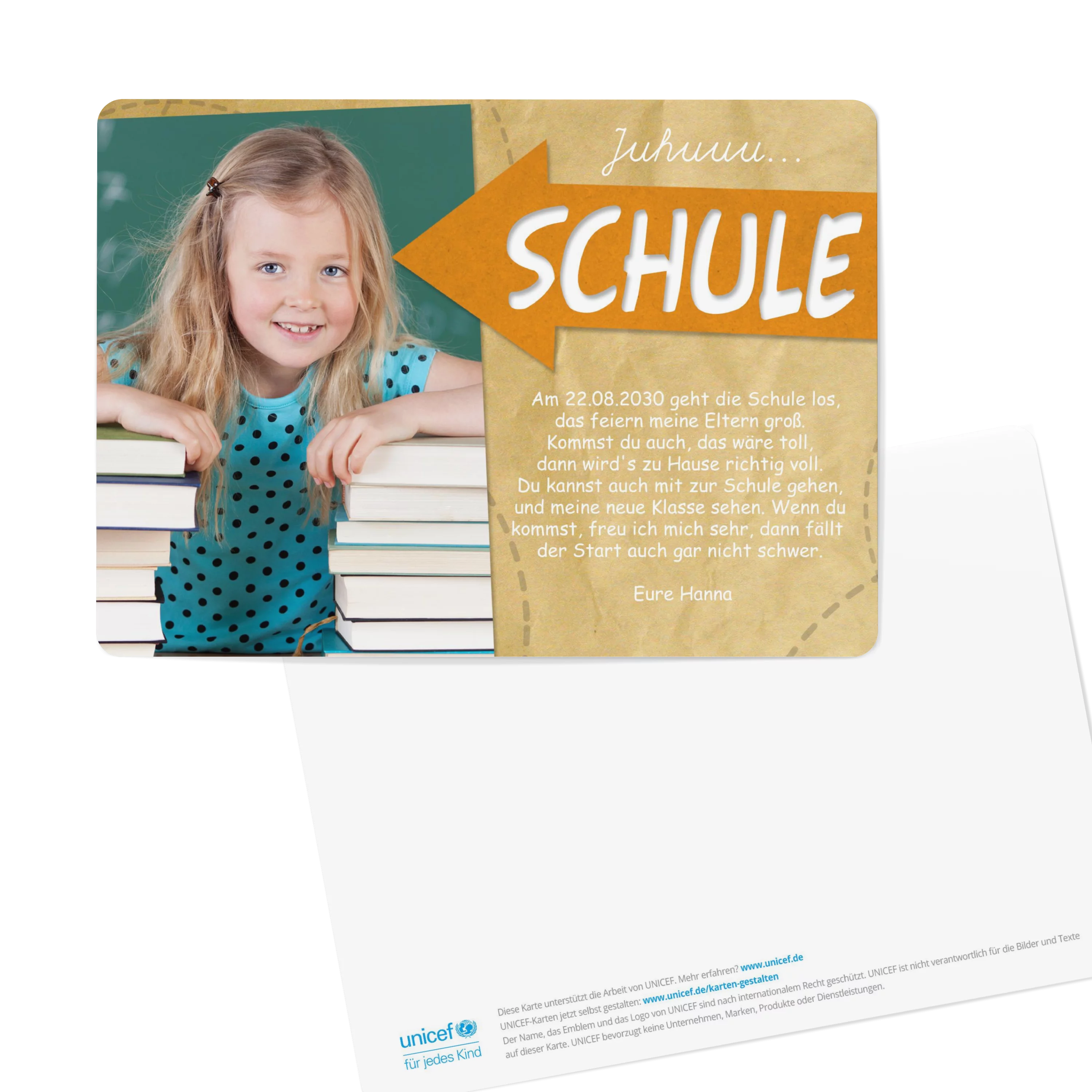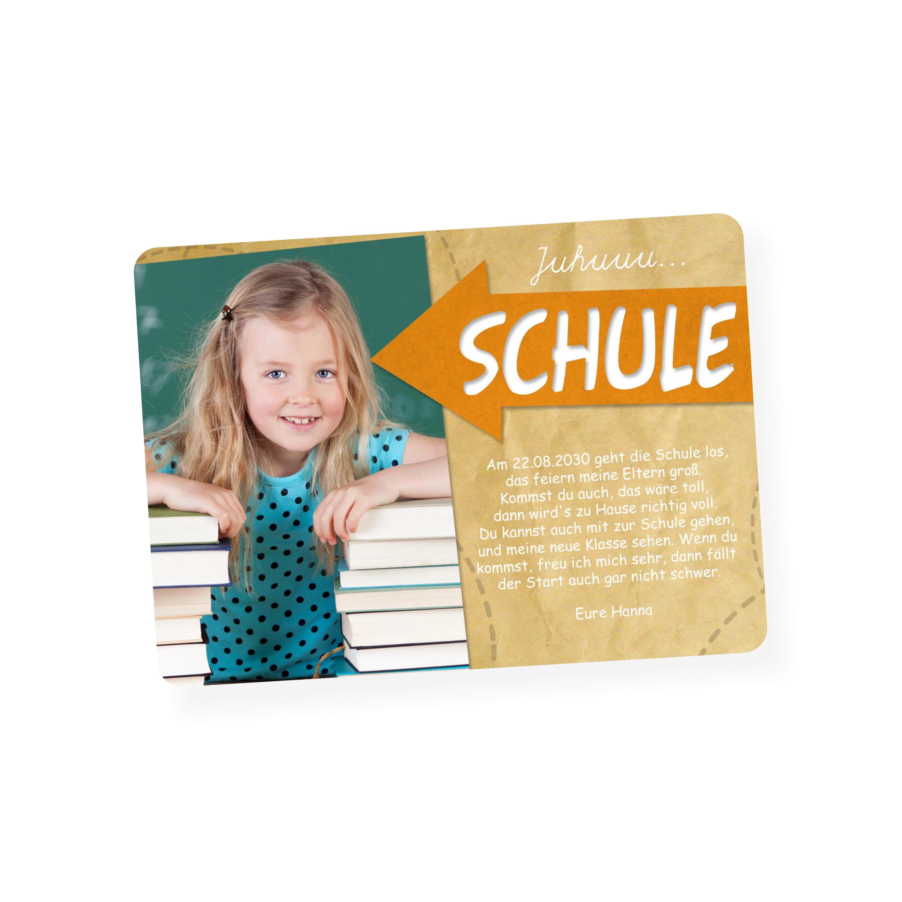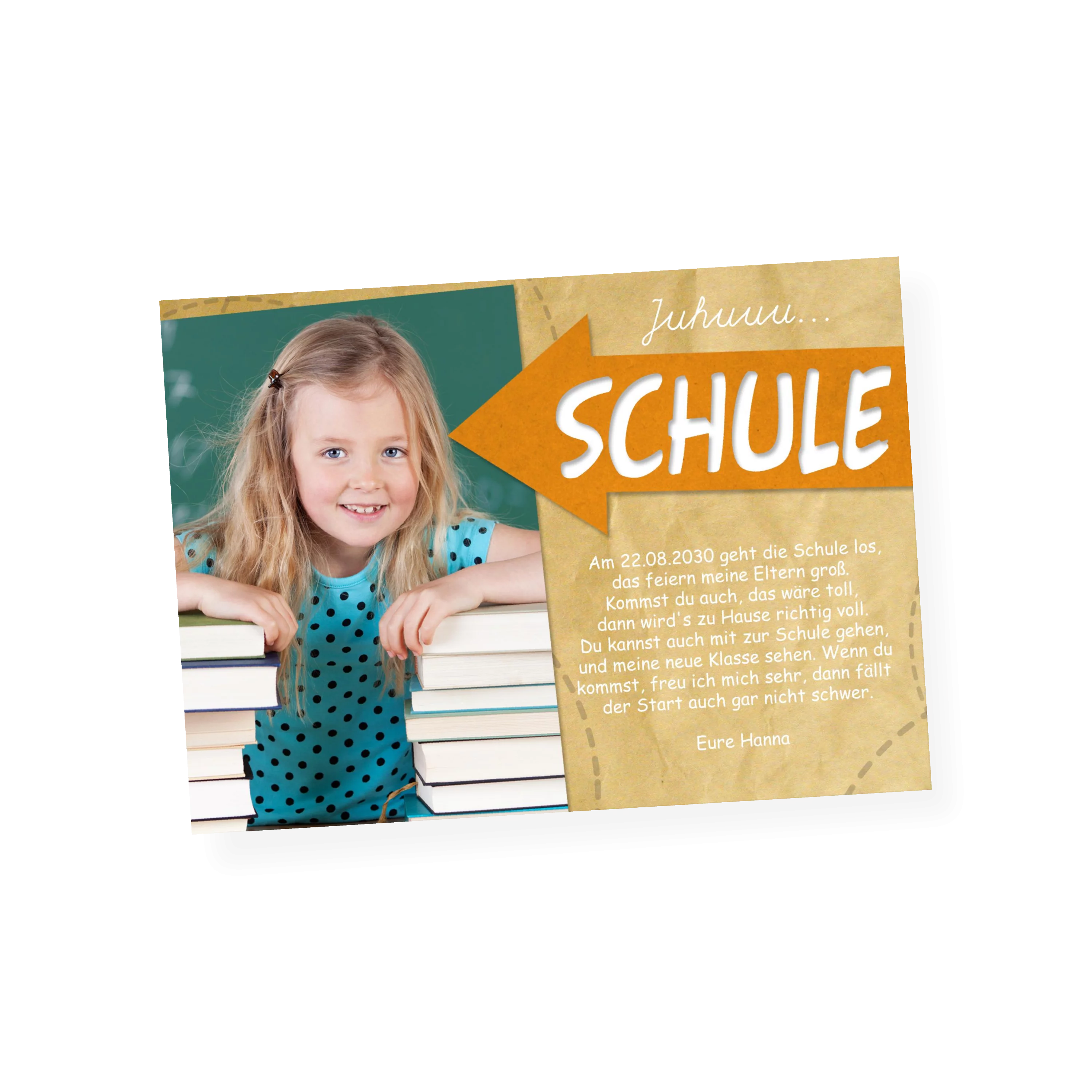 Der große Pfeil mit dem Wort „Schule“ in kräftigen Farben setzt ein fröhliches Statement und lenkt den Blick direkt auf das Foto. Die Kombination aus linierten Papier-Elementen, Kreide-Schrift und Stapeln voller Bücher verleiht dieser Einladung echten Schulstart-Charme.