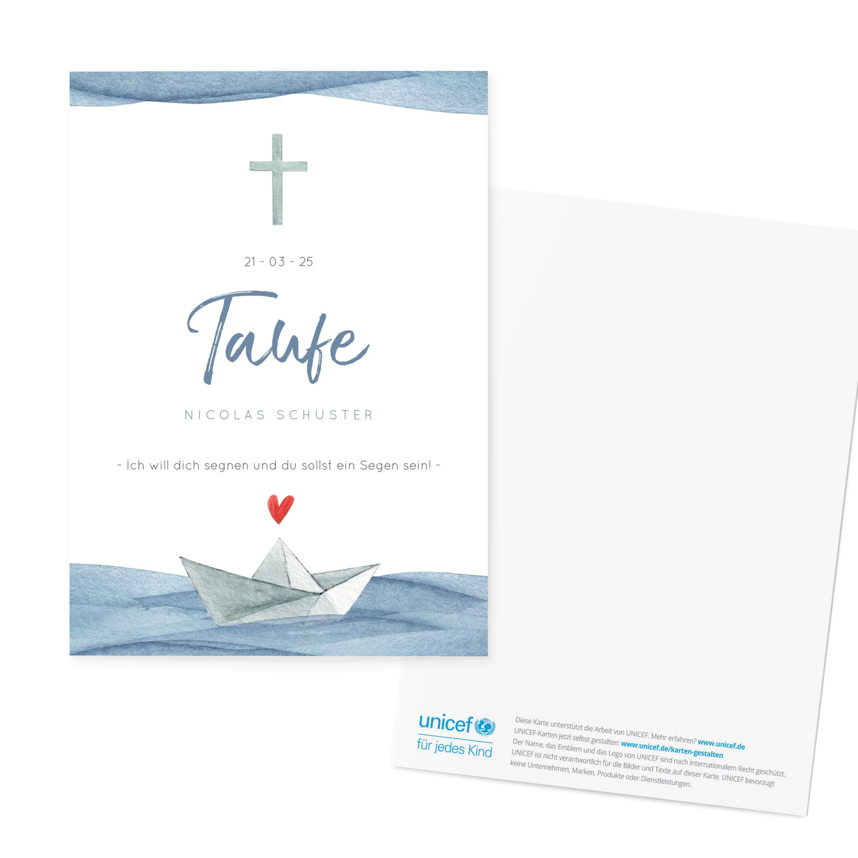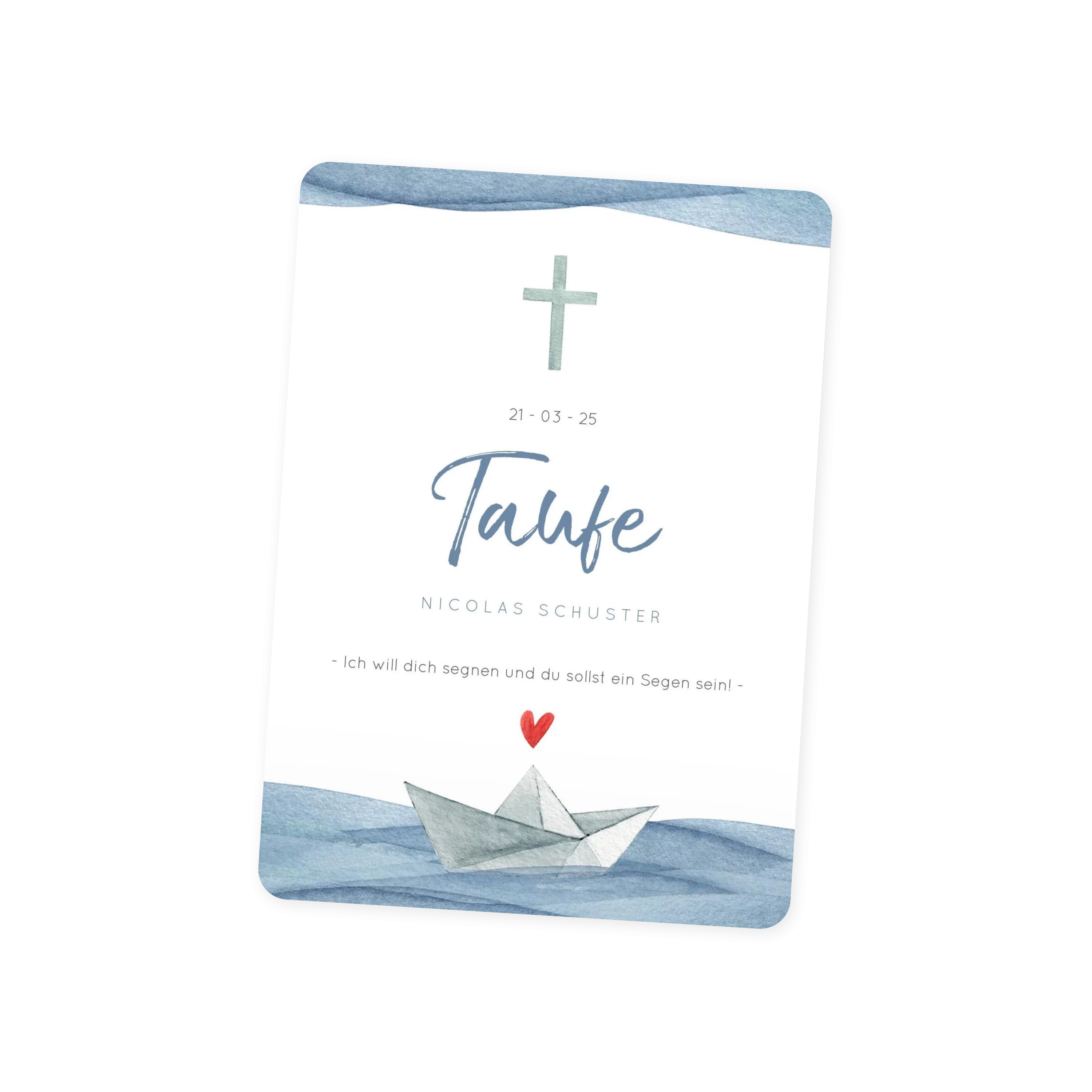 Ein kleines Boot treibt über aquarellblaue Wellen, begleitet von einem roten Herz und einem feinen Kreuz im oberen Bereich. Die moderne Typo in Blau und Grau ergänzt das ruhige Design – schlicht, symbolisch und voller Zuversicht.