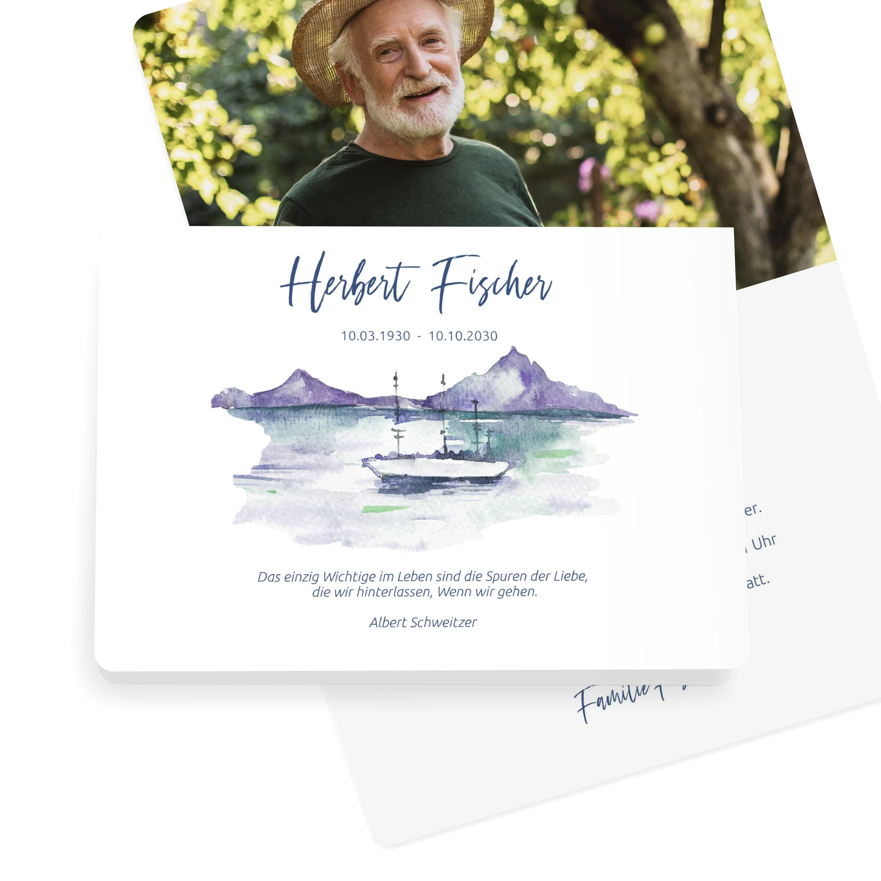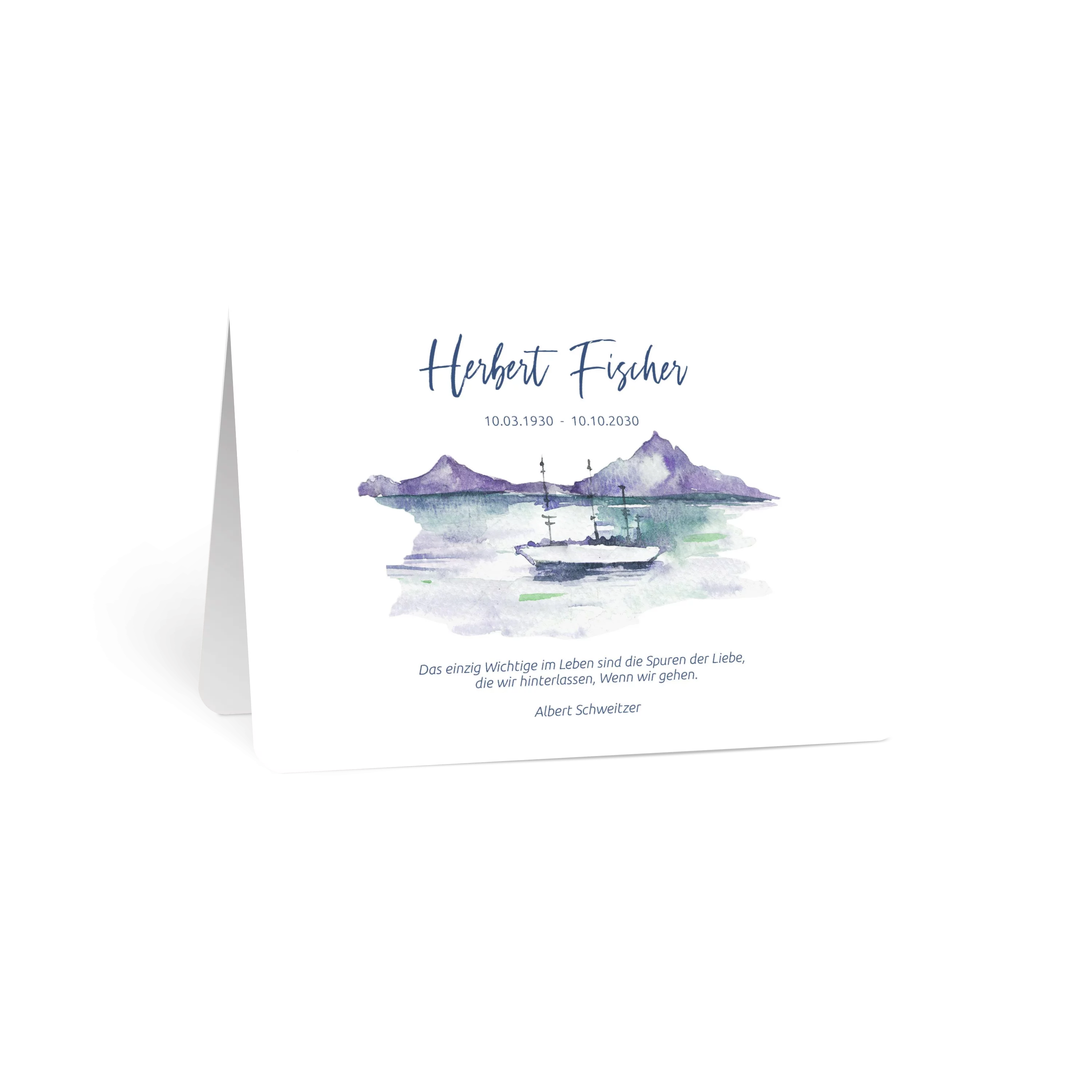 Die Karte ist mit einem fein abgestimmten Aquarell gestaltet: ein stilles Segelschiff, umgeben von weichen Farbübergängen – ideal für persönliche Worte voller Erinnerung.