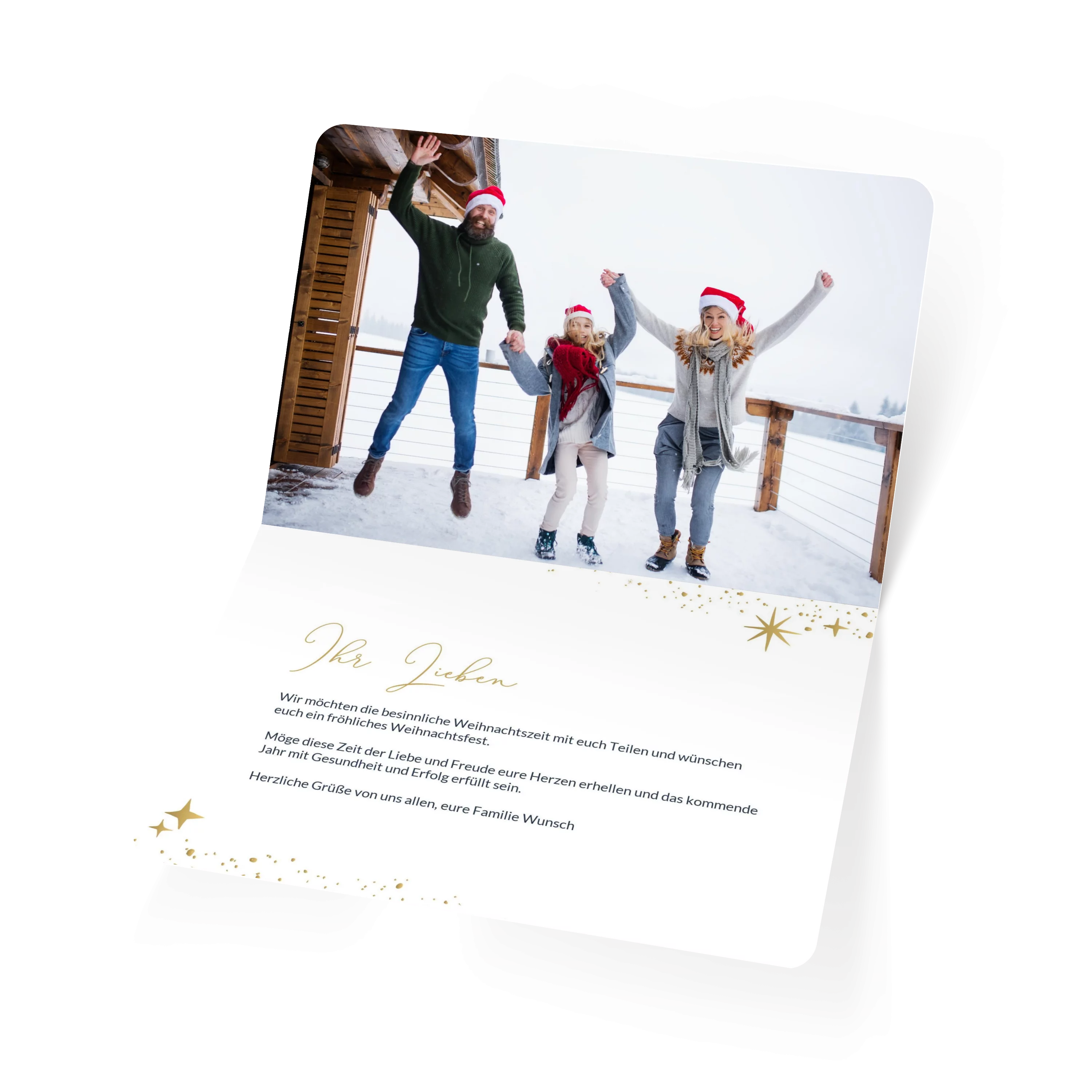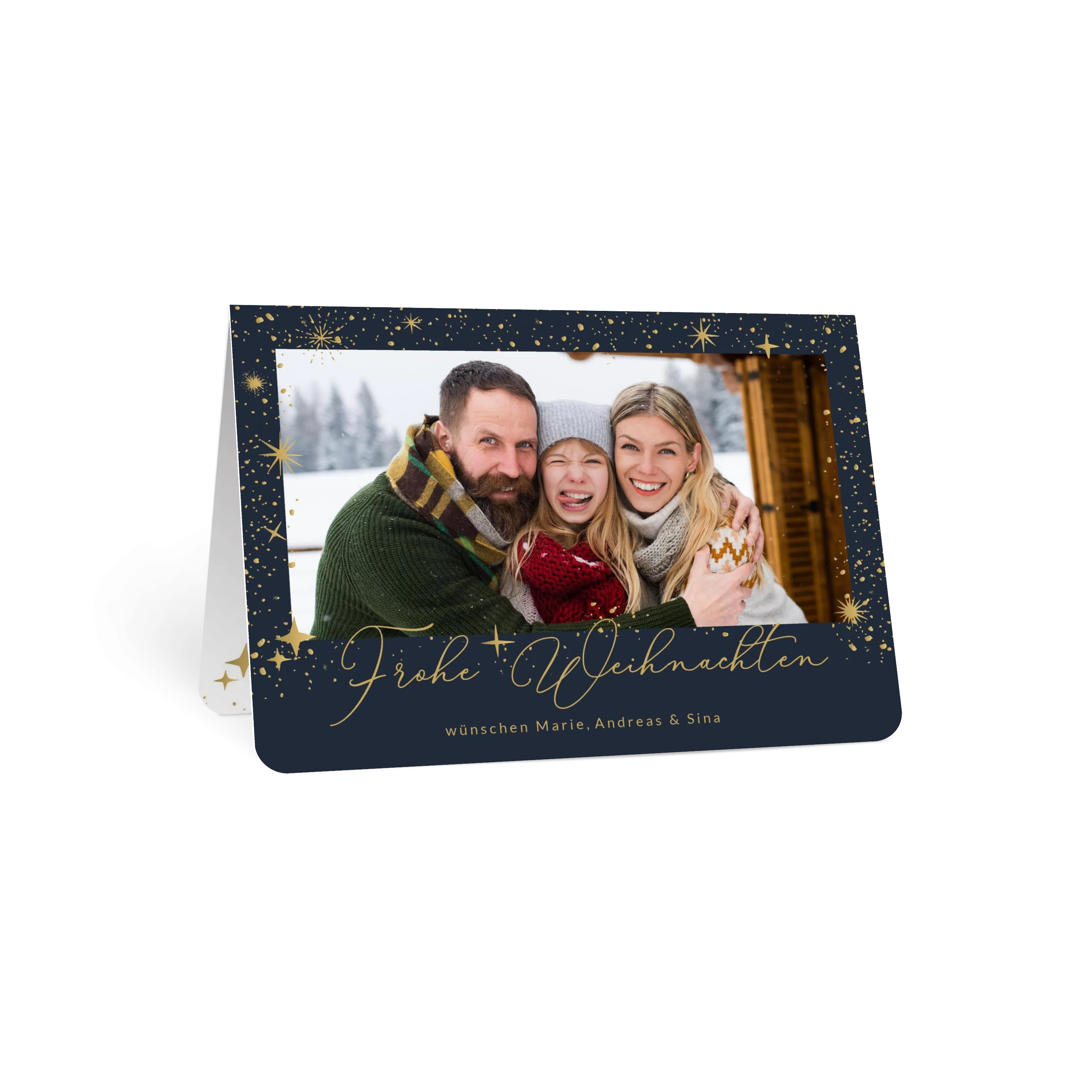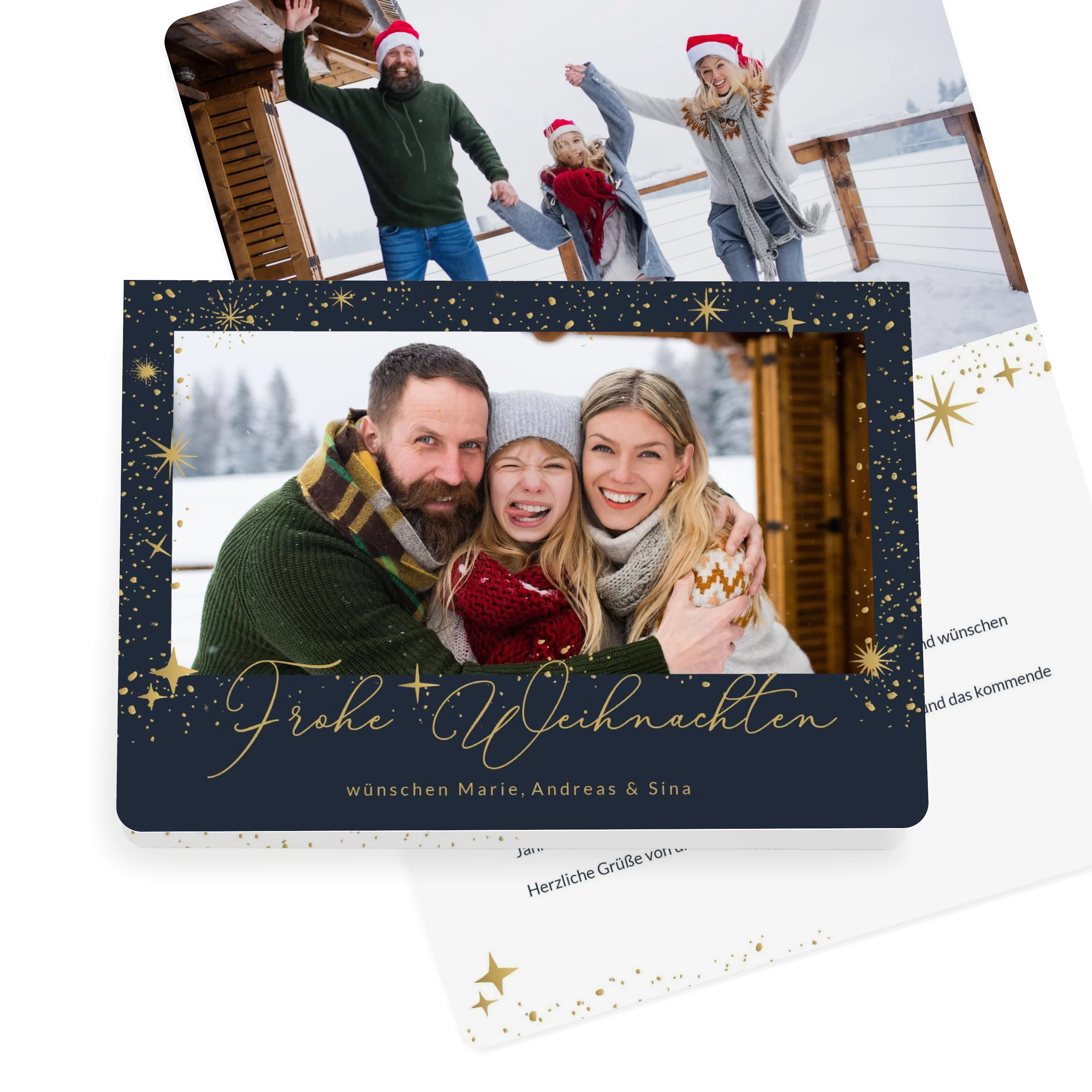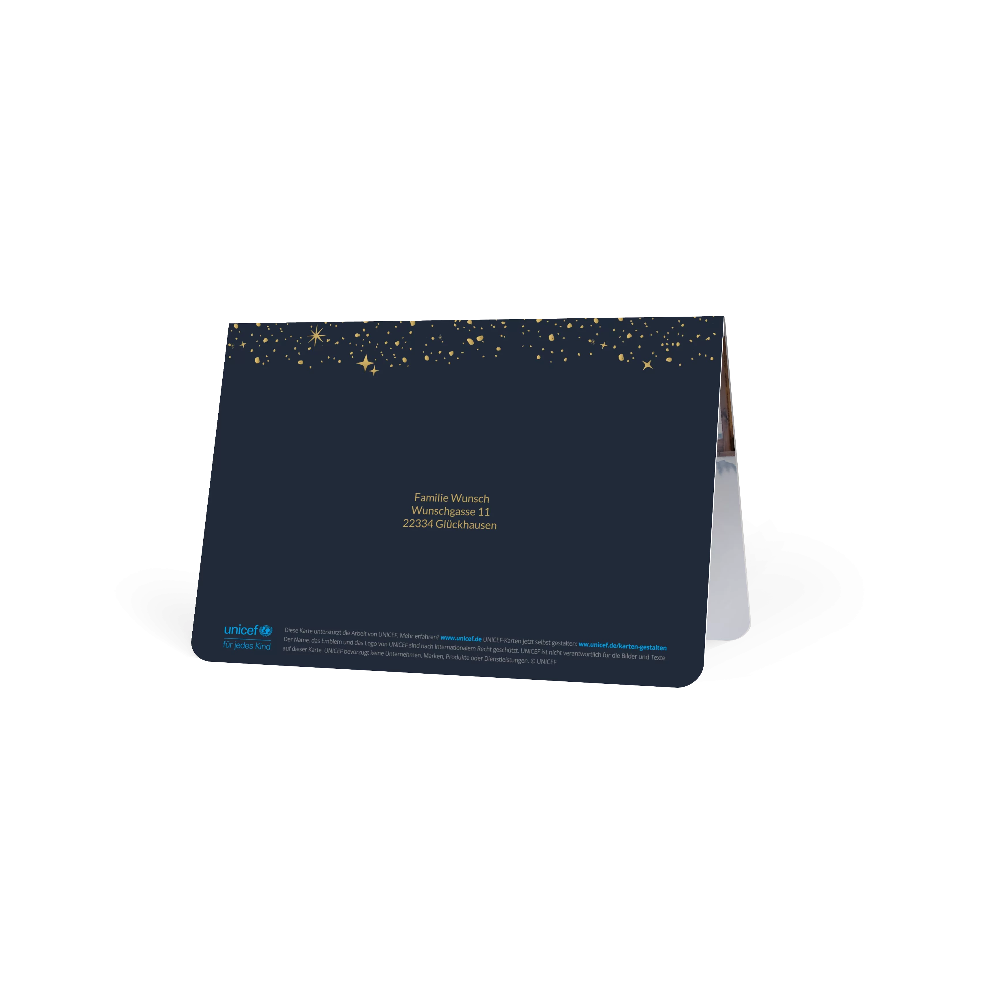 Weihnachtskarten gestalten: Bei dem eleganten Motiv „Sternennacht“ steht das eigene Foto im Zentrum, umgeben von gold anmutenden Sternen auf dunkelblauem Grund. Weihnachtskarte mit Foto im Format 16,6 x 11,8 cm, auch erhältlich als flache Karte oder Doppelklappkarte. Gestalten Sie Ihre Karten zu Weihnachten mit Fotos und persönlichem Text. Wir nutzen Papier aus nachhaltiger Forstwirtschaft und eine plastikfreie Verpackung. Mit dem Kauf von UNICEF Weihnachtskarten helfen Sie Kindern in Not.