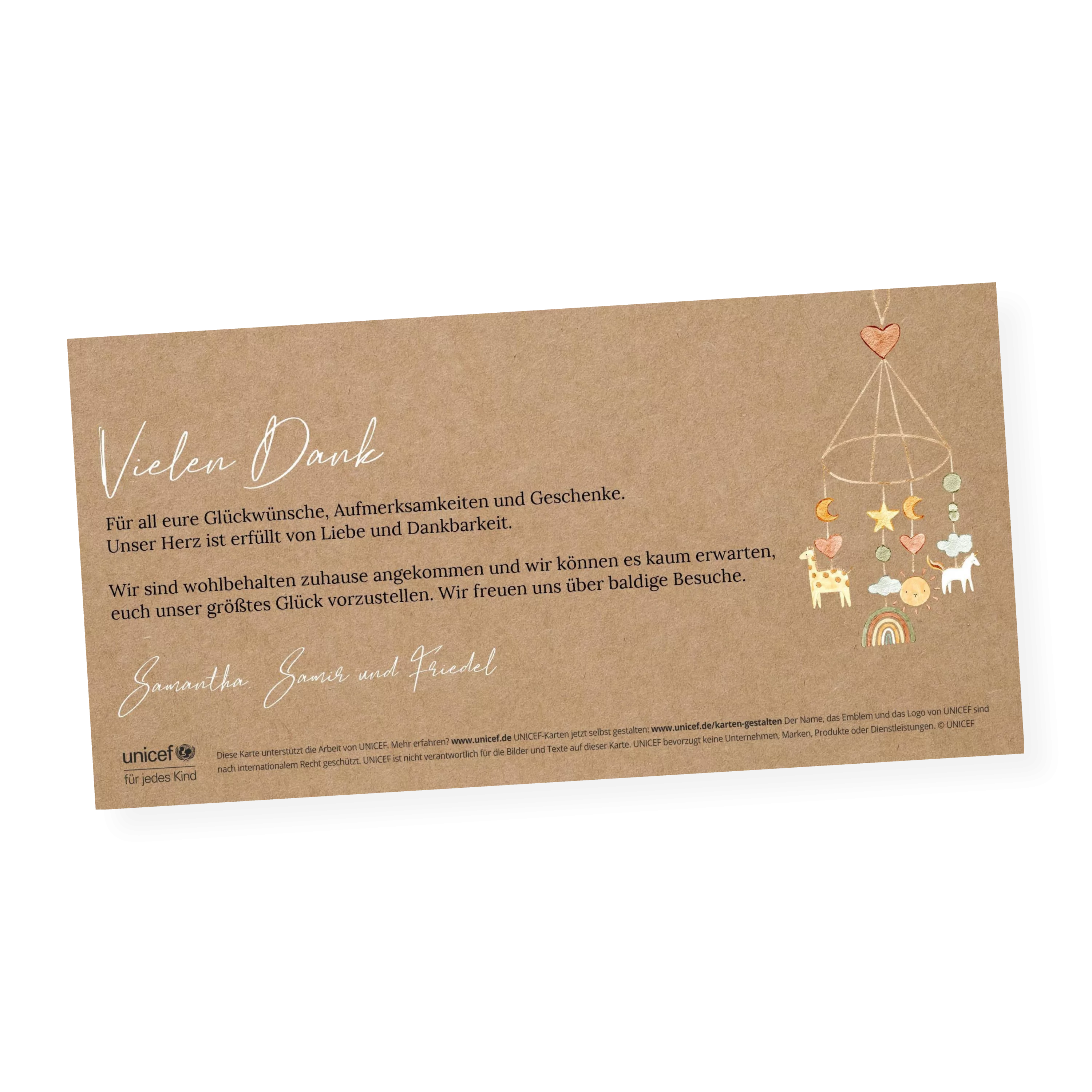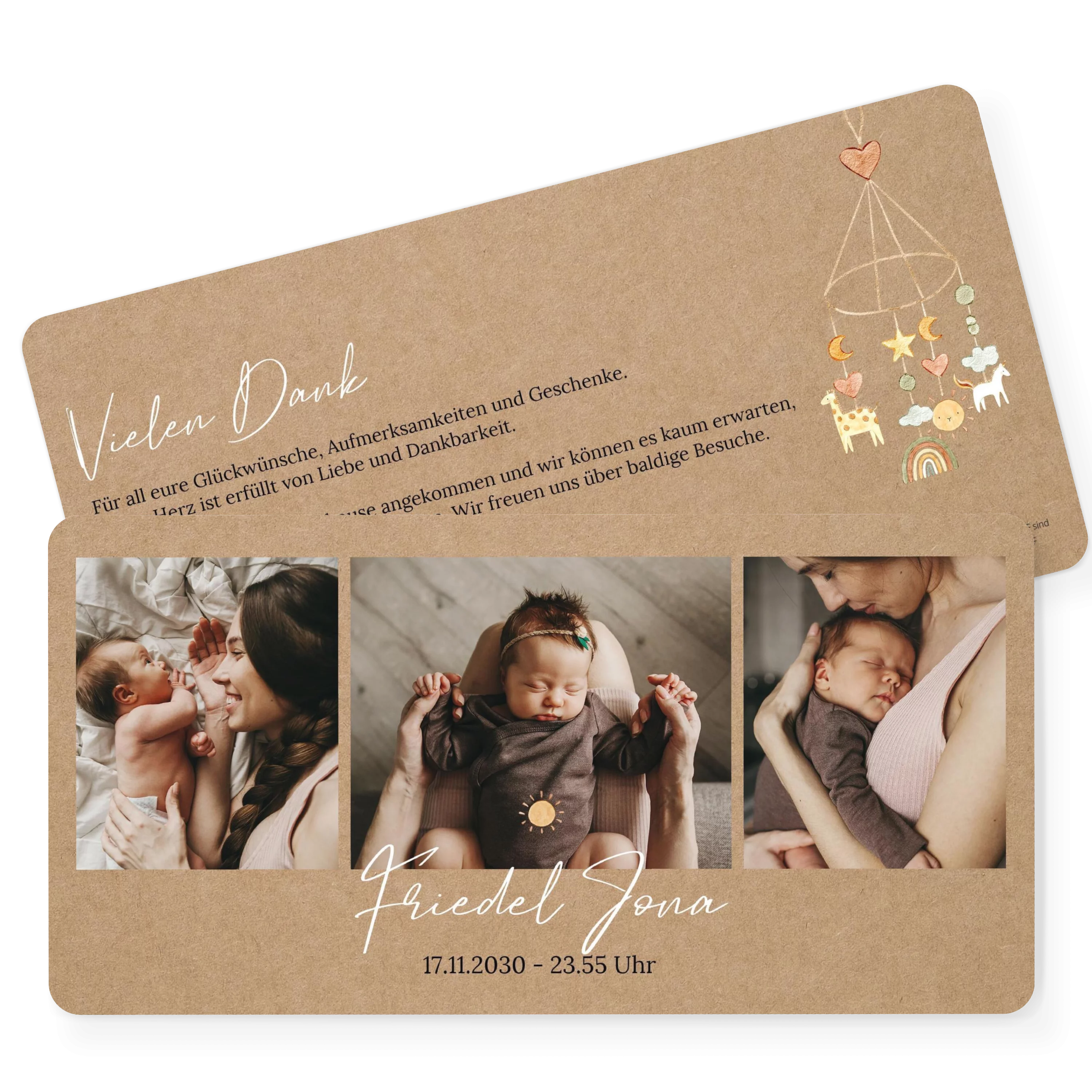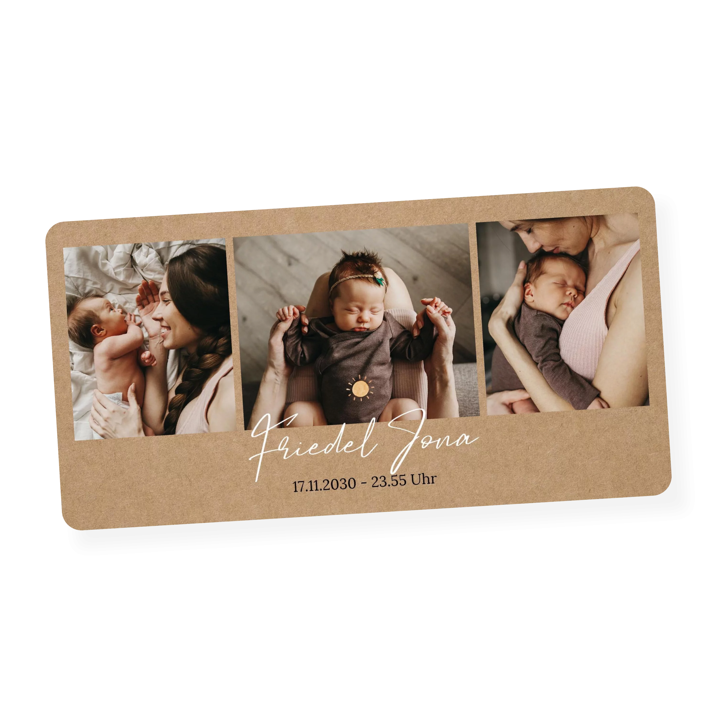 Mit drei liebevollen Fotos und warmer Kraftpapier-Optik bietet diese Karte einen ganz natürlichen Rahmen für Ihr großes Glück. Der handschriftliche Namenszug und das zarte Sonnenmotiv setzen persönliche Akzente – ideal, um Ihre Freude schlicht und herzlich zu teilen.