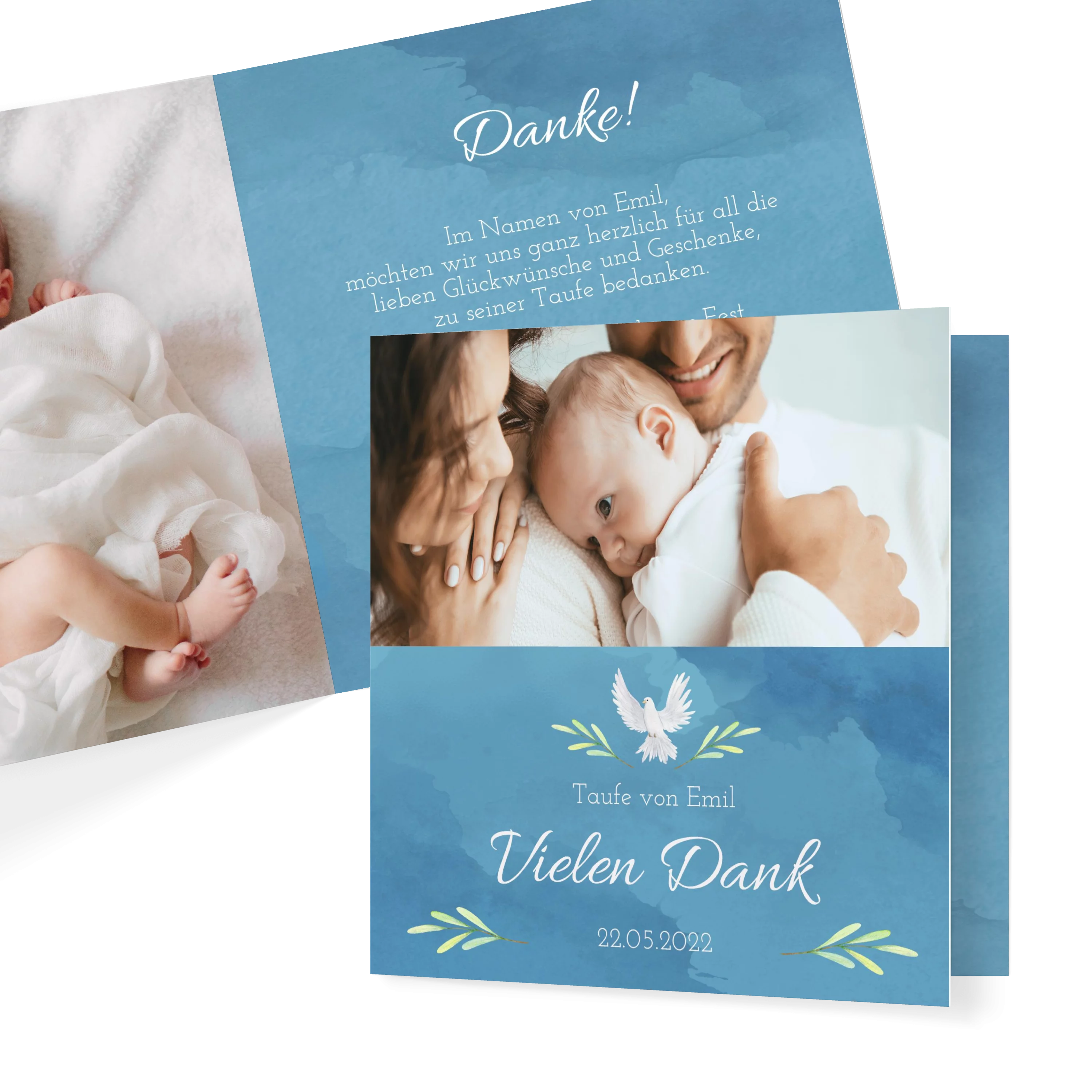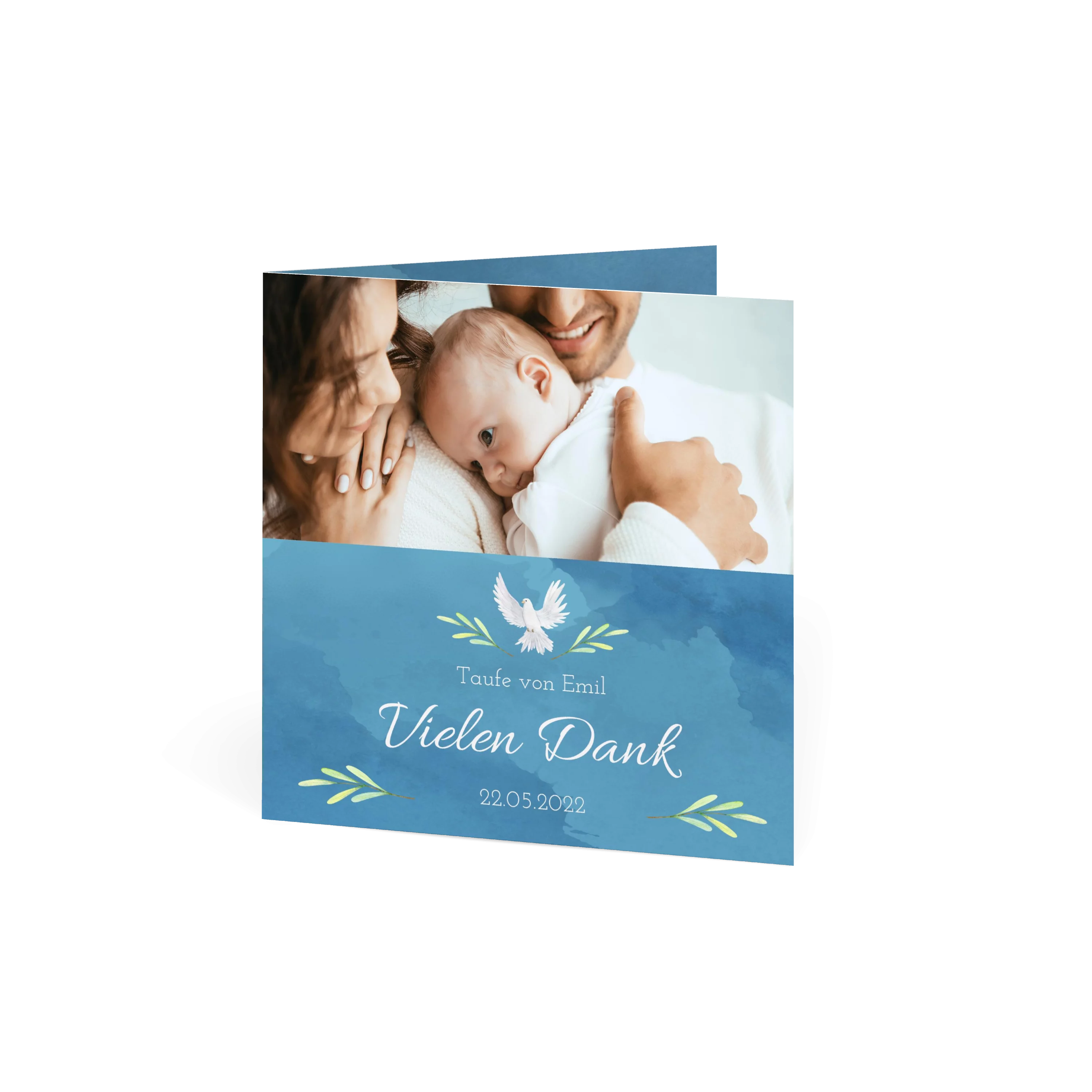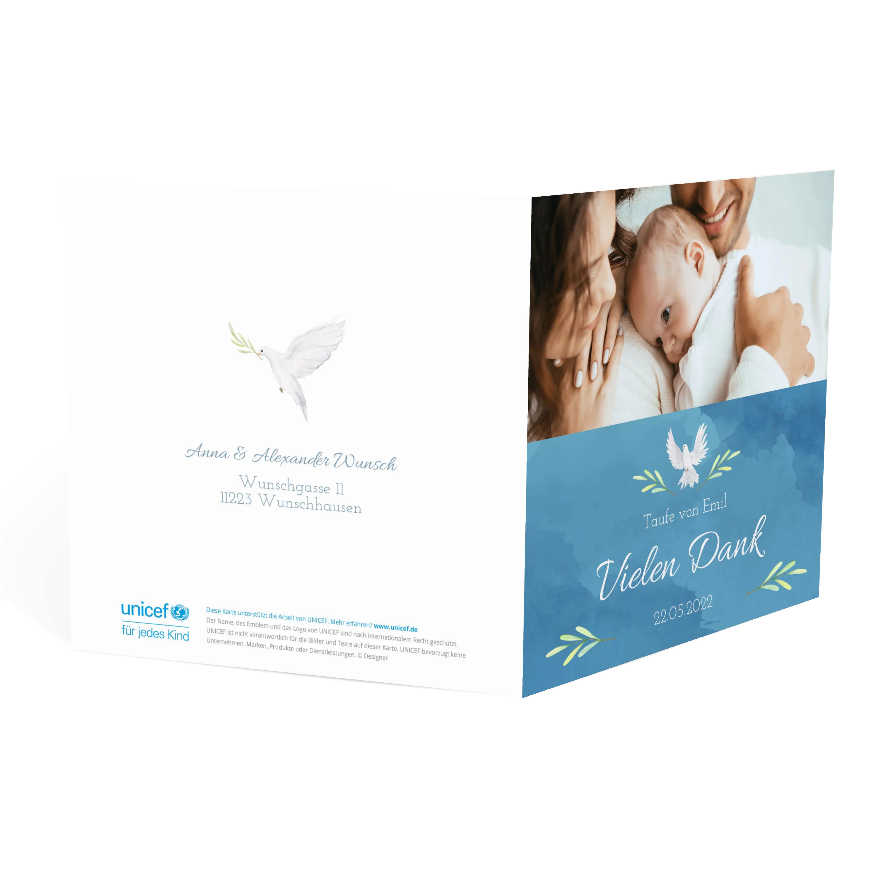 Das leuchtende Blau mit Aquarellstruktur bildet den Hintergrund für eine weiße Taube und zarte Zweige – ein symbolstarker, fröhlicher Abschluss für ein besonderes Fest. Oben ergänzt ein persönliches Foto die Karte auf liebevolle Weise.