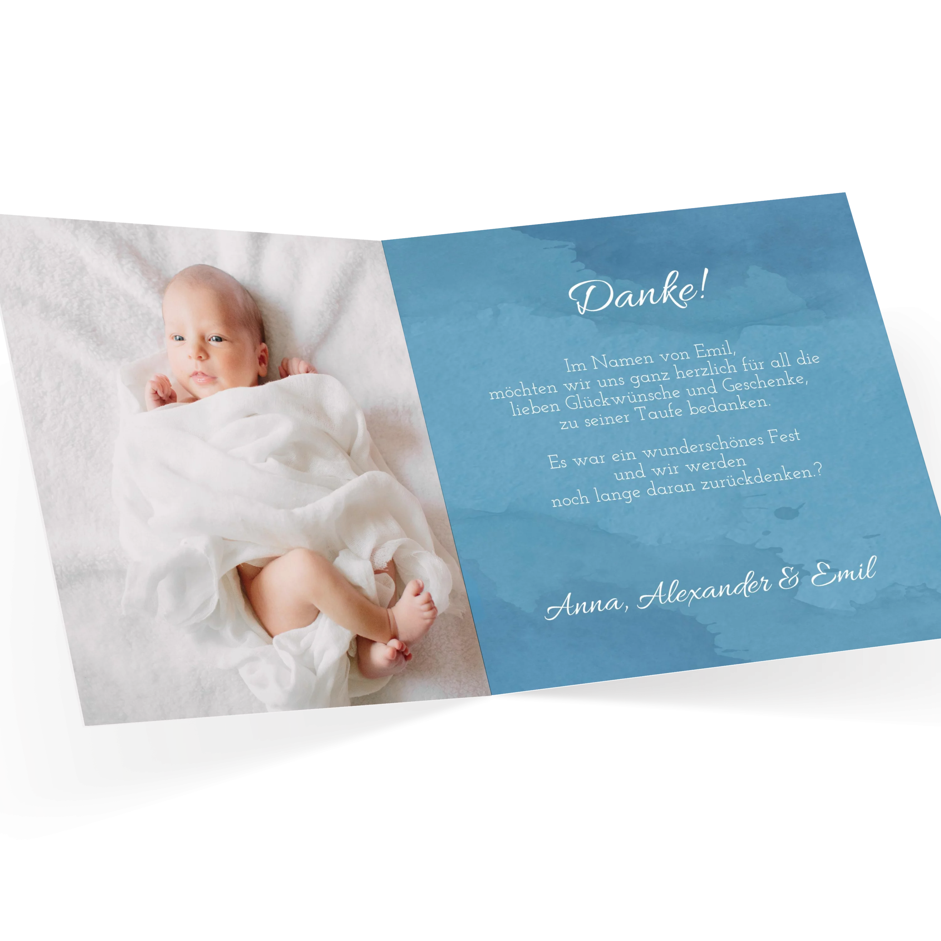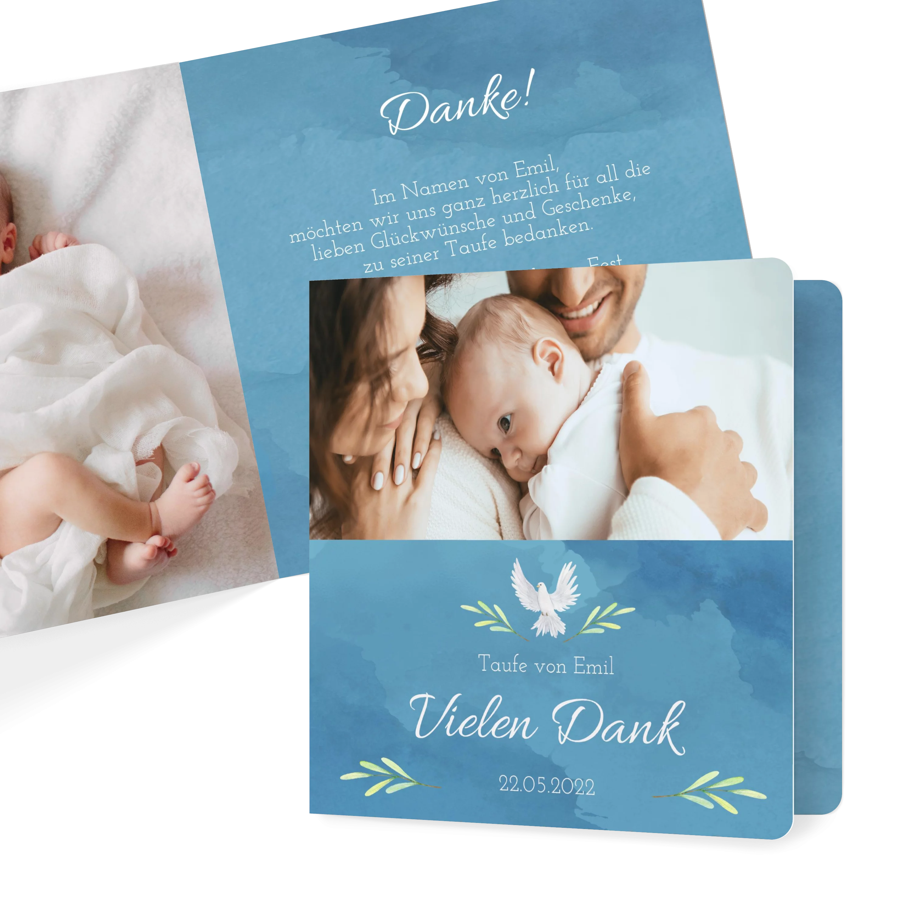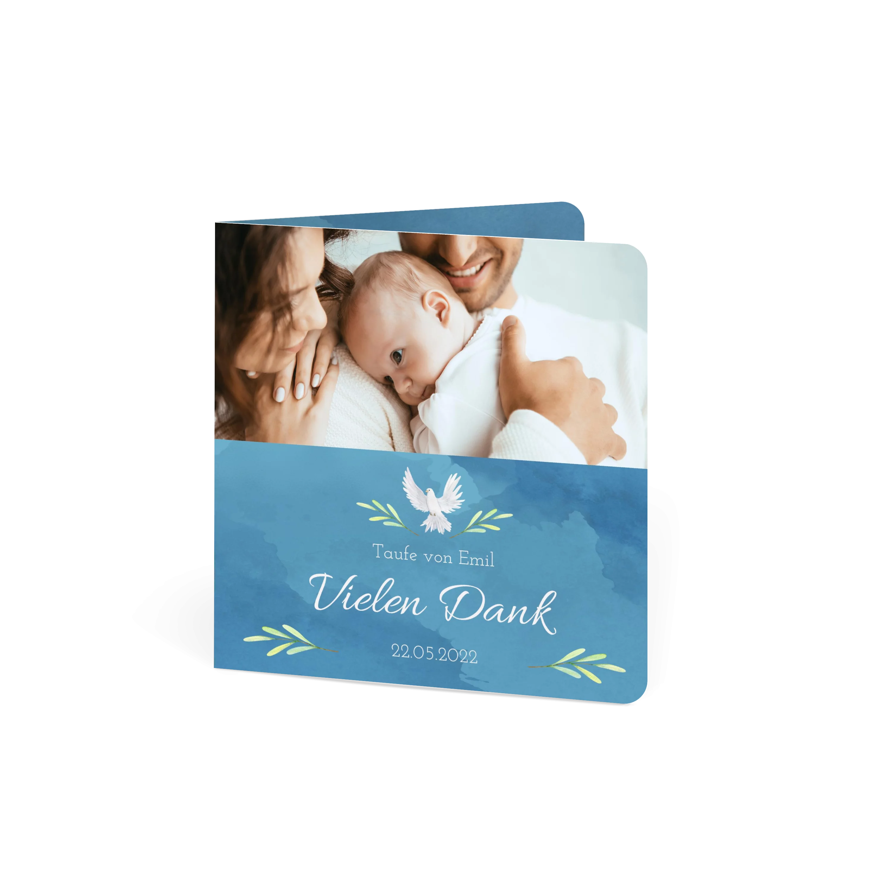 Das leuchtende Blau mit Aquarellstruktur bildet den Hintergrund für eine weiße Taube und zarte Zweige – ein symbolstarker, fröhlicher Abschluss für ein besonderes Fest. Oben ergänzt ein persönliches Foto die Karte auf liebevolle Weise.
