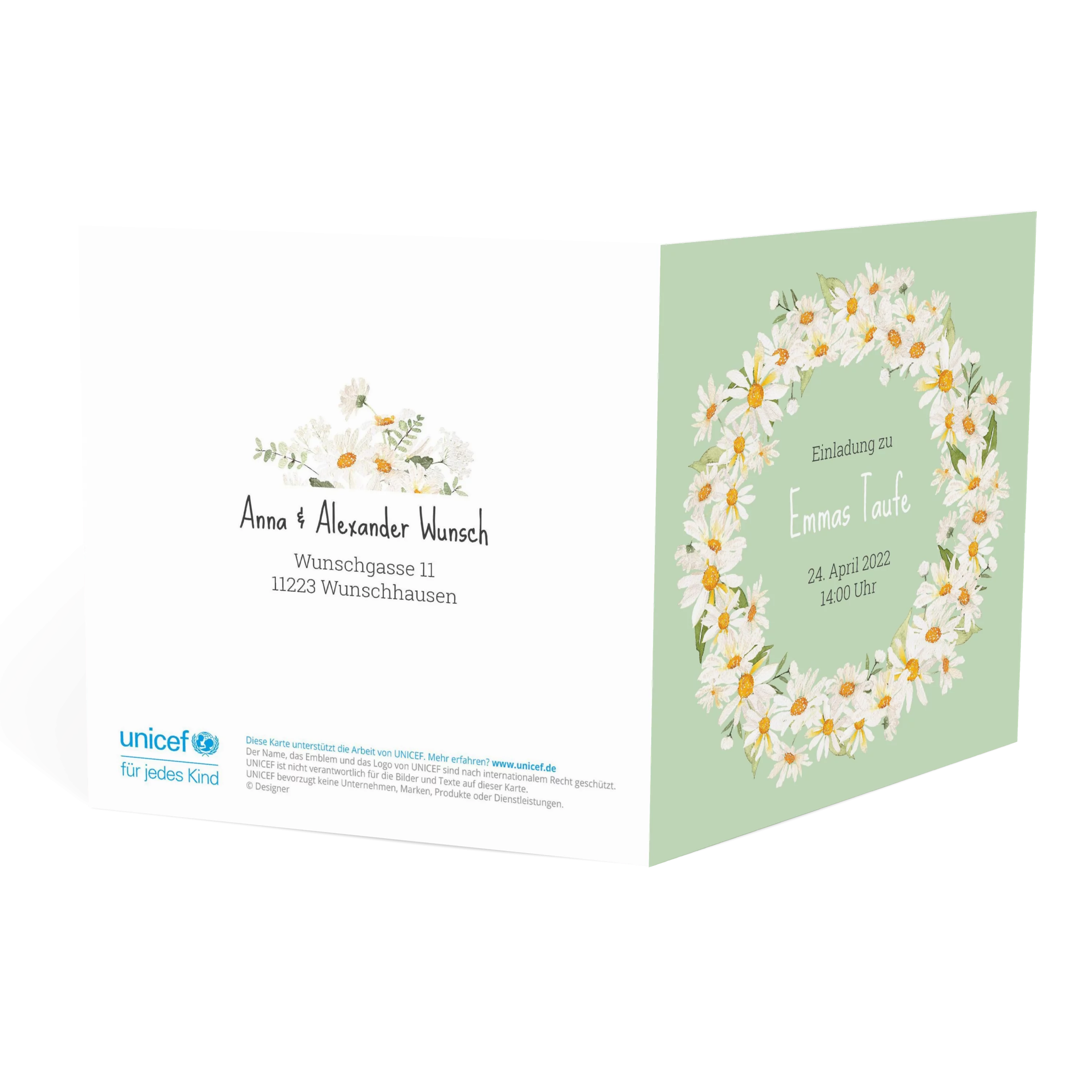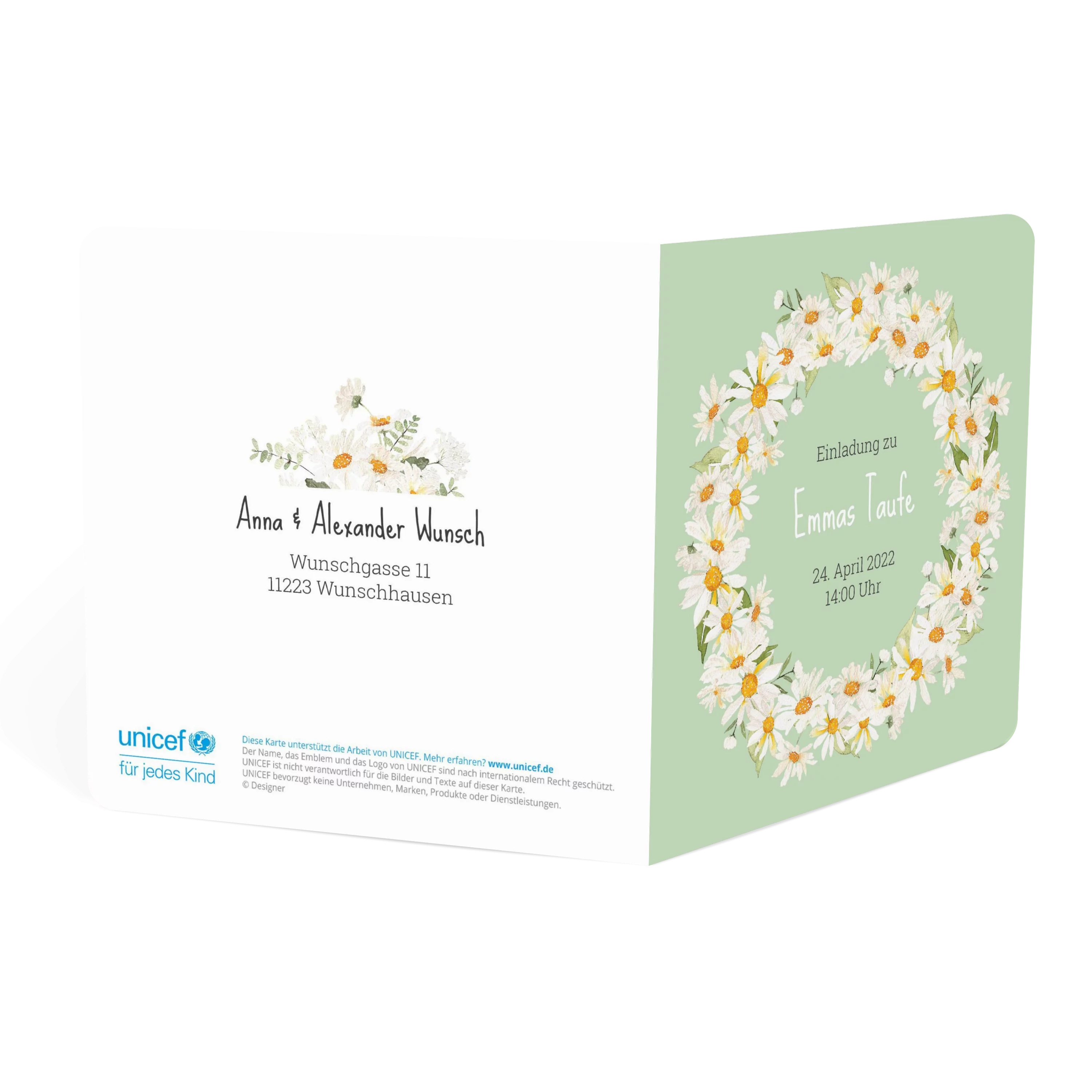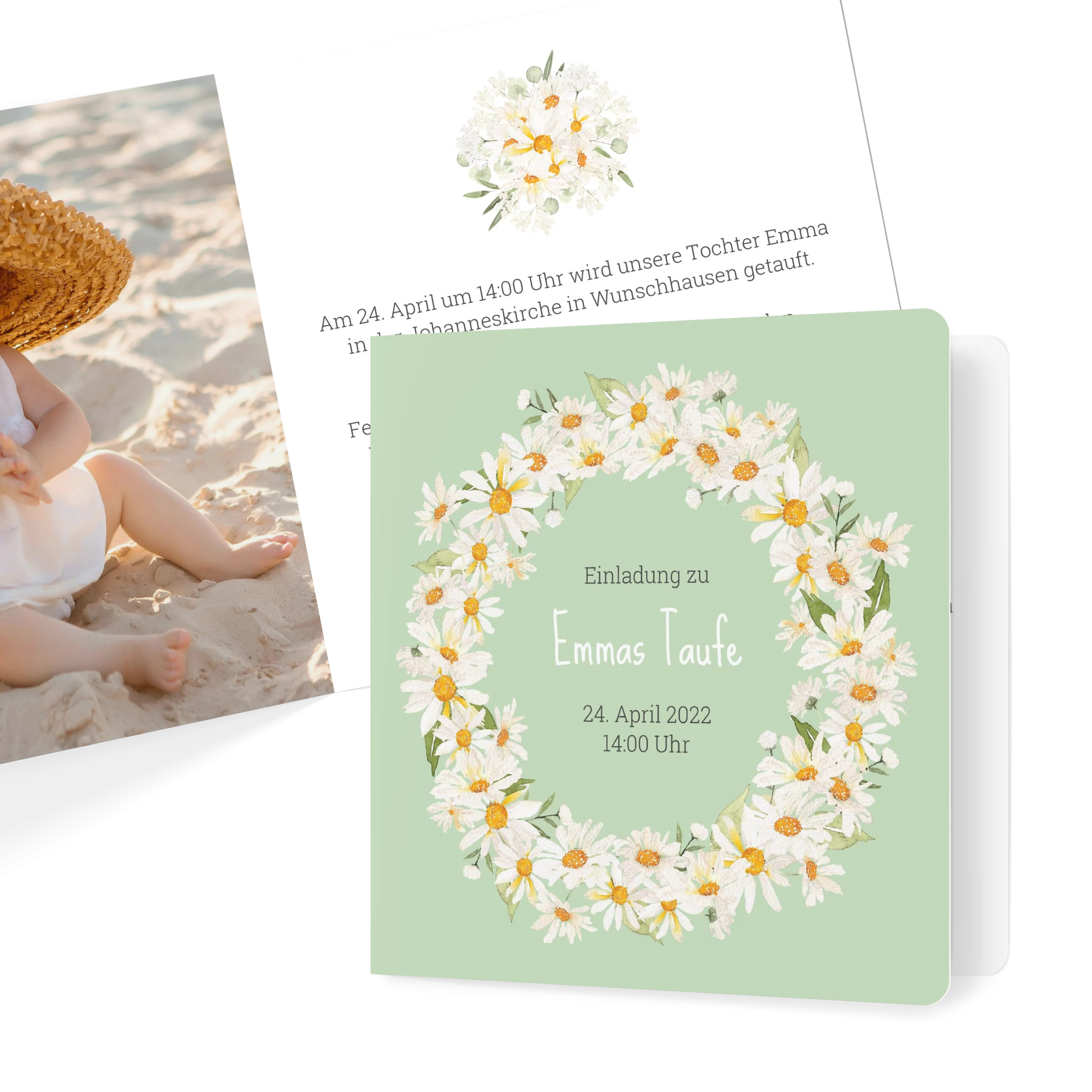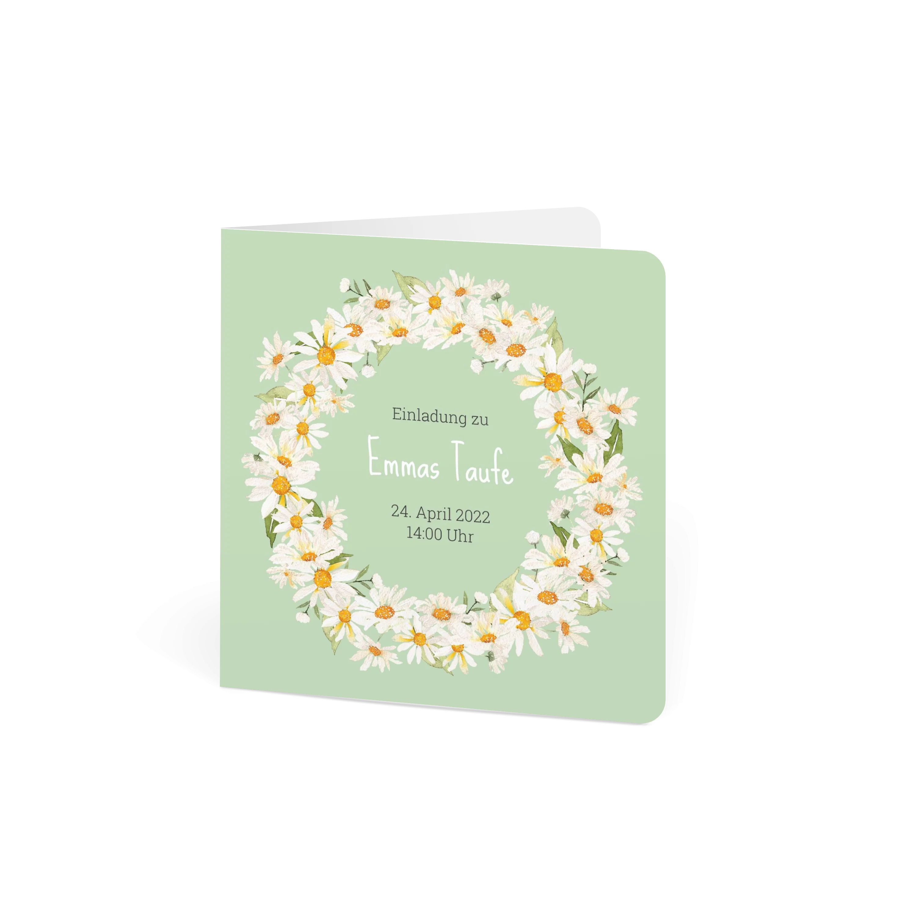 Ein Kranz aus weißen Gänseblümchen ziert das salbeigrüne Cover dieser Einladung. Die blumige Gestaltung bringt eine frische, freundliche Note in das festliche Design.