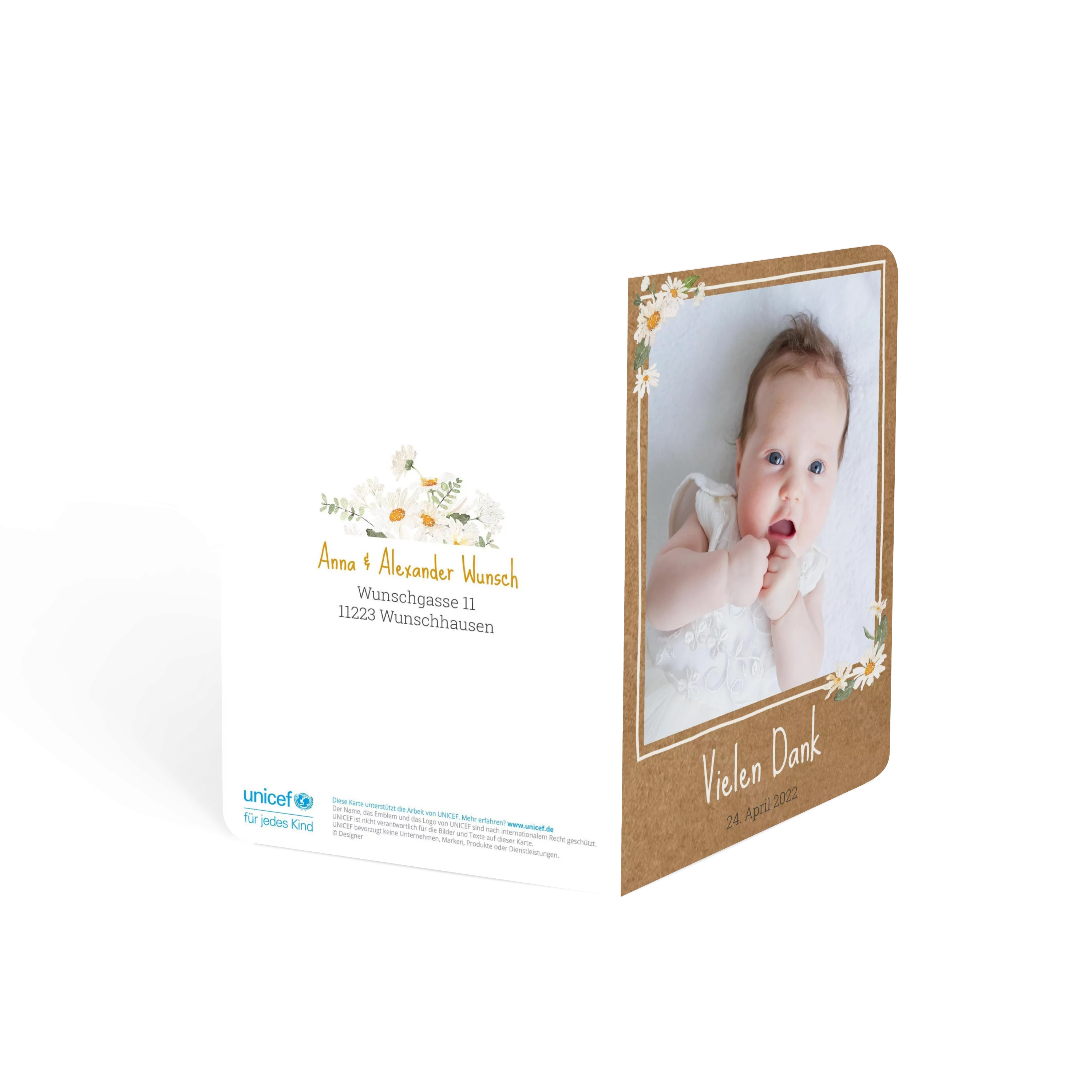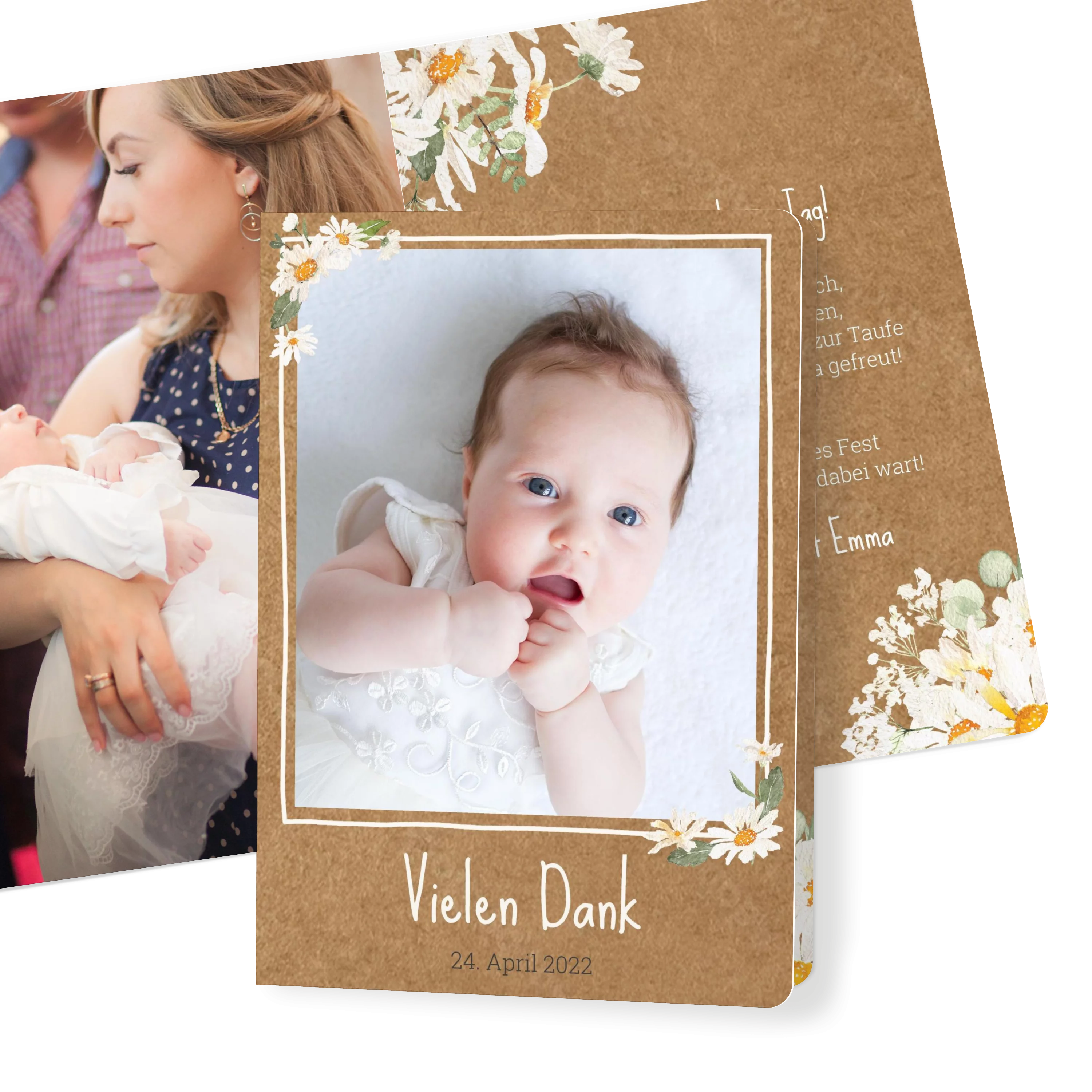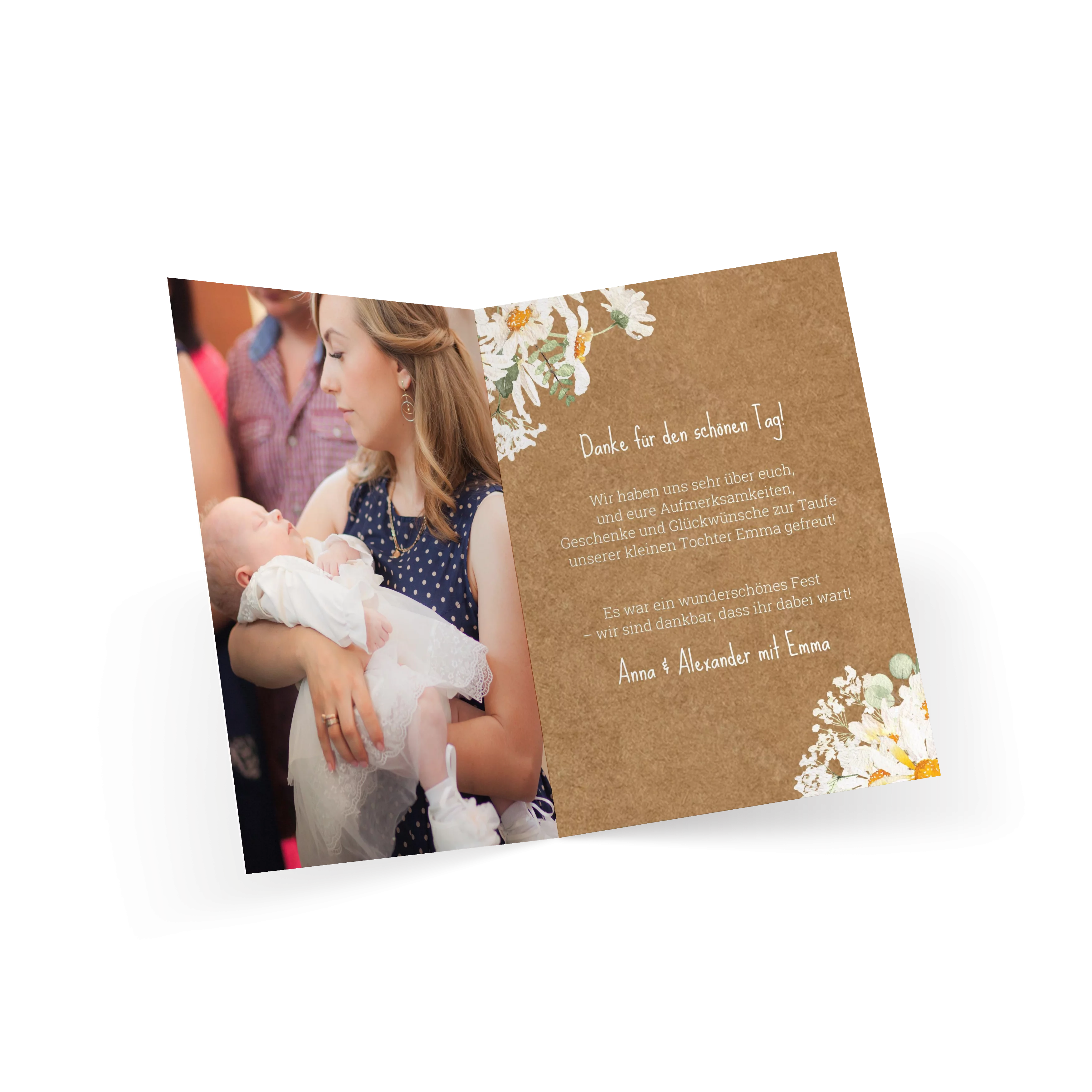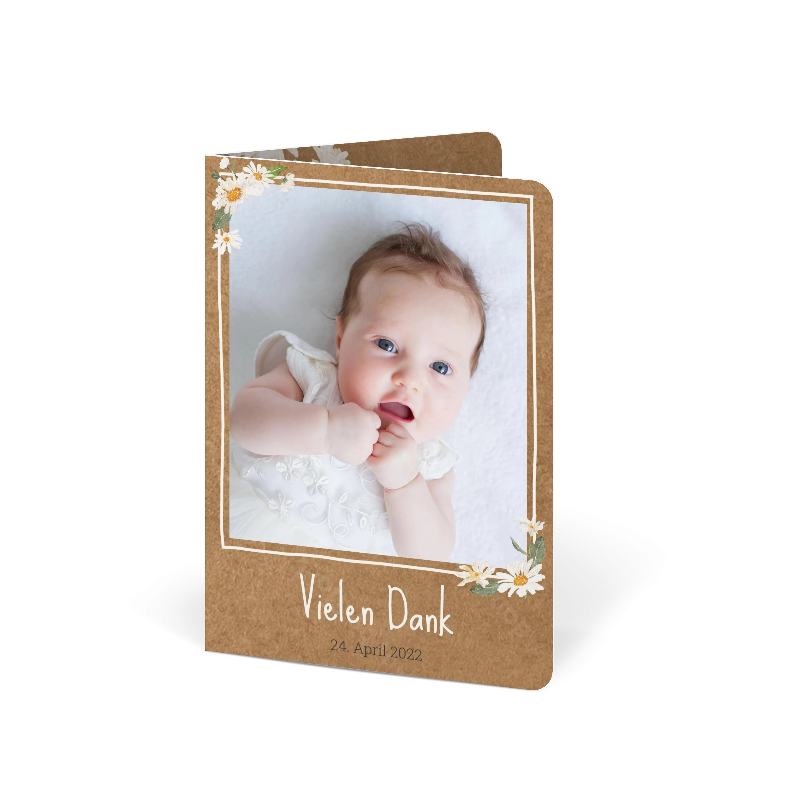 Die Kombination aus naturbraunem Hintergrund, verspieltem Blütenrahmen aus Gänseblümchen und schlichter weißer Typografie verleiht dieser Dankeskarte eine warme, natürliche Ausstrahlung. Besonders schön für persönliche Worte nach der Taufe.
