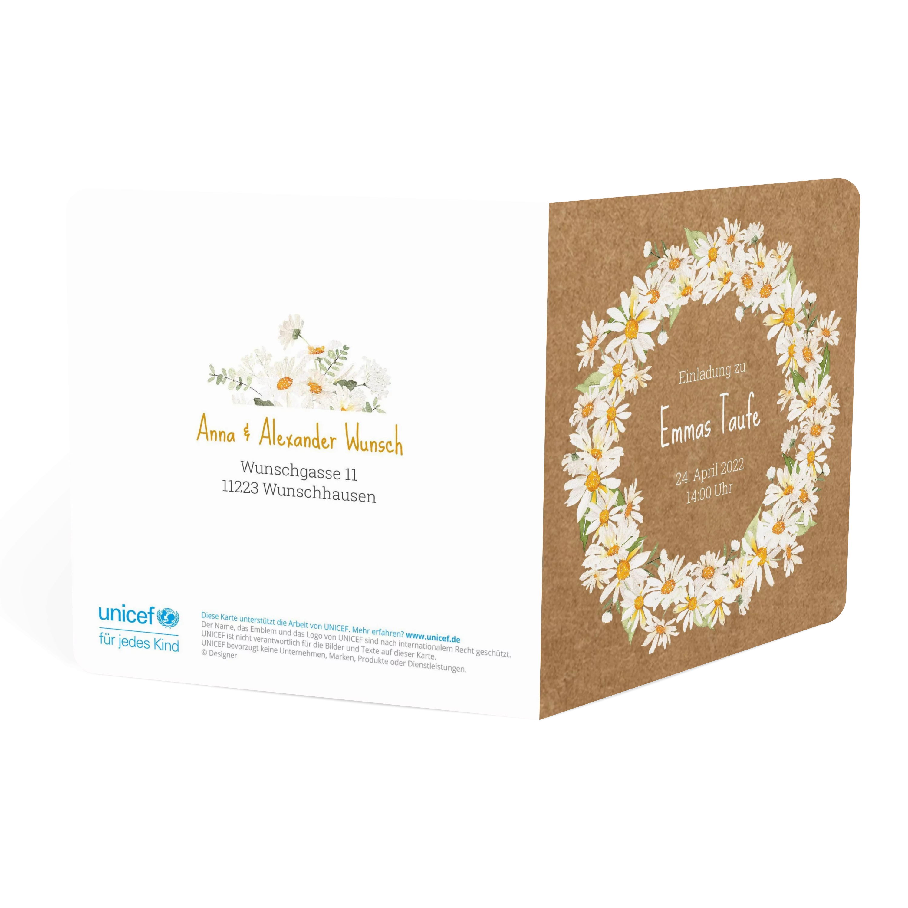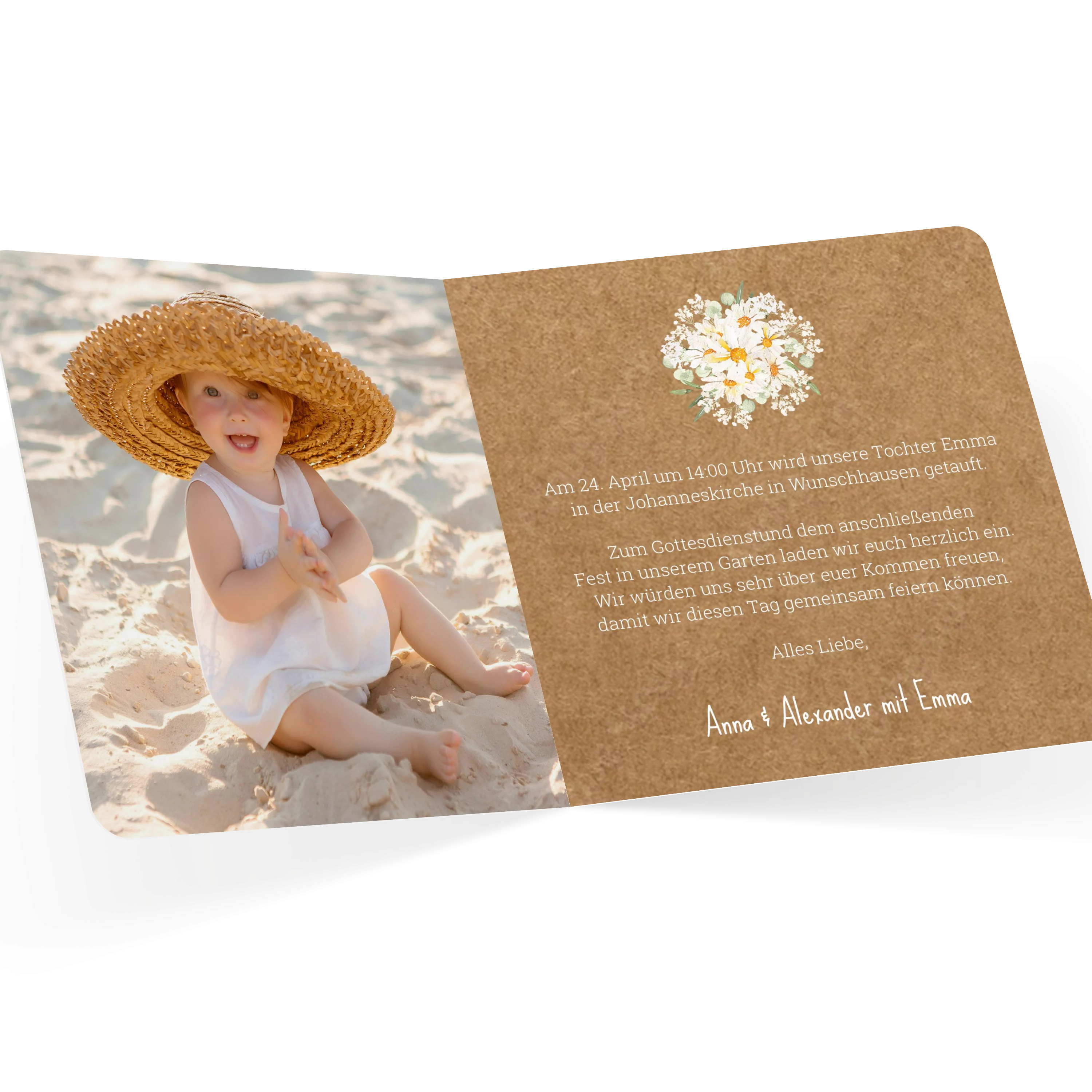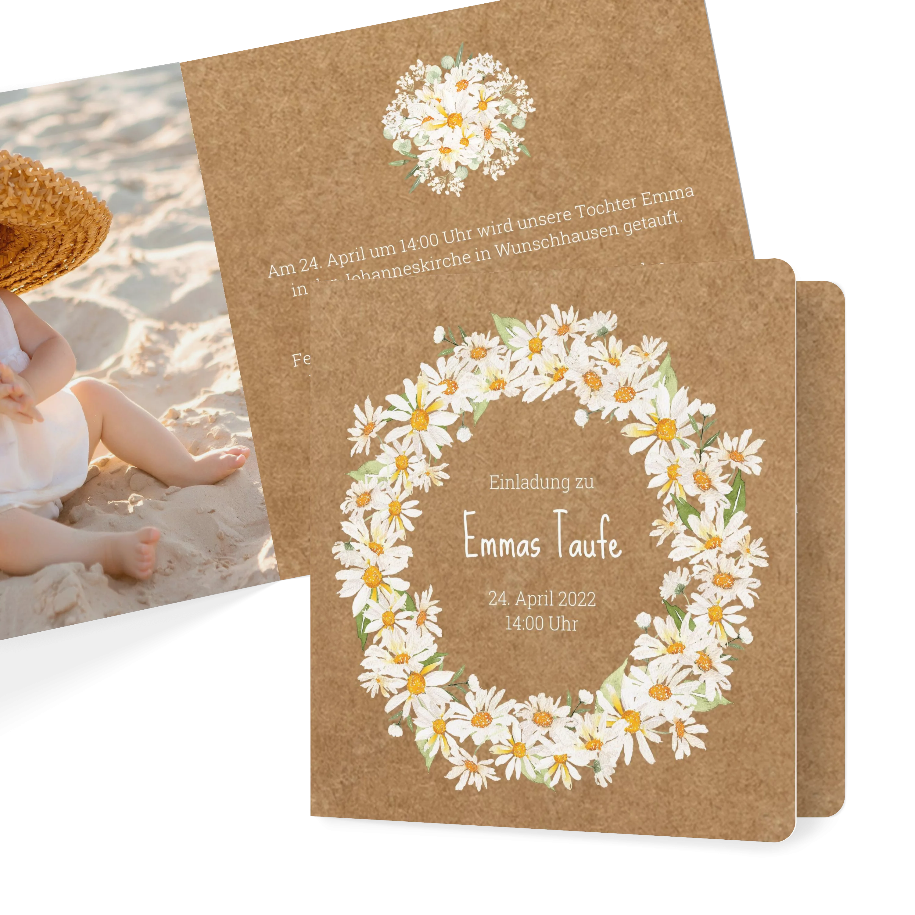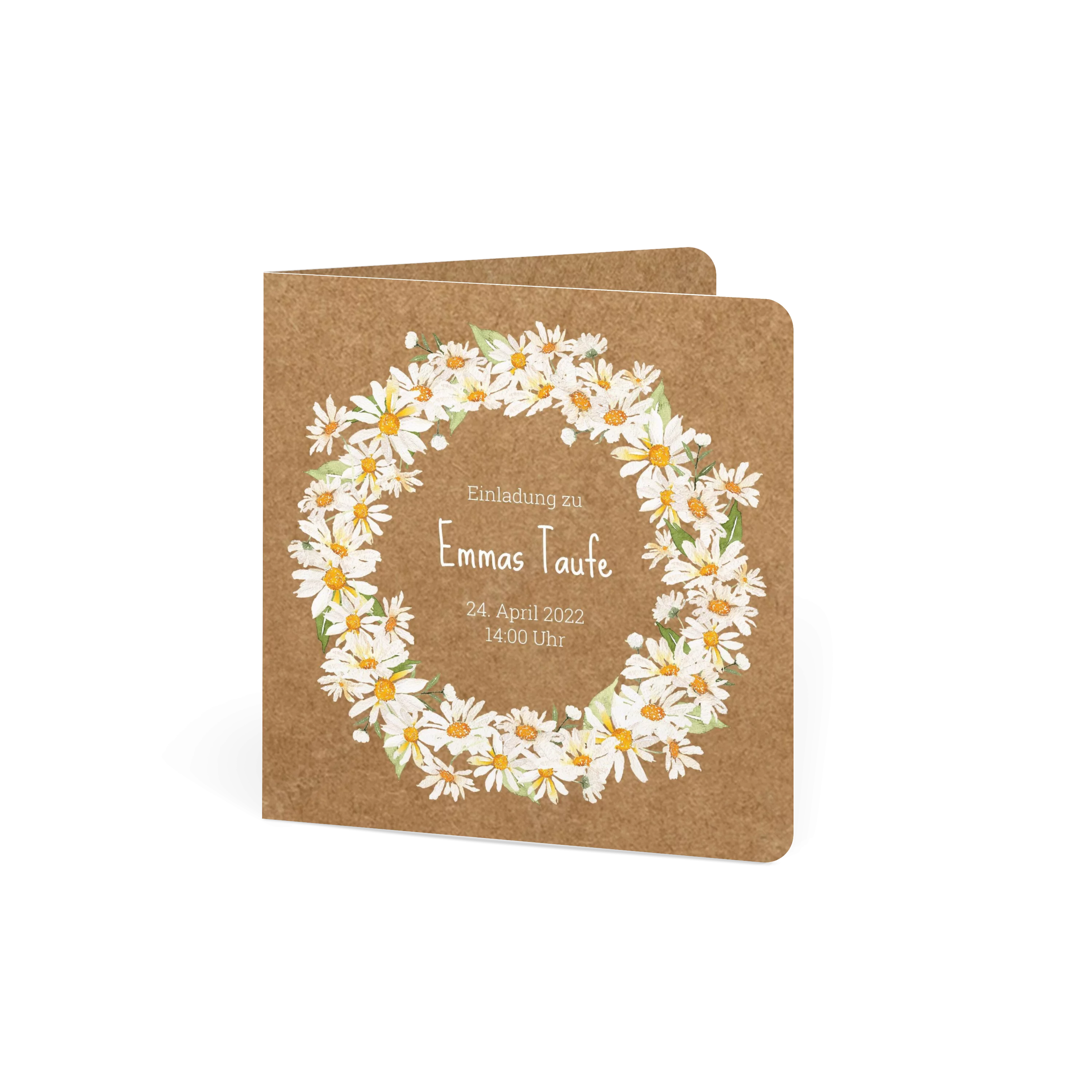 Zarte Gänseblümchen bilden einen liebevollen Kreis auf naturbraunem Hintergrund – eine einladende Gestaltung für die Taufe. Die weiße Schrift fügt sich harmonisch in das florale Layout ein und betont den natürlichen Stil der Karte.