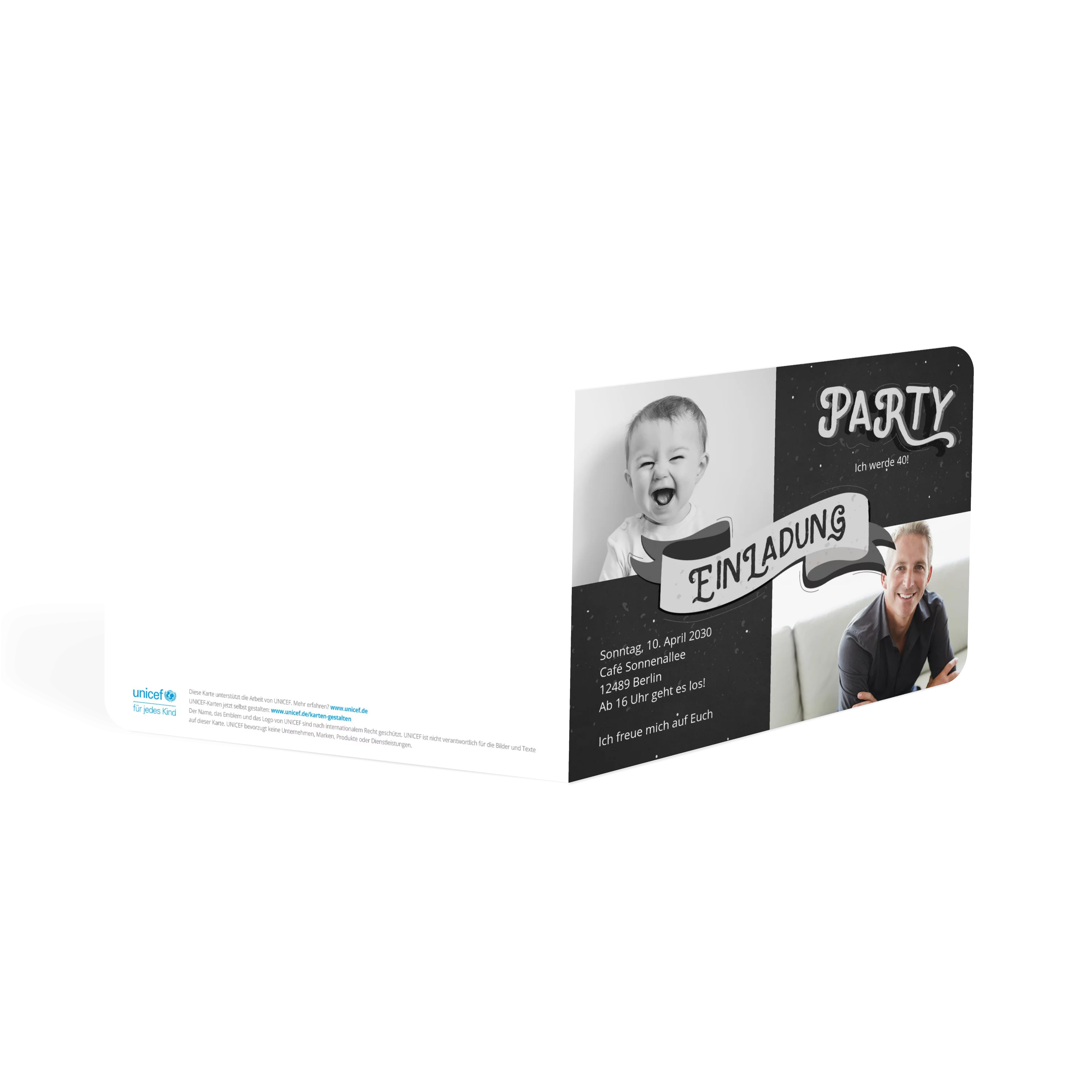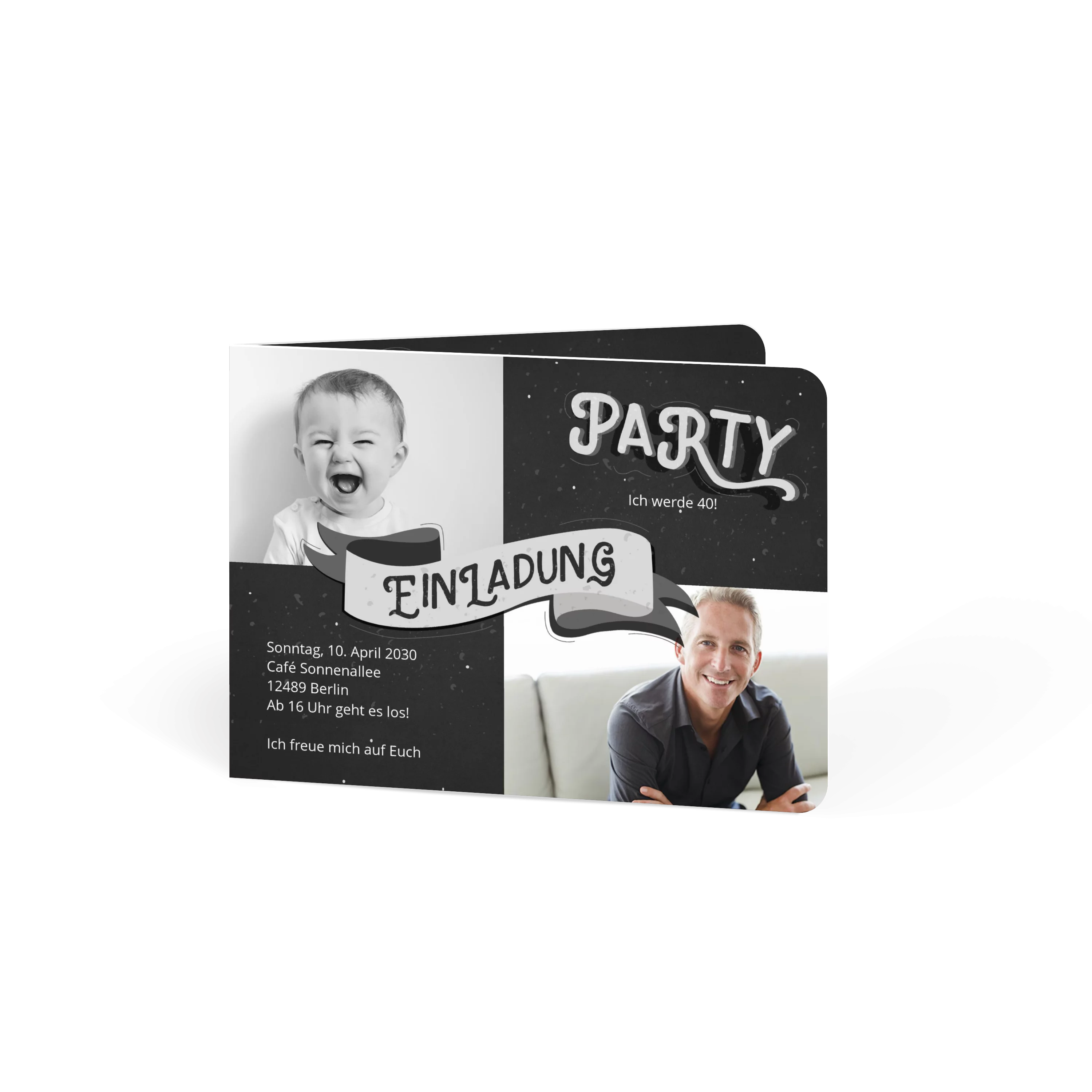 Diese Einladungskarte kombiniert zwei persönliche Fotos mit charmantem Retro-Look in Schwarz-Weiß. Verspielte Banner-Schriftzüge und Sternchen-Elemente setzen fröhliche Akzente – perfekt für einen humorvollen Start in die nächste Runde.