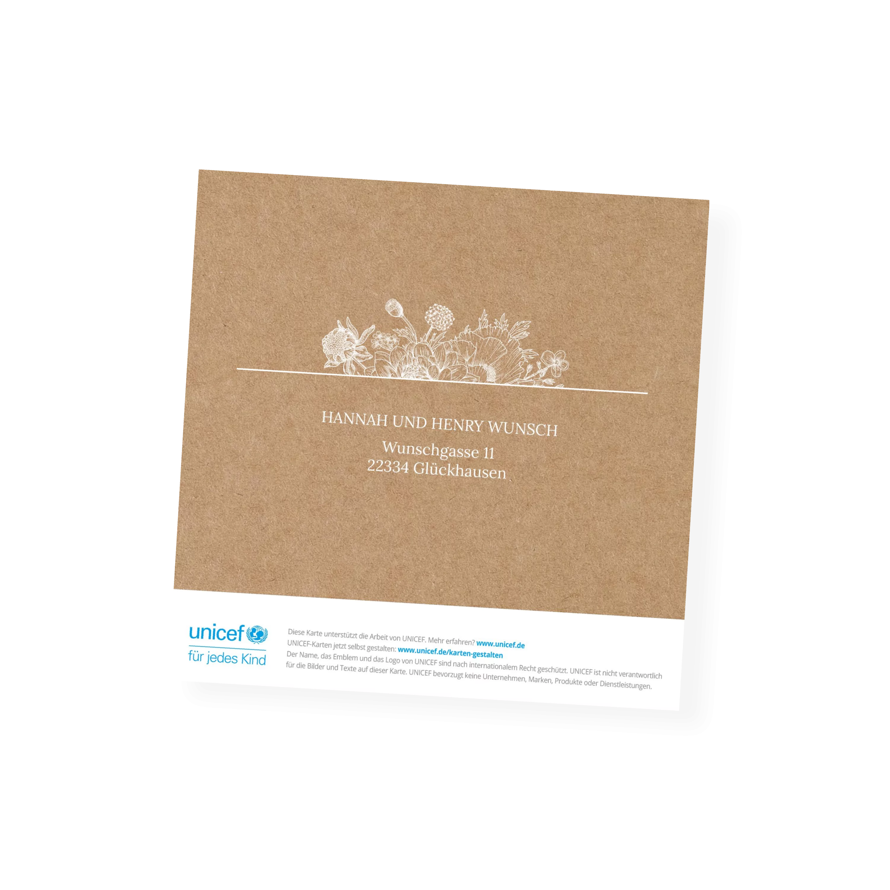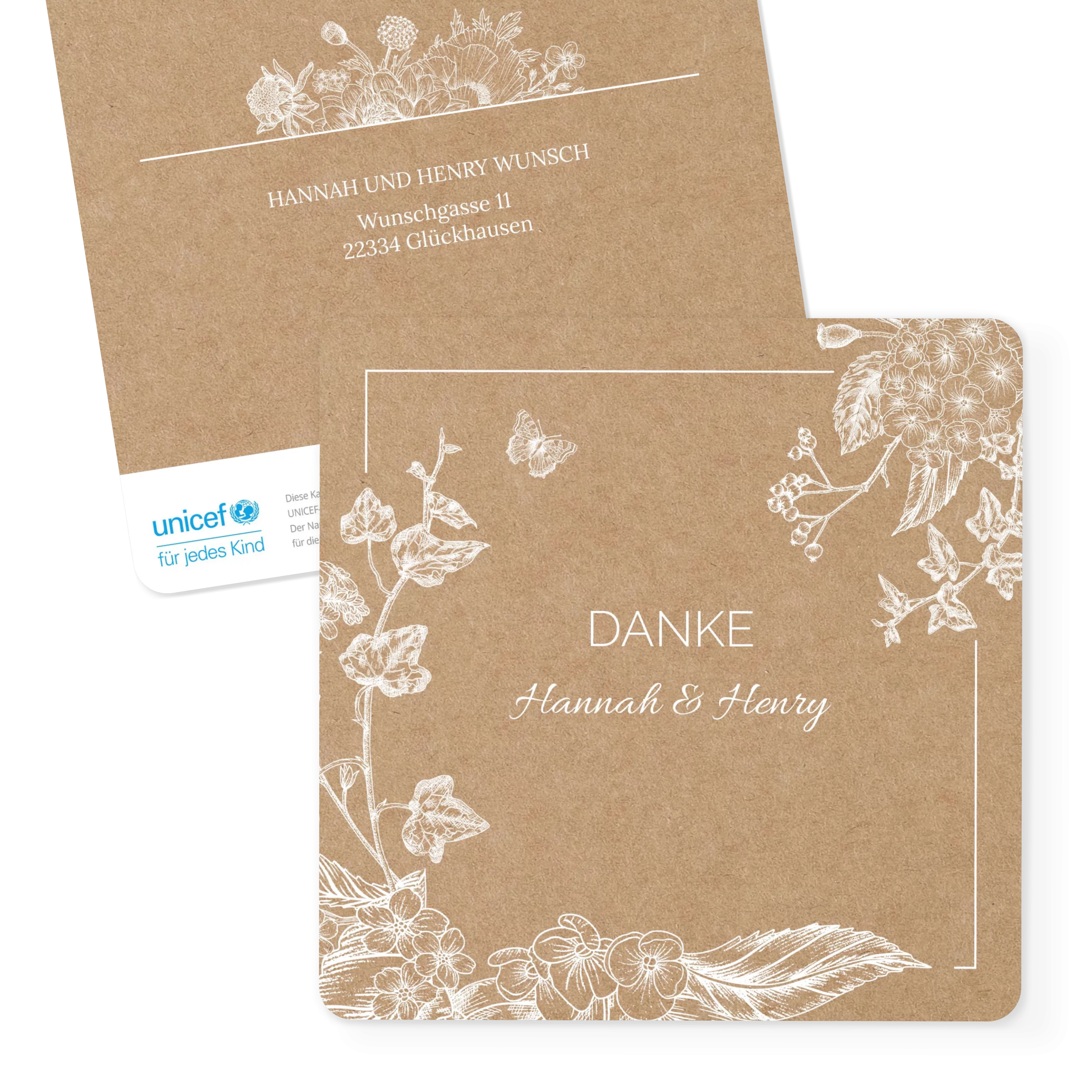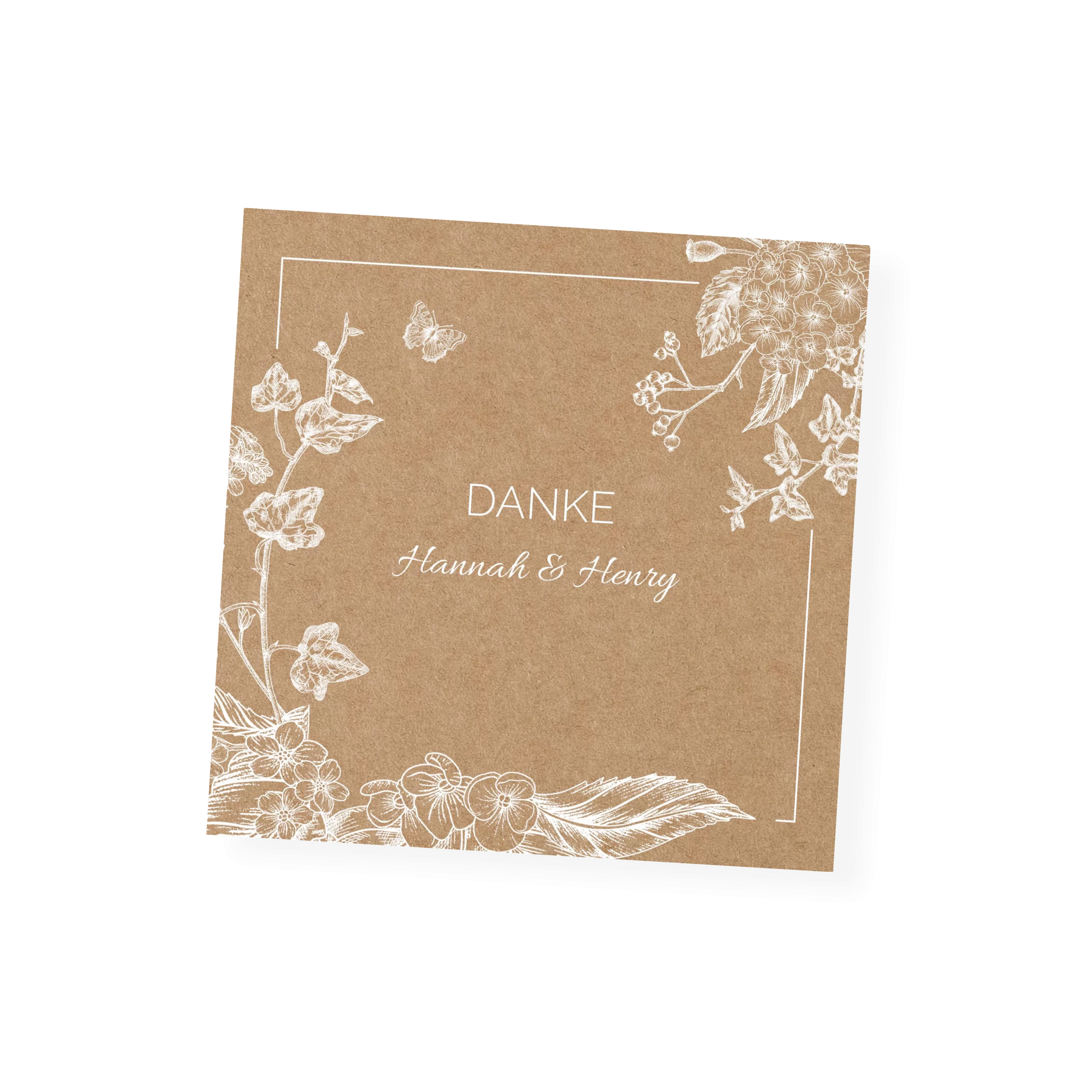 Zarte, weiße Blütenlinien treffen auf warmes Naturpapier – eine liebevolle Kombination für Ihren Dank nach einem unvergesslichen Fest. Die verspielten Illustrationen verleihen der Karte eine natürliche Leichtigkeit und setzen Ihren persönlichen Gruß stilvoll in Szene.