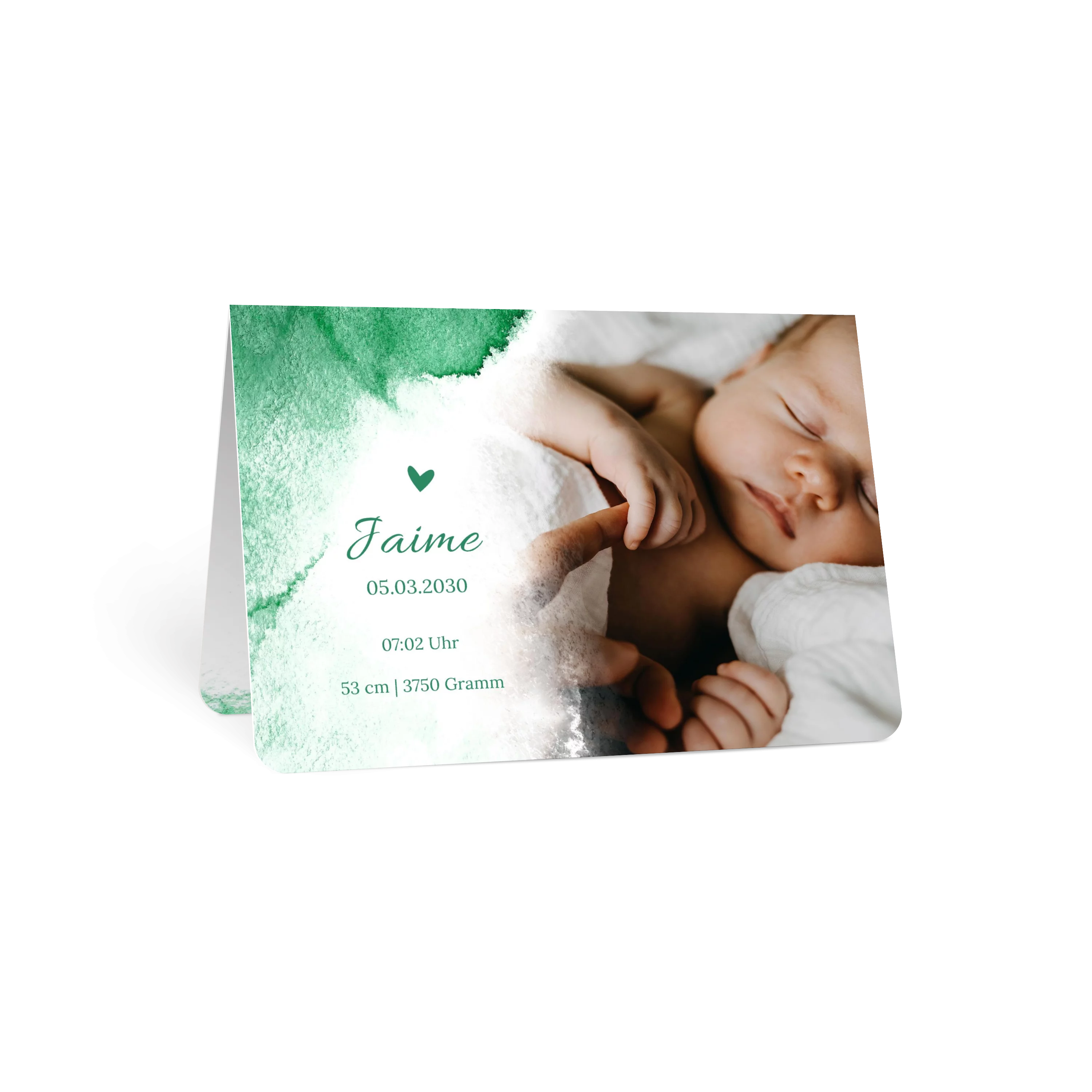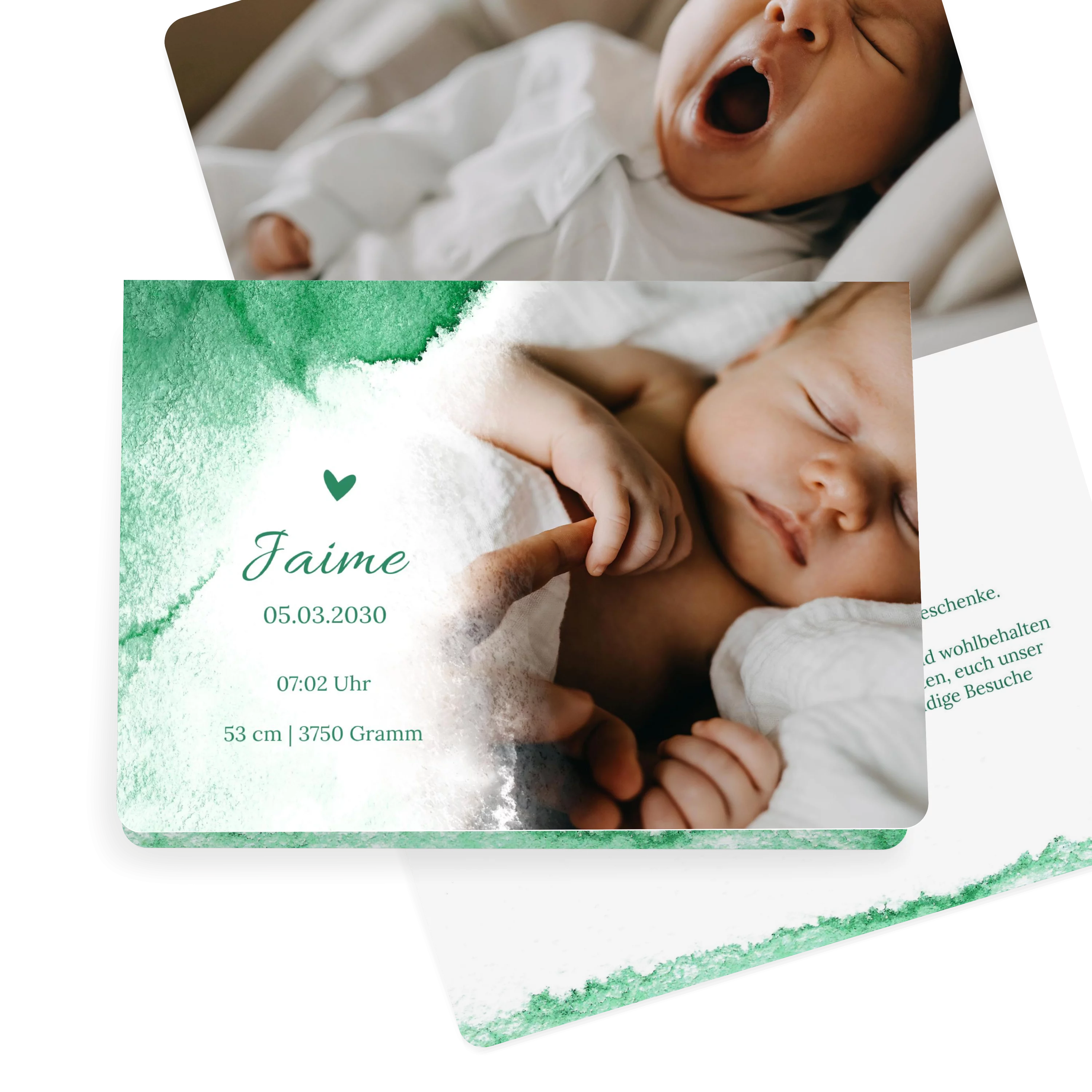 Die Kombination aus weichem Aquarellverlauf in kräftigem Grün oder blau, sowie einem innigen Babyfoto verleihen dieser Karte eine ruhige, moderne Ausstrahlung. Ideal, um Ihren kleinen Schatz auf liebevolle und stilvolle Weise willkommen zu heißen.