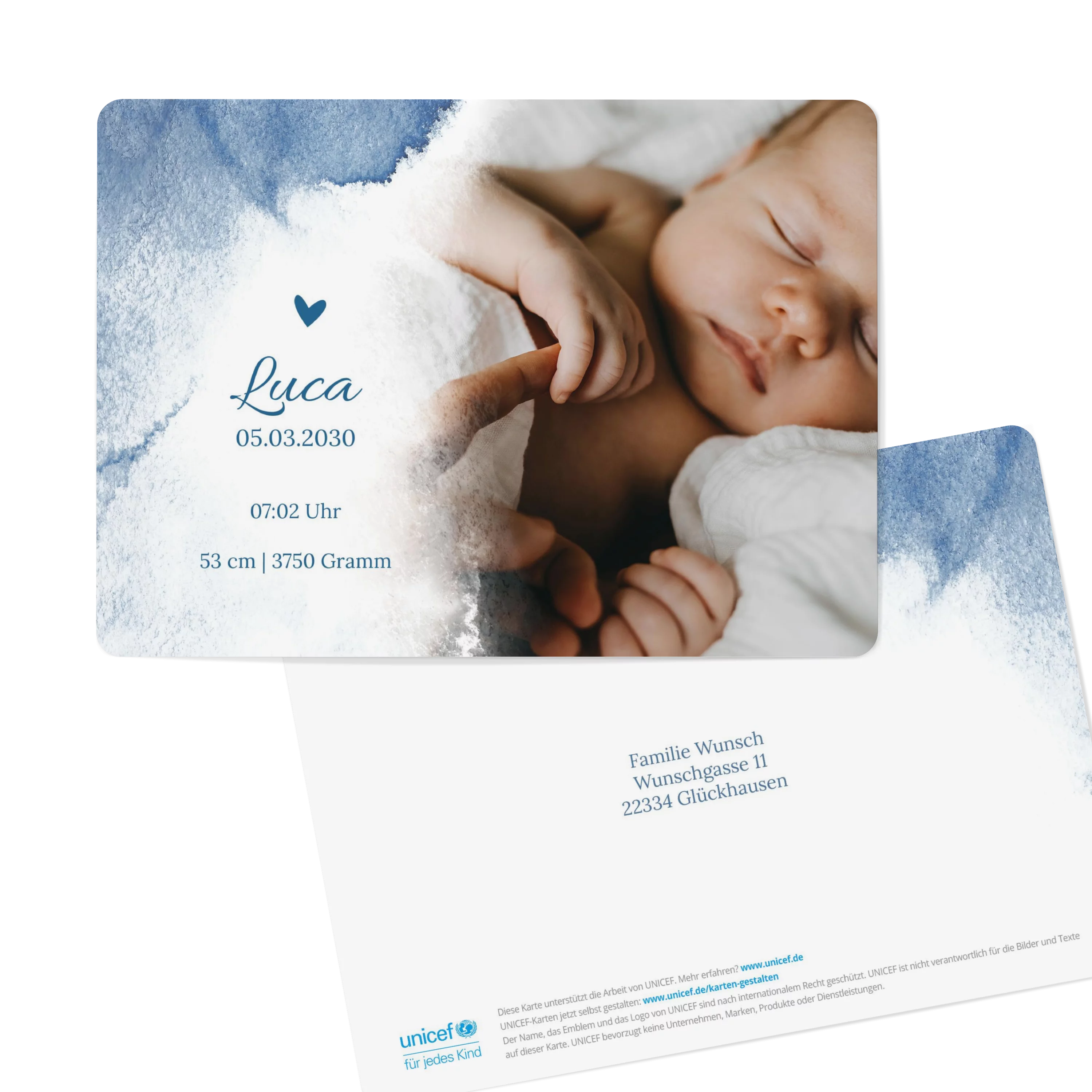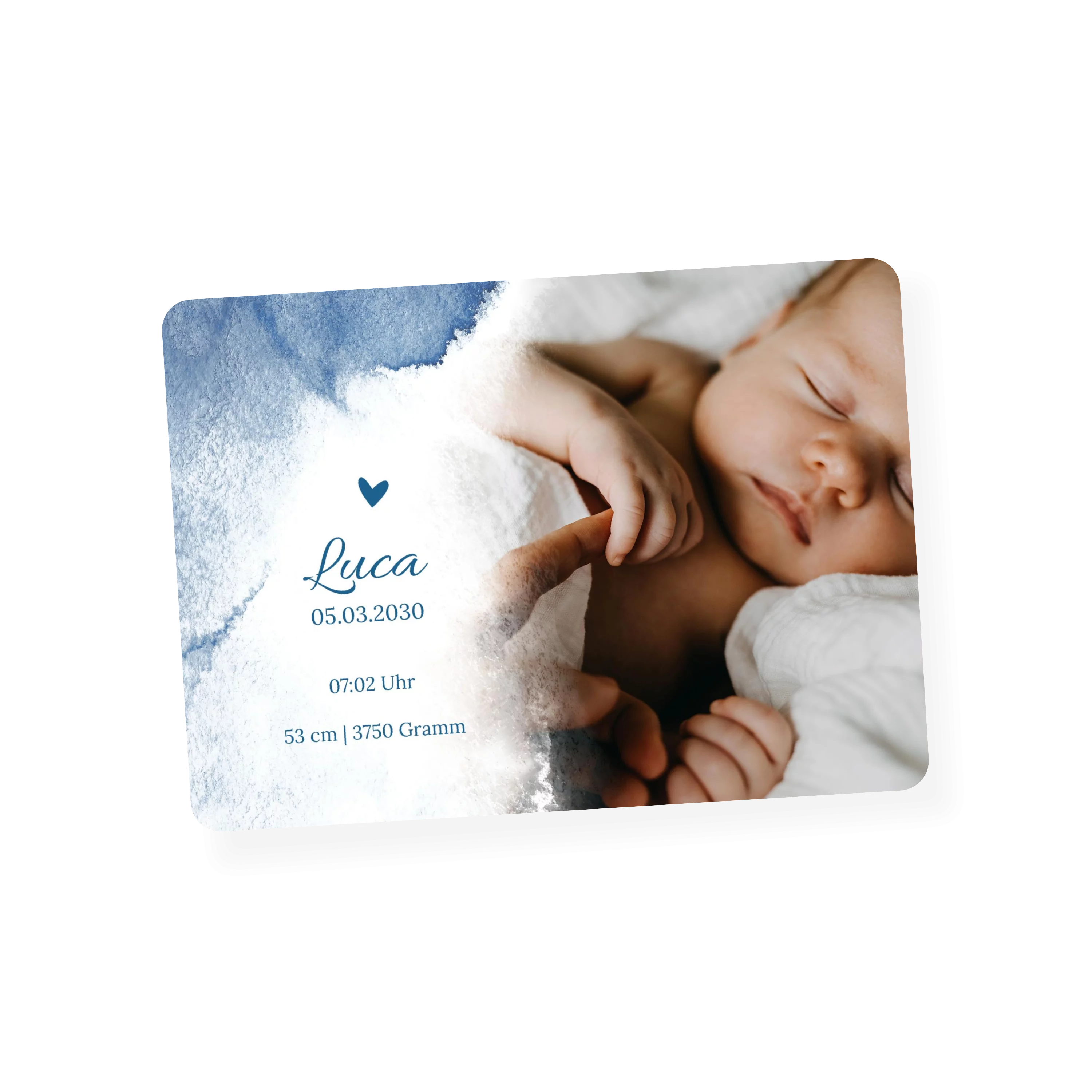 Die Kombination aus weichem Aquarellverlauf in kräftigem Grün oder blau, sowie einem innigen Babyfoto verleihen dieser Karte eine ruhige, moderne Ausstrahlung. Ideal, um Ihren kleinen Schatz auf liebevolle und stilvolle Weise willkommen zu heißen.