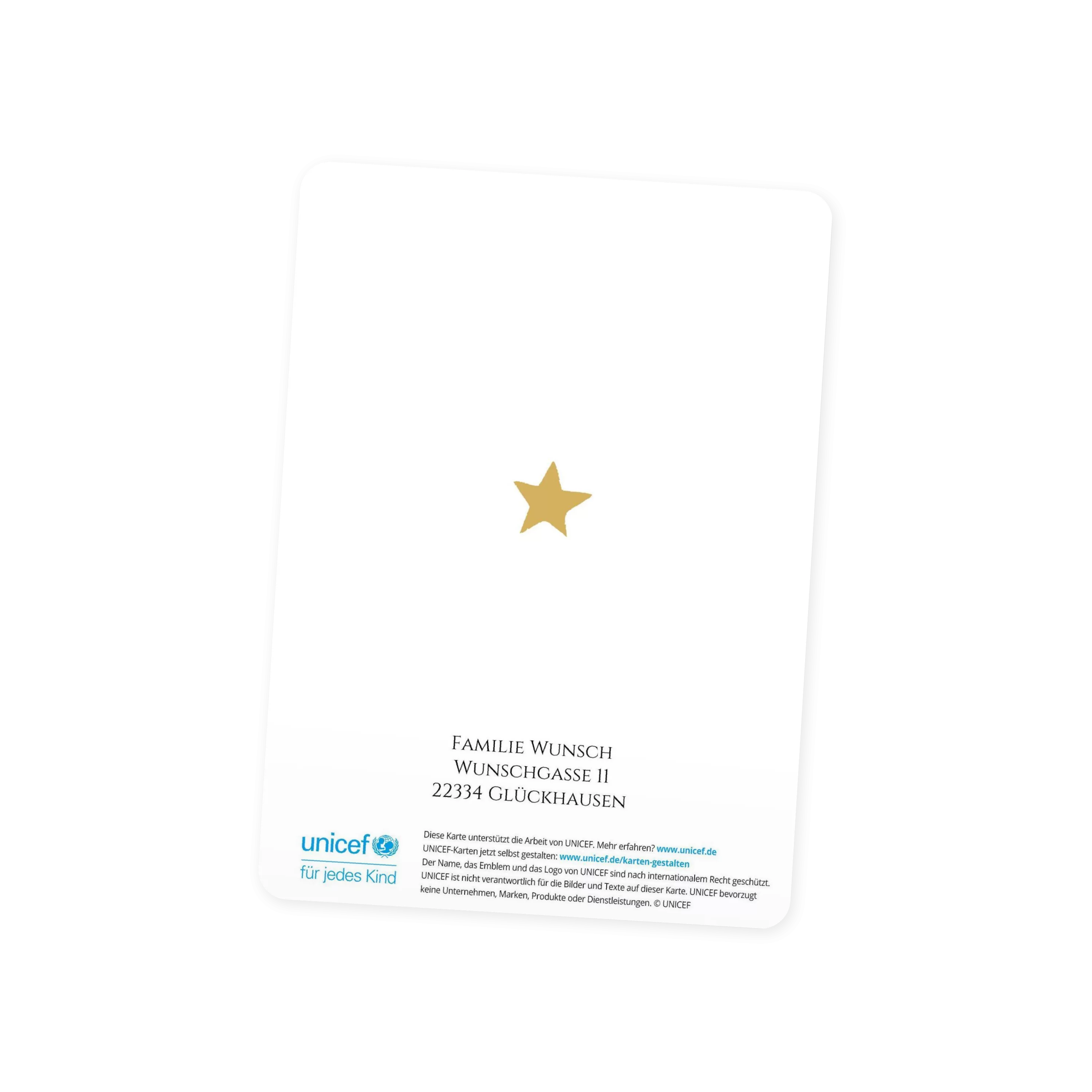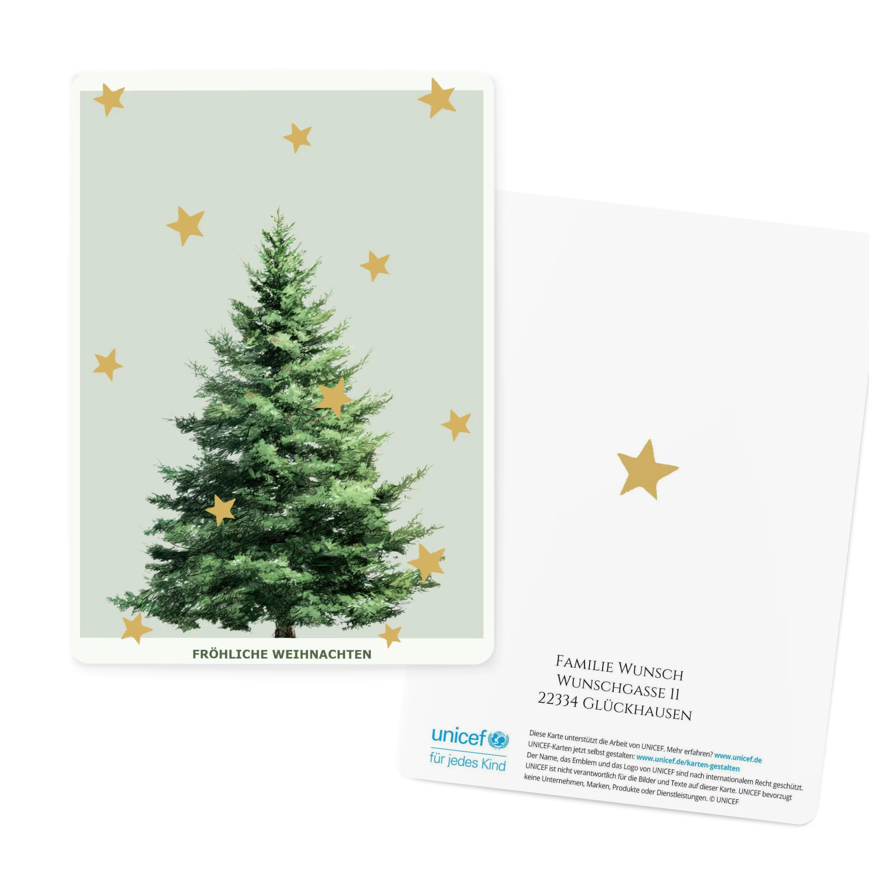 Das Motiv „Weihnachtsbaum mit Sternen“ von UNICEF zeigt eine illustrierte Tanne verziert mit goldenen Sternen in harmonischen Pastellfarben. Klappkarte 11,8 × 16,6 cm, auch erhältlich als flache Karte oder Doppelklappkarte. Gestalten Sie Ihre Karten zu Weihnachten mit eigenen Fotos im Innenteil und persönlichen Weihnachtsgrüßen.