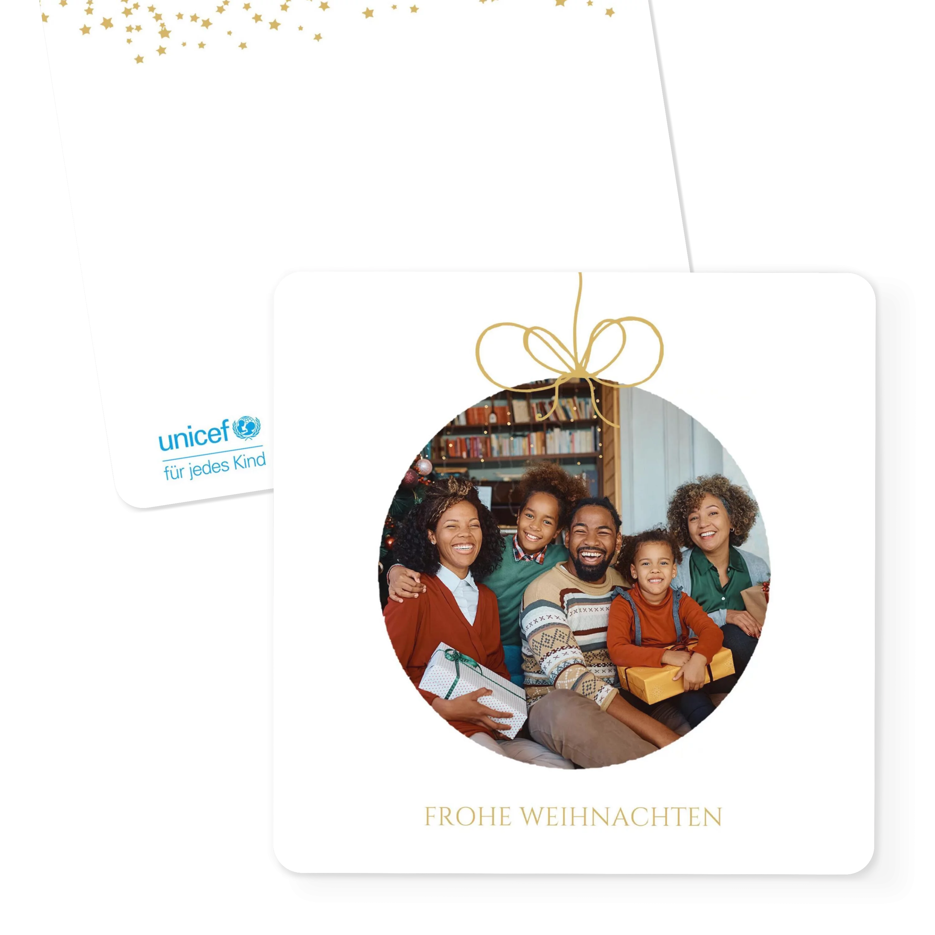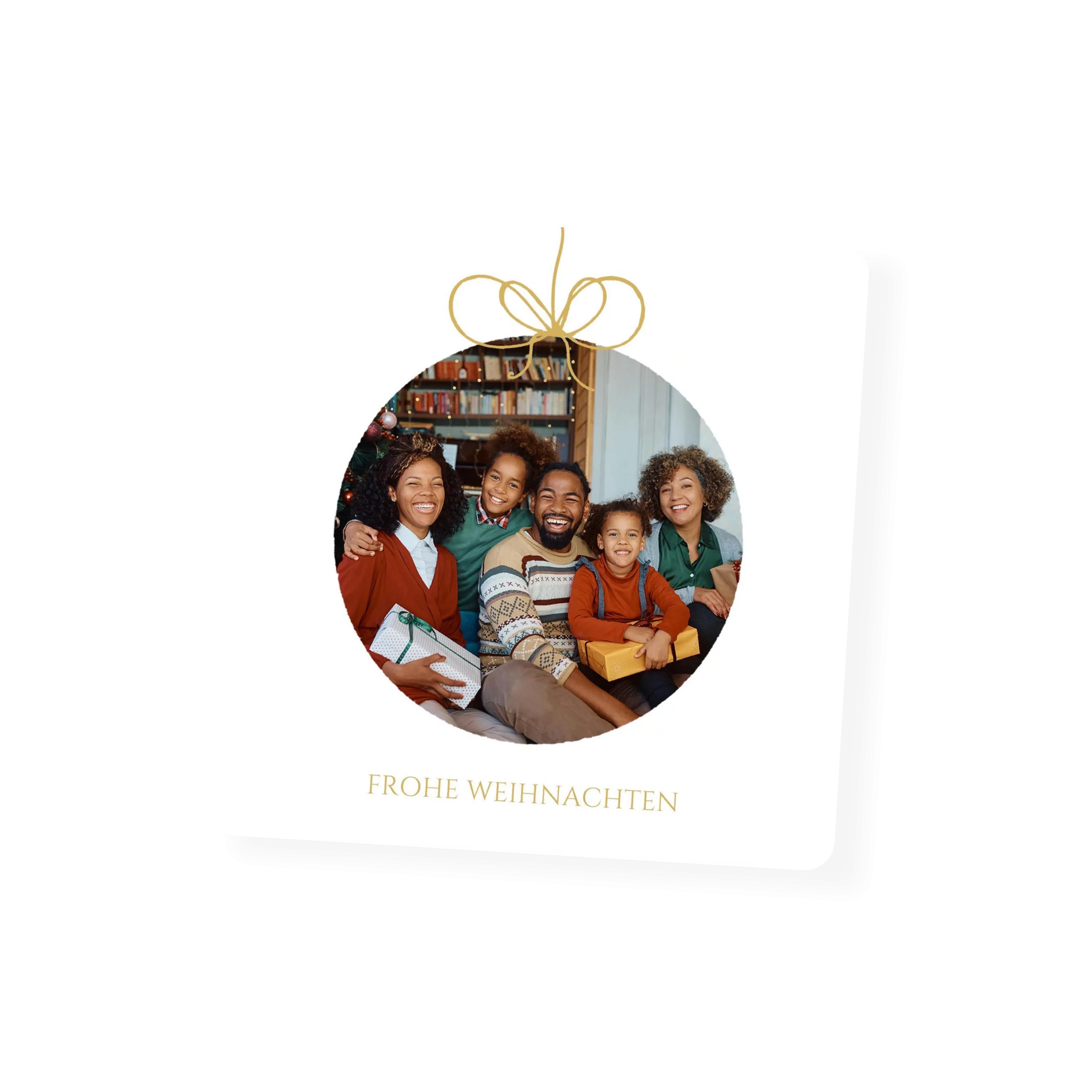 Weihnachtskarten gestalten mit dem Motiv „Weihnachtsbaumkugel“: Ihr Lieblingsfoto in Form einer Christbaumkugel, abgerundet mit einer goldenen Schleife und stilvolle Blockbuchstaben. Klappkarte 14 x 14 cm, auch erhältlich als flache Karte oder Doppelklappkarte. Gestalten Sie Ihre Karten zu Weihnachten mit eigenen Fotos und persönlichem Text.