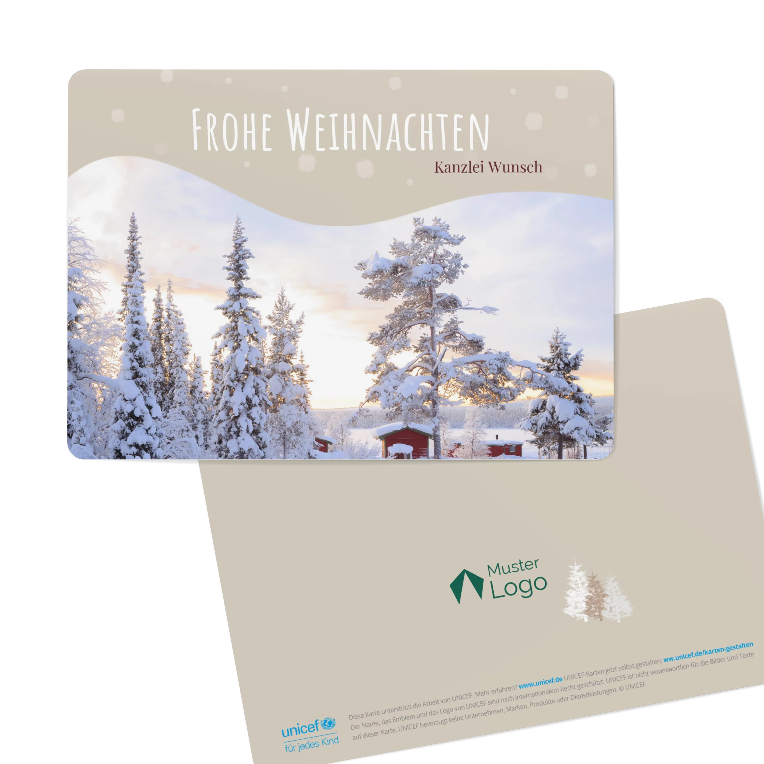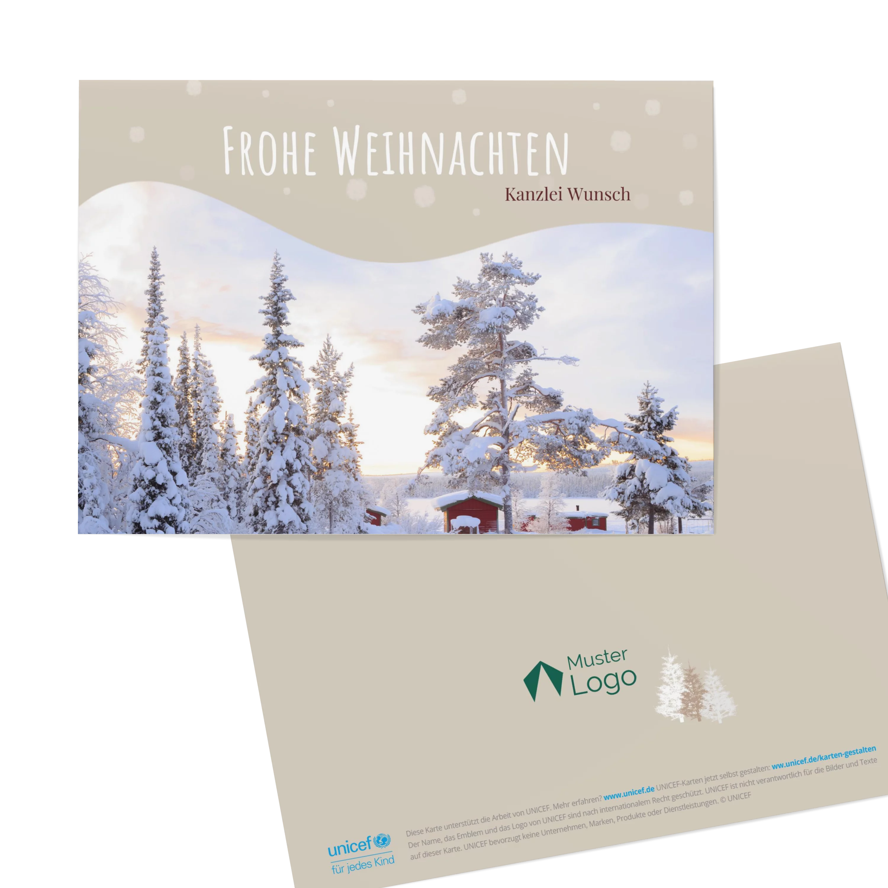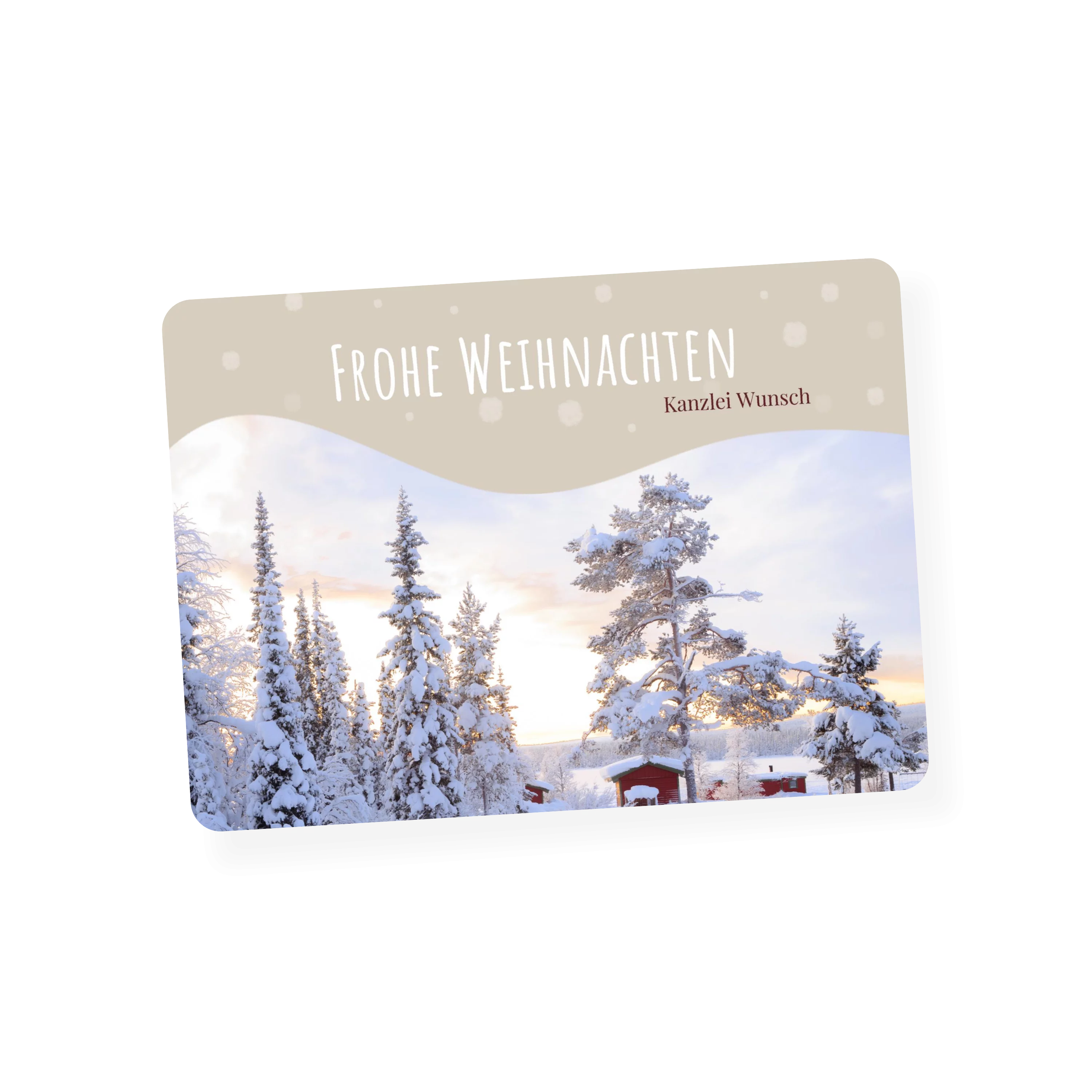 Wunderschönes Winterfoto von eingeschneite Tannen bietet den perfekten Rahmen für Ihre Weihnachtswünsche an Kunden und Mitarbeiter.