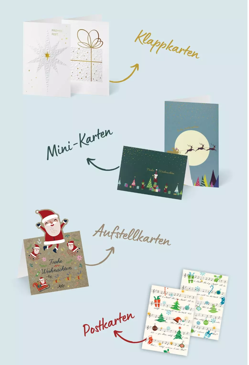 Große Freude beim Empfänger bereiten auch unsere Weihnachtspostkarten mit modernen und verspielten Designs.