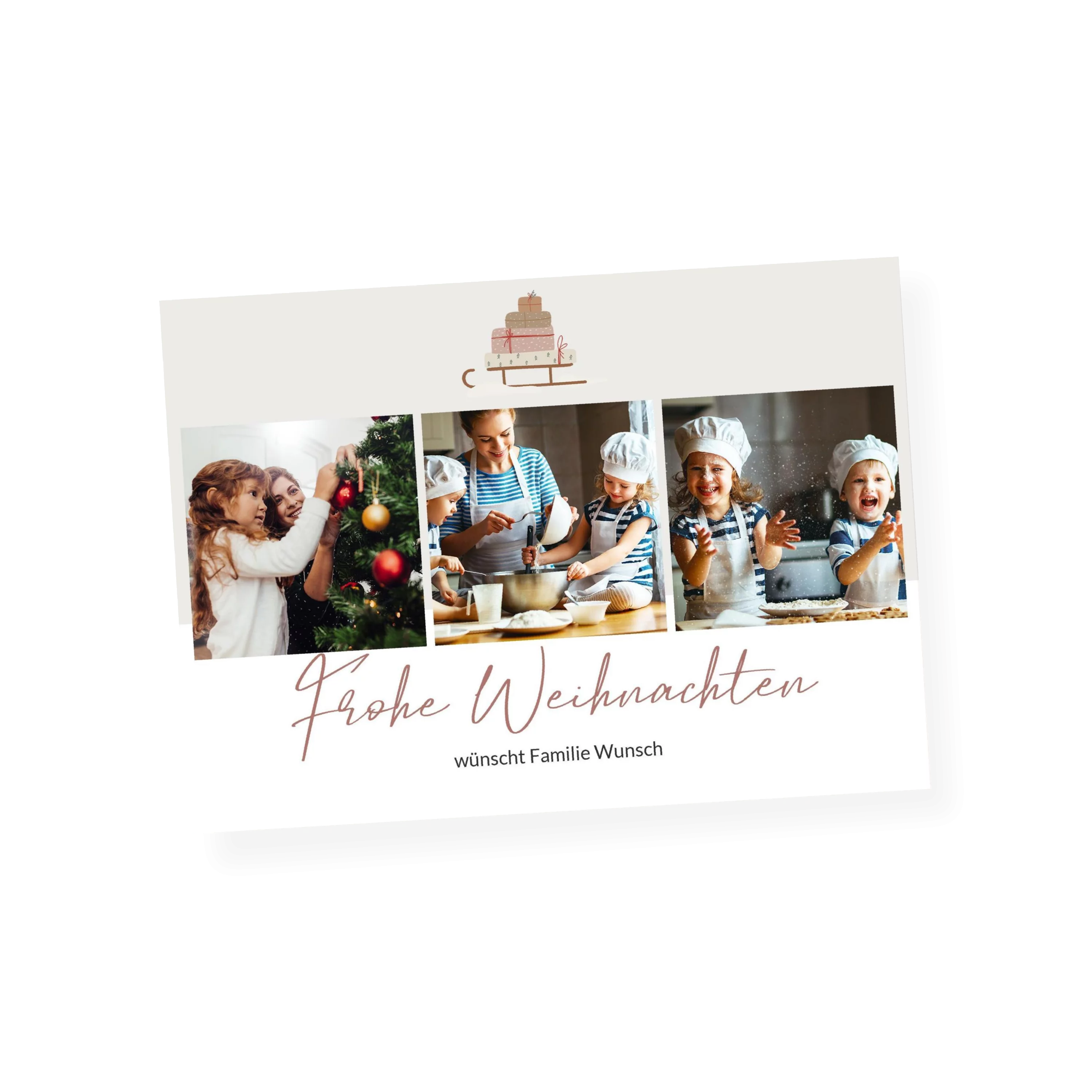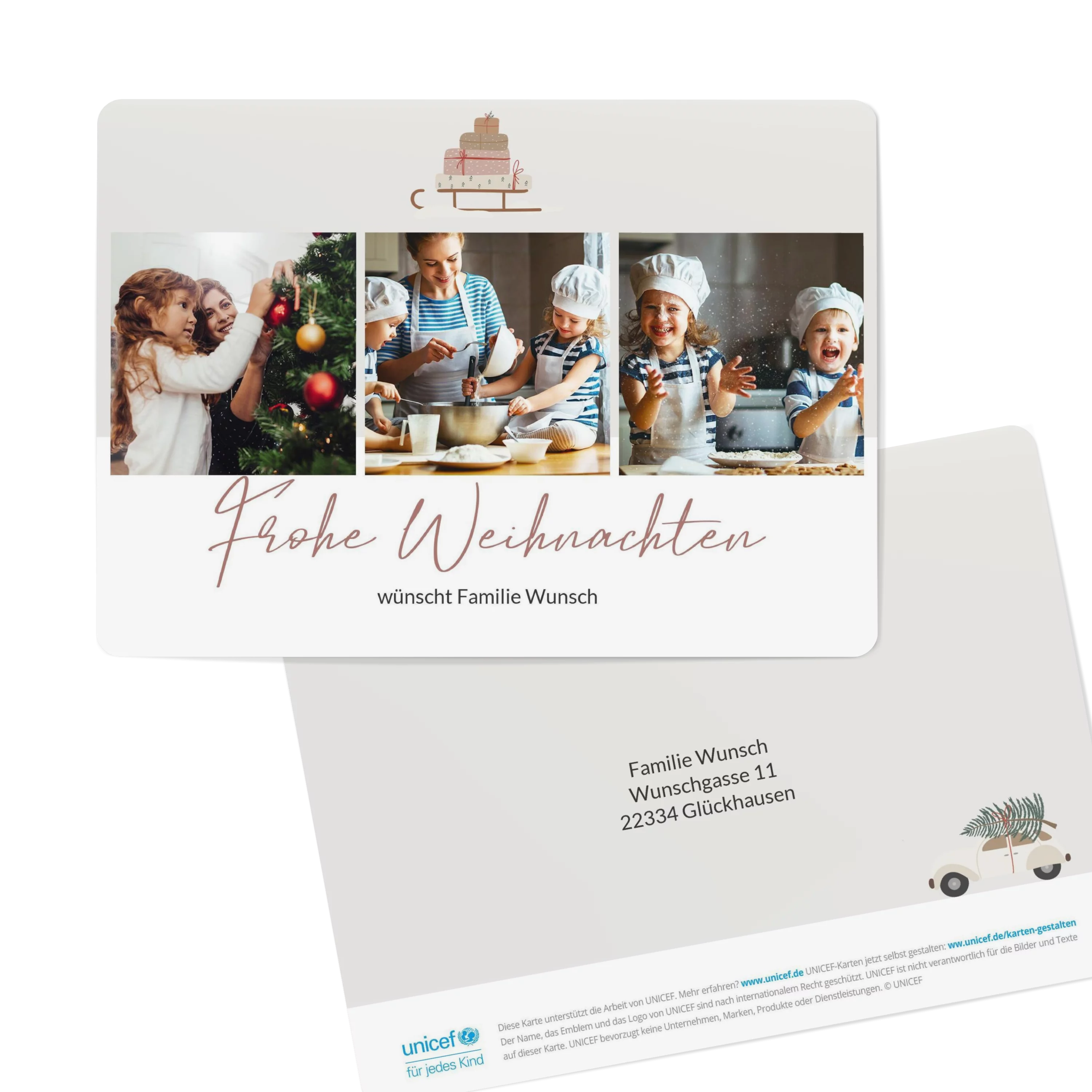 Weihnachtskarten gestalten: Das Motiv „Weihnachtsschlitten“ bietet Platz für drei Familienfotos auf der Kartenvorderseite, dekoriert von einer zarten Schlitten-Illustration. Weihnachtskarte mit Foto im Format 16,6 x 11,8 cm, auch erhältlich als flache Karte. Gestalten Sie Ihre Karten zu Weihnachten mit eigenen Fotos und persönlichem Text. Wir nutzen Papier aus nachhaltiger Forstwirtschaft und eine plastikfreie Verpackung. Mit dem Kauf von UNICEF Weihnachtskarten helfen Sie Kindern in Not.