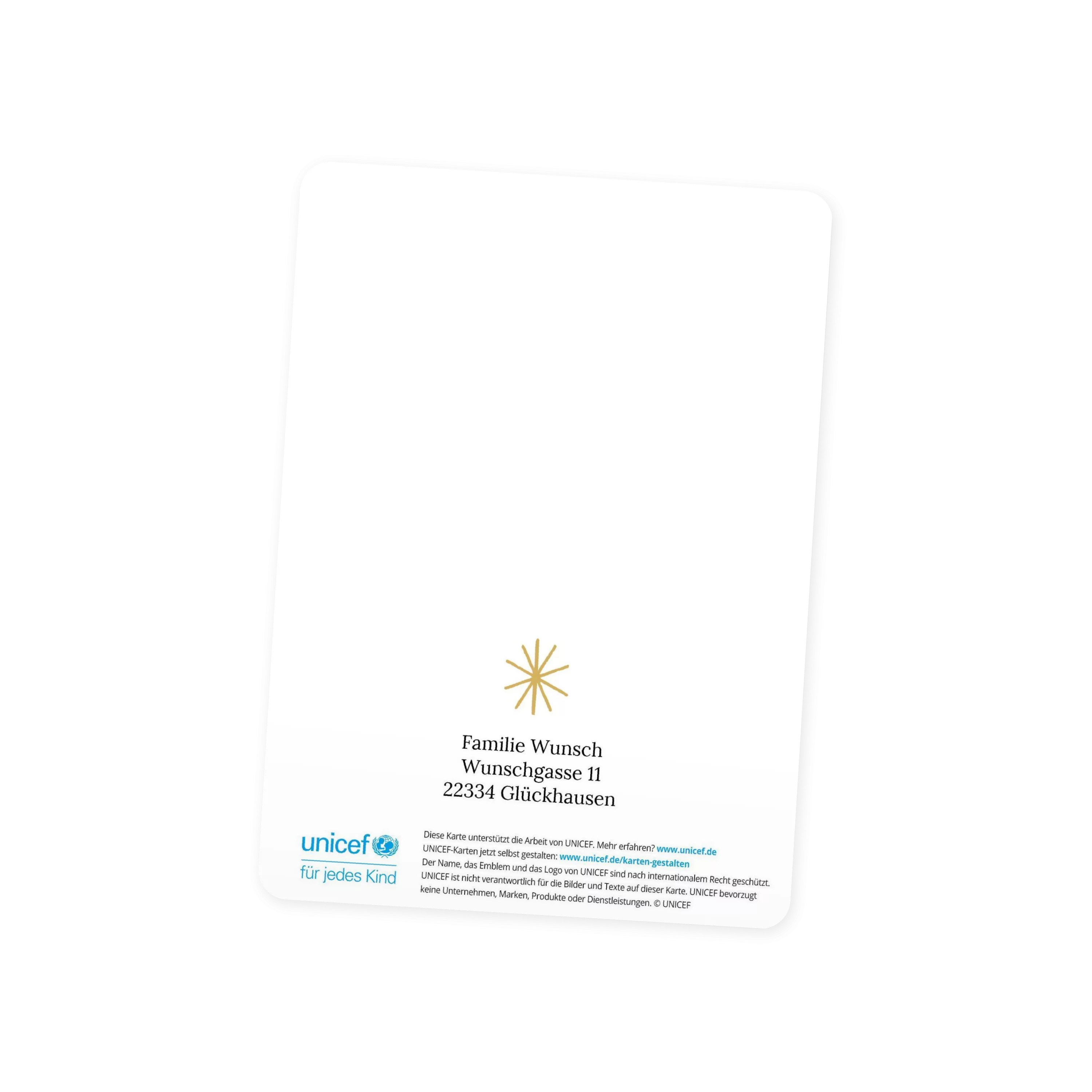 Alle UNICEF-Karten werden unter Einhaltung strenger internationaler Richtlinien hinsichtlich Qualität, Sicherheit, sozialer Verantwortung und Umweltschutz hergestellt. Denn UNICEF ist den Kindern und ihren Familien verpflichtet.