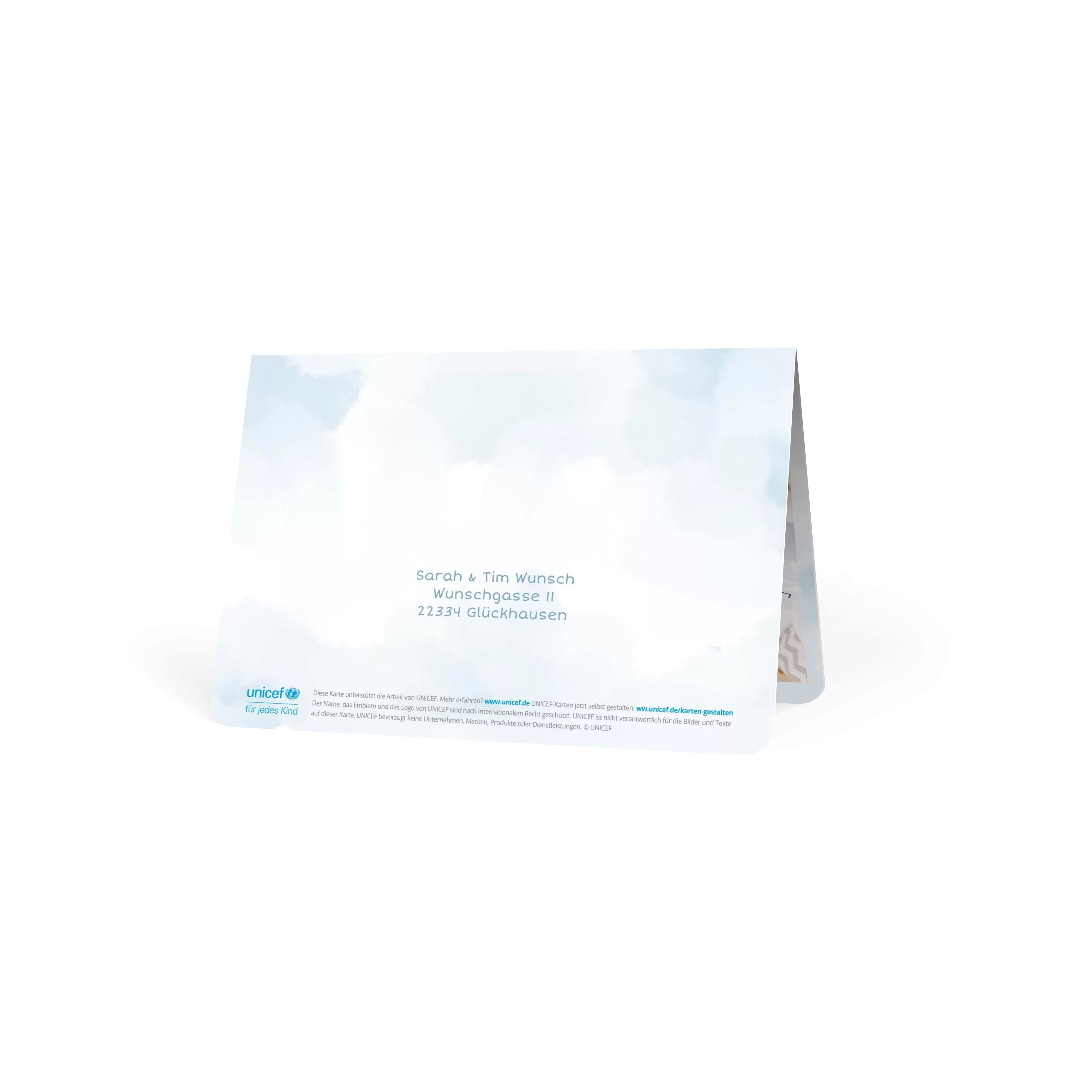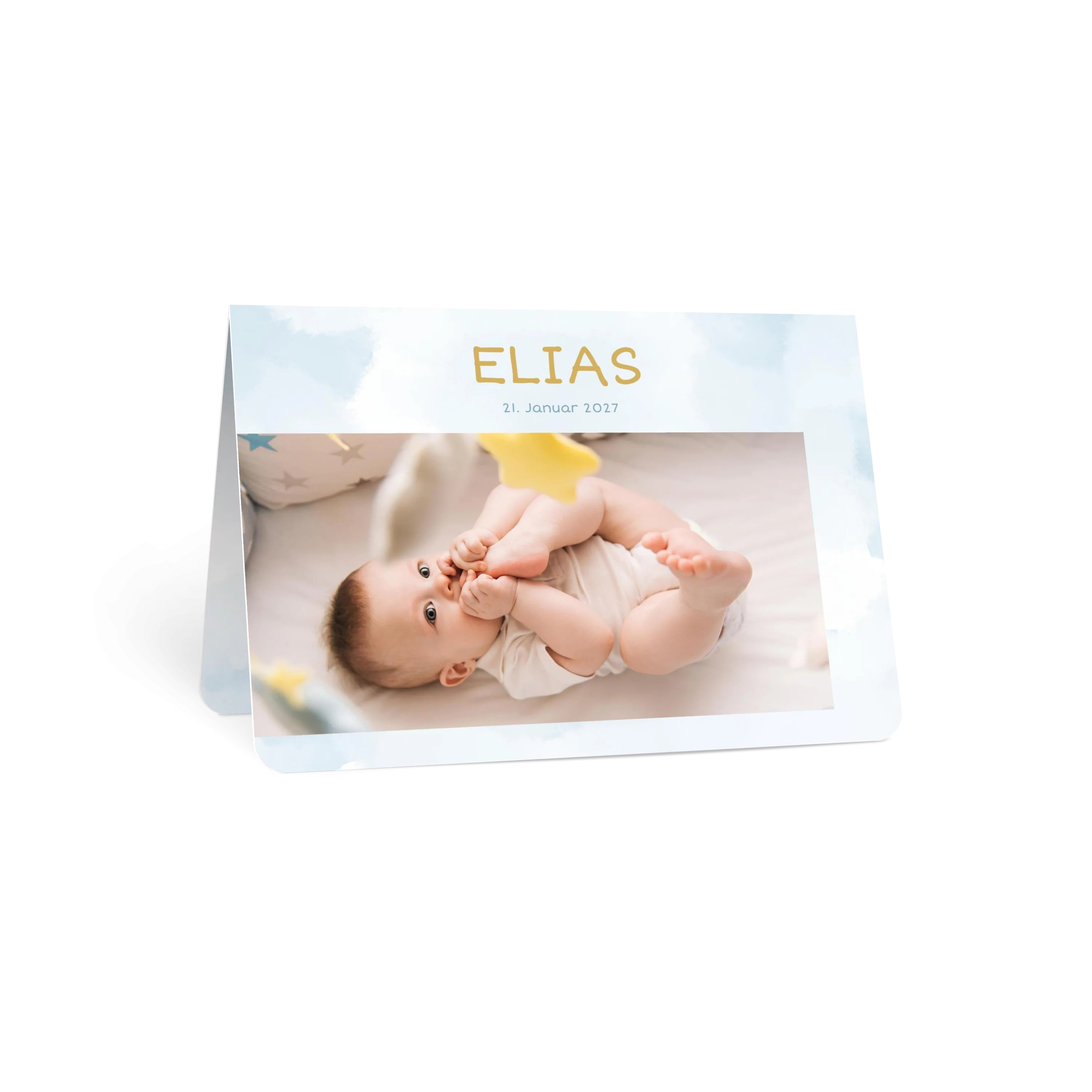 Zarte Blautöne und ein verspieltes Babyfoto verleihen dieser Klappkarte eine himmlisch leichte Ausstrahlung. Ideal, um die Ankunft Ihres kleinen Lieblings mit Freude und Leichtigkeit zu verkünden.