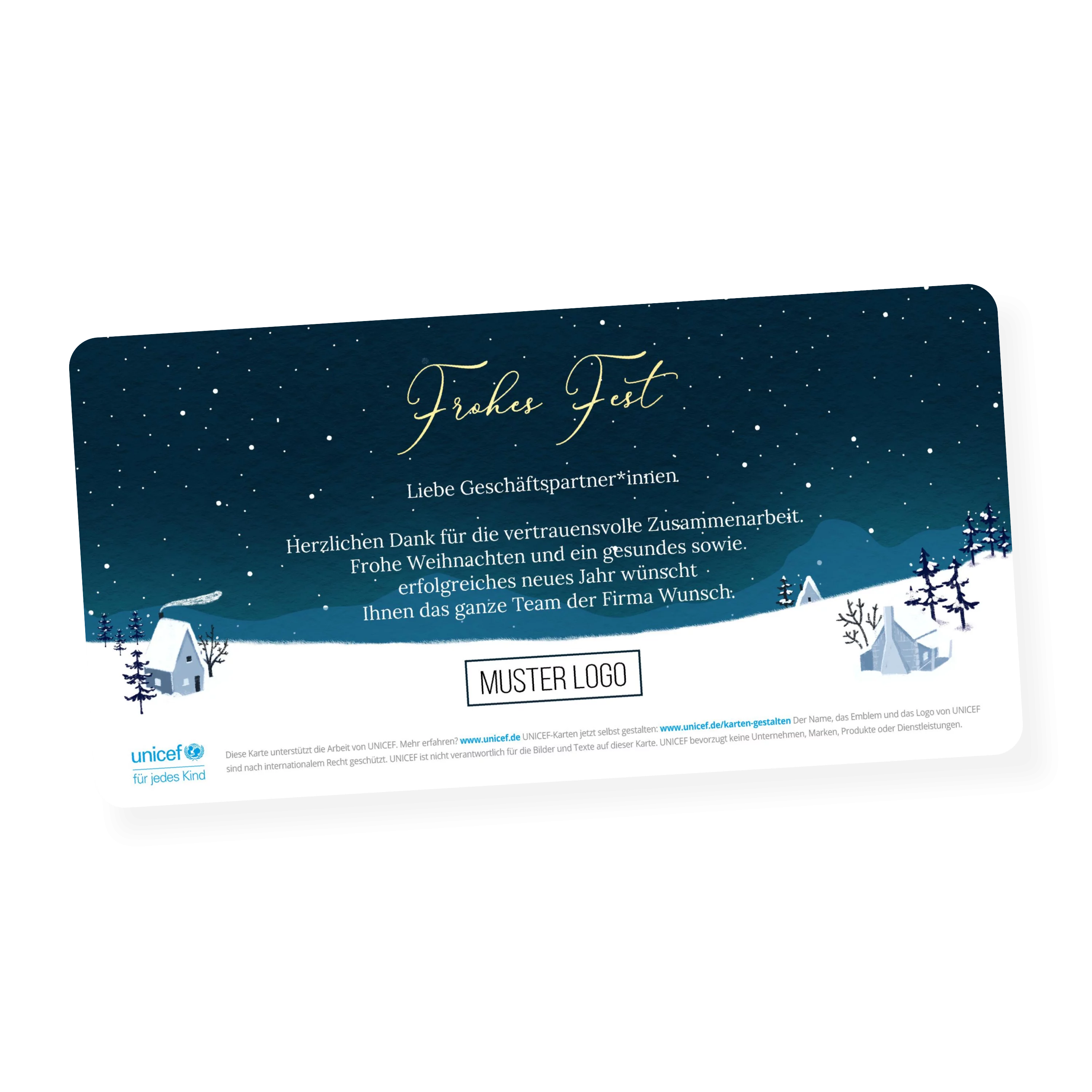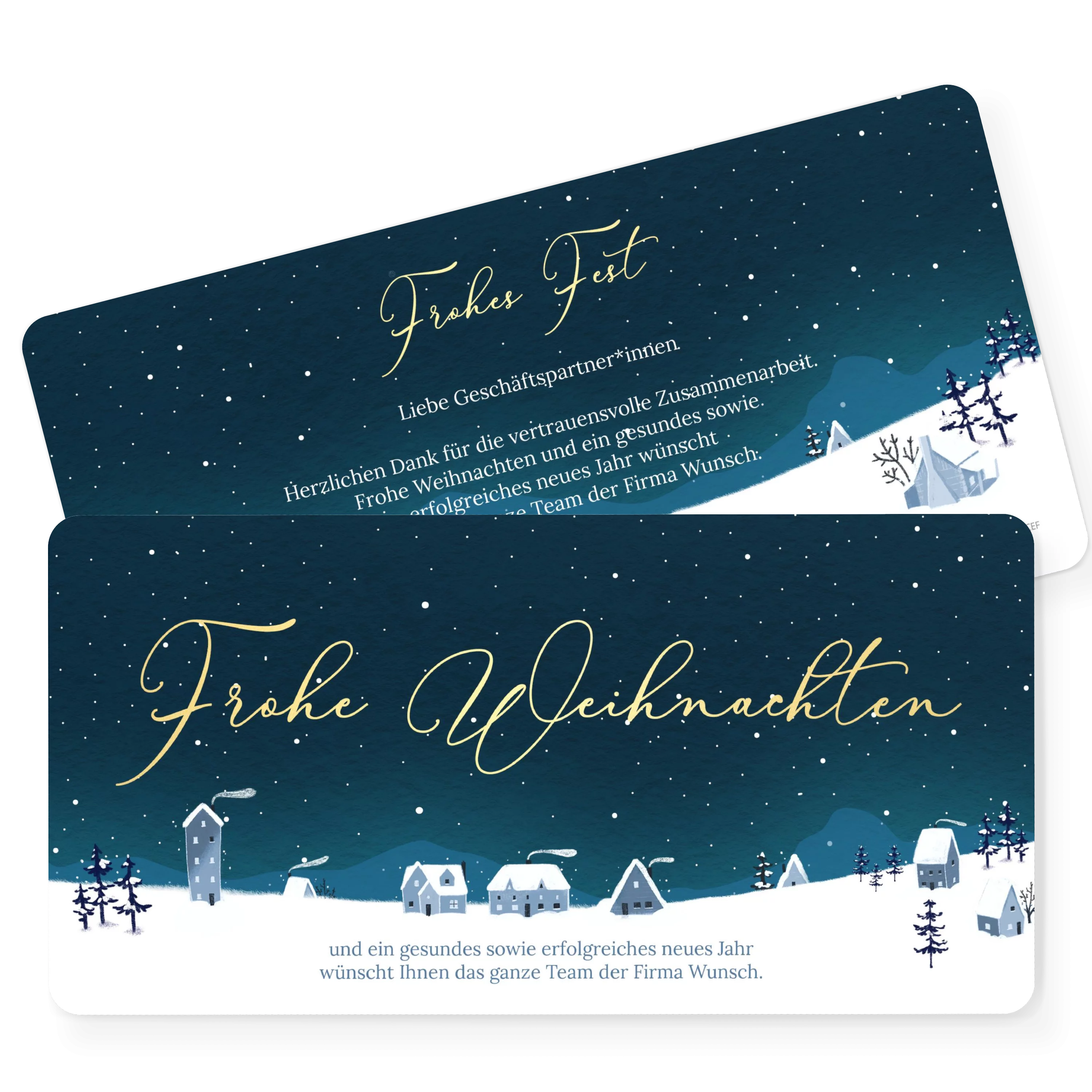 Ein tiefes Nachtblau bildet die Bühne für ein kleines Winterdorf, das in klarem Weiß unter einem funkelnden Sternenhimmel leuchtet. Die geschwungene „Frohes Fest“-Schrift setzt einen warm-goldenen Akzent und verbindet die ruhige Winternacht mit festlicher Stimmung. Innen bleibt Raum für eigene Worte und persönliche Grüße.