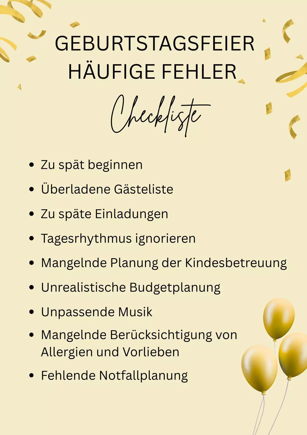 Unsere downloadbare Checkliste der häufigen Fehler hilft Ihnen sicherzustellen, dass Ihre Geburtstagsparty ein voller Erfolg und sowohl für Sie als auch für Ihre Gäste ein unvergessliches Erlebnis mit viel Spaß wird.