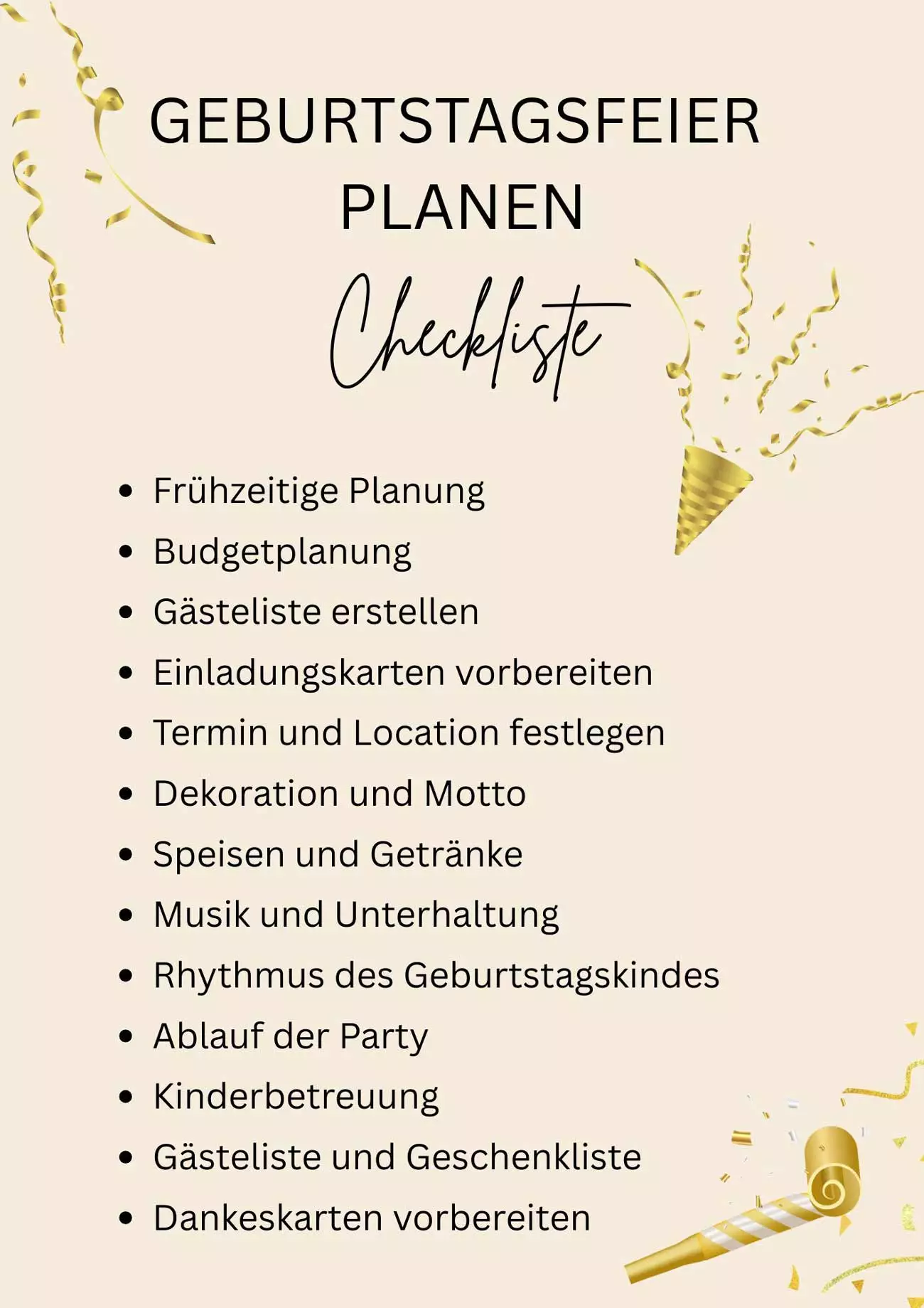 Eine sorgfältige Planung ist der Schlüssel zu einer erfolgreichen Geburtstagsparty. Hier ist eine Checkliste, die Ihnen dabei hilft: