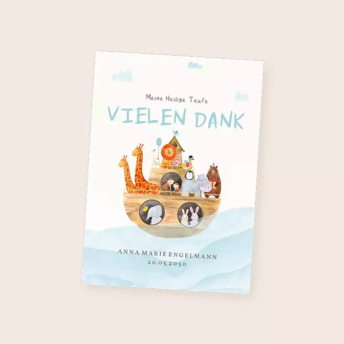 - Bilder: Wählen Sie ein oder mehrere Bilder der Taufe oder des Täuflings aus und integrieren Sie diese in das Design Ihrer Dankeskarte. Dadurch erhält diese eine persönliche Note und erinnert den Empfänger an wertvolle Momente, die er am Tag der Taufe geteilt hat.