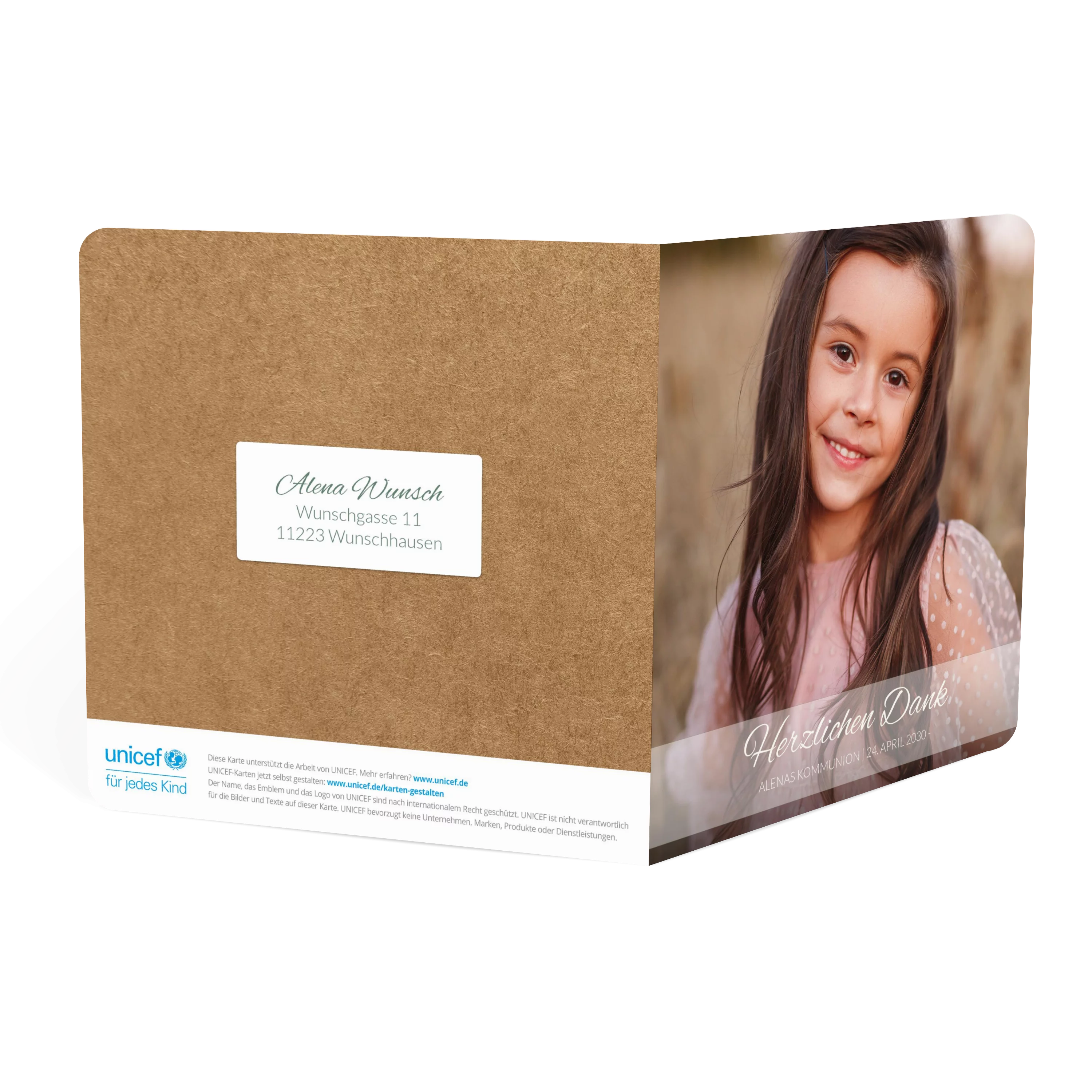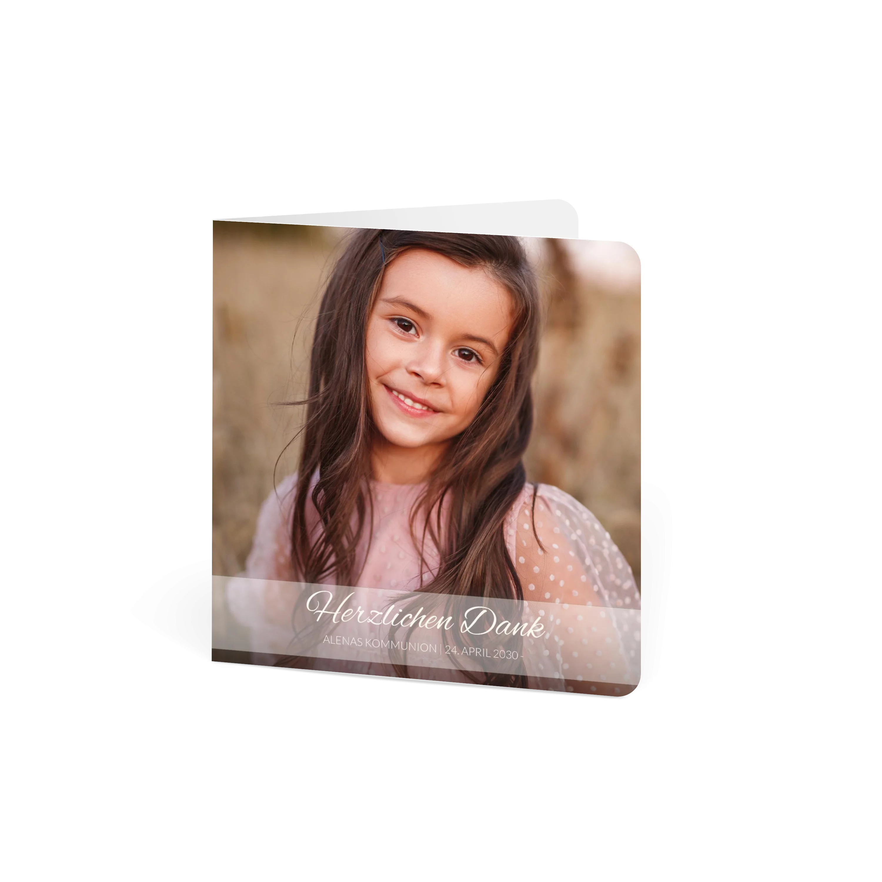 Vorne setzt ein großes Foto den Mittelpunkt, über dem ein transparentes Band liegt, auf dem der Text fein platziert werden kann. Die Rückseite zeigt eine warme Kraftpapieroptik. Ideal zur Kommunion.