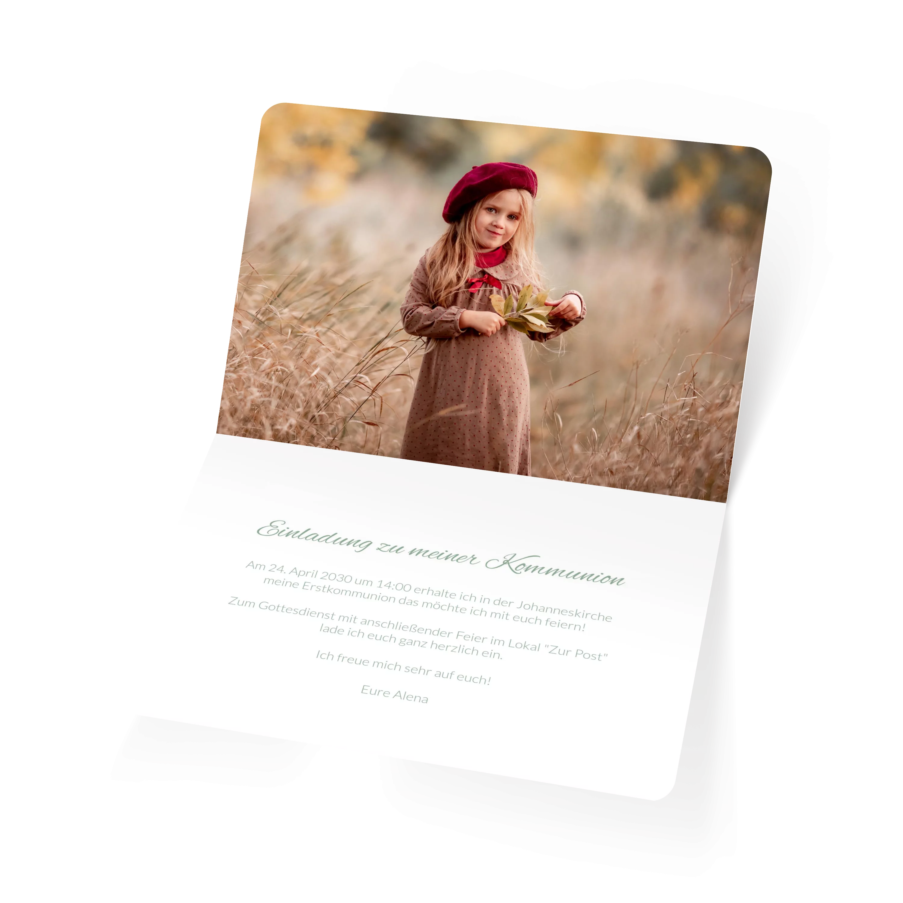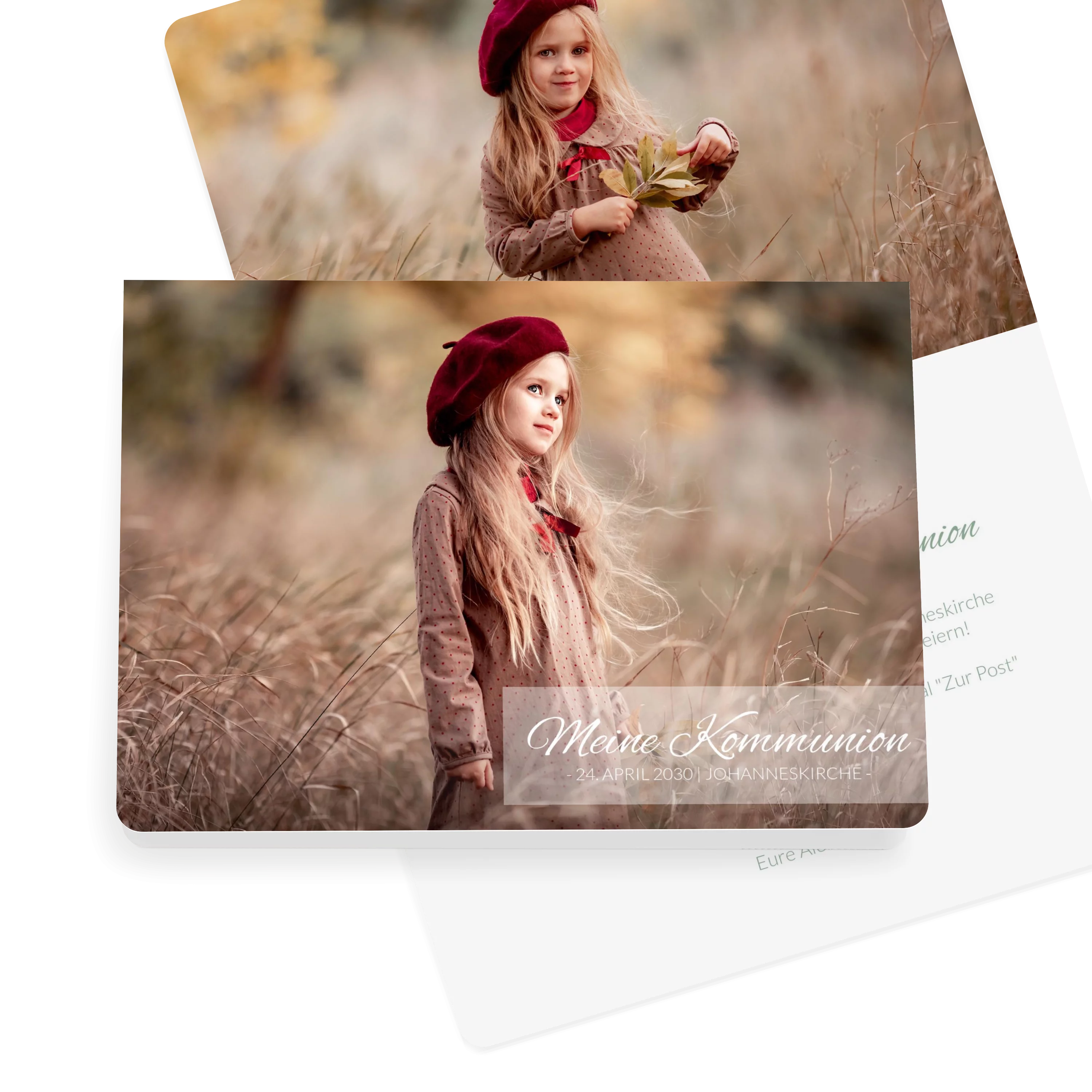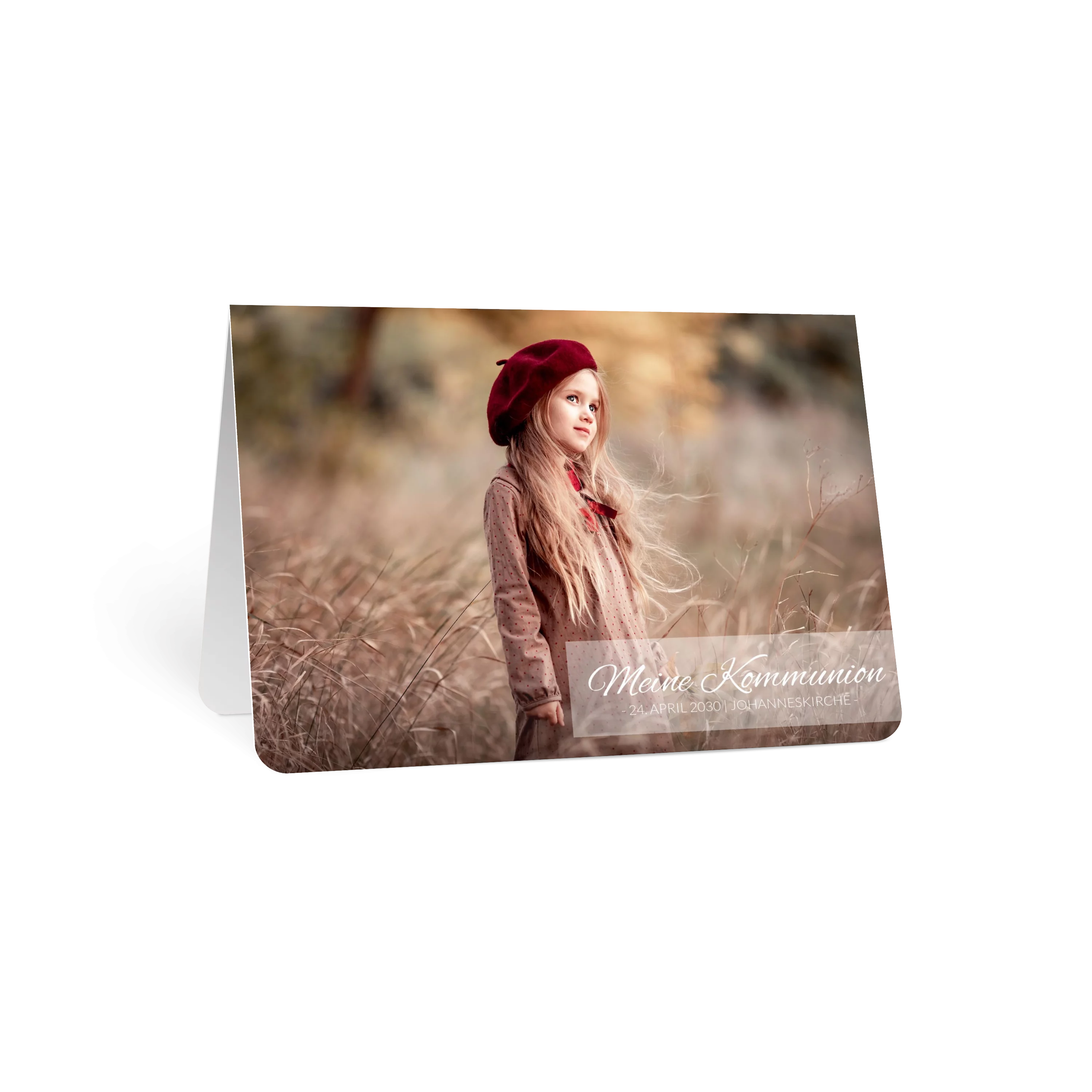 Vorne setzt ein großes Foto den Mittelpunkt, über dem ein transparentes Band liegt, auf dem der Text fein platziert werden kann. Die Rückseite zeigt eine warme Kraftpapieroptik. Ideal zur Kommunion.